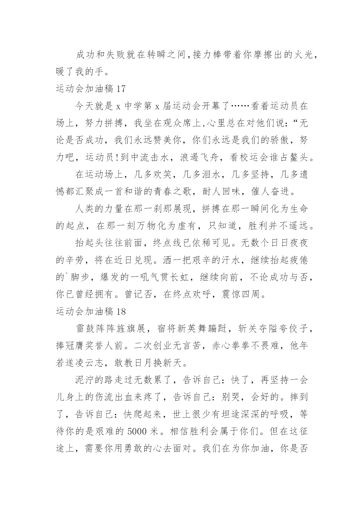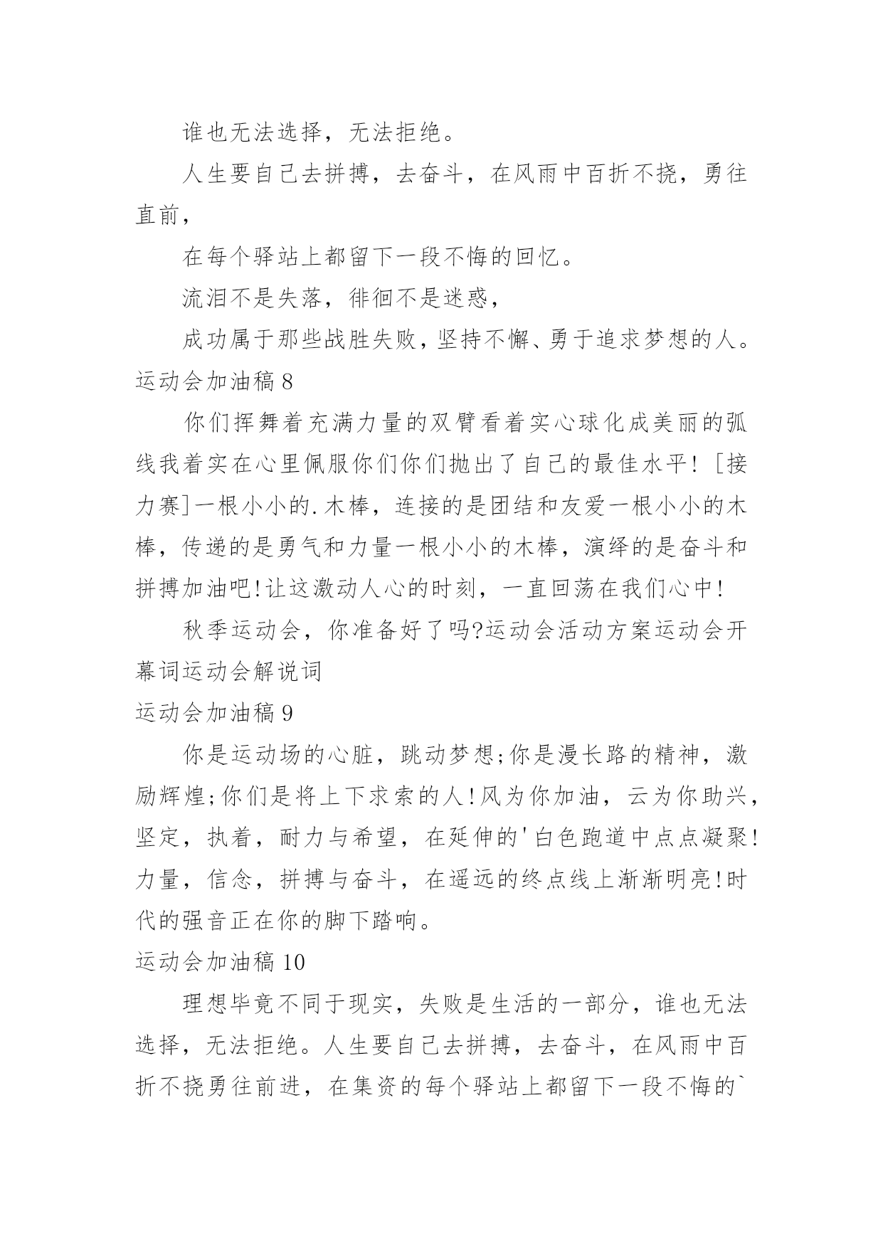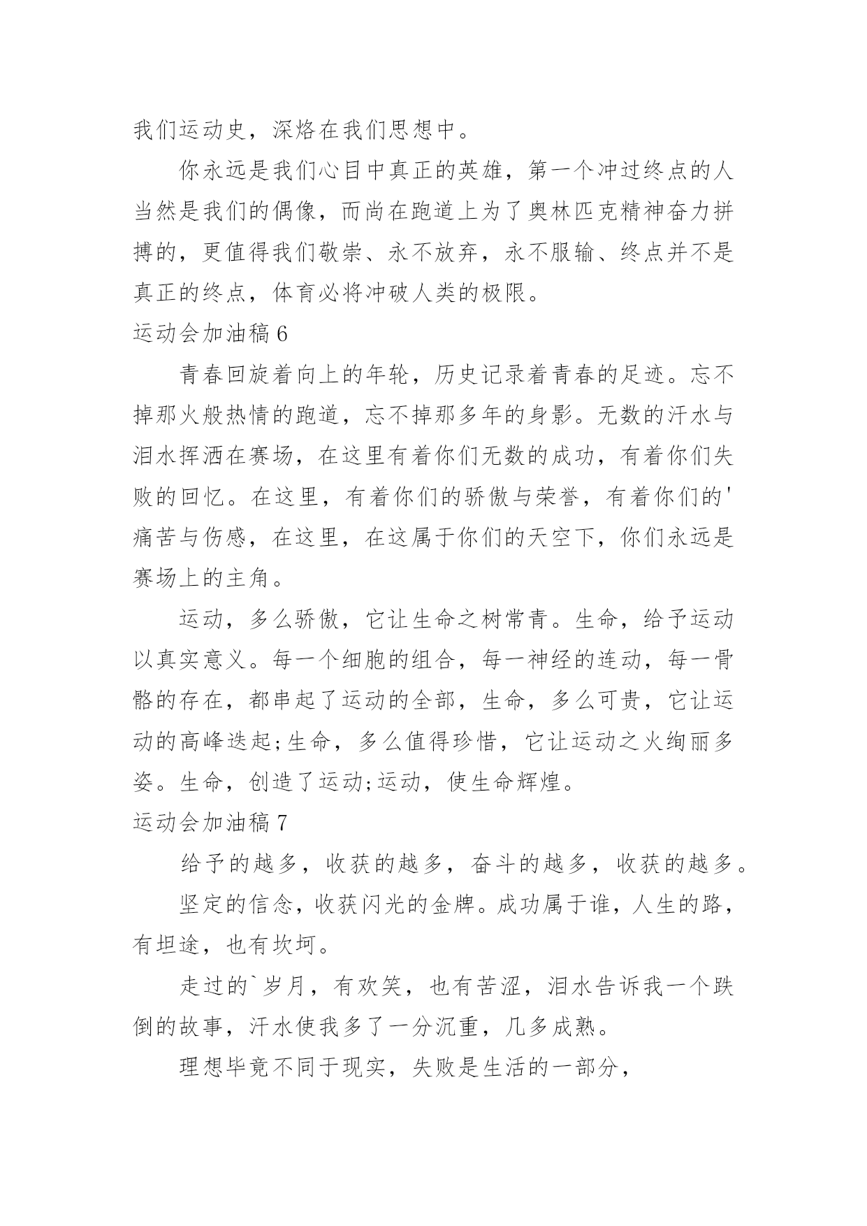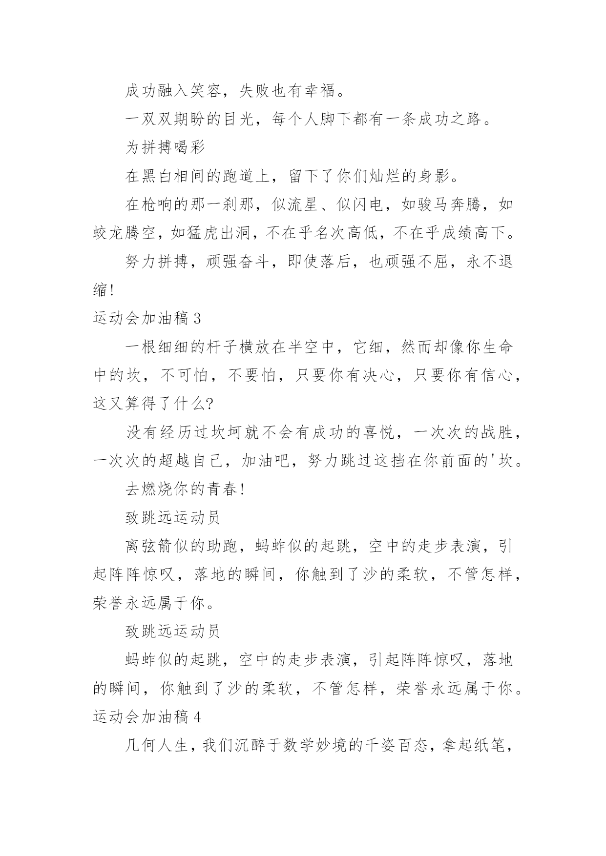 运动会加油稿【精华】运动会加油稿20篇在生活中,我们都不可避免地要接触到加油稿,加油稿是一种对他人有正向激励作用的文稿。那要怎么写好加油稿呢?下面是小编为大家整理的运动会加油稿,仅供参考,希望能够帮助到大家。运动会加油稿1不为掌声的诠释,不为刻意的征服,只有辛勤的汗水化作追求的脚步,心中坚定的信念,脚下沉稳的步伐,你用行动诉说着一个不变的`真理,没有比脚更长的路,没有比人更高的山,希望在终点向你招手,努力吧用你坚韧不拔的毅志,去迎接终点的鲜花与掌声,相信成功属于你。运动会加油稿2为你们祝福,为你们喝彩。一声枪响伴着飒爽的秋风,你们亮出自己的风采,在这短短的100米中,你们与时间争分夺秒,只为了那最后的.冲刺。不管结果如何,你们都是胜利者。因为,你们曾与时间竞赛。走过一段很长的路,你用青春的脚步,敲出铿锵的音符。成功融入笑容,失败也有幸福。一双双期盼的目光,每个人脚下都有一条成功之路。为拼搏喝彩在黑白相间的跑道上,留下了你们灿烂的身影。在枪响的那一刹那,似流星、似闪电,如骏马奔腾,如蛟龙腾空,如猛虎出洞,不在乎名次高低,不在乎成绩高下。努力拼搏,顽强奋斗,即使落后,也顽强不屈,永不退缩!运动会加油稿3一根细细的杆子横放在半空中,它细,然而却像你生命中的坎,不可怕,不要怕,只要你有决心,只要你有信心,这又算得了什么?没有经历过坎坷就不会有成功的喜悦,一次次的战胜,一次次的超越自己,加油吧,努力跳过这挡在你前面的'坎。去燃烧你的青春!致跳远运动员离弦箭似的助跑,蚂蚱似的起跳,空中的走步表演,引起阵阵惊叹,落地的瞬间,你触到了沙的柔软,不管怎样,荣誉永远属于你。致跳远运动员蚂蚱似的起跳,空中的走步表演,引起阵阵惊叹,落地的瞬间,你触到了沙的柔软,不管怎样,荣誉永远属于你。运动会加油稿4几何人生,我们沉醉于数学妙境的千姿百态,拿起纸笔,演算古今。如今走下网络,走出宿舍,走向操场,我们争先恐后,力争上游。微分天下,信息时代的弄潮儿,解析世事,代码语句设计,信息化发展,我来做先锋。家事、国事、天下事,事事关心。没有劲风的磨砺,怎见参天大树的挺拔矗立,没有对手的激情澎湃,怎显数计亮剑出鞘的雷霆气势。数计健儿,化身风雷精灵,驰骋奔腾。志愿者们浅浅帽檐遮不住连续滴下的汗珠。负责各小组的团学干部们不辞辛苦,看台上热情满满的观众呐喊助威。最可爱可敬的运动员们自信拼搏,冲刺终点。火热的'运动场留下属于我们的记忆,留下属于我们的血泪酸甜。运动会加油稿5还记得奥林匹克的口号吗?更高、更快、更强,正是因为有了动力,才让我们的运动变的精彩,变的绚丽,变的引人。大家记忆尤新的永远是最有风采的一面,乔丹的灌蓝,巴乔的射门。这所有的一切都让我们深深感受到一种精神的存在,那是勇攀高峰的精神,那是不断超越的精神,更是人类挑战极限的精神。除了超越的'精神外,还有一种风采感动着我们,那是运动最本质的品格,也是人类在竞争中的最真实,自然的情感流露。那是一种团结奋进的精神,它让本来残酷的竞争带上了人为的印记,捎上了一片真情。它让运动除了成绩外多了一种品质值得歌颂,相信那才是最感人的东西,它长存于我们运动史,深烙在我们思想中。你永远是我们心目中真正的英雄,第一个冲过终点的人当然是我们的偶像,而尚在跑道上为了奥林匹克精神奋力拼搏的,更值得我们敬崇、永不放弃,永不服输、终点并不是真正的终点,体育必将冲破人类的极限。运动会加油稿6青春回旋着向上的年轮,历史记录着青春的足迹。忘不掉那火般热情的跑道,忘不掉那多年的身影。无数的汗水与泪水挥洒在赛场,在这里有着你们无数的成功,有着你们失败的回忆。在这里,有着你们的骄傲与荣誉,有着你们的'痛苦与伤感,在这里,在这属于你们的天空下,你们永远是赛场上的主角。运动,多么骄傲,它让生命之树常青。生命,给予运动以真实意义。每一个细胞的组合,每一神经的连动,每一骨骼的存在,都串起了运动的全部,生命,多么可贵,它让运动的高峰迭起;生命,多么值得珍惜,它让运动之火绚丽多姿。生命,创造了运动;运动,使生命辉煌。运动会加油稿7给予的越多,收获的越多,奋斗的越多,收获的越多。坚定的信念,收获闪光的金牌。成功属于谁,人生的路,有坦途,也有坎坷。走过的`岁月,有欢笑,也有苦涩,泪水告诉我一个跌倒的故事,汗水使我多了一分沉重,几多成熟。理想毕竟不同于现实,失败是生活的一部分,谁也无法选择,无法拒绝。人生要自己去拼搏,去奋斗,在风雨中百折不挠,勇往直前,在每个驿站上都留下一段不悔的回忆。流泪不是失落,徘徊不是迷惑,成功属于那些战胜失败,坚持不懈、勇于追求梦想的人。运动会加油稿8你们挥舞着充满力量的双臂看着实心球化成美丽的弧线我着实在心里佩服你们你们抛出了自己的最佳水平![接力赛]一根小小的.木棒,连接的是团结和友爱一根小小的木棒,传递的是勇气和力量一根小小的木棒,演绎的