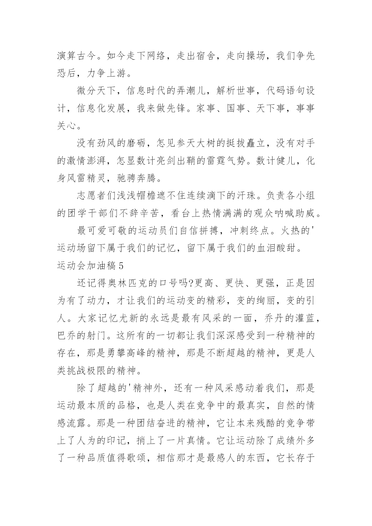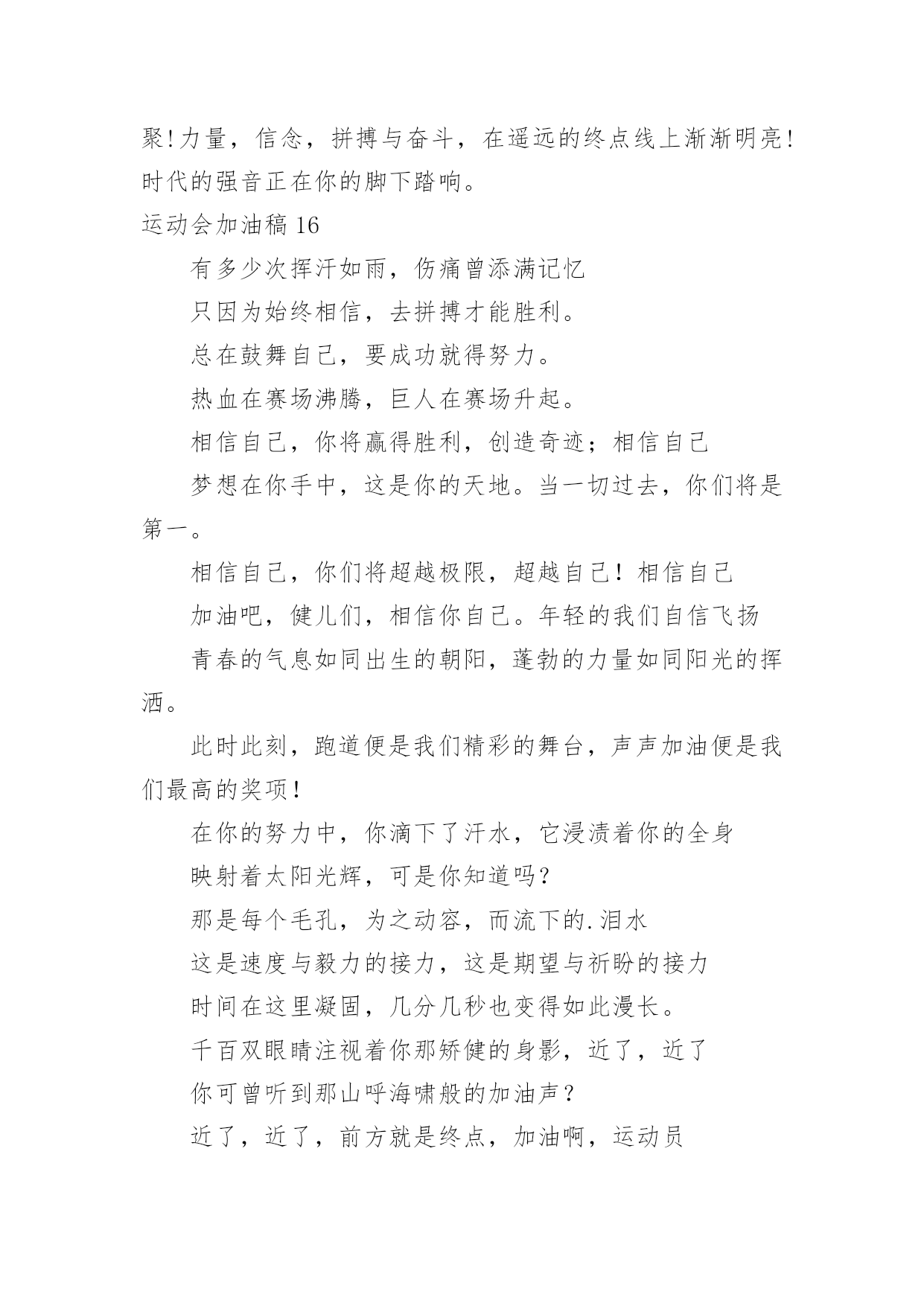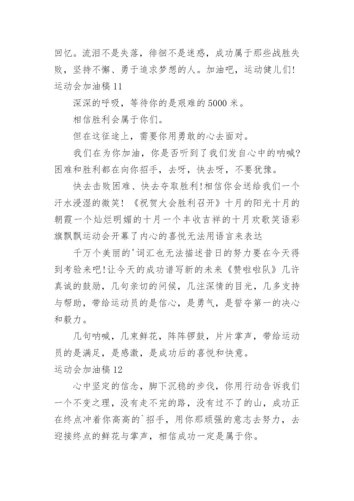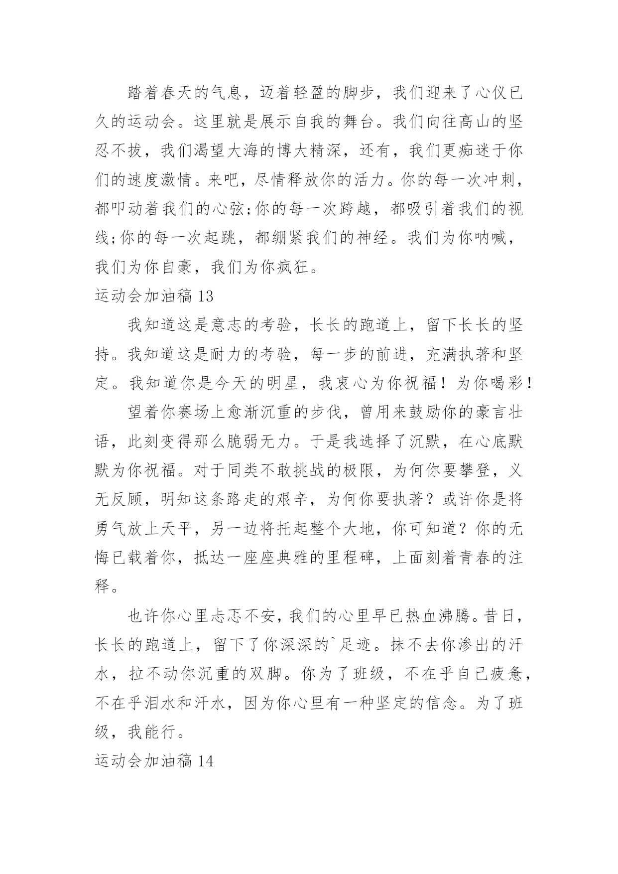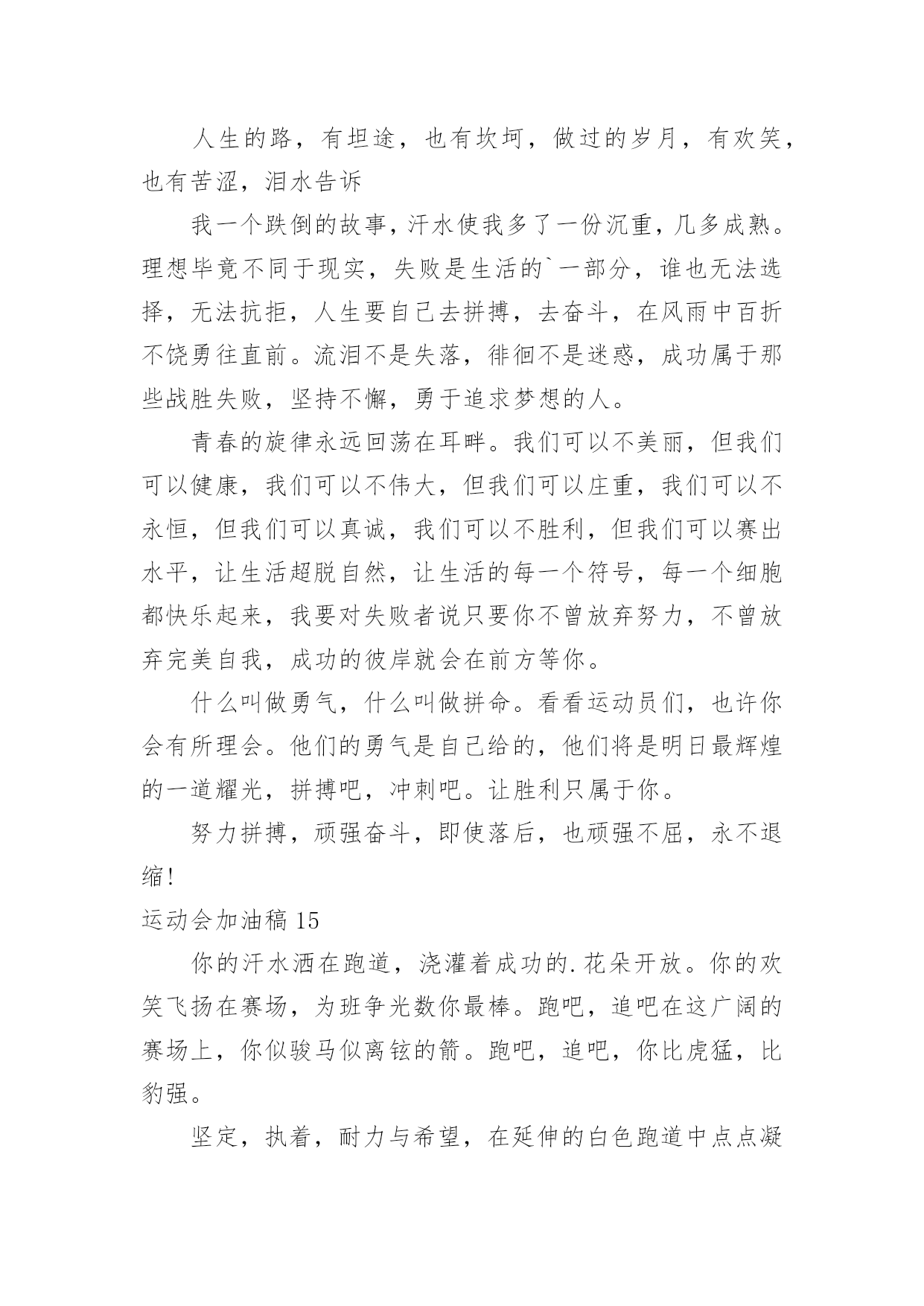 运动会加油稿【精华】运动会加油稿20篇在生活中,我们都不可避免地要接触到加油稿,加油稿是一种对他人有正向激励作用的文稿。那要怎么写好加油稿呢?下面是小编为大家整理的运动会加油稿,仅供参考,希望能够帮助到大家。运动会加油稿1不为掌声的诠释,不为刻意的征服,只有辛勤的汗水化作追求的脚步,心中坚定的信念,脚下沉稳的步伐,你用行动诉说着一个不变的`真理,没有比脚更长的路,没有比人更高的山,希望在终点向你招手,努力吧用你坚韧不拔的毅志,去迎接终点的鲜花与掌声,相信成功属于你。运动会加油稿2为你们祝福,为你们喝彩。一声枪响伴着飒爽的秋风,你们亮出自己的风采,在这短短的100米中,你们与时间争分夺秒,只为了那最后的.冲刺。不管结果如何,你们都是胜利者。因为,你们曾与时间竞赛。走过一段很长的路,你用青春的脚步,敲出铿锵的音符。成功融入笑容,失败也有幸福。一双双期盼的目光,每个人脚下都有一条成功之路。为拼搏喝彩在黑白相间的跑道上,留下了你们灿烂的身影。在枪响的那一刹那,似流星、似闪电,如骏马奔腾,如蛟龙腾空,如猛虎出洞,不在乎名次高低,不在乎成绩高下。努力拼搏,顽强奋斗,即使落后,也顽强不屈,永不退缩!运动会加油稿3一根细细的杆子横放在半空中,它细,然而却像你生命中的坎,不可怕,不要怕,只要你有决心,只要你有信心,这又算得了什么?没有经历过坎坷就不会有成功的喜悦,一次次的战胜,一次次的超越自己,加油吧,努力跳过这挡在你前面的'坎。去燃烧你的青春!致跳远运动员离弦箭似的助跑,蚂蚱似的起跳,空中的走步表演,引起阵阵惊叹,落地的瞬间,你触到了沙的柔软,不管怎样,荣誉永远属于你。致跳远运动员蚂蚱似的起跳,空中的走步表演,引起阵阵惊叹,落地的瞬间,你触到了沙的柔软,不管怎样,荣誉永远属于你。运动会加油稿4几何人生,我们沉醉于数学妙境的千姿百态,拿起纸笔,演算古今。如今走下网络,走出宿舍,走向操场,我们争先恐后,力争上游。微分天下,信息时代的弄潮儿,解析世事,代码语句设计,信息化发展,我来做先锋。家事、国事、天下事,事事关心。没有劲风的磨砺,怎见参天大树的挺拔矗立,没有对手的激情澎湃,怎显数计亮剑出鞘的雷霆气势。数计健儿,化身风雷精灵,驰骋奔腾。志愿者们浅浅帽檐遮不住连续滴下的汗珠。负责各小组的团学干部们不辞辛苦,看台上热情满满的观众呐喊助威。最可爱可敬的运动员们自信拼搏,冲刺终点。火热的'运动场留下属于我们的记忆,留下属于我们的血泪酸甜。运动会加油稿5还记得奥林匹克的口号吗?更高、更快、更强,正是因为有了动力,才让我们的运动变的精彩,变的绚丽,变的引人。大家记忆尤新的永远是最有风采的一面,乔丹的灌蓝,巴乔的射门。这所有的一切都让我们深深感受到一种精神的存在,那是勇攀高峰的精神,那是不断超越的精神,更是人类挑战极限的精神。除了超越的'精神外,还有一种风采感动着我们,那是运动最本质的品格,也是人类在竞争中的最真实,自然的情感流露。那是一种团结奋进的精神,它让本来残酷的竞争带上了人为的印记,捎上了一片真情。它让运动除了成绩外多了一种品质值得歌颂,相信那才是最感人的东西,它长存于我们运动史,深烙在我们思想中。你永远是我们心目中真正的英雄,第一个冲过终点的人当然是我们的偶像,而尚在跑道上为了奥林匹克精神奋力拼搏的,更值得我们敬崇、永不放弃,永不服输、终点并不是真正的终点,体育必将冲破人类的极限。运动会加油稿6青春回旋着向上的年轮,历史记录着青春的足迹。忘不掉那火般热情的跑道,忘不掉那多年的身影。无数的汗水与泪水挥洒在赛场,在这里有着你们无数的成功,有着你们失败的回忆。在这里,有着你们的骄傲与荣誉,有着你们的'痛苦与伤感,在这里,在这属于你们的天空下,你们永远是赛场上的主角。运动,多么骄傲,它让生命之树常青。生命,给予运动以真实意义。每一个细胞的组合,每一神经的连动,每一骨骼的存在,都串起了运动的全部,生命,多么可贵,它让运动的高峰迭起;生命,多么值得珍惜,它让运动之火绚丽多姿。生命,创造了运动;运动,使生命辉煌。运动会加油稿7给予的越多,收获的越多,奋斗的越多,收获的越多。坚定的信念,收获闪光的金牌。成功属于谁,人生的路,有坦途,也有坎坷。走过的`岁月,有欢笑,也有苦涩,泪水告诉我一个跌倒的故事,汗水使我多了一分沉重,几多成熟。理想毕竟不同于现实,失败是生活的一部分,谁也无法选择,无法拒绝。人生要自己去拼搏,去奋斗,在风雨中百折不挠,勇往直前,在每个驿站上都留下一段不悔的回忆。流泪不是失落,徘徊不是迷惑,成功属于那些战胜失败,坚持不懈、勇于追求梦想的人。运动会加油稿8你们挥舞着充满力量的双臂看着实心球化成美丽的弧线我着实在心里佩服你们你们抛出了自己的最佳水平![接力赛]一根小小的.木棒,连接的是团结和友爱一根小小的木棒,传递的是勇气和力量一根小小的木棒,演绎的