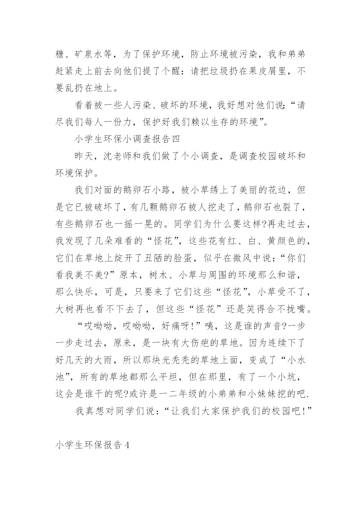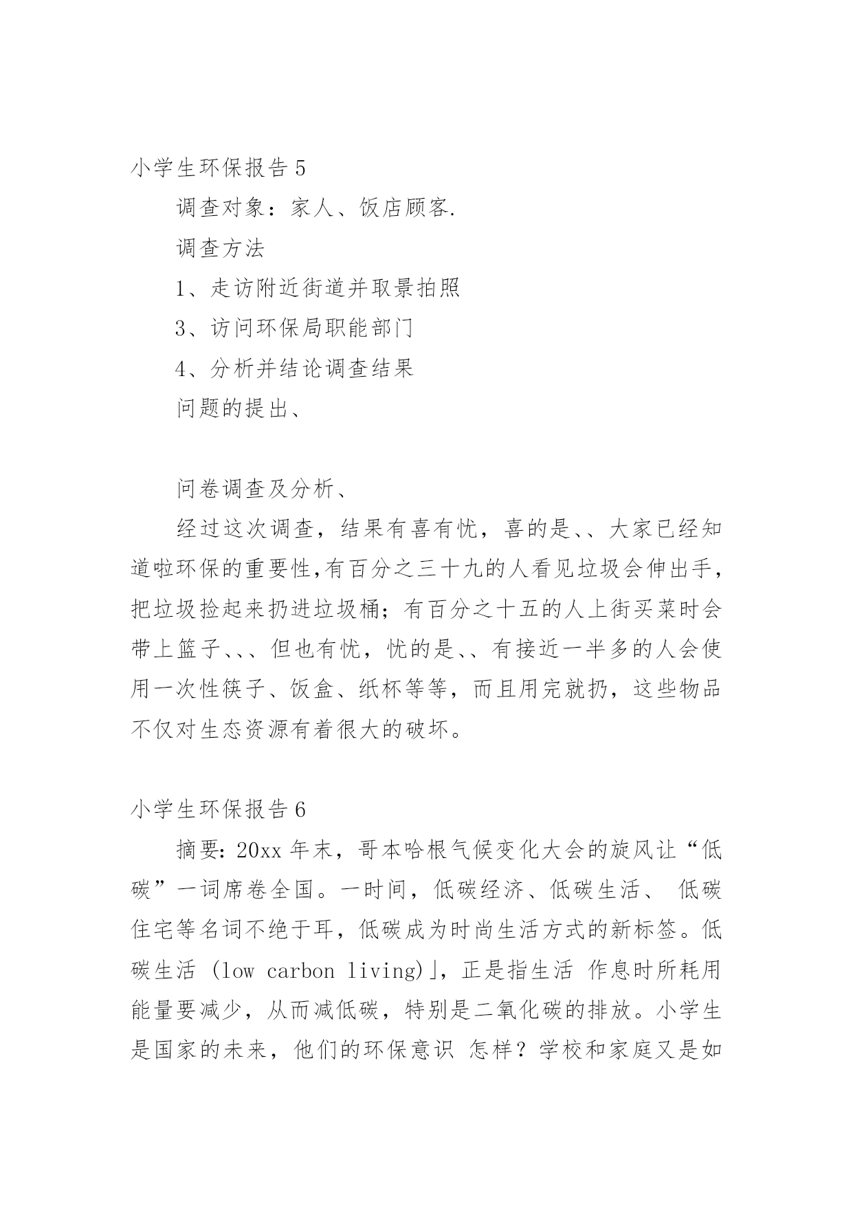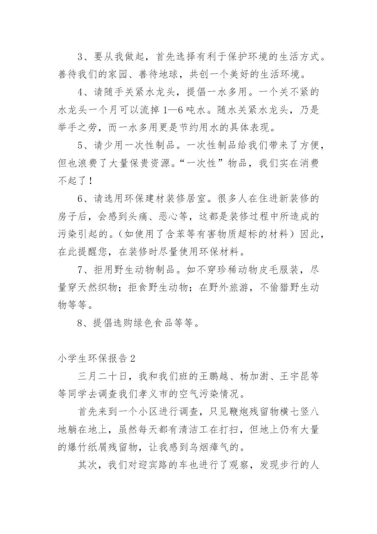 小学生环保报告小学生环保报告(汇编15篇)在生活中,报告有着举足轻重的地位,多数报告都是在事情做完或发生后撰写的。那么,报告到底怎么写才合适呢?下面是小编帮大家整理的小学生环保报告,供大家参考借鉴,希望可以帮助到有需要的朋友。小学生环保报告1地球,是我们生活的源泉,地球妈妈赐予我们优利的环境,它赐予我们现在的科技,可是,我们有曾想到,地球妈妈经常会在深夜里哭泣着,现在的地球妈妈。早已千苍百孔,让我们一起来保护地球环境吧!让我们下定决心,去保护我们赖以生存的家园。做一个保护环境去拯救地球的文明小卫士吧!有这样一句话:“树木拥有绿色,地球才有脉搏,”没错,绿色是环保的主色,也是地球的本色。我们要去保护环境,一:是要先让自己静下心来,对身边的景物,负一定的责任。二:我们先要从身边的处处小事做起,让自己先学会环保。三:提醒别人比如说,看见有一个人倒垃圾时,把垃圾随便仍到路上的话,你应该即使阻止这一行为,让他的行为没有第二次的出现。说到“绿色”,我们的第一反应应该就是植树吧!对呀,我们除了让周围的垃圾,变少。保护环境之外,我们应该去美化地球。所以,我们一定要做一个环保小卫士。当周末有空的时候,可以动起手来植树,还可以尽量去鼓励他人,也参加这一美化地球工作,算是为地球母亲尽一份力吧!让我们敲响上一个世纪环境恶劣的丧钟,让我们去迎接下一个黎明,迎接下一个美好的地球村!让我们永记:绿色——生命之源;草木绿,花儿笑,空气清新环境好!你我的家园—绿色环保妈妈,在科技发达以前是多么美好、宁静呀!到处都能看到蔚蓝色的天空、茂密的森林、清澈的小河和那人们美好的幸福的生活!可科技发达之后呢?现在人们变得富裕了,汽车排放的废气,一次性用品带来的白色污染!……真让人可怜地球妈妈啊!我们该怎么样做,才能令地球妈妈恢复以前的快乐、健康呢?让我来计划一下吧!我觉得嘛……应该出动世界全体人民,分成多个小组,分组来清理污染垃圾。比如说,第一小组来清理白色污染;第二小组负责废气管理;第三小组,负责将工业排放出来的废水集中起来处理……其实,人人都可以做得到环保,只不过他们只是说得到而做不到而已。我们现在不仅要纸质环境污染出现。而且,还要永远地将那些环境污染消除。让地球永远变成以前的那样的美好幸福的地球!最好是在计划中再加一些令我“出乎意料”的计划—绿化地球,这样简直是一举两得,既可以制止环境污染,又可以绿化,美化地球多好啊!真的是“出乎我的意料”呀!如果地球妈妈看到了我写的这篇作文,她会不会笑起来呢?你我的家园——绿色环保在现代生活中,人们的科技都这么发达,有些事情只需要我们的“电脑兄弟”来帮个忙就行了,也花不了自己的太多时间。虽然现在的科技非常地发达,但是在这科技发达的背后呢?据科学家统计,人类平均一天使用纸的数量居然达到了一亿吨左右!这一亿吨,是个多么巨大的数字啊,是个多么令人震撼的一个数字啊!而同时,你有可否明白,这一亿吨相当于多少个自然森林吗?他相当于好几百个自然生态公园啊!你知道吗,现在人类的科技虽然越来越发达了。但在同时,我们却忽视了对我们极其重要的大自然!你可曾知道?大自然对我们人类有多么重要!可现在,人们却为了一己之私而破坏了大自然。我们的地球妈妈在哭泣,她在向整个宇宙揭露着人类不可饶恕的罪行!行动起来吧!人类!不要再继续一错再错,执迷不悟了!趁现在还来得及,赶快行动吧!在这里,我的“拯救地球”计划是这样的:1、实行垃圾分类化。这样不仅能减少环卫工人的工作量,还能更好地起到废物利用,减少污染。2、人类要想征服可怕的大自然,就必须尊重自然,爱护树木,爱护动物,爱护大自然的一切。3、要从我做起,首先选择有利于保护环境的生活方式。善待我们的家园、善待地球,共创一个美好的生活环境。4、请随手关紧水龙头,提倡一水多用。一个关不紧的水龙头一个月可以流掉1—6吨水。随水关紧水龙头,乃是举手之劳,而一水多用更是节约用水的具体表现。5、请少用一次性制品。一次性制品给我们带来了方便,但也浪费了大量保贵资源。“一次性”物品,我们实在消费不起了!6、请选用环保建材装修居室。很多人在住进新装修的房子后,会感到头痛、恶心等,这都是装修过程中所造成的污染引起的。(如使用了含苯等有害物质超标的材料)因此,在此提醒您,在装修时尽量使用环保材料。7、拒用野生动物制品。如不穿珍稀动物皮毛服装,尽量穿天然织物;拒食野生动物;在野外旅游,不偷猎野生动物等等。8、提倡选购绿色食品等等。小学生环保报告2三月二十日,我和我们班的王鹏越、杨加澍、王宇昆等等同学去调查我们孝义市的空气污染情况。首先来到一个小区进行调查,只见鞭炮残留物横七竖八地躺在地上,虽然每天都有清洁工在打扫,但地上仍有大量的爆竹纸屑残留物,让我感到乌烟瘴气的。其次,我们对迎宾路的车也进行了观察,发现步行的人很少,骑自行车的也很少,可是