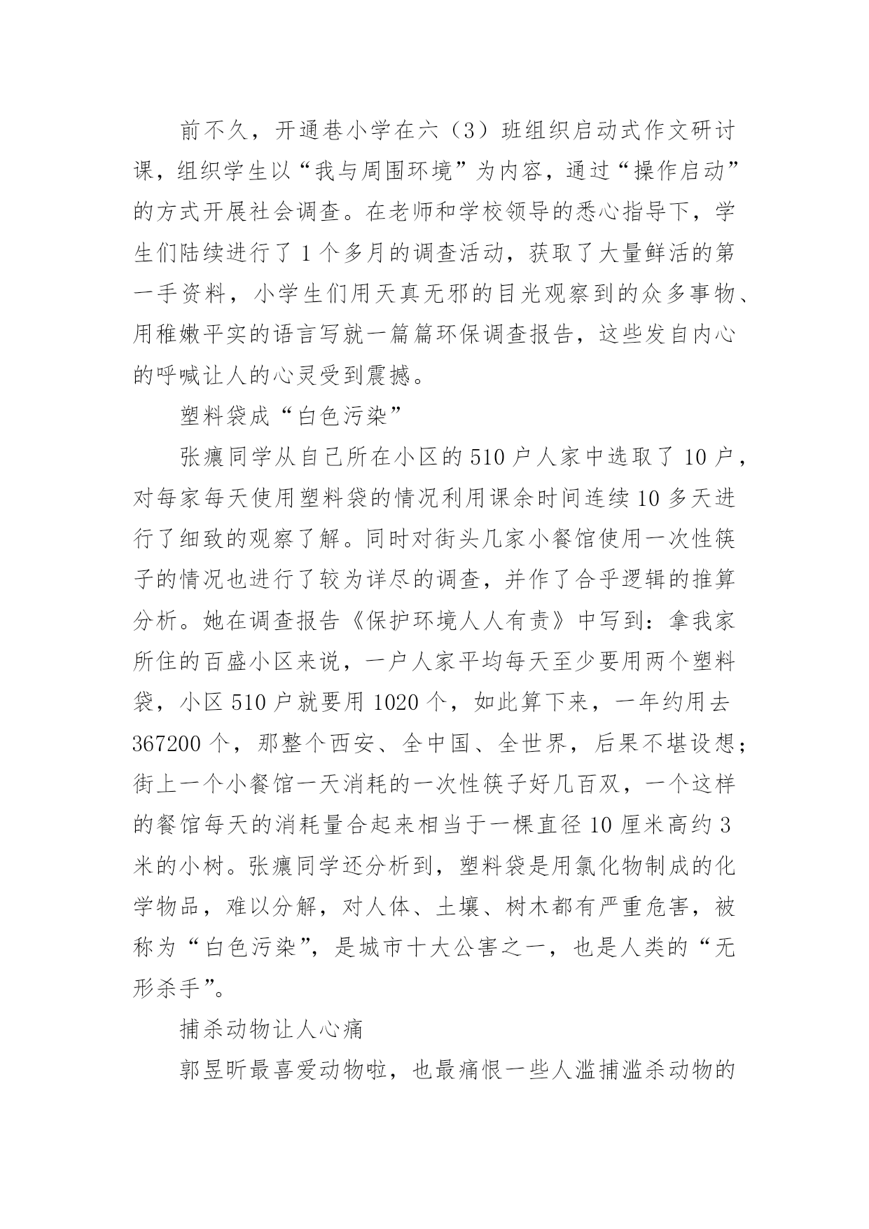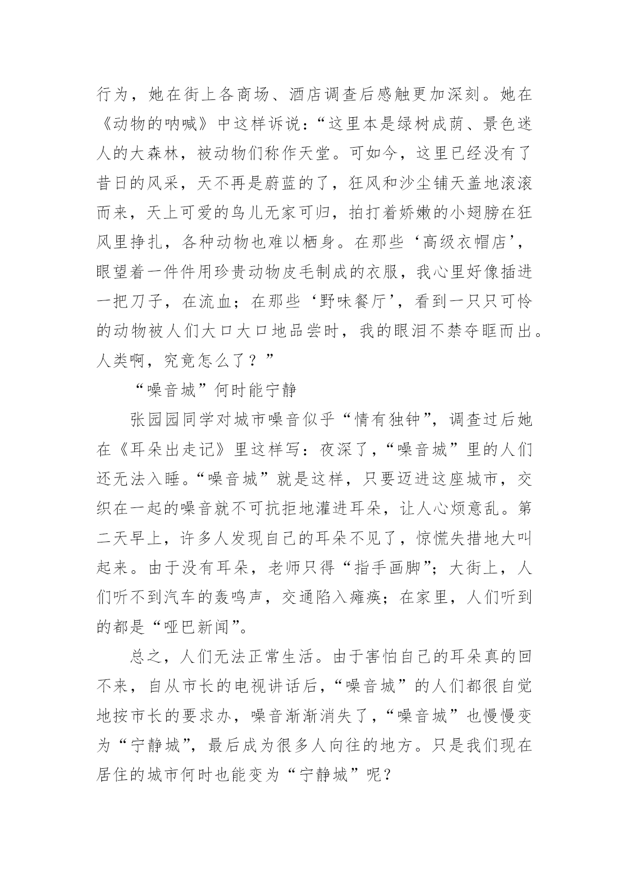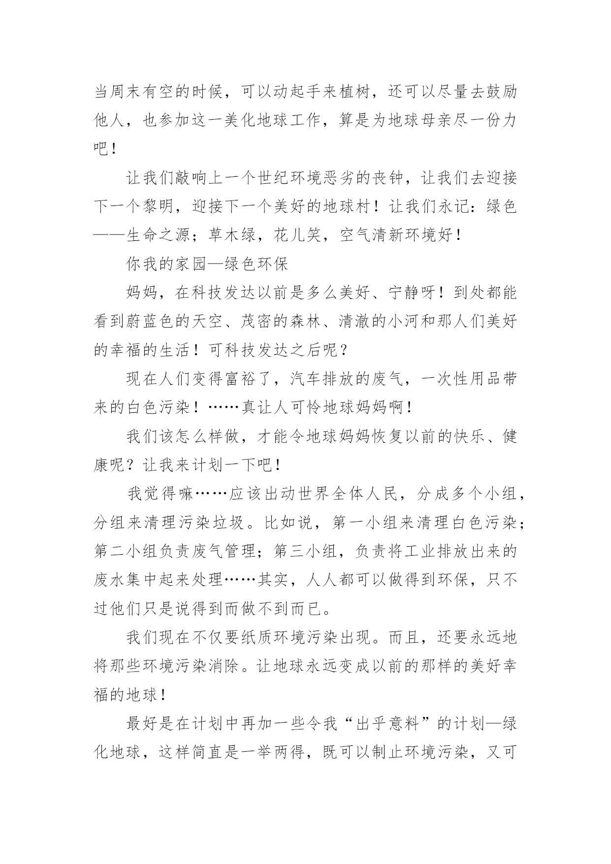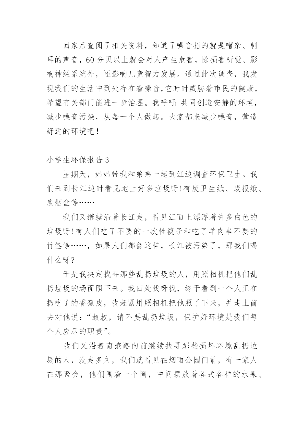 小学生环保报告小学生环保报告(汇编15篇)在生活中,报告有着举足轻重的地位,多数报告都是在事情做完或发生后撰写的。那么,报告到底怎么写才合适呢?下面是小编帮大家整理的小学生环保报告,供大家参考借鉴,希望可以帮助到有需要的朋友。小学生环保报告1地球,是我们生活的源泉,地球妈妈赐予我们优利的环境,它赐予我们现在的科技,可是,我们有曾想到,地球妈妈经常会在深夜里哭泣着,现在的地球妈妈。早已千苍百孔,让我们一起来保护地球环境吧!让我们下定决心,去保护我们赖以生存的家园。做一个保护环境去拯救地球的文明小卫士吧!有这样一句话:“树木拥有绿色,地球才有脉搏,”没错,绿色是环保的主色,也是地球的本色。我们要去保护环境,一:是要先让自己静下心来,对身边的景物,负一定的责任。二:我们先要从身边的处处小事做起,让自己先学会环保。三:提醒别人比如说,看见有一个人倒垃圾时,把垃圾随便仍到路上的话,你应该即使阻止这一行为,让他的行为没有第二次的出现。说到“绿色”,我们的第一反应应该就是植树吧!对呀,我们除了让周围的垃圾,变少。保护环境之外,我们应该去美化地球。所以,我们一定要做一个环保小卫士。当周末有空的时候,可以动起手来植树,还可以尽量去鼓励他人,也参加这一美化地球工作,算是为地球母亲尽一份力吧!让我们敲响上一个世纪环境恶劣的丧钟,让我们去迎接下一个黎明,迎接下一个美好的地球村!让我们永记:绿色——生命之源;草木绿,花儿笑,空气清新环境好!你我的家园—绿色环保妈妈,在科技发达以前是多么美好、宁静呀!到处都能看到蔚蓝色的天空、茂密的森林、清澈的小河和那人们美好的幸福的生活!可科技发达之后呢?现在人们变得富裕了,汽车排放的废气,一次性用品带来的白色污染!……真让人可怜地球妈妈啊!我们该怎么样做,才能令地球妈妈恢复以前的快乐、健康呢?让我来计划一下吧!我觉得嘛……应该出动世界全体人民,分成多个小组,分组来清理污染垃圾。比如说,第一小组来清理白色污染;第二小组负责废气管理;第三小组,负责将工业排放出来的废水集中起来处理……其实,人人都可以做得到环保,只不过他们只是说得到而做不到而已。我们现在不仅要纸质环境污染出现。而且,还要永远地将那些环境污染消除。让地球永远变成以前的那样的美好幸福的地球!最好是在计划中再加一些令我“出乎意料”的计划—绿化地球,这样简直是一举两得,既可以制止环境污染,又可以绿化,美化地球多好啊!真的是“出乎我的意料”呀!如果地球妈妈看到了我写的这篇作文,她会不会笑起来呢?你我的家园——绿色环保在现代生活中,人们的科技都这么发达,有些事情只需要我们的“电脑兄弟”来帮个忙就行了,也花不了自己的太多时间。虽然现在的科技非常地发达,但是在这科技发达的背后呢?据科学家统计,人类平均一天使用纸的数量居然达到了一亿吨左右!这一亿吨,是个多么巨大的数字啊,是个多么令人震撼的一个数字啊!而同时,你有可否明白,这一亿吨相当于多少个自然森林吗?他相当于好几百个自然生态公园啊!你知道吗,现在人类的科技虽然越来越发达了。但在同时,我们却忽视了对我们极其重要的大自然!你可曾知道?大自然对我们人类有多么重要!可现在,人们却为了一己之私而破坏了大自然。我们的地球妈妈在哭泣,她在向整个宇宙揭露着人类不可饶恕的罪行!行动起来吧!人类!不要再继续一错再错,执迷不悟了!趁现在还来得及,赶快行动吧!在这里,我的“拯救地球”计划是这样的:1、实行垃圾分类化。这样不仅能减少环卫工人的工作量,还能更好地起到废物利用,减少污染。2、人类要想征服可怕的大自然,就必须尊重自然,爱护树木,爱护动物,爱护大自然的一切。3、要从我做起,首先选择有利于保护环境的生活方式。善待我们的家园、善待地球,共创一个美好的生活环境。4、请随手关紧水龙头,提倡一水多用。一个关不紧的水龙头一个月可以流掉1—6吨水。随水关紧水龙头,乃是举手之劳,而一水多用更是节约用水的具体表现。5、请少用一次性制品。一次性制品给我们带来了方便,但也浪费了大量保贵资源。“一次性”物品,我们实在消费不起了!6、请选用环保建材装修居室。很多人在住进新装修的房子后,会感到头痛、恶心等,这都是装修过程中所造成的污染引起的。(如使用了含苯等有害物质超标的材料)因此,在此提醒您,在装修时尽量使用环保材料。7、拒用野生动物制品。如不穿珍稀动物皮毛服装,尽量穿天然织物;拒食野生动物;在野外旅游,不偷猎野生动物等等。8、提倡选购绿色食品等等。小学生环保报告2三月二十日,我和我们班的王鹏越、杨加澍、王宇昆等等同学去调查我们孝义市的空气污染情况。首先来到一个小区进行调查,只见鞭炮残留物横七竖八地躺在地上,虽然每天都有清洁工在打扫,但地上仍有大量的爆竹纸屑残留物,让我感到乌烟瘴气的。其次,我们对迎宾路的车也进行了观察,发现步行的人很少,骑自行车的也很少,可是