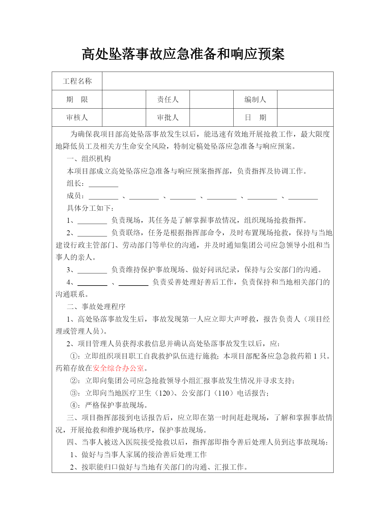 高处坠落事故应急准备和响应预案工程名称期限责任人编制人审核人审批人日期为确保我项目部高处坠落事故发生以后,能迅速有效地开展抢救工作,最大限度地降低员工及相关方生命安全风险,特制定稿处坠落应急准备与响应预案。组织机构本项目部成立高处坠落应急准备与响应预案指挥部,负责指挥及协调工作。组长:成员:、、、、、具体分工如下:1、负责现场,其任务是了解掌握事故情况,组织现场抢救指挥。2、负责联络,任务是根据指挥部命令,及时布置现场抢救,保持与当地建设行政主管部门、劳动部门等单位的沟通,并及时通知集团公司应急领导小组和当事人的亲人。3、负责维持保护事故现场、做好问讯纪录,保持与公安部门的沟通。4、、负责妥善处理好善后工作,负责保持和当地相关部门的沟通联系。二、事故处理程序1、高处坠落事故发生后,事故发现第一人应立即大声呼救,报告负责人(项目经理或管理人员)。2、项目管理人员获得求救信息并确认高处坠落事故发生以后,应:①:立即组织项目职工自我救护队伍进行施救;本项目部配备应急急救药箱1只。药箱存放在安全综合办公室。②:立即向集团公司应急抢救领导小组汇报事故发生情况并寻求支持;③:立即向当地医疗卫生(120)、公安部门(110)电话报告;④:严格保护事故现场。三、项目指挥部接到电话报告后,应立即在第一时间赶赴现场,了解和掌握事故情况,开展抢救和维护现场秩序,保护事故现场。四、当事人被送入医院接受抢救以后,指挥部即指令善后处理人员到达事故现场:做好与当事人家属的接洽善后处理工作按职能归口做好与当地有关部门的沟通、汇报工作。