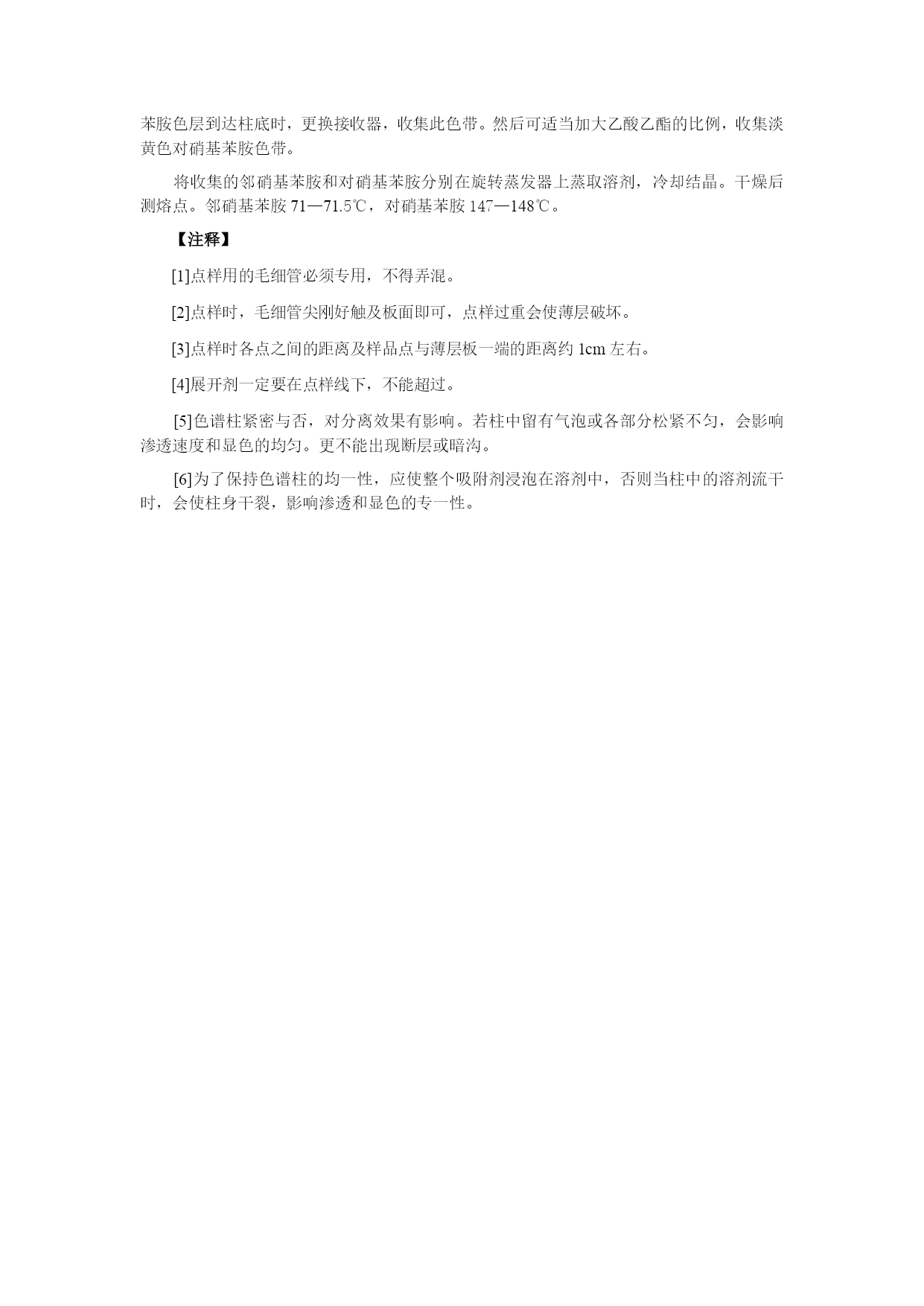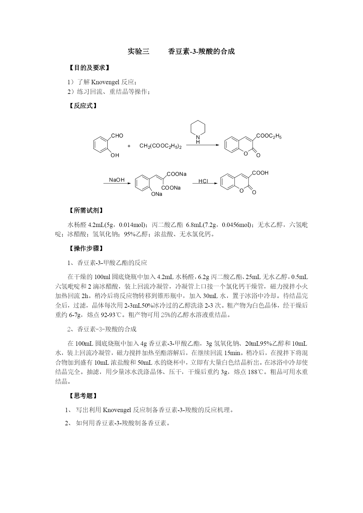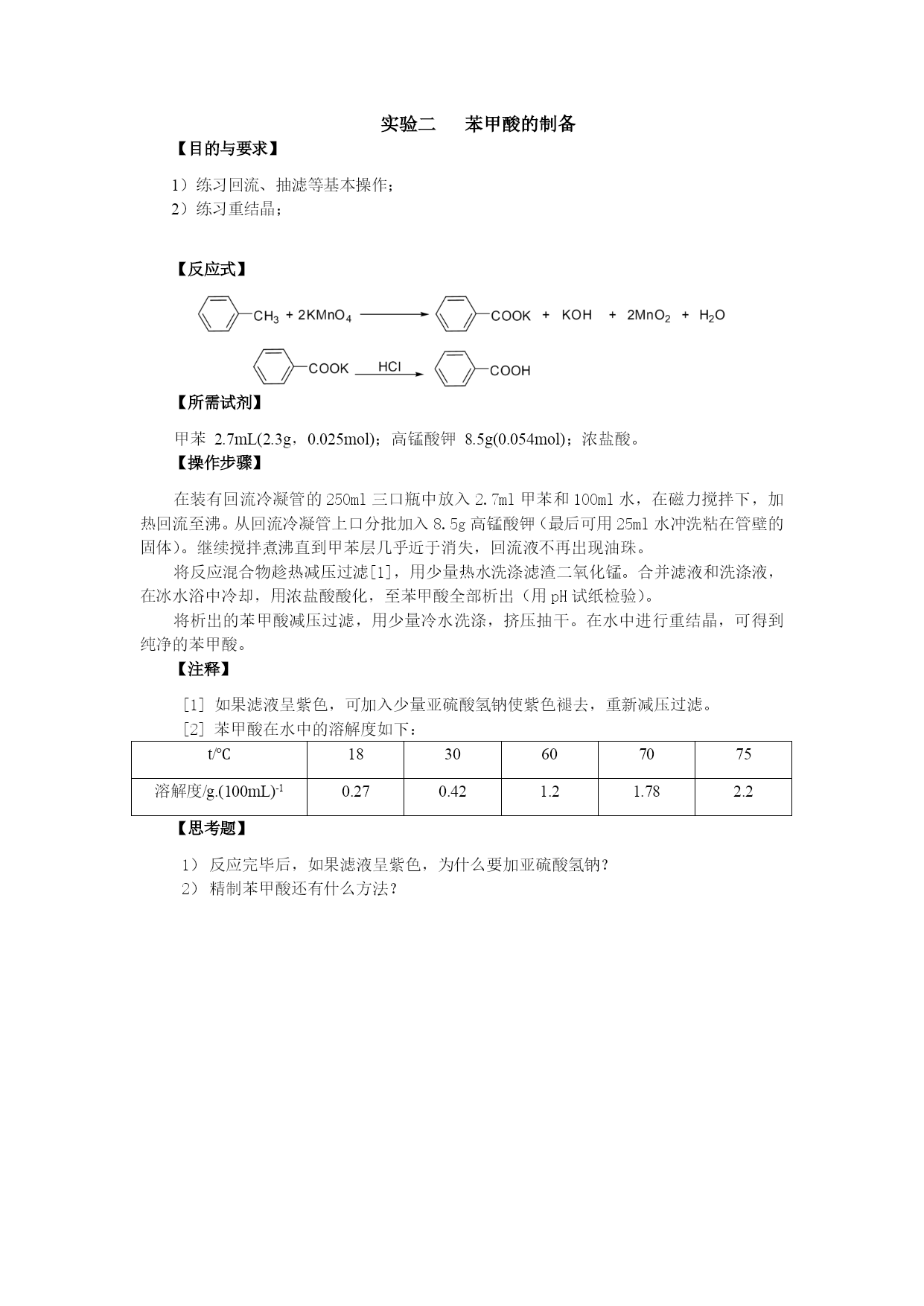 实验一柱色谱分离技术——邻硝基苯胺和对硝基苯胺的分离【目的与要求】练习薄层色谱及柱色谱分离技术【所需试剂】硅胶板;硅胶;邻硝基苯胺和对硝基苯胺混合物(0.55g对硝基苯胺和0.7g邻硝基苯胺溶于100mL石油醚中);乙酸乙酯;石油醚【操作步骤】1、邻硝基苯胺和对硝基苯胺的薄层分离取已经准备好的硅胶板一块,用管口平整的毛细管[1]插入样品液中,在距离板一端1cm处轻轻点样[2]。每块板点样三个,分别点样邻硝基苯胺、对硝基苯胺及未知混合物[3]。如下图:在层析杯内倒入少许展开剂,高度应为0.5cm左右,盖好层析杯,稍加摇振,使层析杯内被溶剂蒸气饱和。将点好样的薄层板放入层析杯内,点样一端在下,浸入展开剂内约0.5cm[4],盖好杯子。待溶剂前沿距板的上端0.5cm时,立即取出薄层板,用铅笔记下溶剂前沿位置,晾干。展开剂是石油醚及乙酸乙酯的混合物,其比例同学自己确定。几个同学一组,按不同的体积比展开,确定柱层析时的洗脱剂。建议采用以下比例:石油醚:乙酸乙酯(体积比)1:1;3:2;2:1;5:22、邻硝基苯胺和对硝基苯胺的柱色谱层分离取色谱柱一根,垂直装置,以锥形瓶作洗脱剂的接收器。先将溶剂倒入柱内约柱高的3/4,然后再将一定量的吸附剂和溶剂调成糊状,从柱的上面倒入柱内,同时打开柱下活塞,控制流速每秒一滴,用木棒或套有橡皮的玻璃棒轻轻敲打柱身,使吸附剂慢慢而均匀地下沉[5],在整个操作过程中,柱内的液面始终要高出吸附剂[6]。当溶剂的液面恰好降至硅胶的表面上时,立即用滴管沿柱壁加入3ml邻硝基苯胺和对硝基苯胺的混合液。当溶液液面降至氧化铝表面时,用滴管滴入溶剂洗去粘附在柱壁上的混合物。然后用按照根据薄层色谱确定的洗脱剂淋洗,观察色带的形成和分离。当黄色邻硝基苯胺色层到达柱底时,更换接收器,收集此色带。然后可适当加大乙酸乙酯的比例,收集淡黄色对硝基苯胺色带。将收集的邻硝基苯胺和对硝基苯胺分别在旋转蒸发器上蒸取溶剂,冷却结晶。干燥后测熔点。邻硝基苯胺71—71.5℃,对硝基苯胺147—148℃。【注释】[1]点样用的毛细管必须专用,不得弄混。[2]点样时,毛细管尖刚好触及板面即可,点样过重会使薄层破坏。[3]点样时各点之间的距离及样品点与薄层板一端的距离约1cm左右。[4]展开剂一定要在点样线下,不能超过。[5]色谱柱紧密与否,对分离效果有影响。若柱中留有气泡或各部分松紧不匀,会影响渗透速度和显色的均匀。更不能出现断层或暗沟。[6]为了保持色谱柱的均一性,应使整个吸附剂浸泡在溶剂中,否则当柱中的溶剂流干时,会使柱身干裂,影响渗透和显色的专一性。实验二苯甲酸的制备【目的与要求】1)练习回流、抽滤等基本操作;2)练习重结晶;【反应式】【所需试剂】甲苯2.7mL(2.3g,0.025mol);高锰酸钾8.5g(0.054mol);浓盐酸。【操作步骤】在装有回流冷凝管的250ml三口瓶中放入2.7ml甲苯和100ml水,在磁力搅拌下,加热回流至沸。从回流冷凝管上口分批加入8.5g高锰酸钾(最后可用25ml水冲洗粘在管壁的固体)。继续搅拌煮沸直到甲苯层几乎近于消失,回流液不再出现油珠。将反应混合物趁热减压过滤[1],用少量热水洗涤滤渣二氧化锰。合并滤液和洗涤液,在冰水浴中冷却,用浓盐酸酸化,至苯甲酸全部析出(用pH试纸检验)。将析出的苯甲酸减压过滤,用少量冷水洗涤,挤压抽干。在水中进行重结晶,可得到纯净的苯甲酸。【注释】[1]如果滤液呈紫色,可加入少量亚硫酸氢钠使紫色褪去,重新减压过滤。[2]苯甲酸在水中的溶解度如下:t/℃1830607075溶解度/g.(100mL)-10.270.421.21.782.2【思考题】反应完毕后,如果滤液呈紫色,为什么要加亚硫酸氢钠?精制苯甲酸还有什么方法?实验三香豆素-3-羧酸的合成【目的及要求】1)了解Knovengel反应;2)练习回流、重结晶等操作;【反应式】【所需试剂】水杨醛4.2mL(5g,0.014mol);丙二酸乙酯6.8mL(7.2g,0.0456mol);无水乙醇,六氢吡啶;冰醋酸;氢氧化钠;95%乙醇;浓盐酸、无水氯化钙。【操作步骤】1、香豆素-3-甲酸乙酯的反应在干燥的100ml圆底烧瓶中加入4.2mL水杨醛,6.2g丙二酸乙酯、25mL无水乙醇,0.5mL六氢吡啶和2滴冰醋酸,装上回流冷凝管,冷凝管上口接一个氯化钙干燥管,磁力搅拌小火加热回流2h。稍冷后将反应物转移到锥形瓶中,加入30mL水,置于冰浴中冷却。待结晶完全后,过滤,晶体每次用2-3mL50%冰冷过的乙醇洗涤2-3次。粗产物为白色晶体,经干燥后重约6-7g,熔点