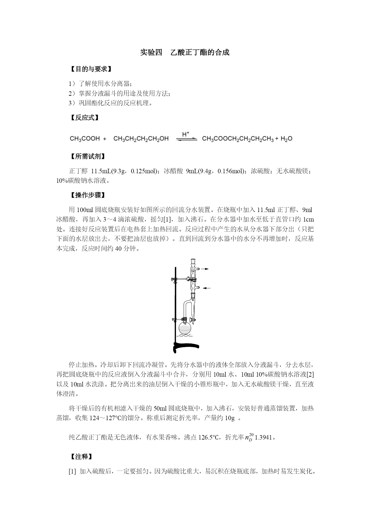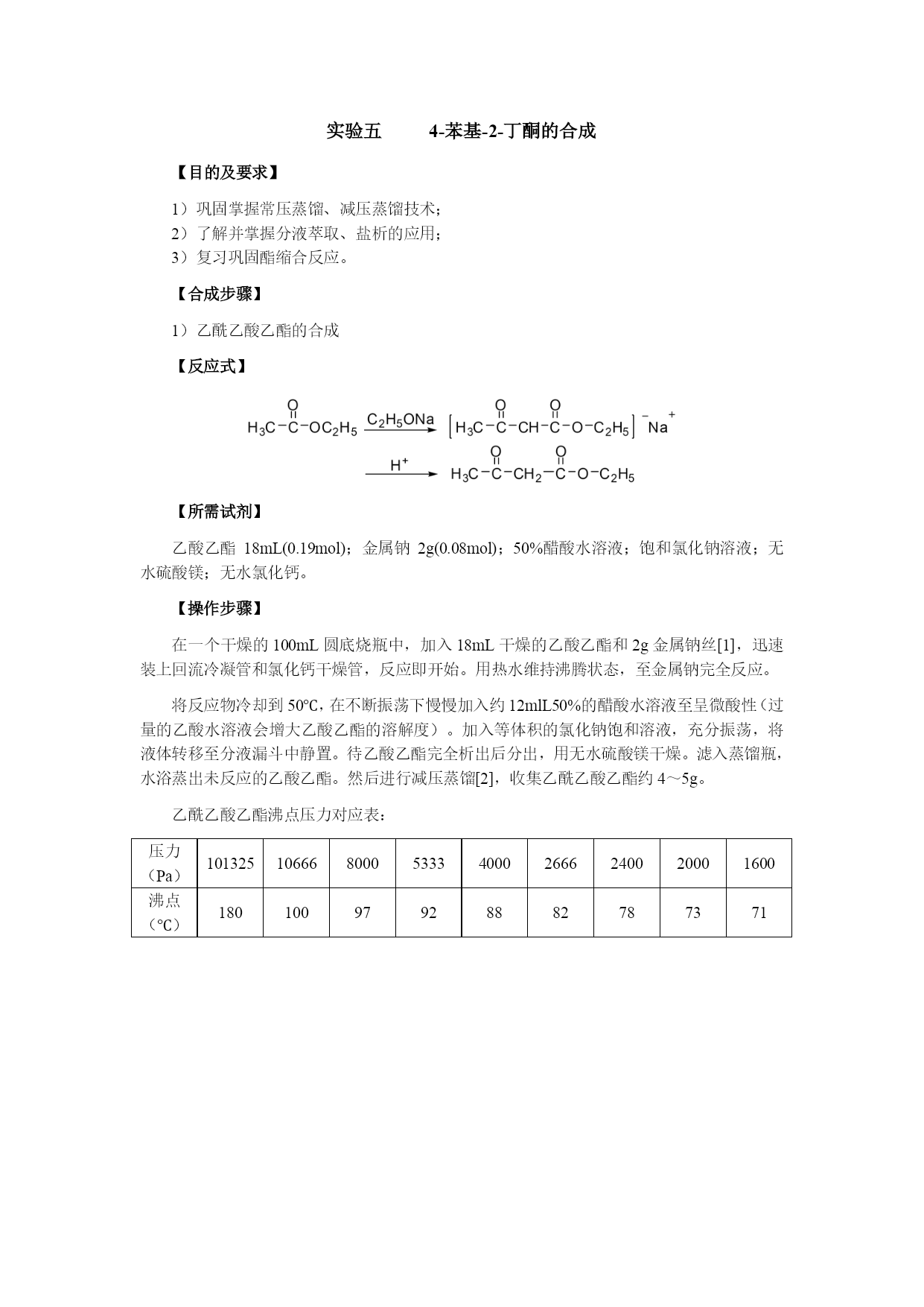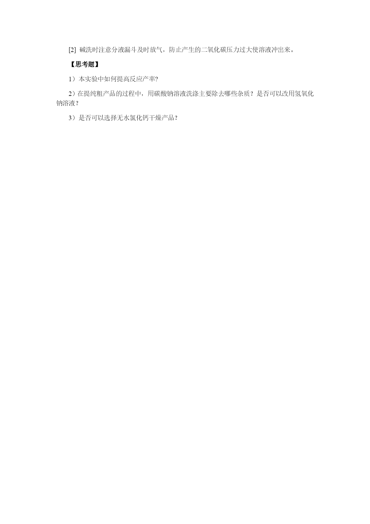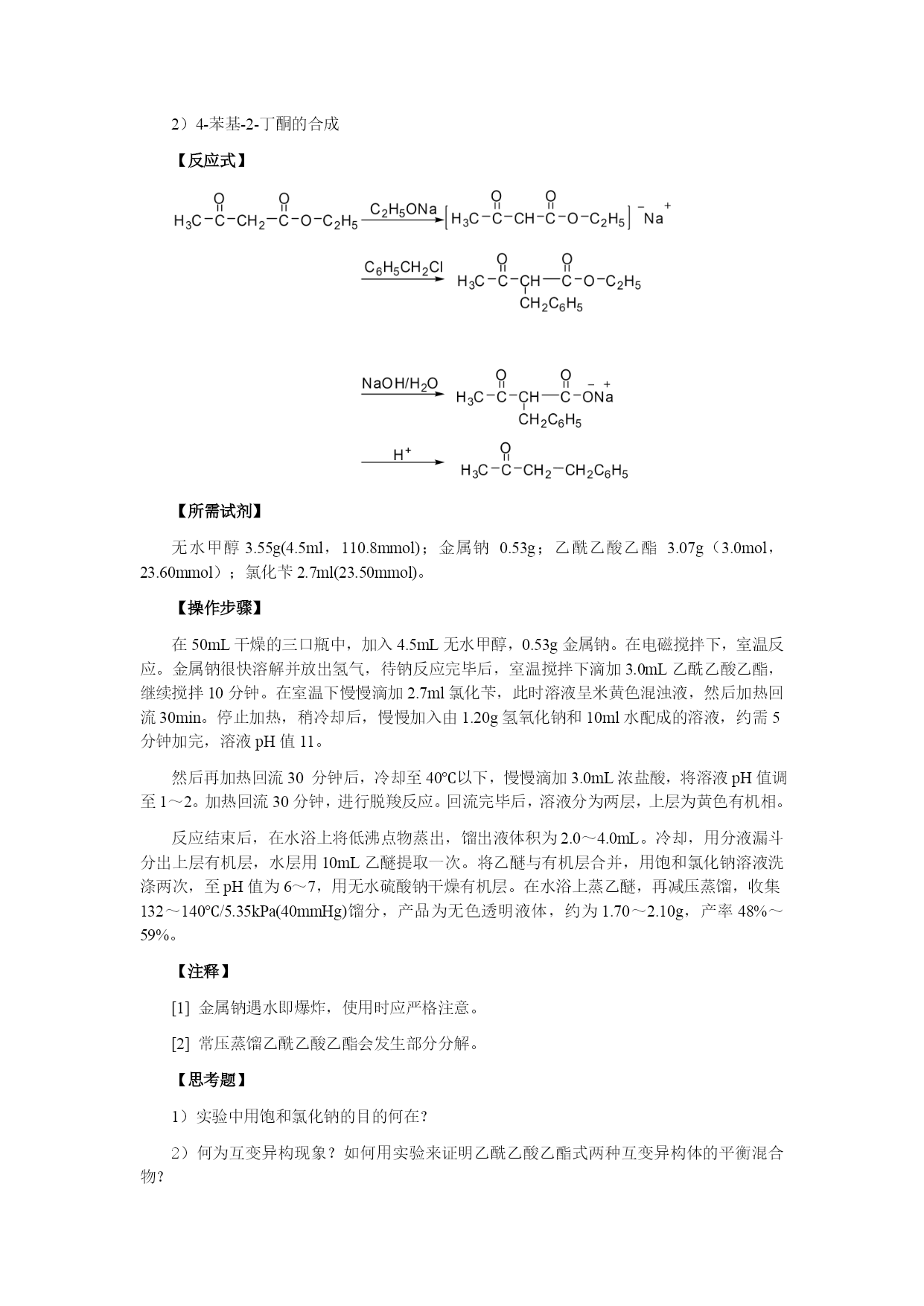 实验一柱色谱分离技术——邻硝基苯胺和对硝基苯胺的分离【目的与要求】练习薄层色谱及柱色谱分离技术【所需试剂】硅胶板;硅胶;邻硝基苯胺和对硝基苯胺混合物(0.55g对硝基苯胺和0.7g邻硝基苯胺溶于100mL石油醚中);乙酸乙酯;石油醚【操作步骤】1、邻硝基苯胺和对硝基苯胺的薄层分离取已经准备好的硅胶板一块,用管口平整的毛细管[1]插入样品液中,在距离板一端1cm处轻轻点样[2]。每块板点样三个,分别点样邻硝基苯胺、对硝基苯胺及未知混合物[3]。如下图:在层析杯内倒入少许展开剂,高度应为0.5cm左右,盖好层析杯,稍加摇振,使层析杯内被溶剂蒸气饱和。将点好样的薄层板放入层析杯内,点样一端在下,浸入展开剂内约0.5cm[4],盖好杯子。待溶剂前沿距板的上端0.5cm时,立即取出薄层板,用铅笔记下溶剂前沿位置,晾干。展开剂是石油醚及乙酸乙酯的混合物,其比例同学自己确定。几个同学一组,按不同的体积比展开,确定柱层析时的洗脱剂。建议采用以下比例:石油醚:乙酸乙酯(体积比)1:1;3:2;2:1;5:22、邻硝基苯胺和对硝基苯胺的柱色谱层分离取色谱柱一根,垂直装置,以锥形瓶作洗脱剂的接收器。先将溶剂倒入柱内约柱高的3/4,然后再将一定量的吸附剂和溶剂调成糊状,从柱的上面倒入柱内,同时打开柱下活塞,控制流速每秒一滴,用木棒或套有橡皮的玻璃棒轻轻敲打柱身,使吸附剂慢慢而均匀地下沉[5],在整个操作过程中,柱内的液面始终要高出吸附剂[6]。当溶剂的液面恰好降至硅胶的表面上时,立即用滴管沿柱壁加入3ml邻硝基苯胺和对硝基苯胺的混合液。当溶液液面降至氧化铝表面时,用滴管滴入溶剂洗去粘附在柱壁上的混合物。然后用按照根据薄层色谱确定的洗脱剂淋洗,观察色带的形成和分离。当黄色邻硝基苯胺色层到达柱底时,更换接收器,收集此色带。然后可适当加大乙酸乙酯的比例,收集淡黄色对硝基苯胺色带。将收集的邻硝基苯胺和对硝基苯胺分别在旋转蒸发器上蒸取溶剂,冷却结晶。干燥后测熔点。邻硝基苯胺71—71.5℃,对硝基苯胺147—148℃。【注释】[1]点样用的毛细管必须专用,不得弄混。[2]点样时,毛细管尖刚好触及板面即可,点样过重会使薄层破坏。[3]点样时各点之间的距离及样品点与薄层板一端的距离约1cm左右。[4]展开剂一定要在点样线下,不能超过。[5]色谱柱紧密与否,对分离效果有影响。若柱中留有气泡或各部分松紧不匀,会影响渗透速度和显色的均匀。更不能出现断层或暗沟。[6]为了保持色谱柱的均一性,应使整个吸附剂浸泡在溶剂中,否则当柱中的溶剂流干时,会使柱身干裂,影响渗透和显色的专一性。实验二苯甲酸的制备【目的与要求】1)练习回流、抽滤等基本操作;2)练习重结晶;【反应式】【所需试剂】甲苯2.7mL(2.3g,0.025mol);高锰酸钾8.5g(0.054mol);浓盐酸。【操作步骤】在装有回流冷凝管的250ml三口瓶中放入2.7ml甲苯和100ml水,在磁力搅拌下,加热回流至沸。从回流冷凝管上口分批加入8.5g高锰酸钾(最后可用25ml水冲洗粘在管壁的固体)。继续搅拌煮沸直到甲苯层几乎近于消失,回流液不再出现油珠。将反应混合物趁热减压过滤[1],用少量热水洗涤滤渣二氧化锰。合并滤液和洗涤液,在冰水浴中冷却,用浓盐酸酸化,至苯甲酸全部析出(用pH试纸检验)。将析出的苯甲酸减压过滤,用少量冷水洗涤,挤压抽干。在水中进行重结晶,可得到纯净的苯甲酸。【注释】[1]如果滤液呈紫色,可加入少量亚硫酸氢钠使紫色褪去,重新减压过滤。[2]苯甲酸在水中的溶解度如下:t/℃1830607075溶解度/g.(100mL)-10.270.421.21.782.2【思考题】反应完毕后,如果滤液呈紫色,为什么要加亚硫酸氢钠?精制苯甲酸还有什么方法?实验三香豆素-3-羧酸的合成【目的及要求】1)了解Knovengel反应;2)练习回流、重结晶等操作;【反应式】【所需试剂】水杨醛4.2mL(5g,0.014mol);丙二酸乙酯6.8mL(7.2g,0.0456mol);无水乙醇,六氢吡啶;冰醋酸;氢氧化钠;95%乙醇;浓盐酸、无水氯化钙。【操作步骤】1、香豆素-3-甲酸乙酯的反应在干燥的100ml圆底烧瓶中加入4.2mL水杨醛,6.2g丙二酸乙酯、25mL无水乙醇,0.5mL六氢吡啶和2滴冰醋酸,装上回流冷凝管,冷凝管上口接一个氯化钙干燥管,磁力搅拌小火加热回流2h。稍冷后将反应物转移到锥形瓶中,加入30mL水,置于冰浴中冷却。待结晶完全后,过滤,晶体每次用2-3mL50%冰冷过的乙醇洗涤2-3次。粗产物为白色晶体,经干燥后重约6-7g,熔点