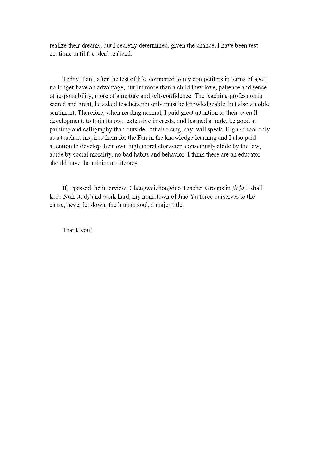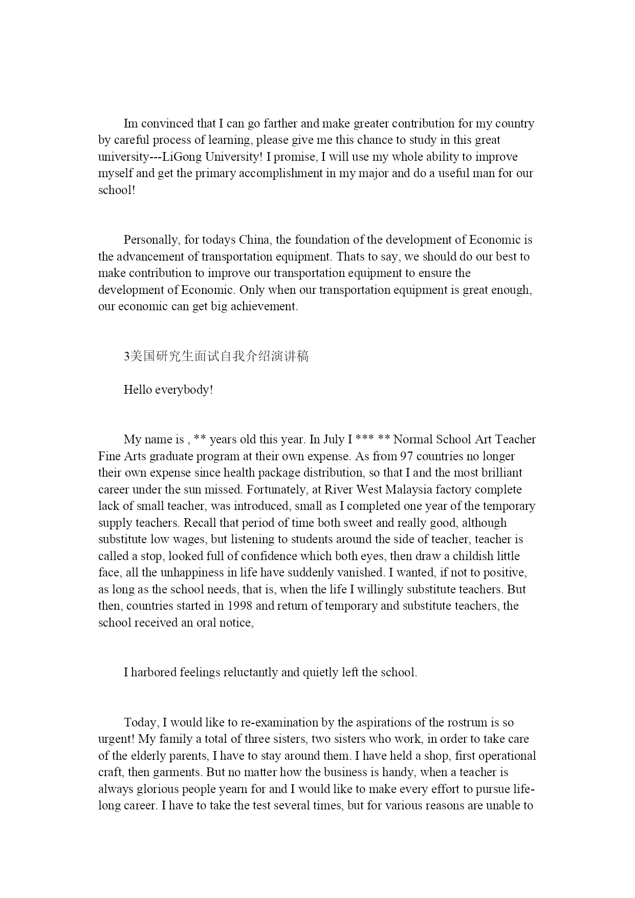 美国研究生面试自我介绍演讲稿angemyjob.AndinAugust2007,IleftQingDaotoBeiJingandworkedforaforeignenterpriseasaautomationsoftwaretestengineer.BecauseIwanttochangemyworkingenvironment,Idliketofindajobwhichismorechallenging.MoroverMotorolaisaglobalcompany,soIfeelIcangainthemostfromworkinginthiskindofcompanyennvironment.ThatisthereasonwhyIcomeheretocompeteforthisposition.IthinkImagoodteamplayerandImapersonofgreathonestytoothers.AlsoIamabletoworkundergreatpressure.Thatsall.Thankyouforgivingmethechance.2美国研究生面试自我介绍演讲稿Goodmorning,mynameisPanShiqiang22yearsold,borninHuBeiprovince.Itisreallyagreathonortohavethisopportunityforaninterview,Iwouldliketoanswerwhateveryoumayraise,andIhopeIcanmakeagoodperformancetoday!NowIwillintroducemyselfbrieflybythreeaspects:Strength;WeaknessandAchievements!Strength:Ifeelthatmystrongestassetismyabilitytosticktothingstogetthemdone.IfeelarealsenseofaccomplishmentwhenIfinishajobanditturnsoutjustasIdplanned.Ivesetsomehighgoalsformyself.Forexample,Iwanttograduatewithhighestscores.Andatlast,IbecomeoneoftheoutstandinggraduatesinChongQingUniversityafteralotofstudy.Besides,Iamgoodatbuildingmathematicalmodelsandanalyzingquestionswitheconomicmethods.Weakness:ImsuchaperfectionistthatIwillnotstopuntilajobiswelldone.Achievements:IhadacquiredthefirstprizebydesigningmodelsonMathematicalmodelingin20xx;besides,IhadhelpmyteacherstoanalyzetheWarrantpricingbyvarietiesmethods.ImconvincedthatIcangofartherandmakegreatercontributionformycountrybycarefulprocessoflearning,pleasegivemethischancetostudyinthisgreatuniversity---LiGongUniversity!Ipromise,Iwillusemywholeabilitytoimprovemyselfandgettheprimaryaccomplishmentinmymajoranddoausefulmanforourschool!Personally,fortodaysChina,thefoundationofthedevelopmentofEconomicistheadvancementoftransportationequipment.Thatstosay,weshoulddoourbesttomakecontributiontoimproveourtransportationequipmenttoensurethedevelopmentofEconomic.Onlywhenourtransportationequipmentisgreatenough,oureconomiccangetbigachievement.3美国研究