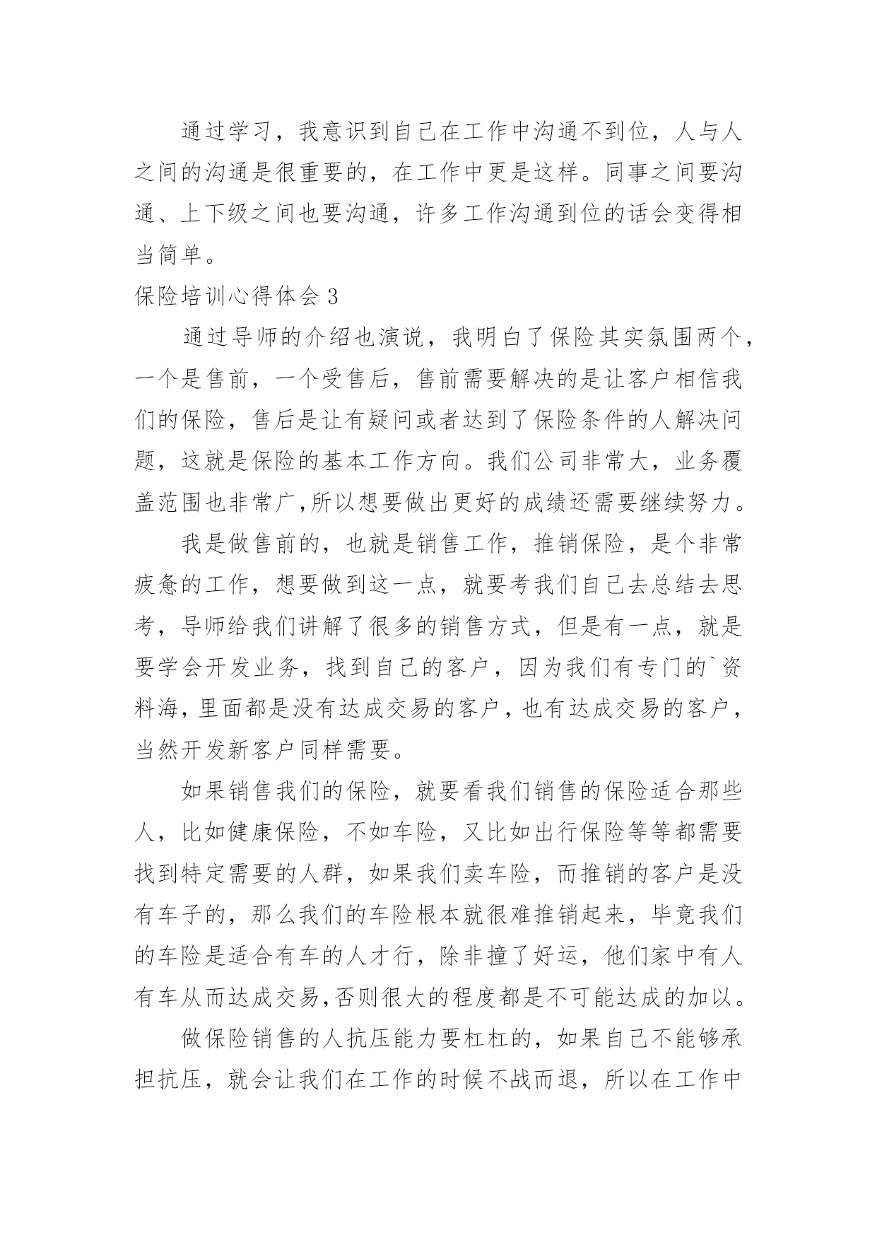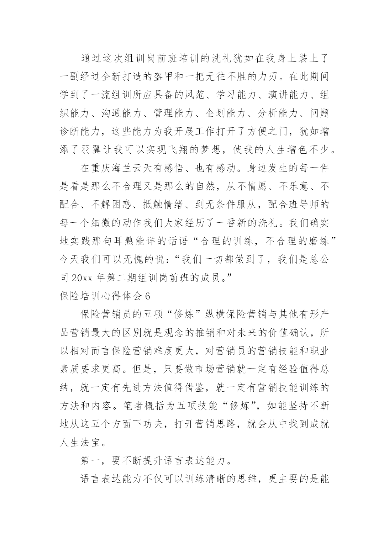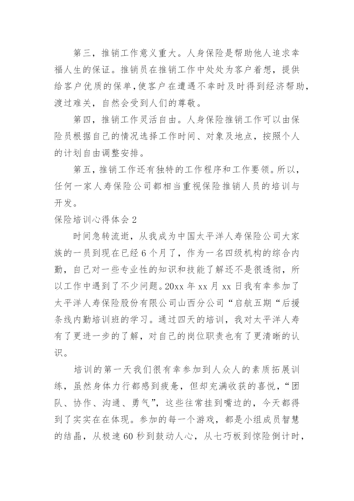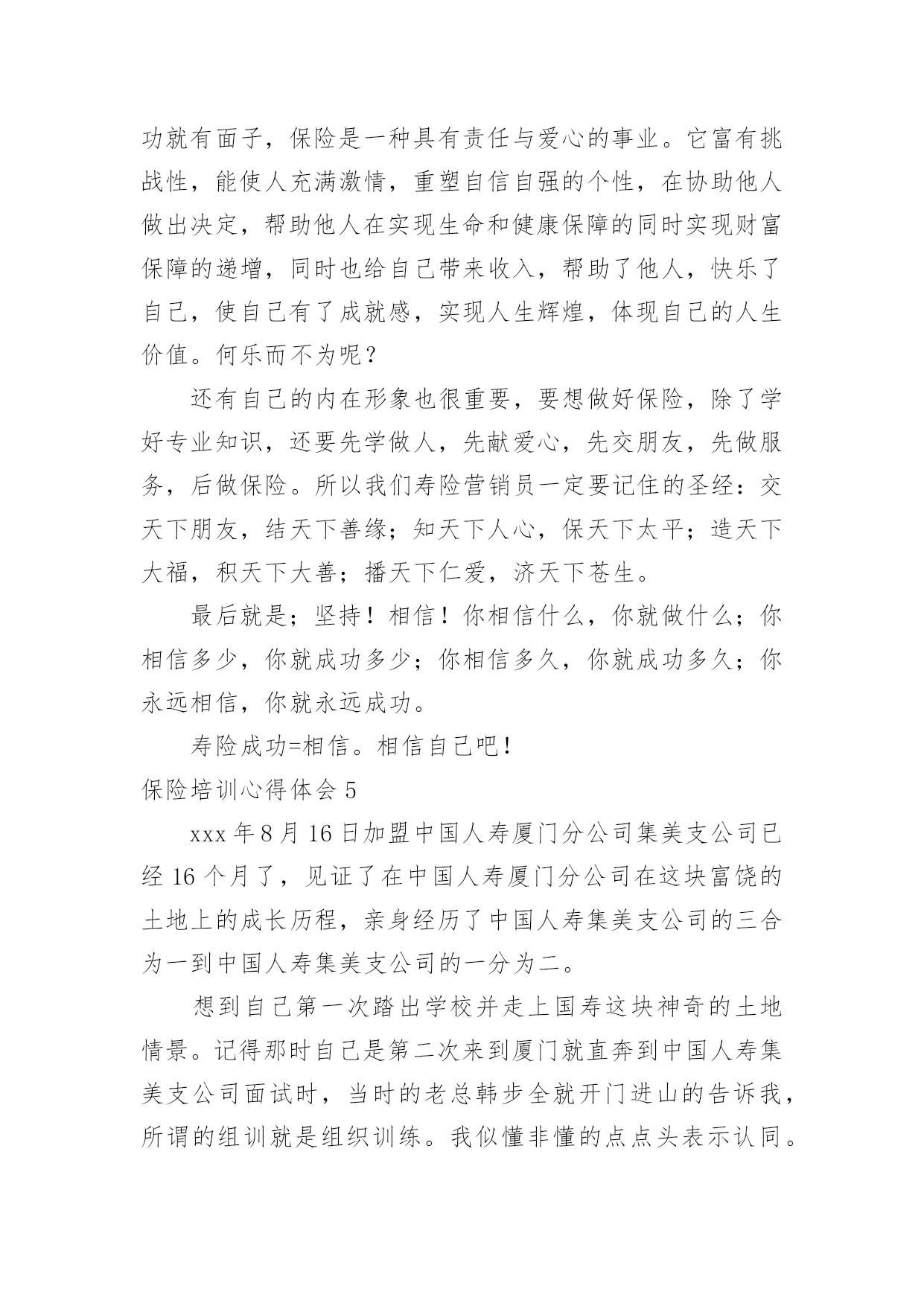 保险培训心得体会保险培训心得体会(经典15篇)我们从一些事情上得到感悟后,写心得体会是一个不错的选择,从而不断地丰富我们的思想。那么心得体会到底应该怎么写呢?下面是小编为大家收集的保险培训心得体会,欢迎阅读与收藏。保险培训心得体会1xxxx年x月—xxxx年x月,我在中国人寿保险公司青岛分公司进行了为期两个月的培训。中国人寿保险股份有限公司是中国大陆最大的专业化商业人寿保险公司,是中国内地第一家在美、港两地同时上市的金融企业,xx03年被《欧洲货币》评为“亚洲最好的保险公司”,xx03年度世界500强企业评选中,中国人寿保险股份有限公司再次入选世界500强,排名也大幅度上升。中国人寿连续8年在保费收入、资产总额、客户规模和市场占有率上排名业界第一。中国人寿拥有长期忠实客户1.6亿人,短期保单客户1.5亿人,为6亿多人提供了人身保险。我培训的部门是该公司的培训部,培训部的职责是对本公司的保险推销人员(即外勤人员或业务员)进行系统的、专业的培训,帮助他们掌握推销的方法,提高他们的推销技巧,从而提升公司的业绩。(一)推销工作的重要性及其特点人身保险是以人的生命或身体为保险对象的,保险人对被保险人的生命或身体因遭受事故、意外伤害、疾病、衰老等原因导致的死亡、残疾、丧失工作能力或者年老退休责任给付保险金的一种保险方式。因此,以经营人身保险为主的保险公司所提供的`产品就具有无形性、同质性、广泛多样性和分散性等特性。而且人身保险所涉及的往往是人的老、死、疾、残等。在中国这样一个儒教的过度里人们大多忌讳谈论这些话题。所以即使人们有巨大的保险需求,也很少有人主动的去购买保险产品。这就需要我们的人身保险推销员来为客户介绍保险产品,引导客户发现需求,激发客户实现需求,推销公司的保险产品,提高公司的业绩,提升公司的形象。保险推销工作是保险公司的赖以生存的前提。(二)人身保险的推销工作具有一些特点。第一,推销工作具有服务性。这种服务性表现为:首先是在顾客购买之前,推销人员应根据客户的需要,帮助其设计保险方案,选择适当的险种;其次在顾客购买之后,根据客户保险需求的变化和新险种的出现,帮助顾客调整保险方案,确保其财务稳定;再次当保险事故发生或期限届满时,主动帮助客户索赔或提供这方面的咨询服务。第二,保险工作需要丰富的知识。人身保险本身是一种合同,也是一种家庭经济计划。它不但牵涉到法律、税金、医学、金融投资、社会学方面的知识,还要考虑到客户家庭情况、收入状况及未来的经济计划和投资方向及客户的心理状态和消费习惯。第三,推销工作意义重大。人身保险是帮助他人追求幸福人生的保证。推销员在推销工作中处处为客户着想,提供给客户优质的保单,使客户在遭遇不幸时及时得到经济帮助,渡过难关,自然会受到人们的尊敬。第四,推销工作灵活自由。人身保险推销工作可以由保险员根据自己的情况选择工作时间、对象及地点,按照个人的计划自由调整安排。第五,推销工作还有独特的工作程序和工作要领。所以,任何一家人寿保险公司都相当重视保险推销人员的培训与开发。保险培训心得体会2时间急转流逝,从我成为中国太平洋人寿保险公司大家族的一员到现在已经6个月了,作为一名四级机构的综合内勤,自己对一些专业性的知识和技能了解还不是很透彻,所以工作中遇到了不少问题。20xx年xx月xx日我有幸参加了太平洋人寿保险股份有限公司山西分公司“启航五期“后援条线内勤培训班的学习。通过四天的培训,我对太平洋人寿有了更进一步的了解,对自己的岗位职责也有了更清晰的认识。培训的第一天我们很有幸参加到人众人的素质拓展训练,虽然身体力行都感到疲惫,但却充满收获的喜悦,“团队、协作、沟通、勇气”,这些往常挂到嘴边的,今天都得到了实实在在体现。参加的每一个游戏,都是小组成员智慧的结晶,从极速60秒到鼓动人心,从七巧板到惊险倒计时,每一项都是所有成员决策、分工与决心的'努力。一天半的拓展训练告诉我们一些道理:1、团队的成功,不一定取决于某一个人,而取决于团队的向心力和协作以及相互的鼓励和加油,否则即便这个人的能力再高,也会遭到必然的失败,每一个人的个人成功,并不能代表一个团体的成功,而团体的失败,则一定是每一个人的失败。2、在工作和生活中会遇到很多事情,不要老是去抱怨事情太多,每做一件事情要注意时间上的衔接,从而有效地提高工作的效率。3、言胜于行,电视剧《士兵突击》中团长对许三多说过一句话:想到和得到中间还有两个字就是做到。4、在工作和生活中要关注积极向上的事物,俗话说:你的注意力在哪里,你的舞台就在哪里。在工作和生活中,如果你的关注点放在积极向上的事情上面,那么你的生活将充满阳光;如果你只会一味的抱怨,那么你将生活在无尽的黑暗中,发现不了任何美的事物。生活中不是缺少美,而是缺少发现美的眼睛。第二天的培训由总经理室各条线的分管总对整个公司的