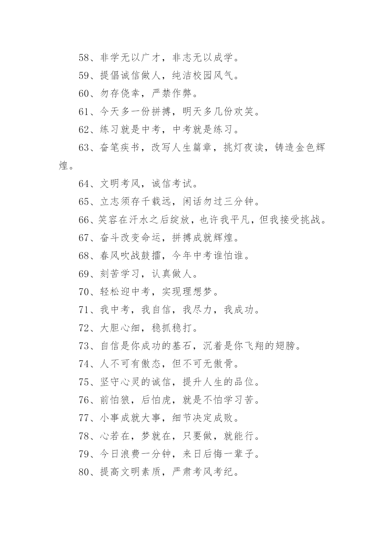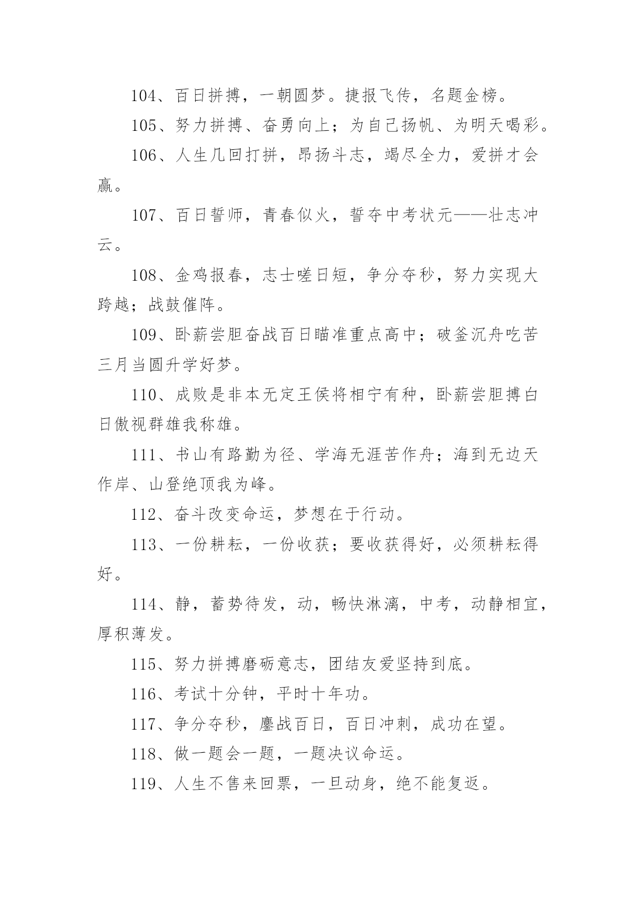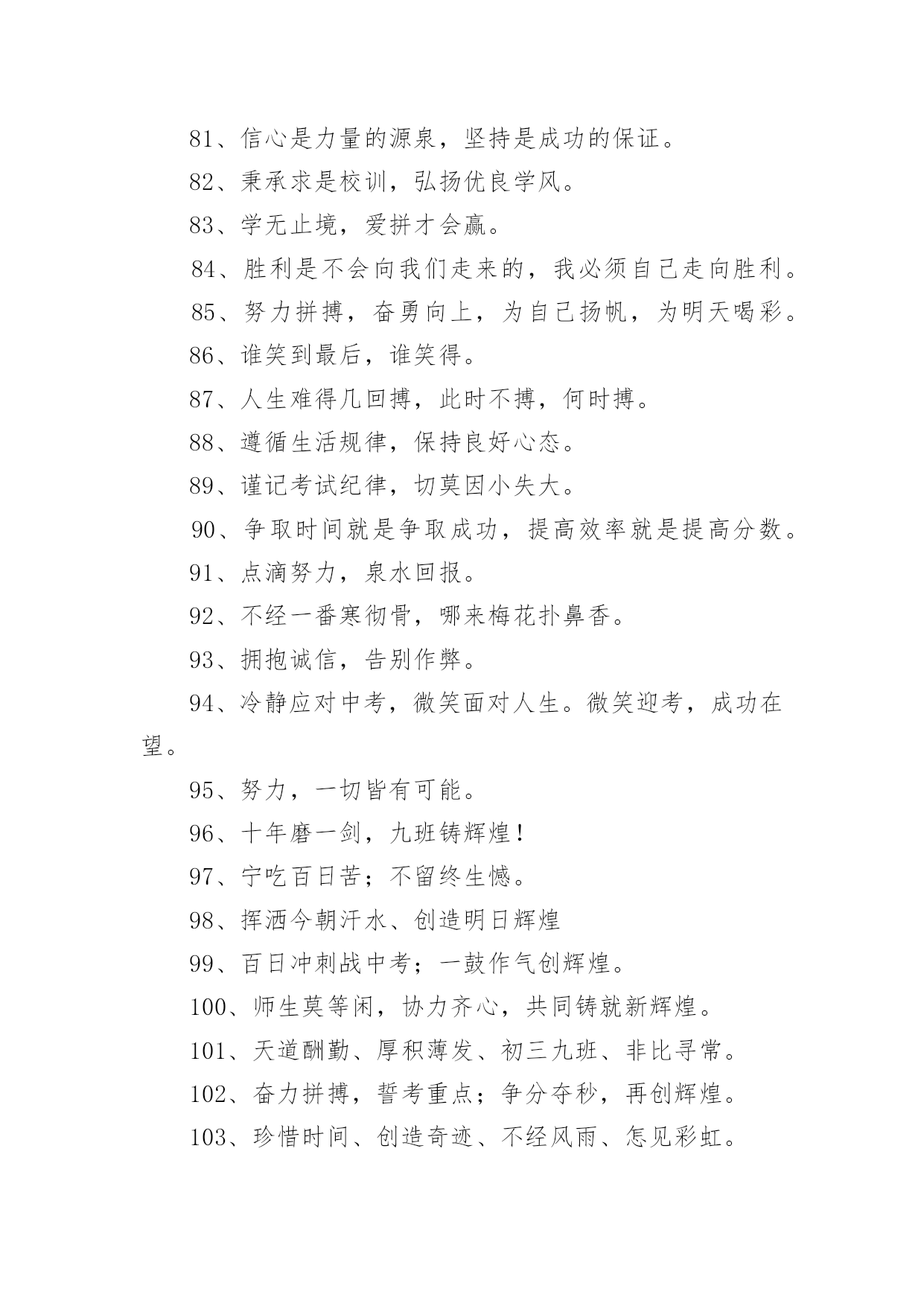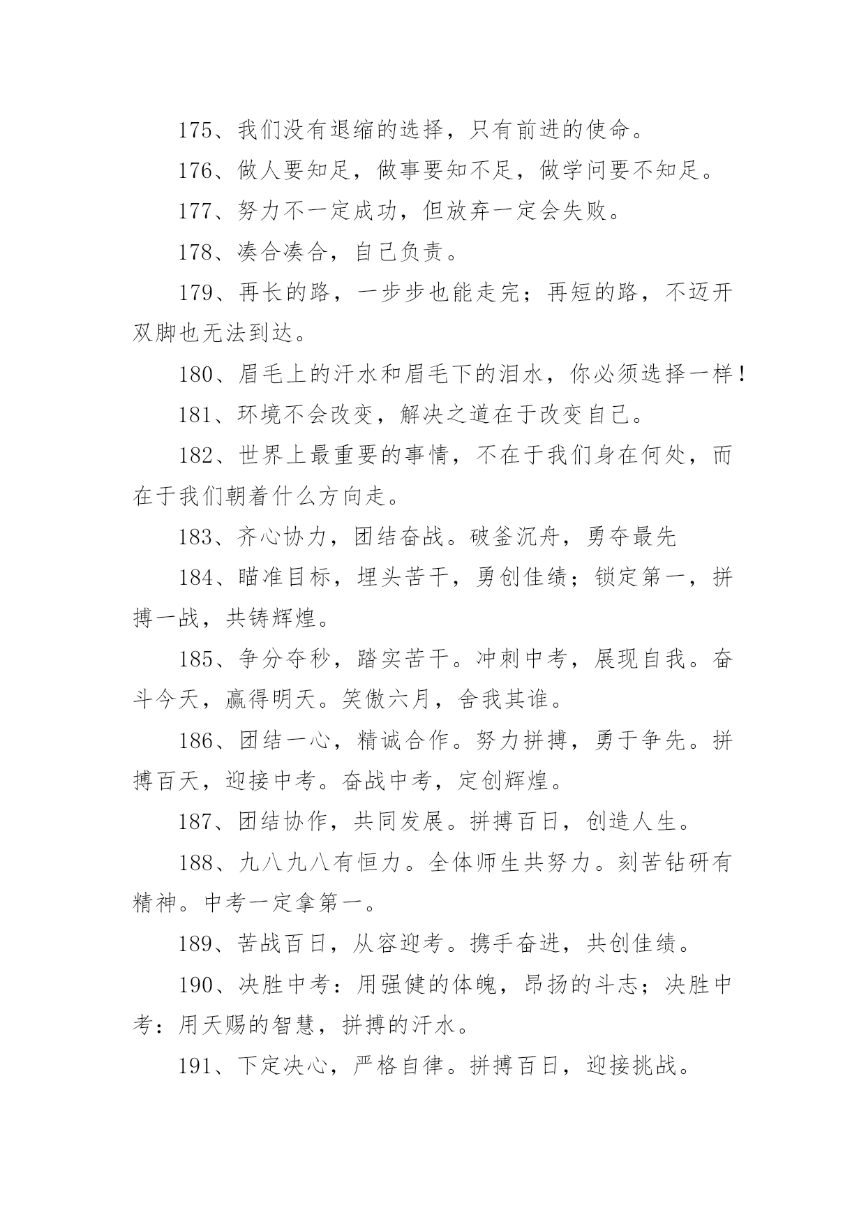 中考励志的标语简短霸气中考励志的标语简短霸气280句在生活、工作和学习中,大家都经常接触到标语吧,标语具有非常明显的时代特征和行业特色。你所见过的标语是什么样的呢?下面是小编帮大家整理的中考励志的标语简短霸气280句,仅供参考,欢迎大家阅读。1、勤学乐思,奋发向上。2、学贵有恒,务实上进。3、顽强拼搏,勇夺第一。4、严实活新,勤奋进取。5、人生彩排,每一天现场直播。6、功崇惟志,业广为勤。7、宝剑锋从磨砺出,梅花香自苦寒来。8、命运自己主宰,奇迹自己创造。9、文明勤恳,竞争超出。10、短暂辛苦,终身幸福。11、立志欲坚不欲锐,在久不在速。12、自信人生二百年,会当水击三千里。13、不惜寸阴于今日,必留遗憾于明朝。14、如果要挖井,就要挖到水为止。15、精诚所至,金石为开。16、信心决定一切,细节决定成败。17、文明有礼刻苦勤奋,只争朝夕做到。18、人生没有彩排,每一天都是现场直播。19、精细不做假,财会我当家。20、耕耘今天,收获明天。21、努力造就实力,态度决定高度。22、立志宜思真品格,读书须尽苦功夫。23、每一发奋努力的背后,必有加倍的赏赐。24、忍耐一分期待,就可能握住十分的收获。25、自信自律,求实创新。26、要争就能赢,要拼才能赢。27、同舟共济,劈浪向前。28、博学慎思,明辨笃行。29、立志欲坚不欲锐,成功在久不在速。30、博学笃行,自强不息。31、心无旁鹜志在必得32、十年一博六月梦,赢得寒窗锦绣程。33、不思,故无惑;不求,故无得;不问,故无知。34、既然选择了远方,便只顾风雨兼程。35、十年磨剑为一博,六月试锋见真我。36、春播秋收近十载,一朝收获终有成。37、不论你在什么时候开始,重要的是开始之后不要停止。38、不论你在什么时候结束,重要的是结束之后不要悔恨。39、静能生慧,问能解疑。40、浪费今天,是明天的遗憾。41、珍惜现在,是中榜的资本。42、今日拼搏努力,他朝谁与争锋!43、我会成功,因为我志在成功。44、让心动完善理想的美梦,用行动追求现实的成功。45、勤也一年,怠也一年,弹指挥间就一46、学亦快乐,嬉亦快乐,今时拼搏终身乐。47、摒弃侥幸之念,必取百炼成钢;厚积分秒之功,始得一鸣惊人。48、惜光阴百日犹短,看众志成城拼搏第一;细安排一刻也长,比龙争虎斗谁为争锋?!49、为六月最后统考拼搏,稳做王者看谁与争锋?50、脚踏实地,心无旁骛,珍惜分分秒秒。紧跟老师,夯实基础。51、再露锋芒,宜将剩勇追穷寇,一展鸿图,不可沽名学霸王。52、鹰击天风壮,鹏飞海浪春。53、灰心生失望,失望生动摇,动摇生失败。54、理想是力量的泉源、智慧的摇篮、冲锋的战旗、斩棘的利剑。55、有志者自有千方百计,无志者只感千难万难。56、心者,栖神之舍;神者,知识之本;思者,神识之妙用也。57、不思,故有惑;不求,故无得;不问,故不知。58、非学无以广才,非志无以成学。59、提倡诚信做人,纯洁校园风气。60、勿存侥幸,严禁作弊。61、今天多一份拼搏,明天多几份欢笑。62、练习就是中考,中考就是练习。63、奋笔疾书,改写人生篇章,挑灯夜读,铸造金色辉煌。64、文明考风,诚信考试。65、立志须存千载远,闲话勿过三分钟。66、笑容在汗水之后绽放,也许我平凡,但我接受挑战。67、奋斗改变命运,拼搏成就辉煌。68、春风吹战鼓擂,今年中考谁怕谁。69、刻苦学习,认真做人。70、轻松迎中考,实现理想梦。71、我中考,我自信,我尽力,我成功。72、大胆心细,稳抓稳打。73、自信是你成功的基石,沉着是你飞翔的翅膀。74、人不可有傲态,但不可无傲骨。75、坚守心灵的诚信,提升人生的品位。76、前怕狼,后怕虎,就是不怕学习苦。77、小事成就大事,细节决定成败。78、心若在,梦就在,只要做,就能行。79、今日浪费一分钟,来日后悔一辈子。80、提高文明素质,严肃考风考纪。81、信心是力量的源泉,坚持是成功的保证。82、秉承求是校训,弘扬优良学风。83、学无止境,爱拼才会赢。84、胜利是不会向我们走来的,我必须自己走向胜利。85、努力拼搏,奋勇向上,为自己扬帆,为明天喝彩。86、谁笑到最后,谁笑得。87、人生难得几回搏,此时不搏,何时搏。88、遵循生活规律,保持良好心态。89、谨记考试纪律,切莫因小失大。90、争取时间就是争取成功,提高效率就是提高分数。91、点滴努力,泉水回报。92、不经一番寒彻骨,哪来梅花扑鼻香。93、拥抱诚信,告别作弊。94、冷静应对中考,微笑面对人生。微笑迎考,成功在望。95、努力,一切皆有可能。96、十年磨一剑,九班铸辉煌!97、宁吃百日苦;不留终生憾。98、挥洒今朝汗水、创造明日辉煌99、百日冲刺战中考;一鼓作气创辉煌。100、师生莫等闲,协力齐心,共同铸就新辉煌。101、天道酬勤、厚积薄发、初三九班、非比寻常。102、奋