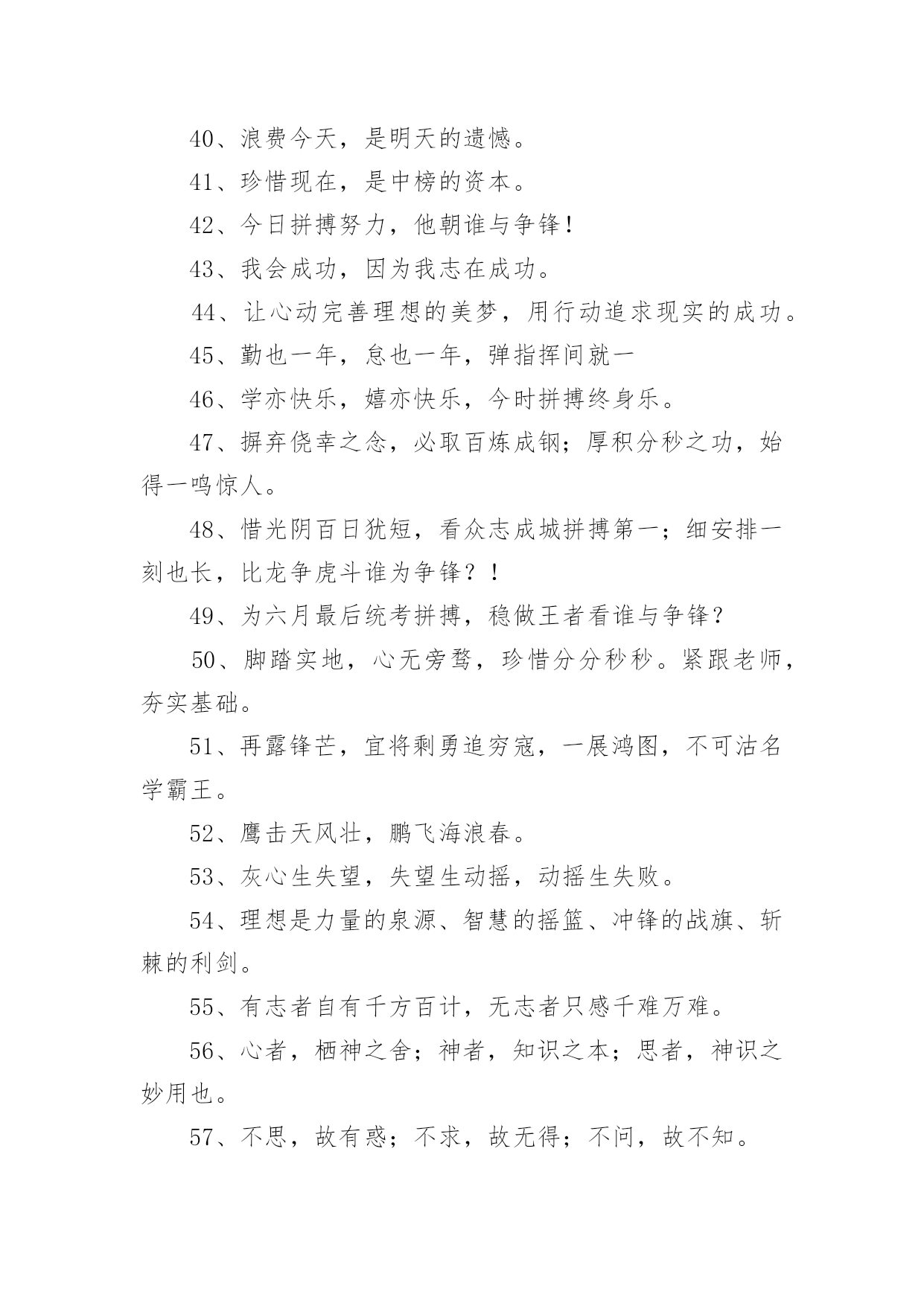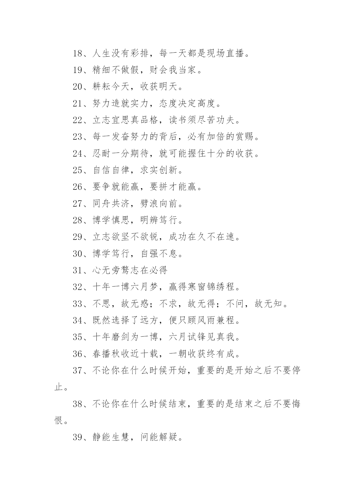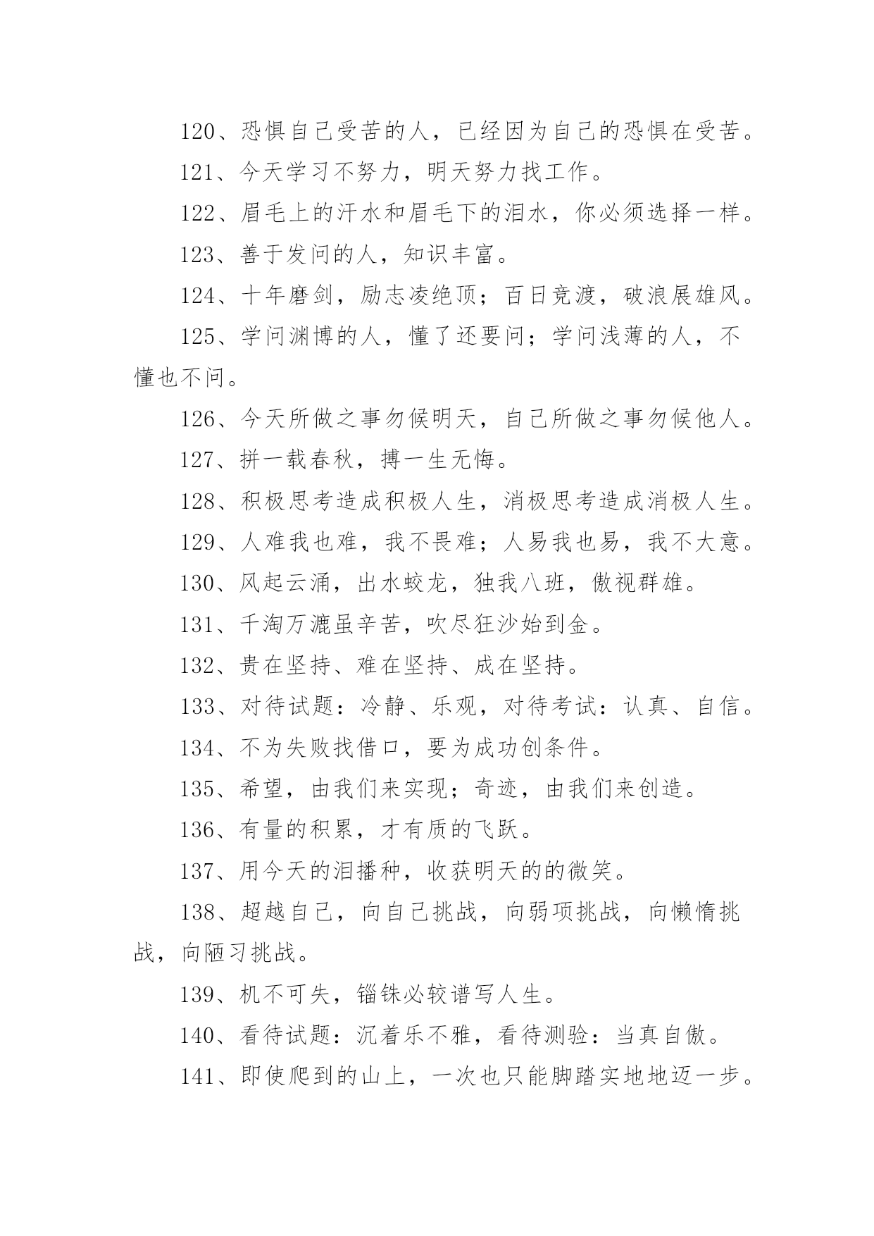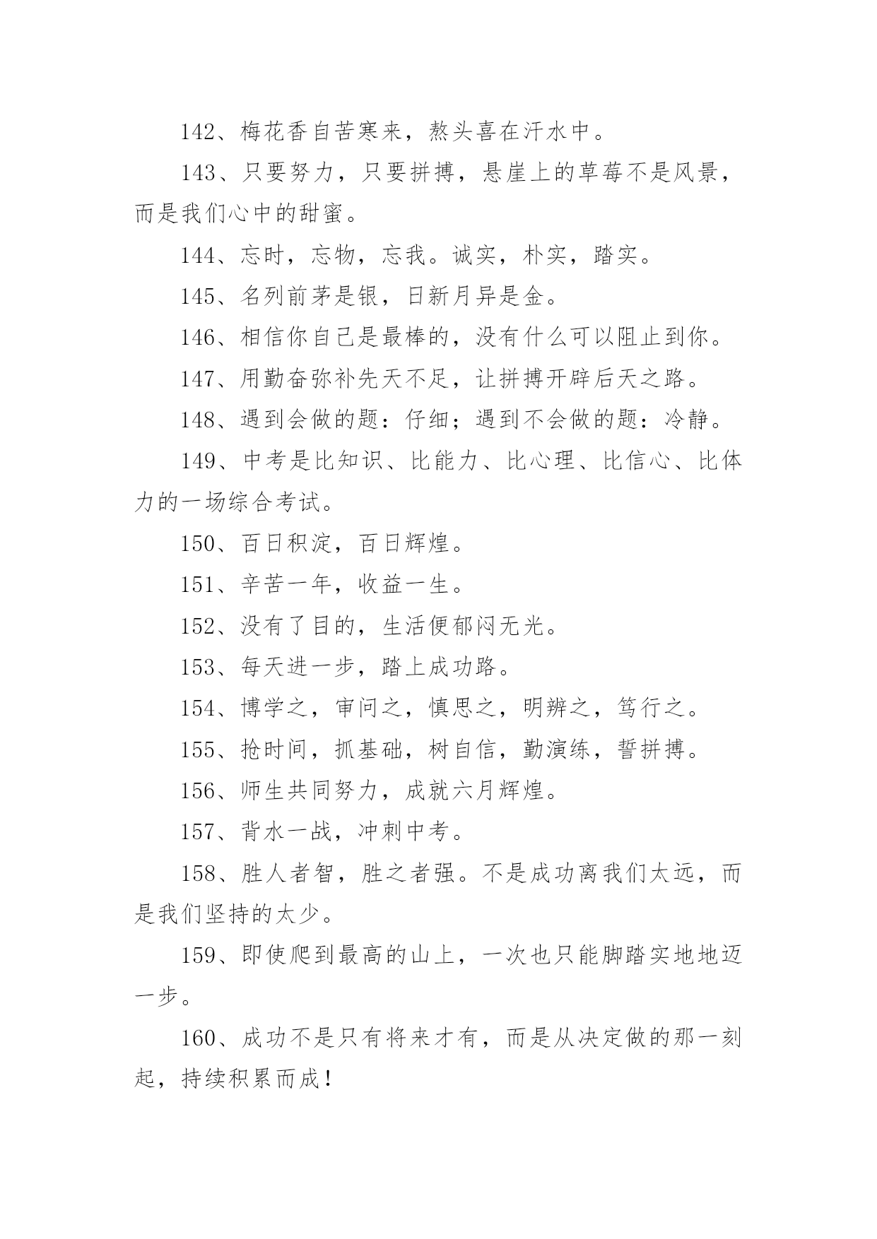 中考励志的标语简短霸气中考励志的标语简短霸气280句在生活、工作和学习中,大家都经常接触到标语吧,标语具有非常明显的时代特征和行业特色。你所见过的标语是什么样的呢?下面是小编帮大家整理的中考励志的标语简短霸气280句,仅供参考,欢迎大家阅读。1、勤学乐思,奋发向上。2、学贵有恒,务实上进。3、顽强拼搏,勇夺第一。4、严实活新,勤奋进取。5、人生彩排,每一天现场直播。6、功崇惟志,业广为勤。7、宝剑锋从磨砺出,梅花香自苦寒来。8、命运自己主宰,奇迹自己创造。9、文明勤恳,竞争超出。10、短暂辛苦,终身幸福。11、立志欲坚不欲锐,在久不在速。12、自信人生二百年,会当水击三千里。13、不惜寸阴于今日,必留遗憾于明朝。14、如果要挖井,就要挖到水为止。15、精诚所至,金石为开。16、信心决定一切,细节决定成败。17、文明有礼刻苦勤奋,只争朝夕做到。18、人生没有彩排,每一天都是现场直播。19、精细不做假,财会我当家。20、耕耘今天,收获明天。21、努力造就实力,态度决定高度。22、立志宜思真品格,读书须尽苦功夫。23、每一发奋努力的背后,必有加倍的赏赐。24、忍耐一分期待,就可能握住十分的收获。25、自信自律,求实创新。26、要争就能赢,要拼才能赢。27、同舟共济,劈浪向前。28、博学慎思,明辨笃行。29、立志欲坚不欲锐,成功在久不在速。30、博学笃行,自强不息。31、心无旁鹜志在必得32、十年一博六月梦,赢得寒窗锦绣程。33、不思,故无惑;不求,故无得;不问,故无知。34、既然选择了远方,便只顾风雨兼程。35、十年磨剑为一博,六月试锋见真我。36、春播秋收近十载,一朝收获终有成。37、不论你在什么时候开始,重要的是开始之后不要停止。38、不论你在什么时候结束,重要的是结束之后不要悔恨。39、静能生慧,问能解疑。40、浪费今天,是明天的遗憾。41、珍惜现在,是中榜的资本。42、今日拼搏努力,他朝谁与争锋!43、我会成功,因为我志在成功。44、让心动完善理想的美梦,用行动追求现实的成功。45、勤也一年,怠也一年,弹指挥间就一46、学亦快乐,嬉亦快乐,今时拼搏终身乐。47、摒弃侥幸之念,必取百炼成钢;厚积分秒之功,始得一鸣惊人。48、惜光阴百日犹短,看众志成城拼搏第一;细安排一刻也长,比龙争虎斗谁为争锋?!49、为六月最后统考拼搏,稳做王者看谁与争锋?50、脚踏实地,心无旁骛,珍惜分分秒秒。紧跟老师,夯实基础。51、再露锋芒,宜将剩勇追穷寇,一展鸿图,不可沽名学霸王。52、鹰击天风壮,鹏飞海浪春。53、灰心生失望,失望生动摇,动摇生失败。54、理想是力量的泉源、智慧的摇篮、冲锋的战旗、斩棘的利剑。55、有志者自有千方百计,无志者只感千难万难。56、心者,栖神之舍;神者,知识之本;思者,神识之妙用也。57、不思,故有惑;不求,故无得;不问,故不知。58、非学无以广才,非志无以成学。59、提倡诚信做人,纯洁校园风气。60、勿存侥幸,严禁作弊。61、今天多一份拼搏,明天多几份欢笑。62、练习就是中考,中考就是练习。63、奋笔疾书,改写人生篇章,挑灯夜读,铸造金色辉煌。64、文明考风,诚信考试。65、立志须存千载远,闲话勿过三分钟。66、笑容在汗水之后绽放,也许我平凡,但我接受挑战。67、奋斗改变命运,拼搏成就辉煌。68、春风吹战鼓擂,今年中考谁怕谁。69、刻苦学习,认真做人。70、轻松迎中考,实现理想梦。71、我中考,我自信,我尽力,我成功。72、大胆心细,稳抓稳打。73、自信是你成功的基石,沉着是你飞翔的翅膀。74、人不可有傲态,但不可无傲骨。75、坚守心灵的诚信,提升人生的品位。76、前怕狼,后怕虎,就是不怕学习苦。77、小事成就大事,细节决定成败。78、心若在,梦就在,只要做,就能行。79、今日浪费一分钟,来日后悔一辈子。80、提高文明素质,严肃考风考纪。81、信心是力量的源泉,坚持是成功的保证。82、秉承求是校训,弘扬优良学风。83、学无止境,爱拼才会赢。84、胜利是不会向我们走来的,我必须自己走向胜利。85、努力拼搏,奋勇向上,为自己扬帆,为明天喝彩。86、谁笑到最后,谁笑得。87、人生难得几回搏,此时不搏,何时搏。88、遵循生活规律,保持良好心态。89、谨记考试纪律,切莫因小失大。90、争取时间就是争取成功,提高效率就是提高分数。91、点滴努力,泉水回报。92、不经一番寒彻骨,哪来梅花扑鼻香。93、拥抱诚信,告别作弊。94、冷静应对中考,微笑面对人生。微笑迎考,成功在望。95、努力,一切皆有可能。96、十年磨一剑,九班铸辉煌!97、宁吃百日苦;不留终生憾。98、挥洒今朝汗水、创造明日辉煌99、百日冲刺战中考;一鼓作气创辉煌。100、师生莫等闲,协力齐心,共同铸就新辉煌。101、天道酬勤、厚积薄发、初三九班、非比寻常。102、奋