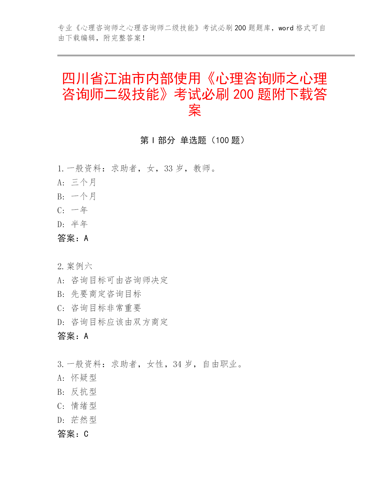 四川省江油市内部使用《心理咨询师之心理咨询师二级技能》考试必刷200题附下载答案