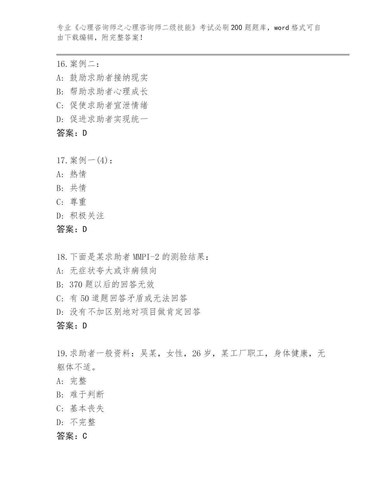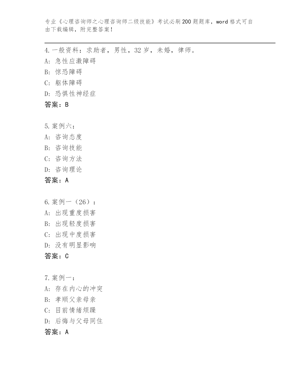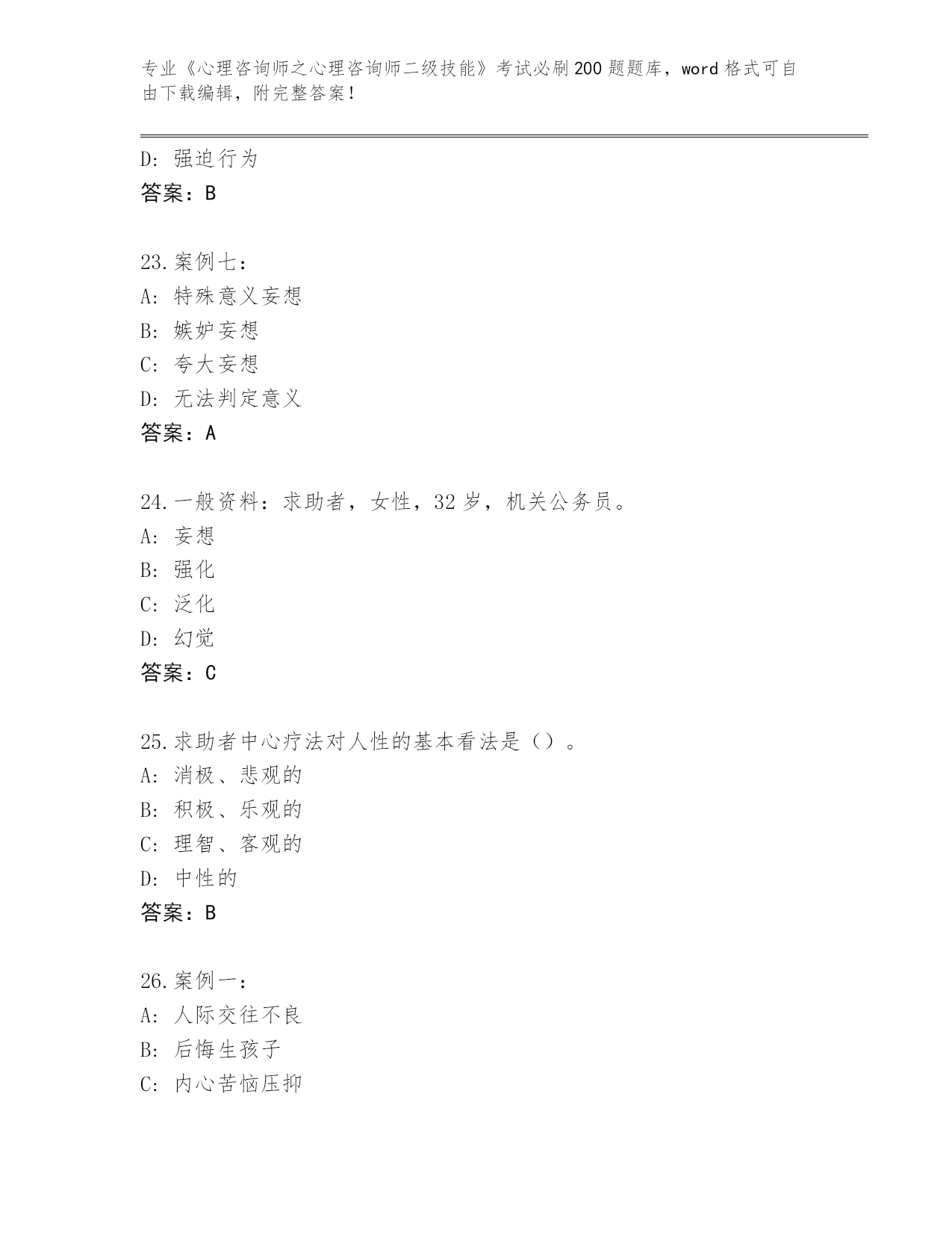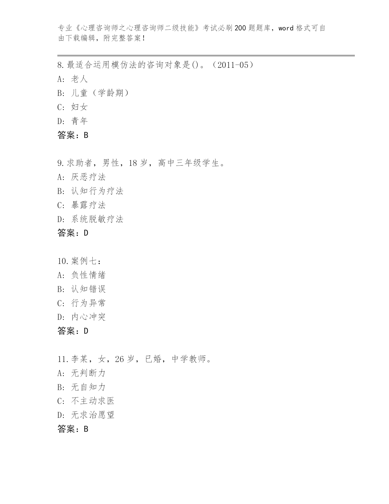 湖北省秭归县内部使用《心理咨询师之心理咨询师二级技能》考试必刷200题大全答案下载