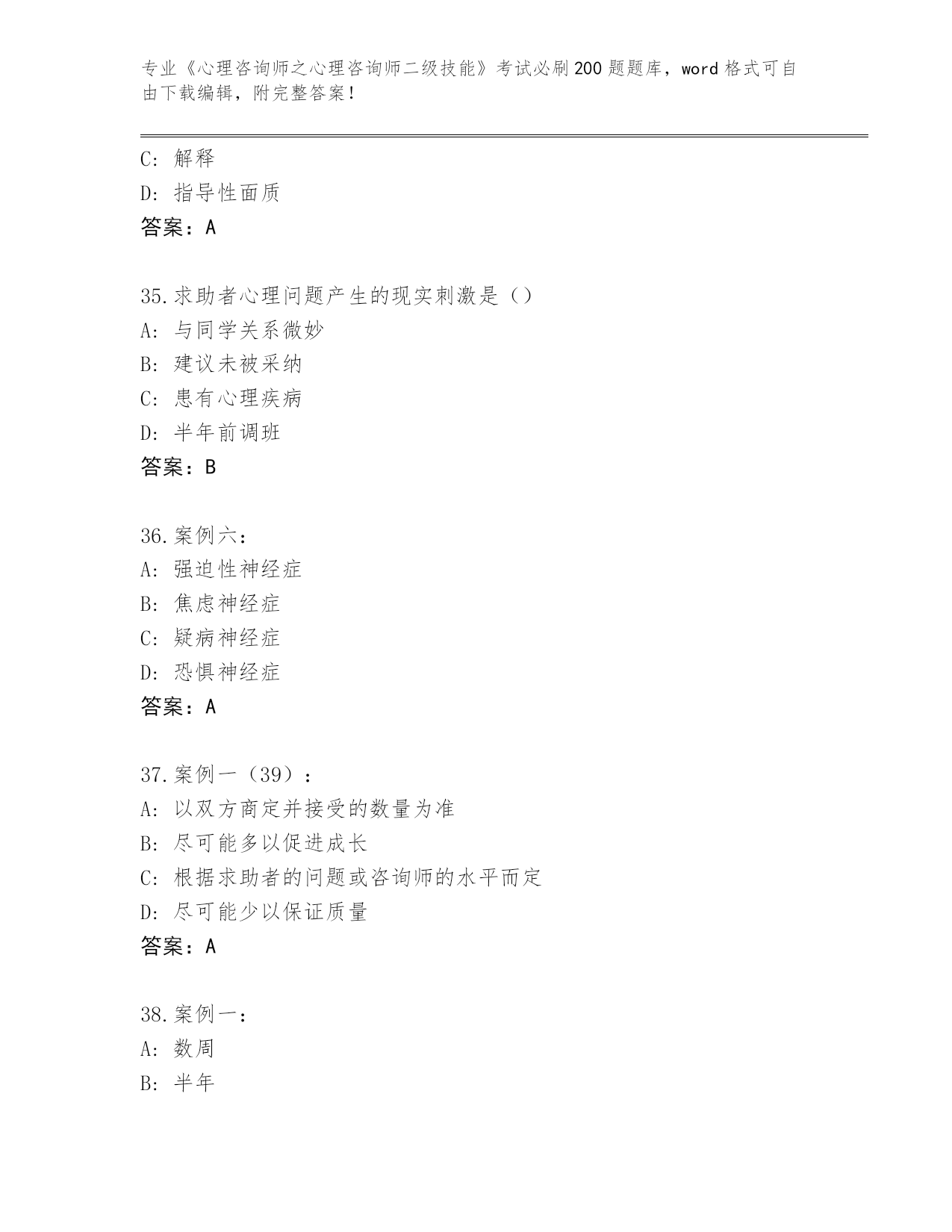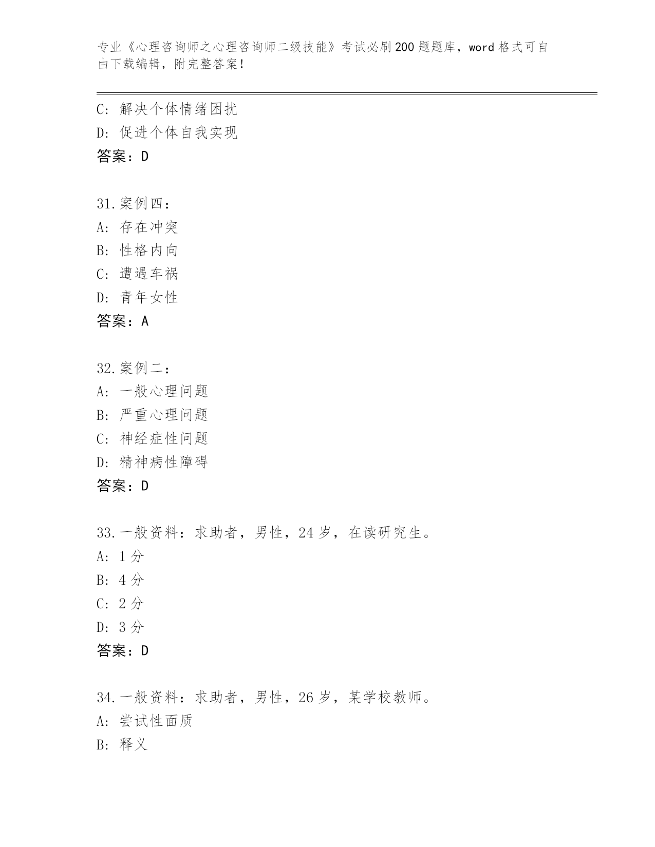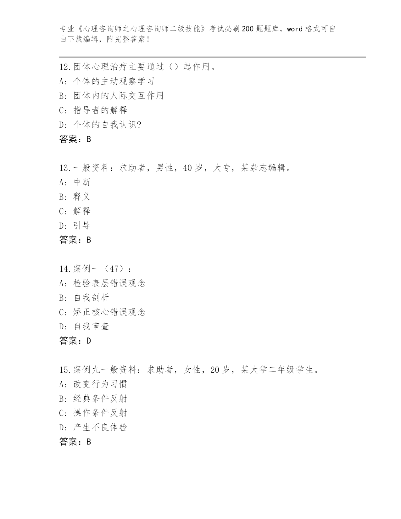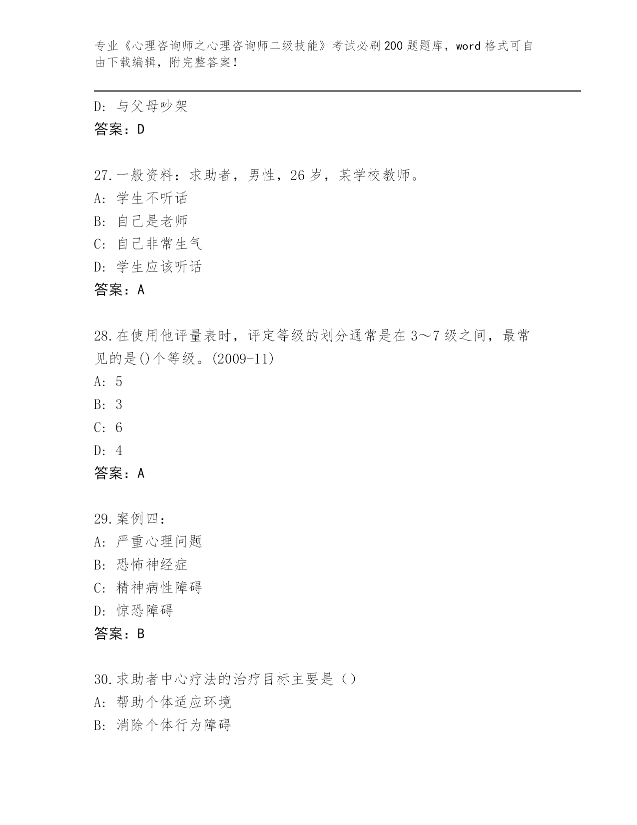 湖北省秭归县内部使用《心理咨询师之心理咨询师二级技能》考试必刷200题大全答案下载
