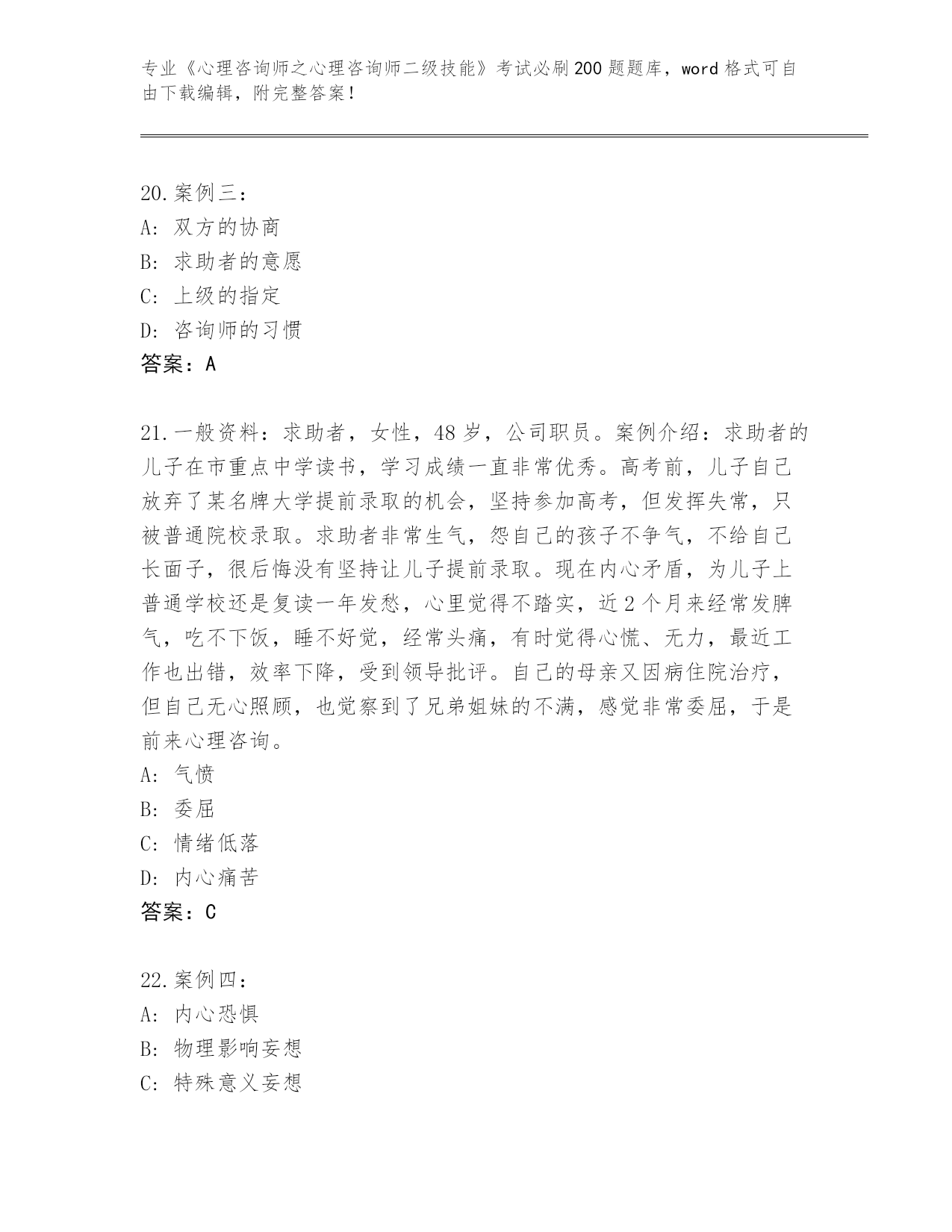 福建省台江区内部使用《心理咨询师之心理咨询师二级技能》考试必刷200题真题及答案下载