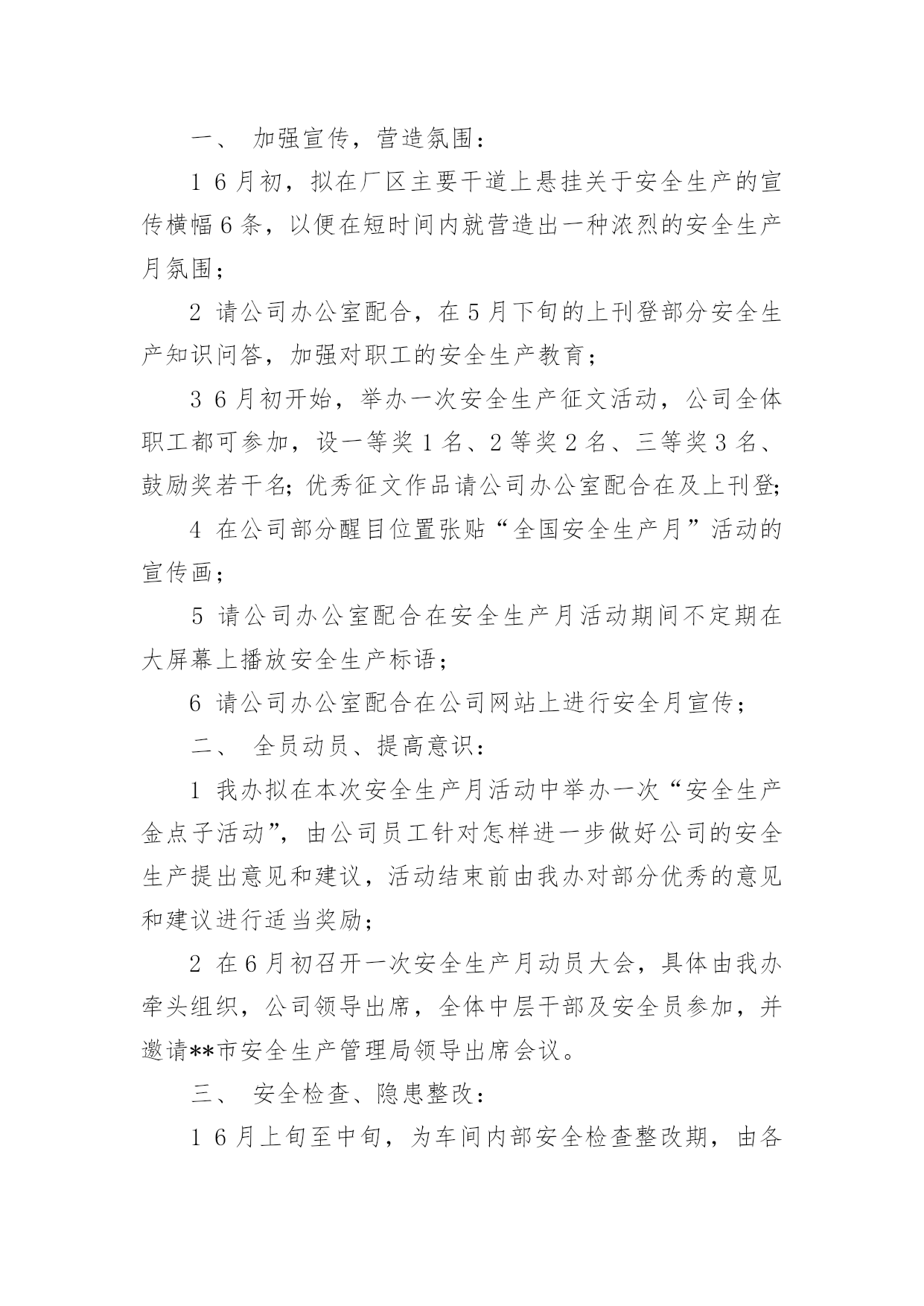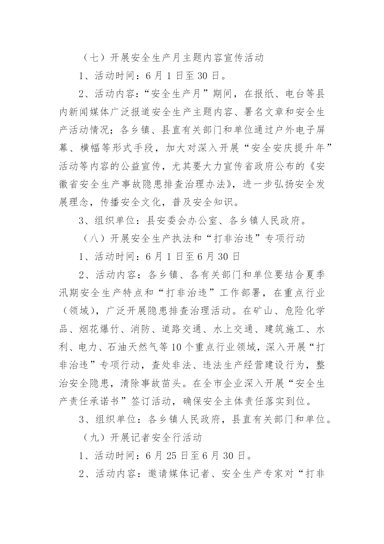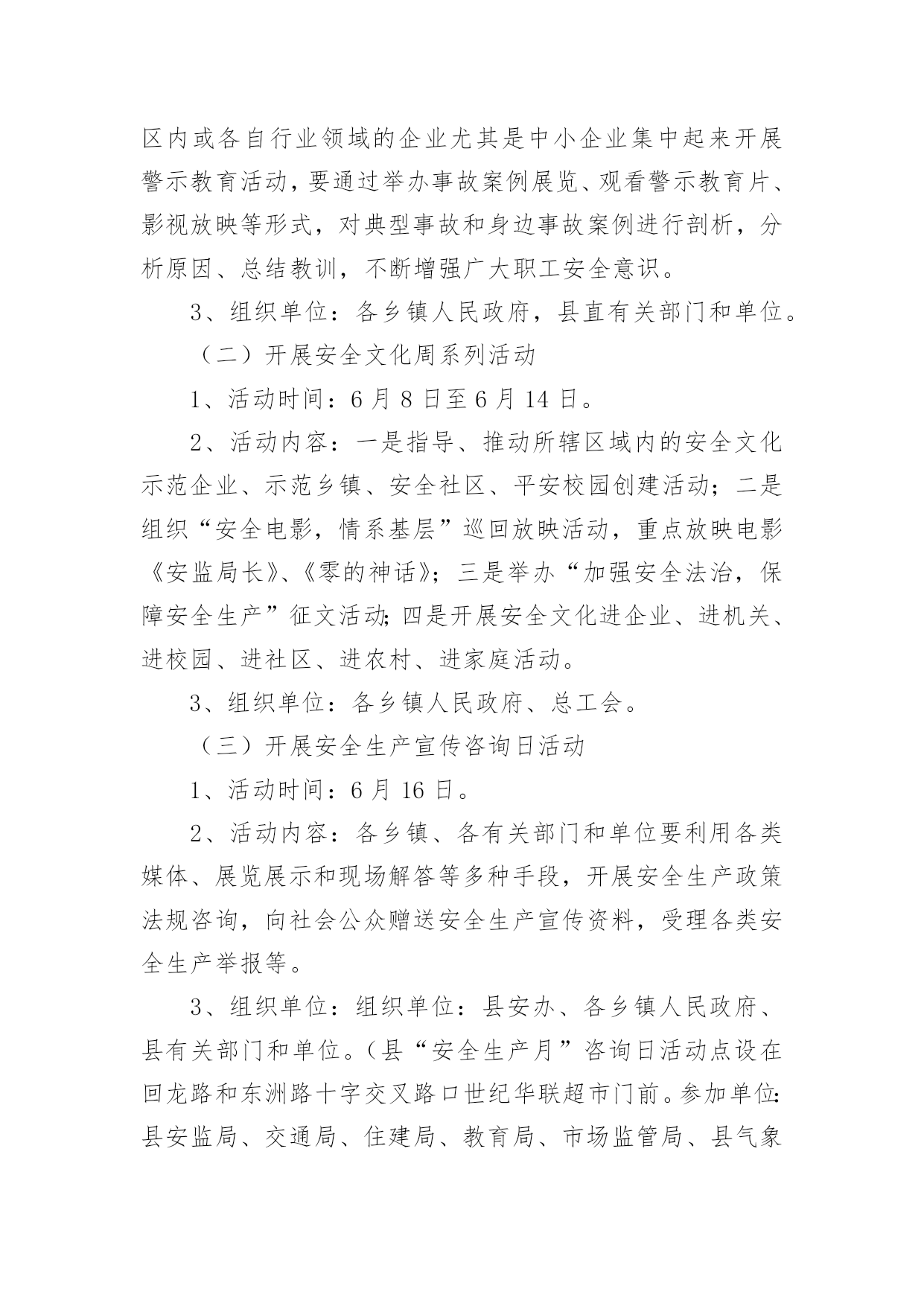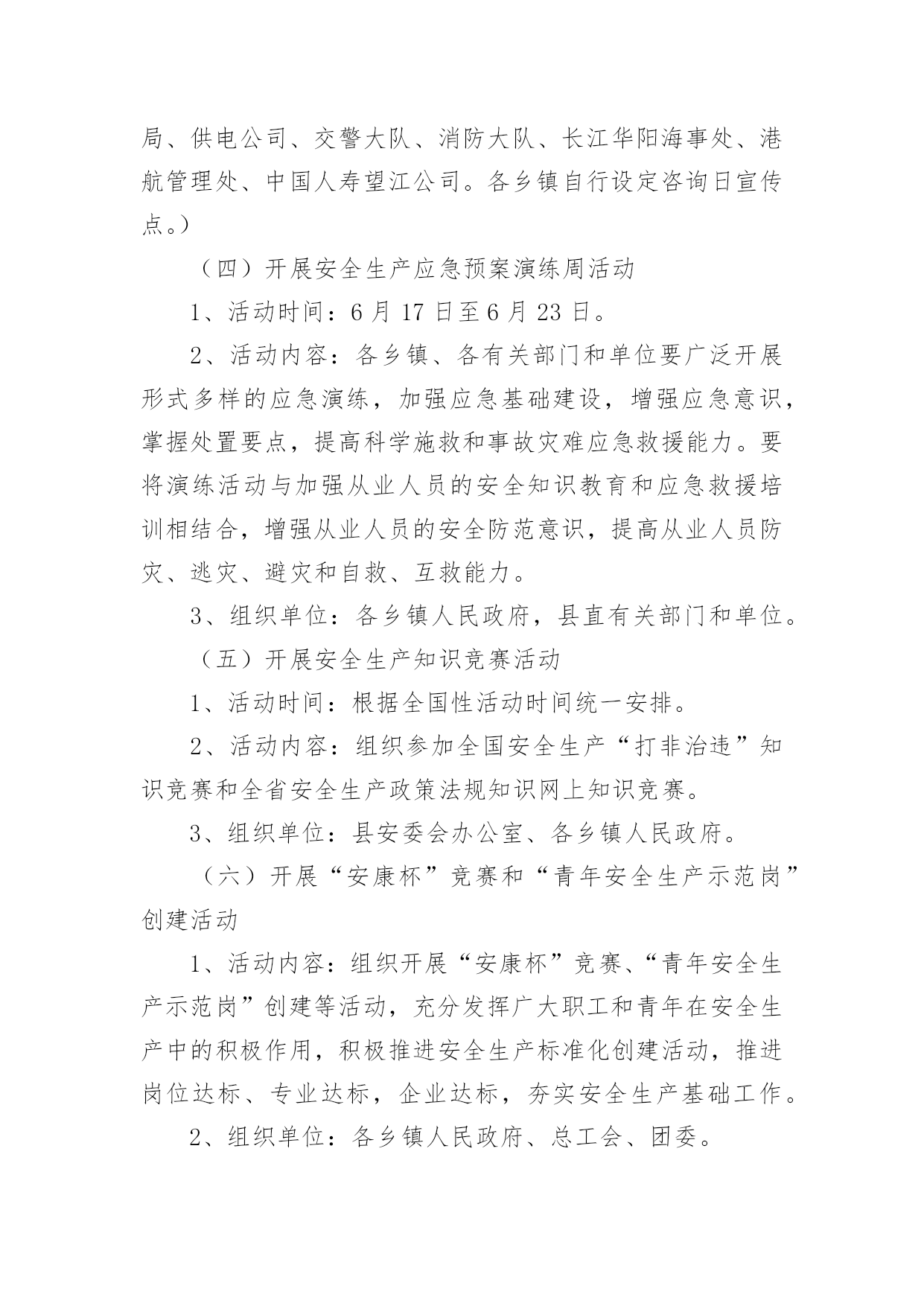 安全生产月活动方案安全生产月活动方案6篇为了确保事情或工作能无误进行,就常常需要事先准备方案,方案指的是为某一次行动所制定的计划类文书。那要怎么制定科学的方案呢?以下是小编为大家收集的安全生产月活动方案,供大家参考借鉴,希望可以帮助到有需要的朋友。安全生产月活动方案1一、指导思想以中央经济工作会议精神为指导,坚持“安全第一,预防为主,综合治理”的方针强化师生安全意识,营造全民关注安全,关爱生命的舆论氛围。建立教育系统安全长效管理机制,突出隐患治理这条主线,以及学校安全管理政策,普及学校安全法律法规和安全常识,努力创建安全、文明、健康、和谐的校园环境。二、活动主题安全责任、重在落实。三、活动时间5月30日-6月30日。5月30日至6月5日为安全教育生产事故警示教育周;6月6日至6月12日为安全生产宣传教育咨询周;6月12日为安全生产宣传教育咨询周;6月13日至6月19日为应急预案演练周;6月下旬为巩固提高周。四、组织机构成立学校“安全生产月”活动领导小组,负责我校“安全生产月”活动的工作。组长:副组长:组员:各班班主任五、具体内容第一阶段:制定方案和动员阶段。5月28日-29日第二阶段:5月30日-6月25日,具体实施阶段。主要内容:1、在学校召开师生大会,出一期有关安全教育的黑板报,创造浓厚的“安全月”活动氛围。2、在校黑板报专栏开辟“安全生产月”宣传教育专栏,宣传相关法律法规和安全月的'开展情况。3、召开班主任安全教育专题会议,以防火、防盗、防诈骗、防滋扰、放伤害等为主题内容的安全教育,指导各各班主任对本班全体学生开展安全常识普及教育。4、组织一次火场逃生应急演练,提高师生的.安全意识和责任观念。5、对全校进行一次专题安全大检查。第三阶段:6月26-6月30日,总结阶段。六、活动要求1、各班要认真落实本方案精神,加强领导,提高认识,周密部署,精心组织好本次“安全生产月”活动2、各班要以班情以“安全第一,预防为主,综合治理”为主题,通过多渠道、多形式开展对学生进行安全教育,切实提高全校师生的安全防范技能,增强全校师生的安全防范意识,确保我校校园安全稳定。3、活动结束后,各班级要结活动情况进行全面总结,及时总结安全工作的先进事迹和典型做法。安全生产月活动方案2一、总体要求深入贯彻落实党的十八届四中全会精神和省、市、县党委政府关于加强安全生产工作的决策部署,牢固树立以人为本、安全第一、预防为主的理念,以扎实开展“安全安庆提升年”活动为载体,坚持面向基层、面向企业、面向群众,创新形式,注重实效,通过开展广泛深入的`宣传教育活动,推动全社会牢固树立安全发展理念,全面落实安全生产责任,强化安全生产基础,提高安全保障能力,有效防范和坚决遏制各类事故的发生,全面促进全县安全生产形势持续稳定好转。二、活动主题加强安全法治,保障安全生产。三、活动时间6月1日至6月30日。四、活动安排(一)开展安全生产事故警示教育周活动1、活动时间:6月1日至6月7日。2、活动内容:各乡镇、各有关部门和单位组织动员辖区内或各自行业领域的企业尤其是中小企业集中起来开展警示教育活动,要通过举办事故案例展览、观看警示教育片、影视放映等形式,对典型事故和身边事故案例进行剖析,分析原因、总结教训,不断增强广大职工安全意识。3、组织单位:各乡镇人民政府,县直有关部门和单位。(二)开展安全文化周系列活动1、活动时间:6月8日至6月14日。2、活动内容:一是指导、推动所辖区域内的安全文化示范企业、示范乡镇、安全社区、平安校园创建活动;二是组织“安全电影,情系基层”巡回放映活动,重点放映电影《安监局长》、《零的神话》;三是举办“加强安全法治,保障安全生产”征文活动;四是开展安全文化进企业、进机关、进校园、进社区、进农村、进家庭活动。3、组织单位:各乡镇人民政府、总工会。(三)开展安全生产宣传咨询日活动1、活动时间:6月16日。2、活动内容:各乡镇、各有关部门和单位要利用各类媒体、展览展示和现场解答等多种手段,开展安全生产政策法规咨询,向社会公众赠送安全生产宣传资料,受理各类安全生产举报等。3、组织单位:组织单位:县安办、各乡镇人民政府、县有关部门和单位。(县“安全生产月”咨询日活动点设在回龙路和东洲路十字交叉路口世纪华联超市门前。参加单位:县安监局、交通局、住建局、教育局、市场监管局、县气象局、供电公司、交警大队、消防大队、长江华阳海事处、港航管理处、中国人寿望江公司。各乡镇自行设定咨询日宣传点。)(四)开展安全生产应急预案演练周活动1、活动时间:6月17日至6月23日。2、活动内容:各乡镇、各有关部门和单位要广泛开展形式多样的应急演练,加强应急基础建设,增强应急意识,掌握处置要点,提高科学施救和事故灾难应急救援能力。要将演练活动与加强从业人员的安全知识教育和应急救援培训相结