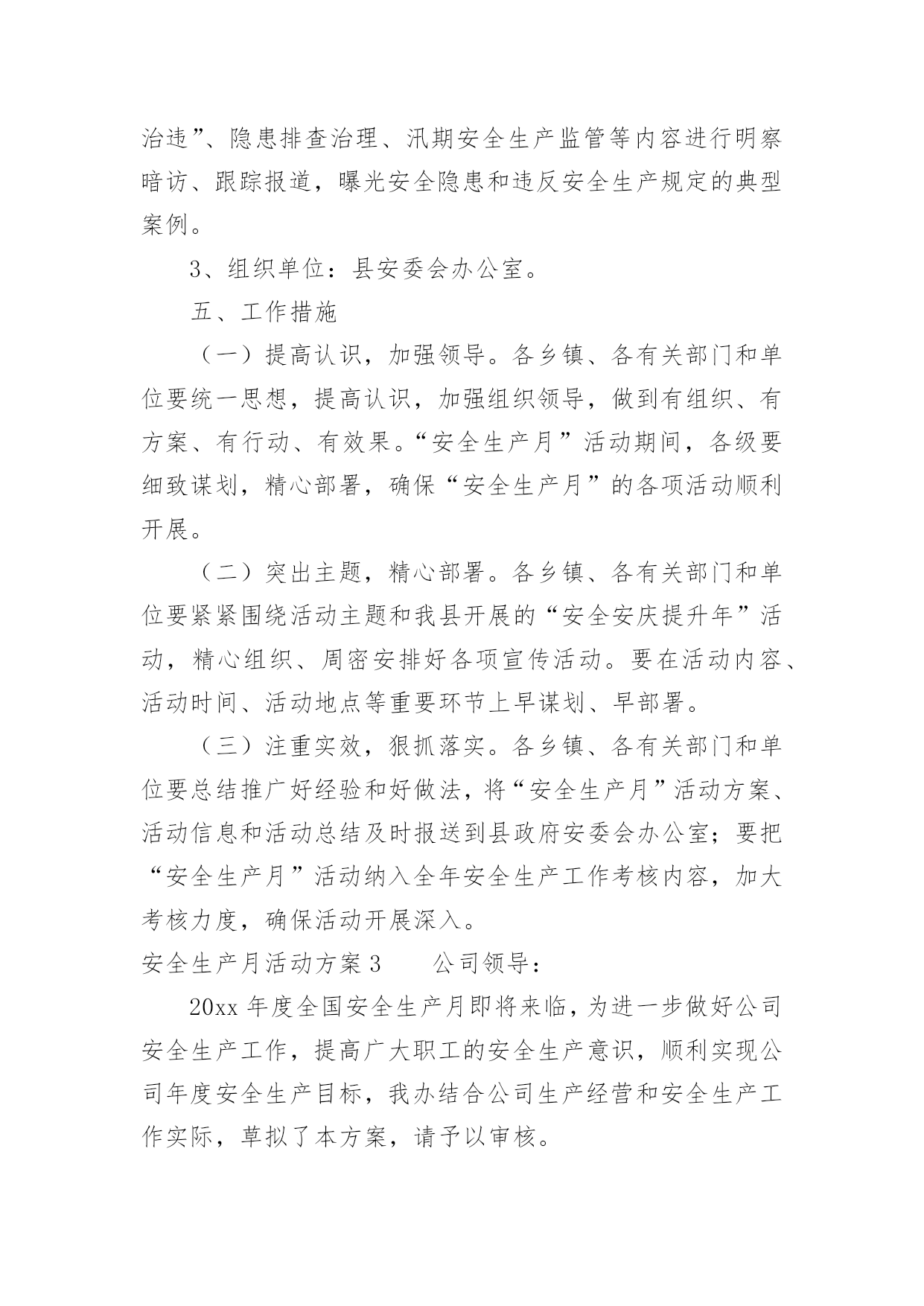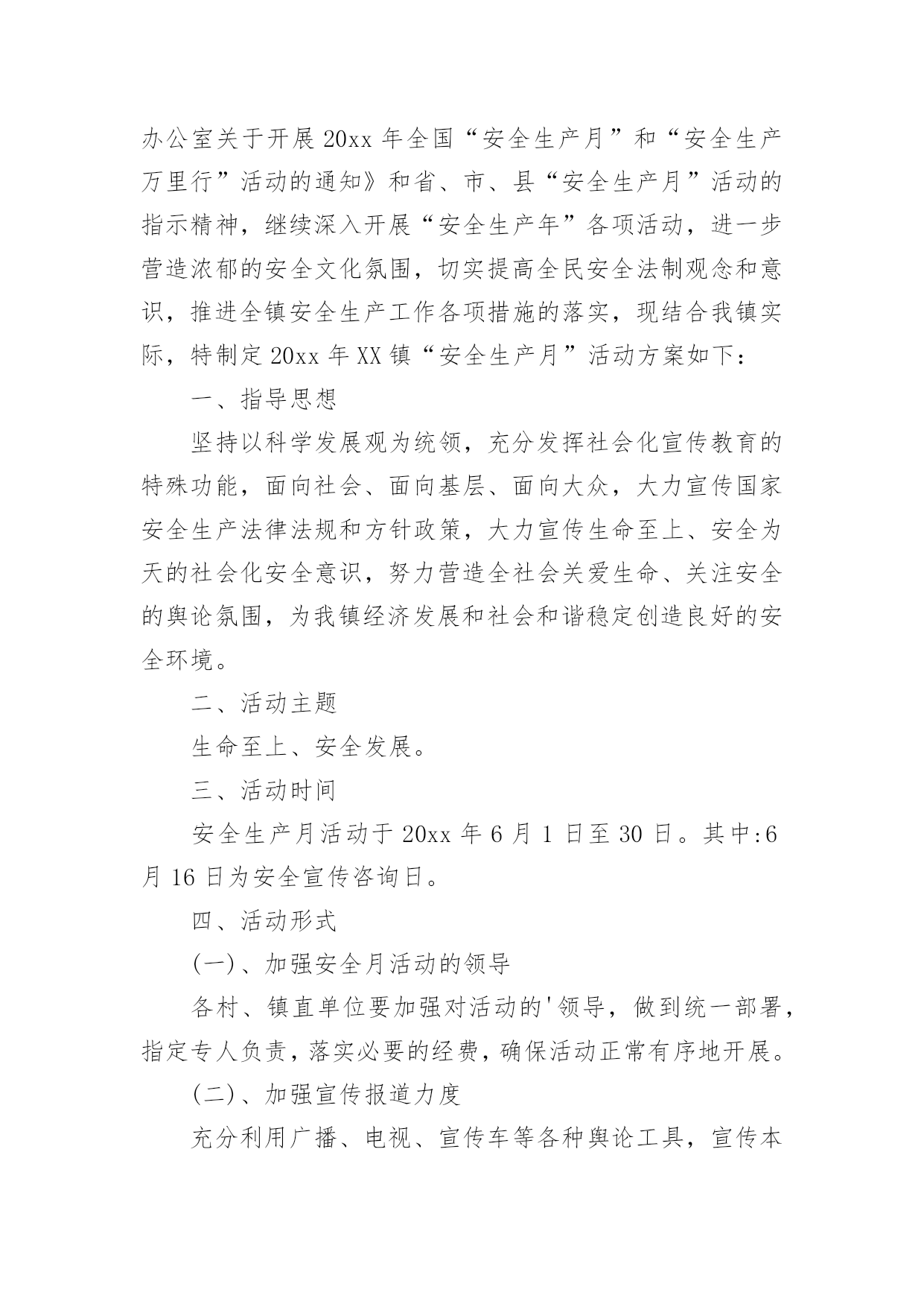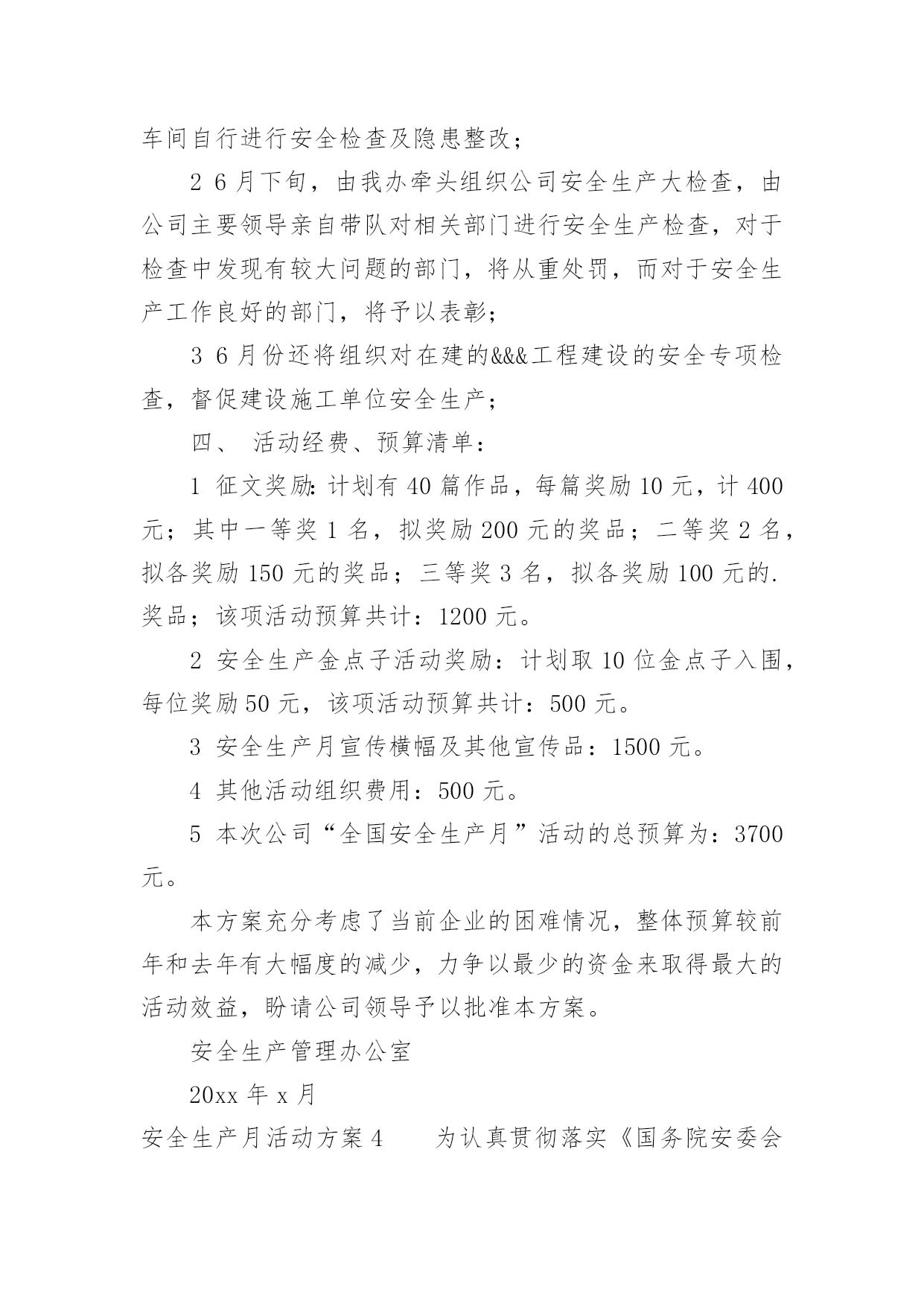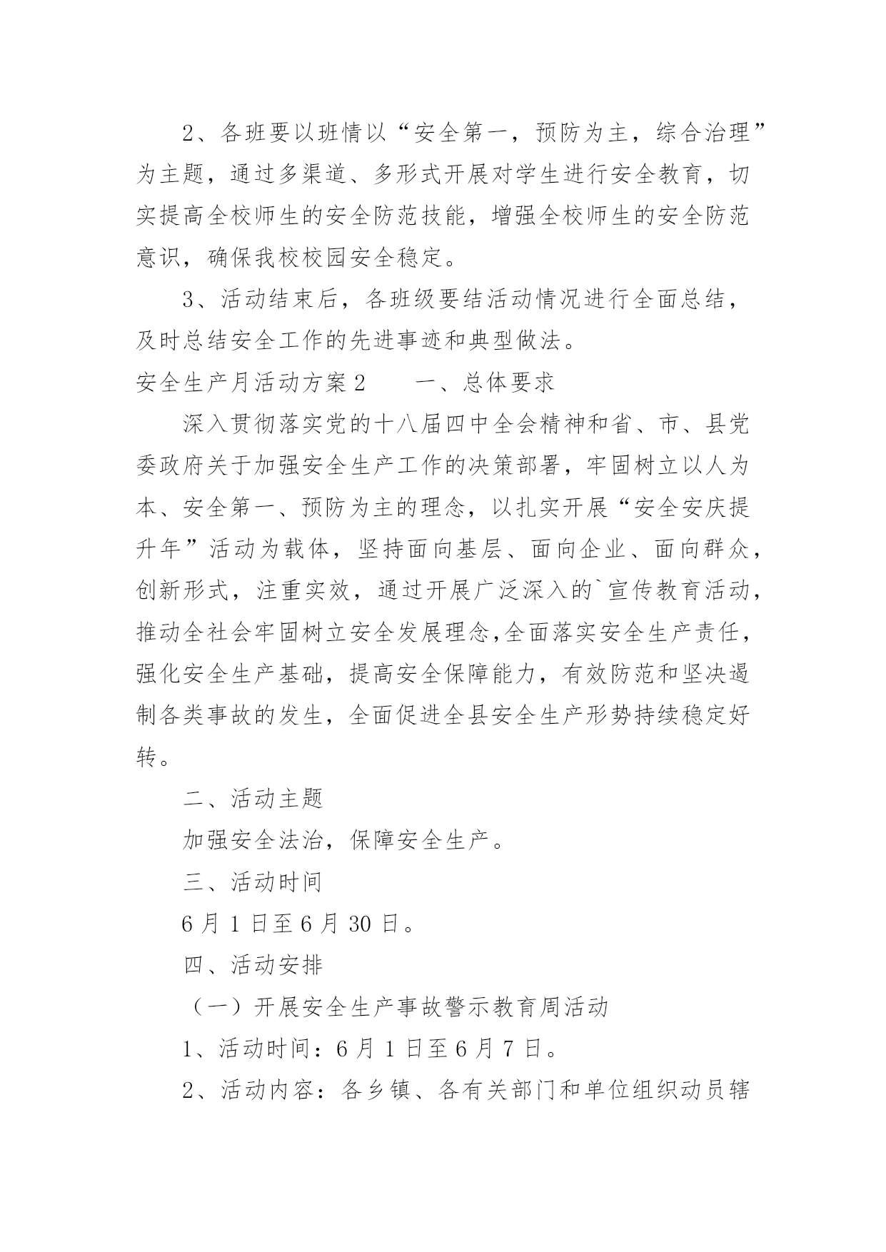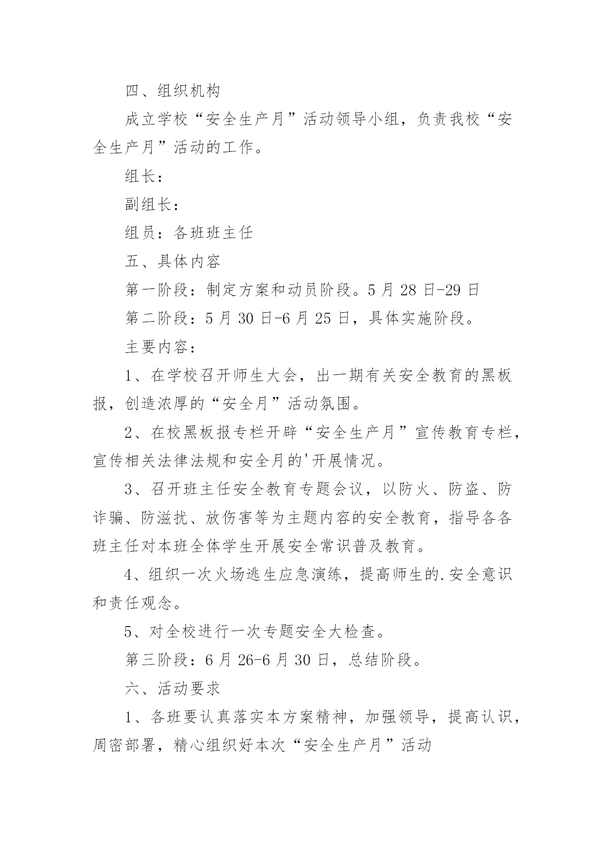 安全生产月活动方案安全生产月活动方案6篇为了确保事情或工作能无误进行,就常常需要事先准备方案,方案指的是为某一次行动所制定的计划类文书。那要怎么制定科学的方案呢?以下是小编为大家收集的安全生产月活动方案,供大家参考借鉴,希望可以帮助到有需要的朋友。安全生产月活动方案1一、指导思想以中央经济工作会议精神为指导,坚持“安全第一,预防为主,综合治理”的方针强化师生安全意识,营造全民关注安全,关爱生命的舆论氛围。建立教育系统安全长效管理机制,突出隐患治理这条主线,以及学校安全管理政策,普及学校安全法律法规和安全常识,努力创建安全、文明、健康、和谐的校园环境。二、活动主题安全责任、重在落实。三、活动时间5月30日-6月30日。5月30日至6月5日为安全教育生产事故警示教育周;6月6日至6月12日为安全生产宣传教育咨询周;6月12日为安全生产宣传教育咨询周;6月13日至6月19日为应急预案演练周;6月下旬为巩固提高周。四、组织机构成立学校“安全生产月”活动领导小组,负责我校“安全生产月”活动的工作。组长:副组长:组员:各班班主任五、具体内容第一阶段:制定方案和动员阶段。5月28日-29日第二阶段:5月30日-6月25日,具体实施阶段。主要内容:1、在学校召开师生大会,出一期有关安全教育的黑板报,创造浓厚的“安全月”活动氛围。2、在校黑板报专栏开辟“安全生产月”宣传教育专栏,宣传相关法律法规和安全月的'开展情况。3、召开班主任安全教育专题会议,以防火、防盗、防诈骗、防滋扰、放伤害等为主题内容的安全教育,指导各各班主任对本班全体学生开展安全常识普及教育。4、组织一次火场逃生应急演练,提高师生的.安全意识和责任观念。5、对全校进行一次专题安全大检查。第三阶段:6月26-6月30日,总结阶段。六、活动要求1、各班要认真落实本方案精神,加强领导,提高认识,周密部署,精心组织好本次“安全生产月”活动2、各班要以班情以“安全第一,预防为主,综合治理”为主题,通过多渠道、多形式开展对学生进行安全教育,切实提高全校师生的安全防范技能,增强全校师生的安全防范意识,确保我校校园安全稳定。3、活动结束后,各班级要结活动情况进行全面总结,及时总结安全工作的先进事迹和典型做法。安全生产月活动方案2一、总体要求深入贯彻落实党的十八届四中全会精神和省、市、县党委政府关于加强安全生产工作的决策部署,牢固树立以人为本、安全第一、预防为主的理念,以扎实开展“安全安庆提升年”活动为载体,坚持面向基层、面向企业、面向群众,创新形式,注重实效,通过开展广泛深入的`宣传教育活动,推动全社会牢固树立安全发展理念,全面落实安全生产责任,强化安全生产基础,提高安全保障能力,有效防范和坚决遏制各类事故的发生,全面促进全县安全生产形势持续稳定好转。二、活动主题加强安全法治,保障安全生产。三、活动时间6月1日至6月30日。四、活动安排(一)开展安全生产事故警示教育周活动1、活动时间:6月1日至6月7日。2、活动内容:各乡镇、各有关部门和单位组织动员辖区内或各自行业领域的企业尤其是中小企业集中起来开展警示教育活动,要通过举办事故案例展览、观看警示教育片、影视放映等形式,对典型事故和身边事故案例进行剖析,分析原因、总结教训,不断增强广大职工安全意识。3、组织单位:各乡镇人民政府,县直有关部门和单位。(二)开展安全文化周系列活动1、活动时间:6月8日至6月14日。2、活动内容:一是指导、推动所辖区域内的安全文化示范企业、示范乡镇、安全社区、平安校园创建活动;二是组织“安全电影,情系基层”巡回放映活动,重点放映电影《安监局长》、《零的神话》;三是举办“加强安全法治,保障安全生产”征文活动;四是开展安全文化进企业、进机关、进校园、进社区、进农村、进家庭活动。3、组织单位:各乡镇人民政府、总工会。(三)开展安全生产宣传咨询日活动1、活动时间:6月16日。2、活动内容:各乡镇、各有关部门和单位要利用各类媒体、展览展示和现场解答等多种手段,开展安全生产政策法规咨询,向社会公众赠送安全生产宣传资料,受理各类安全生产举报等。3、组织单位:组织单位:县安办、各乡镇人民政府、县有关部门和单位。(县“安全生产月”咨询日活动点设在回龙路和东洲路十字交叉路口世纪华联超市门前。参加单位:县安监局、交通局、住建局、教育局、市场监管局、县气象局、供电公司、交警大队、消防大队、长江华阳海事处、港航管理处、中国人寿望江公司。各乡镇自行设定咨询日宣传点。)(四)开展安全生产应急预案演练周活动1、活动时间:6月17日至6月23日。2、活动内容:各乡镇、各有关部门和单位要广泛开展形式多样的应急演练,加强应急基础建设,增强应急意识,掌握处置要点,提高科学施救和事故灾难应急救援能力。要将演练活动与加强从业人员的安全知识教育和应急救援培训相结