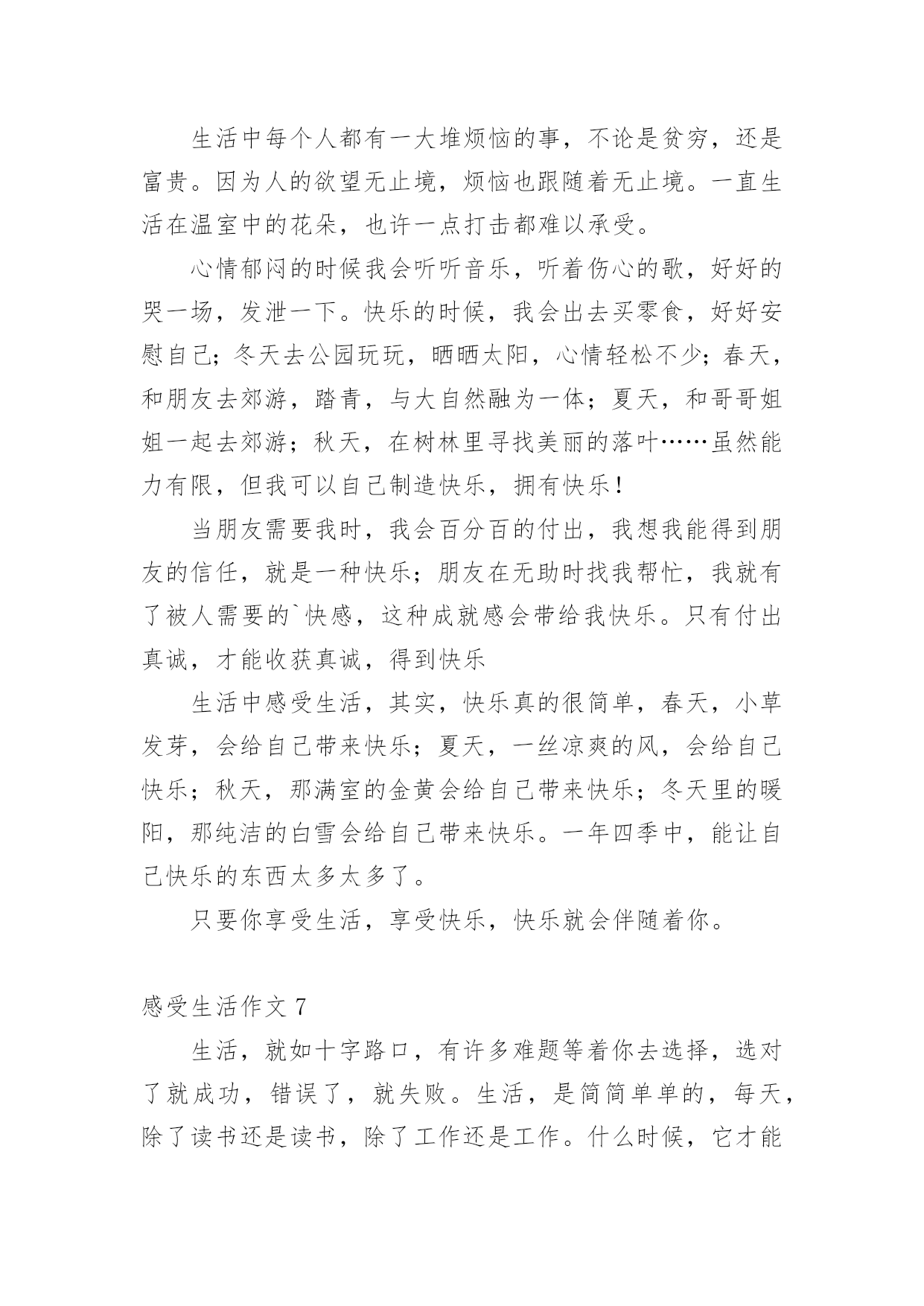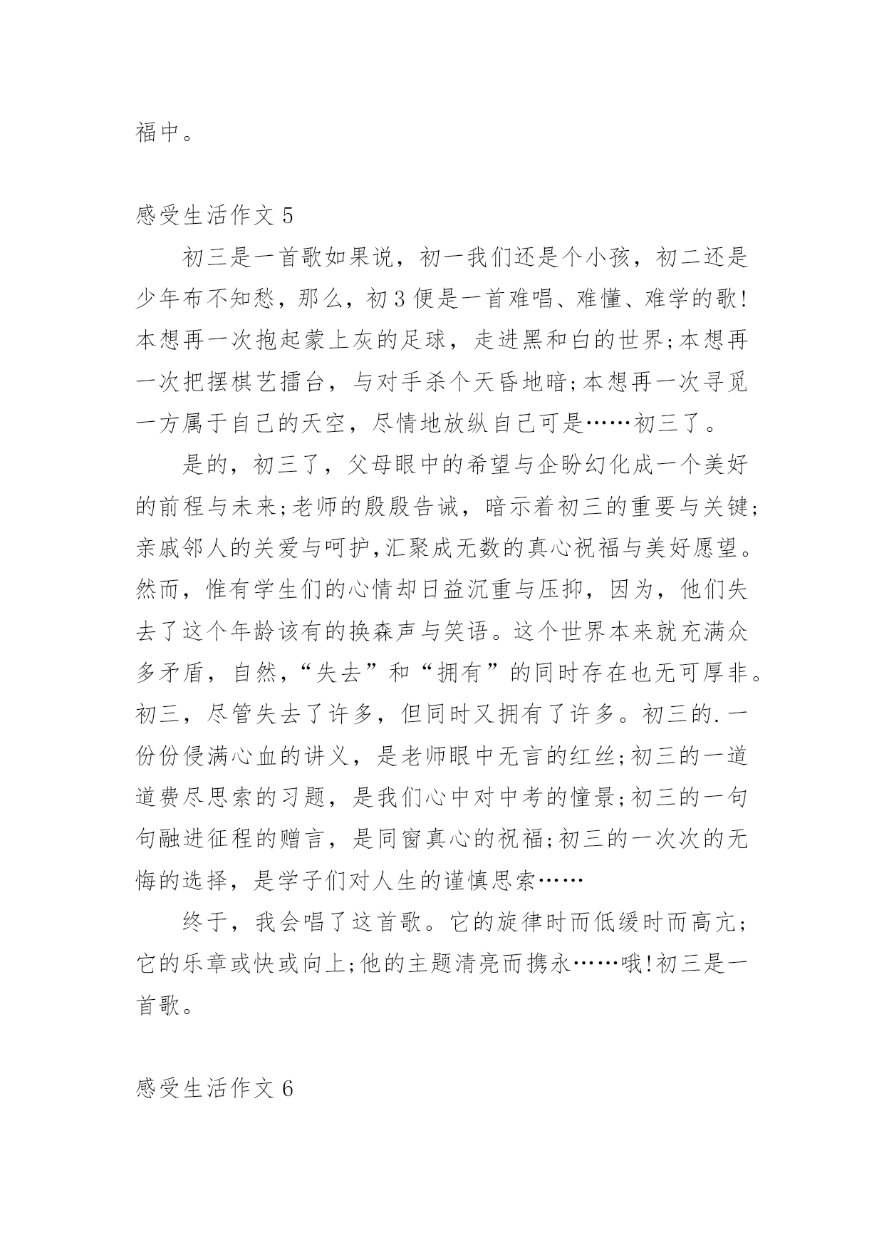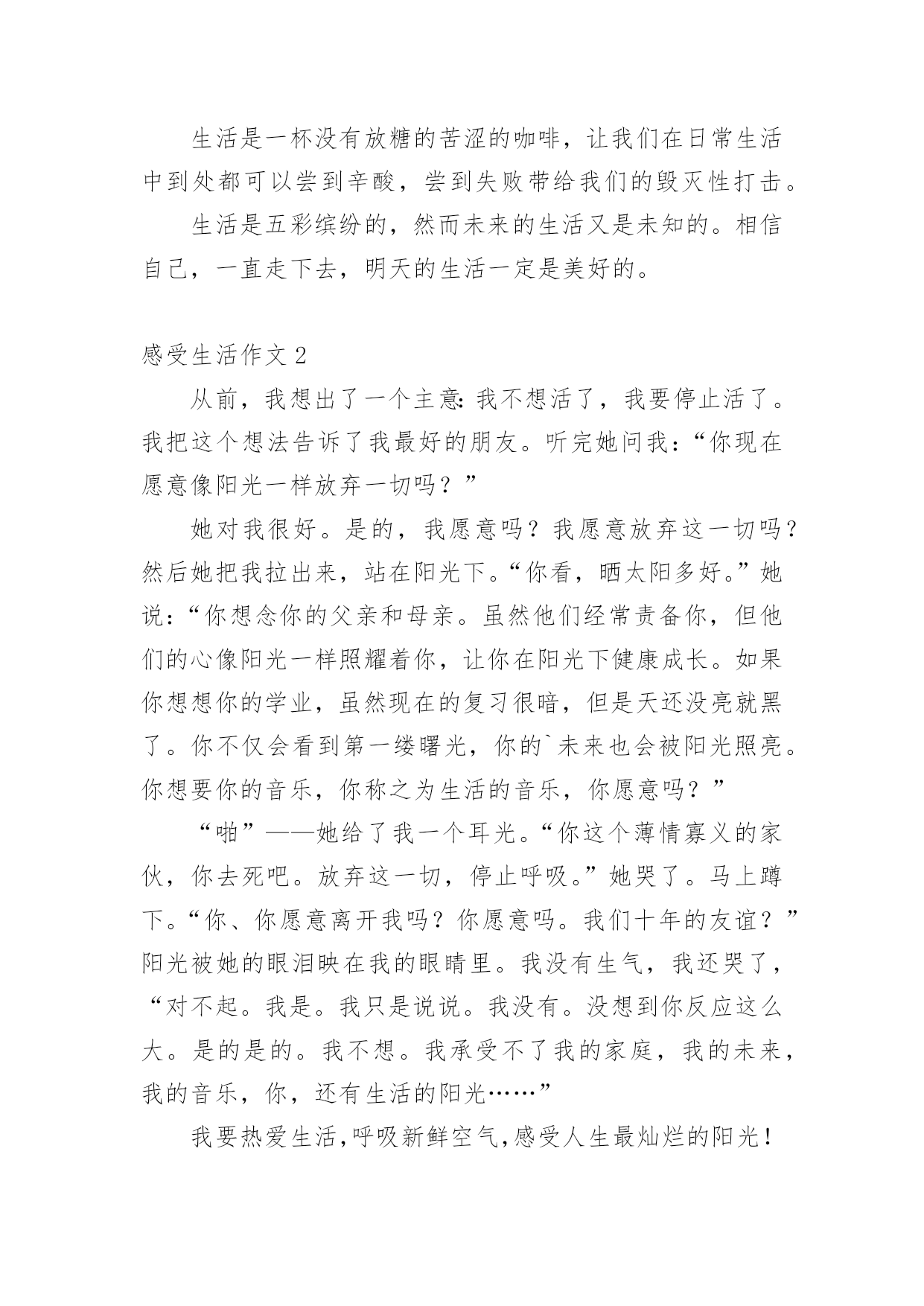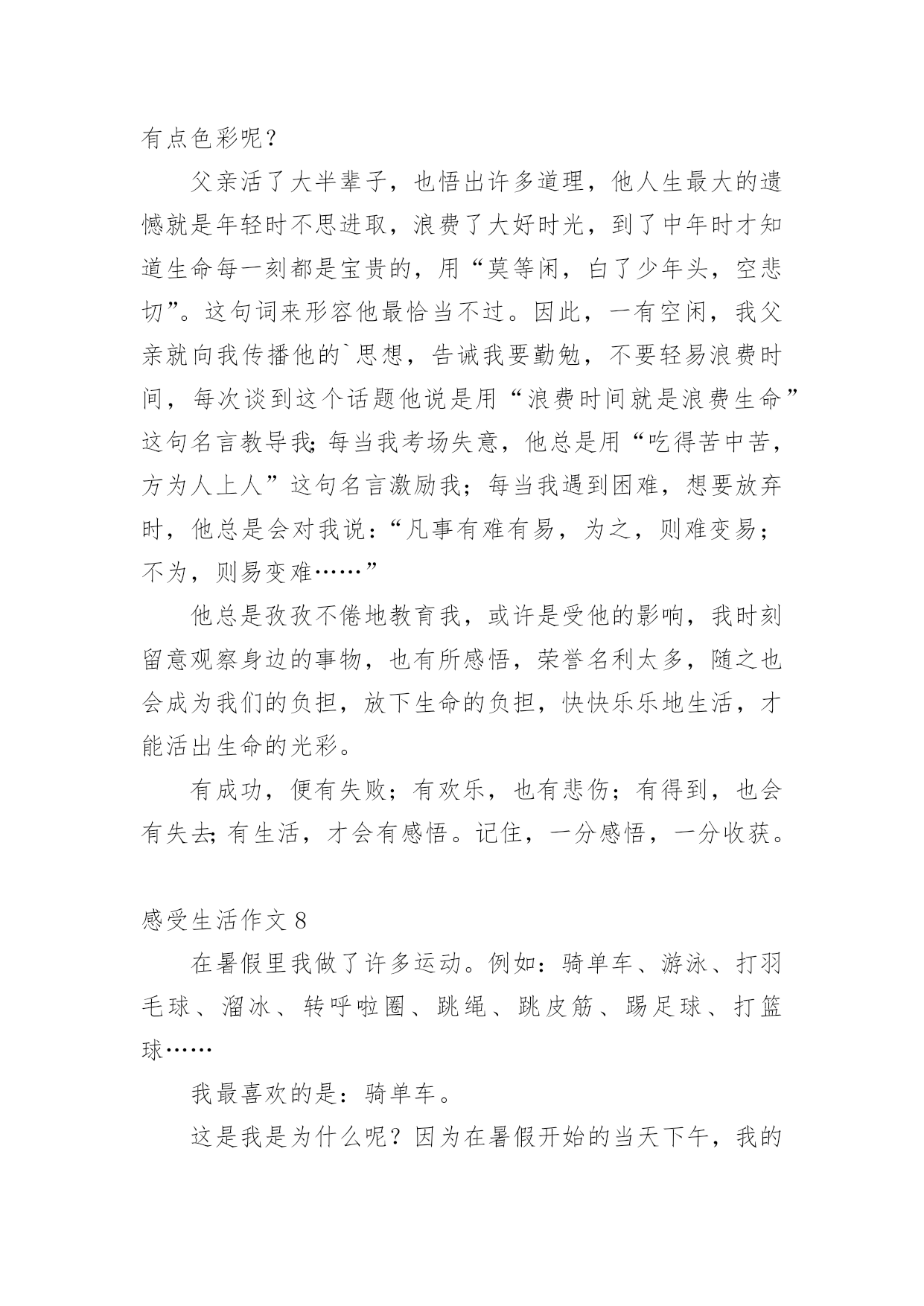 感受生活作文【热】感受生活作文在日复一日的学习、工作或生活中,大家都经常看到作文的身影吧,作文是从内部言语向外部言语的过渡,即从经过压缩的简要的、自己能明白的语言,向开展的、具有规范语法结构的、能为他人所理解的外部语言形式的转化。那么一般作文是怎么写的呢?以下是小编收集整理的感受生活作文,希望对大家有所帮助。感受生活作文1在人们的眼里,生活是五彩缤纷的,我们可以观赏到优美的景色,侧耳聆听悠扬的乐曲,尽情地享受浓浓的亲情,拥有更多的知心朋友,品尝友谊带给我们的欢乐……生活正是因为有了味道各异的调味品,才变得有滋有味。我,一个普普通通的初中生,虽没有令人惊心动魄的`经历,也没有令人赞叹的丰功伟绩,但我拥有我的生活感受。生活,其实很简单。我的生活就是这样,每天只要起床,吃饭,上学,上课,下课,放学,回家,写作业,吃饭,睡觉。就这样,一天就过去了。不过,有时还会有一些小惊喜,小事件发生,只不过很少罢了。所以,我每天就要自己找乐趣。比如:每天下课时,可以和同学们在一起疯疯闹闹,一起谈天说地,放假时可以玩玩电脑,出去逛逛街。这时,你会发现,生活中还是有乐趣存在的。生活是一杯没有放糖的苦涩的咖啡,让我们在日常生活中到处都可以尝到辛酸,尝到失败带给我们的毁灭性打击。生活是五彩缤纷的,然而未来的生活又是未知的。相信自己,一直走下去,明天的生活一定是美好的。感受生活作文2从前,我想出了一个主意:我不想活了,我要停止活了。我把这个想法告诉了我最好的朋友。听完她问我:“你现在愿意像阳光一样放弃一切吗?”她对我很好。是的,我愿意吗?我愿意放弃这一切吗?然后她把我拉出来,站在阳光下。“你看,晒太阳多好。”她说:“你想念你的父亲和母亲。虽然他们经常责备你,但他们的心像阳光一样照耀着你,让你在阳光下健康成长。如果你想想你的学业,虽然现在的复习很暗,但是天还没亮就黑了。你不仅会看到第一缕曙光,你的`未来也会被阳光照亮。你想要你的音乐,你称之为生活的音乐,你愿意吗?”“啪”——她给了我一个耳光。“你这个薄情寡义的家伙,你去死吧。放弃这一切,停止呼吸。”她哭了。马上蹲下。“你、你愿意离开我吗?你愿意吗。我们十年的友谊?”阳光被她的眼泪映在我的眼睛里。我没有生气,我还哭了,“对不起。我是。我只是说说。我没有。没想到你反应这么大。是的是的。我不想。我承受不了我的家庭,我的未来,我的音乐,你,还有生活的阳光……”我要热爱生活,呼吸新鲜空气,感受人生最灿烂的阳光!这是我答应她的。晴空万里,太阳辐射大地,射向窗外,照在我全身。这让我感到幸福、温暖、阳光。我感觉我爱这一切,爱这个世界,爱阳光,爱生活的阳光!感受生活作文3有的人,一生苦苦追求,得到金钱和名利,所以觉得幸福。有的人,一生艰苦奋斗,只求超越他人,以自己的智慧为自己创造财富而感到幸福。而作为一名小学生,我的幸福是······俗话说,身体是革命的本钱。当听到有人因疾病而痛苦呻吟的时候,当看见有人因残疾而生活不能自理的时候,我感到自己很幸运。至少,我是健康的。健康的身体,对于我来说,我觉得我是幸福的.古人云:“书中自有黄金屋,书中自有颜如玉。”在书海中遨游,吸取知识的精华,既开阔了视野,又丰富了头脑。看着书架上那一册册,一排排散发着清香的书,真的让我感到很幸福。生活中,我是一个爱笑的女孩。我总是喜欢微笑着面对一切挫折和困难,因为微笑可以证明我的信心跟勇气。我总是喜欢微笑着去面对父母和亲朋,因为微笑会传递我的爱和祝福。所以因为微笑而让我觉得幸福.今天,我能做在宽敞明亮的教室里安心的读书,而那些贫困地区的孩子,那些因地震失去父母,失去家园的孩子,读书对他们来说,却是可望而不可及的,有着优越的.学习条件,所以我是幸福的。如此看来,小小的我竟拥有这么多的幸福。年少的我有充裕的时间,充沛的精力,我会带着这些小小的幸福去学习,去奋斗,去创造,去迎接更美好的未来!感受生活作文4我的家庭不是很富裕,但我从生活中感到了幸福。与富人家的孩子相比,我无拘无束;与穷人家的孩子相比,我衣丰食足。我是一个平凡而又懂事的孩子,有爸妈的疼爱,老师的呵护,同学的关照,我就是生活在这样幸福的环境里。记得小时候过生日,爸爸妈妈总会待定一个巧克力奶油蛋糕,还有爸爸妈妈精心给我准备的.生日礼物,我和爸爸妈妈一起吃着蛋糕,在温暖舒适的灯光下,我感到特别的幸福。小时候当我大哭时,爸爸总会变得温柔起来,想尽一切办法逗我笑,爸爸则把我抱起来,轻轻抚摸着我的后背,每当我哭时,我都会红着眼听爸爸讲:“庙里有个大和尚和一个小和尚。”每次听这个故事我都会哈哈大笑。在学校,那一天早上因为刚跑完步,太热所以没有吃早饭,但是不吃早饭肚子疼,班主任看了连忙去办公室拿了一个鸡蛋和火腿肠让我吃,我不好意思地接下了这些“幸福的早餐”。我很感动,很幸福。在温暖的家里,在幸福的学校里学习,我