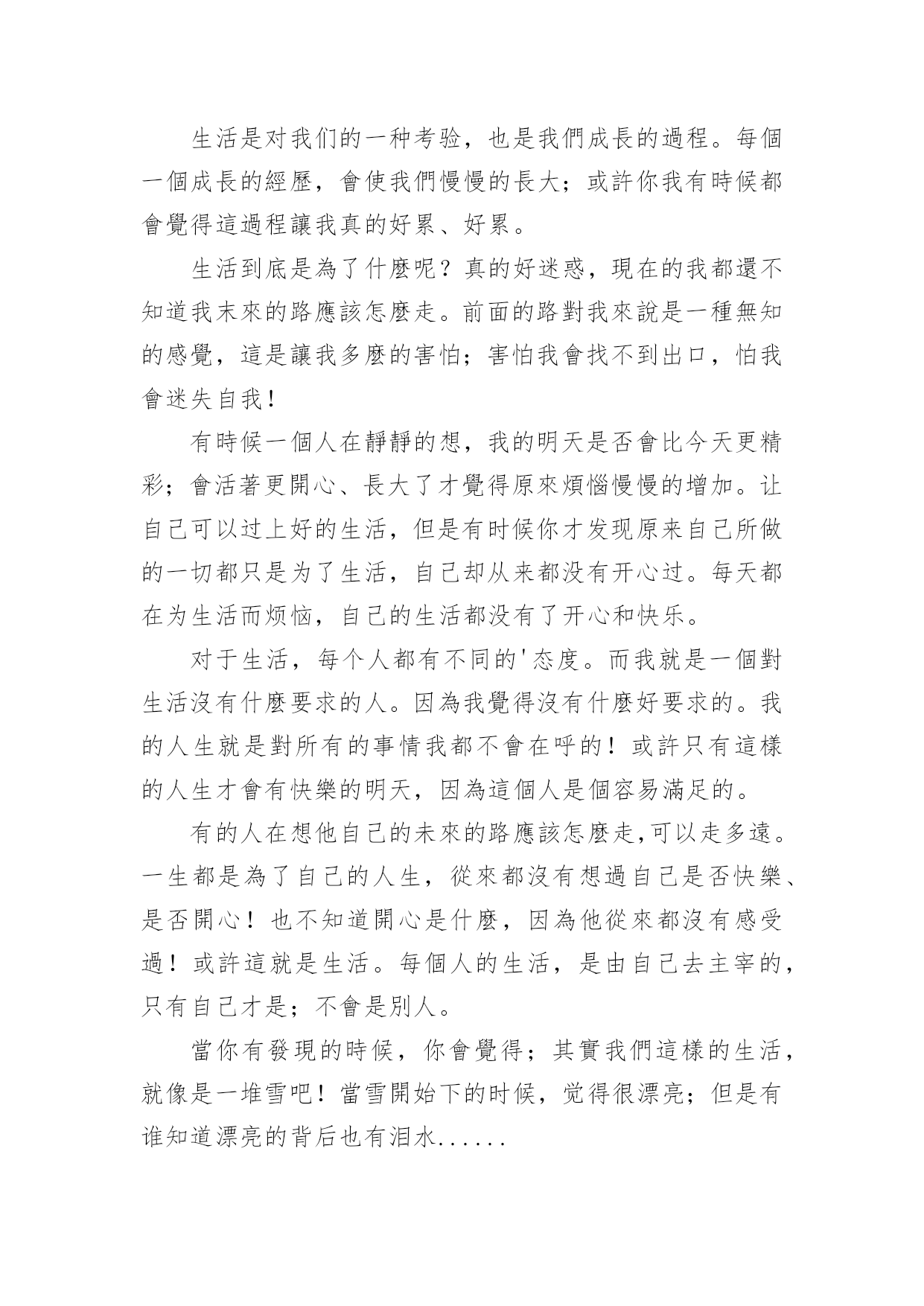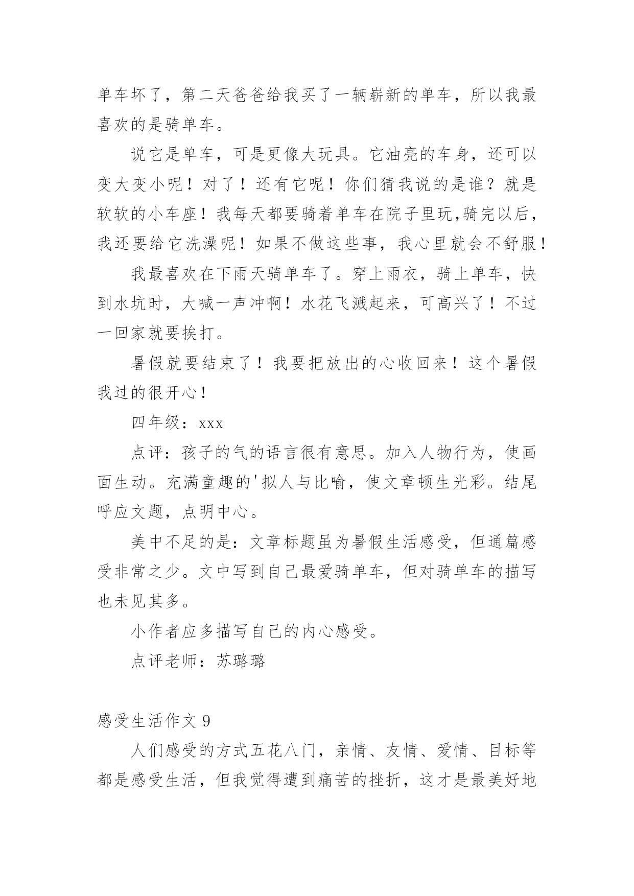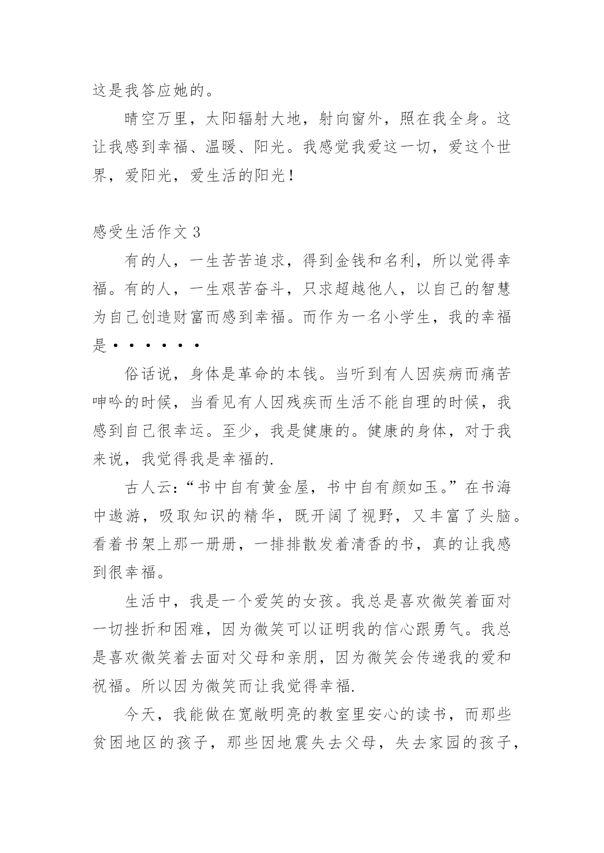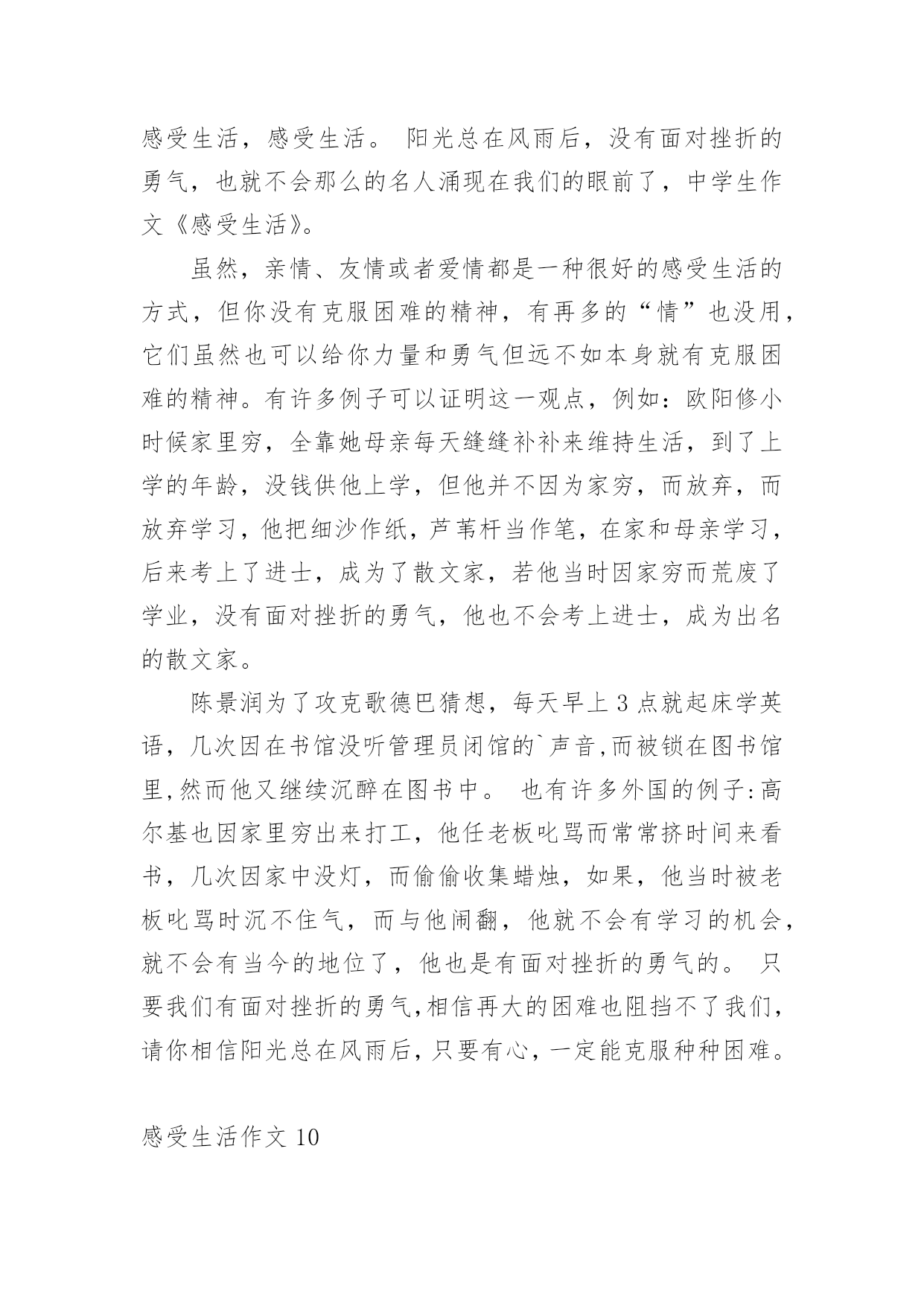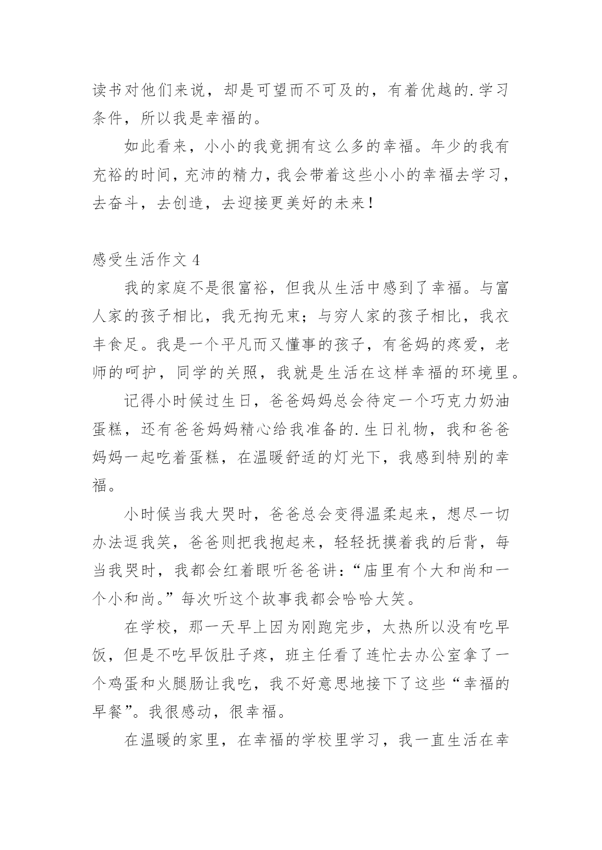 感受生活作文【热】感受生活作文在日复一日的学习、工作或生活中,大家都经常看到作文的身影吧,作文是从内部言语向外部言语的过渡,即从经过压缩的简要的、自己能明白的语言,向开展的、具有规范语法结构的、能为他人所理解的外部语言形式的转化。那么一般作文是怎么写的呢?以下是小编收集整理的感受生活作文,希望对大家有所帮助。感受生活作文1在人们的眼里,生活是五彩缤纷的,我们可以观赏到优美的景色,侧耳聆听悠扬的乐曲,尽情地享受浓浓的亲情,拥有更多的知心朋友,品尝友谊带给我们的欢乐……生活正是因为有了味道各异的调味品,才变得有滋有味。我,一个普普通通的初中生,虽没有令人惊心动魄的`经历,也没有令人赞叹的丰功伟绩,但我拥有我的生活感受。生活,其实很简单。我的生活就是这样,每天只要起床,吃饭,上学,上课,下课,放学,回家,写作业,吃饭,睡觉。就这样,一天就过去了。不过,有时还会有一些小惊喜,小事件发生,只不过很少罢了。所以,我每天就要自己找乐趣。比如:每天下课时,可以和同学们在一起疯疯闹闹,一起谈天说地,放假时可以玩玩电脑,出去逛逛街。这时,你会发现,生活中还是有乐趣存在的。生活是一杯没有放糖的苦涩的咖啡,让我们在日常生活中到处都可以尝到辛酸,尝到失败带给我们的毁灭性打击。生活是五彩缤纷的,然而未来的生活又是未知的。相信自己,一直走下去,明天的生活一定是美好的。感受生活作文2从前,我想出了一个主意:我不想活了,我要停止活了。我把这个想法告诉了我最好的朋友。听完她问我:“你现在愿意像阳光一样放弃一切吗?”她对我很好。是的,我愿意吗?我愿意放弃这一切吗?然后她把我拉出来,站在阳光下。“你看,晒太阳多好。”她说:“你想念你的父亲和母亲。虽然他们经常责备你,但他们的心像阳光一样照耀着你,让你在阳光下健康成长。如果你想想你的学业,虽然现在的复习很暗,但是天还没亮就黑了。你不仅会看到第一缕曙光,你的`未来也会被阳光照亮。你想要你的音乐,你称之为生活的音乐,你愿意吗?”“啪”——她给了我一个耳光。“你这个薄情寡义的家伙,你去死吧。放弃这一切,停止呼吸。”她哭了。马上蹲下。“你、你愿意离开我吗?你愿意吗。我们十年的友谊?”阳光被她的眼泪映在我的眼睛里。我没有生气,我还哭了,“对不起。我是。我只是说说。我没有。没想到你反应这么大。是的是的。我不想。我承受不了我的家庭,我的未来,我的音乐,你,还有生活的阳光……”我要热爱生活,呼吸新鲜空气,感受人生最灿烂的阳光!这是我答应她的。晴空万里,太阳辐射大地,射向窗外,照在我全身。这让我感到幸福、温暖、阳光。我感觉我爱这一切,爱这个世界,爱阳光,爱生活的阳光!感受生活作文3有的人,一生苦苦追求,得到金钱和名利,所以觉得幸福。有的人,一生艰苦奋斗,只求超越他人,以自己的智慧为自己创造财富而感到幸福。而作为一名小学生,我的幸福是······俗话说,身体是革命的本钱。当听到有人因疾病而痛苦呻吟的时候,当看见有人因残疾而生活不能自理的时候,我感到自己很幸运。至少,我是健康的。健康的身体,对于我来说,我觉得我是幸福的.古人云:“书中自有黄金屋,书中自有颜如玉。”在书海中遨游,吸取知识的精华,既开阔了视野,又丰富了头脑。看着书架上那一册册,一排排散发着清香的书,真的让我感到很幸福。生活中,我是一个爱笑的女孩。我总是喜欢微笑着面对一切挫折和困难,因为微笑可以证明我的信心跟勇气。我总是喜欢微笑着去面对父母和亲朋,因为微笑会传递我的爱和祝福。所以因为微笑而让我觉得幸福.今天,我能做在宽敞明亮的教室里安心的读书,而那些贫困地区的孩子,那些因地震失去父母,失去家园的孩子,读书对他们来说,却是可望而不可及的,有着优越的.学习条件,所以我是幸福的。如此看来,小小的我竟拥有这么多的幸福。年少的我有充裕的时间,充沛的精力,我会带着这些小小的幸福去学习,去奋斗,去创造,去迎接更美好的未来!感受生活作文4我的家庭不是很富裕,但我从生活中感到了幸福。与富人家的孩子相比,我无拘无束;与穷人家的孩子相比,我衣丰食足。我是一个平凡而又懂事的孩子,有爸妈的疼爱,老师的呵护,同学的关照,我就是生活在这样幸福的环境里。记得小时候过生日,爸爸妈妈总会待定一个巧克力奶油蛋糕,还有爸爸妈妈精心给我准备的.生日礼物,我和爸爸妈妈一起吃着蛋糕,在温暖舒适的灯光下,我感到特别的幸福。小时候当我大哭时,爸爸总会变得温柔起来,想尽一切办法逗我笑,爸爸则把我抱起来,轻轻抚摸着我的后背,每当我哭时,我都会红着眼听爸爸讲:“庙里有个大和尚和一个小和尚。”每次听这个故事我都会哈哈大笑。在学校,那一天早上因为刚跑完步,太热所以没有吃早饭,但是不吃早饭肚子疼,班主任看了连忙去办公室拿了一个鸡蛋和火腿肠让我吃,我不好意思地接下了这些“幸福的早餐”。我很感动,很幸福。在温暖的家里,在幸福的学校里学习,我