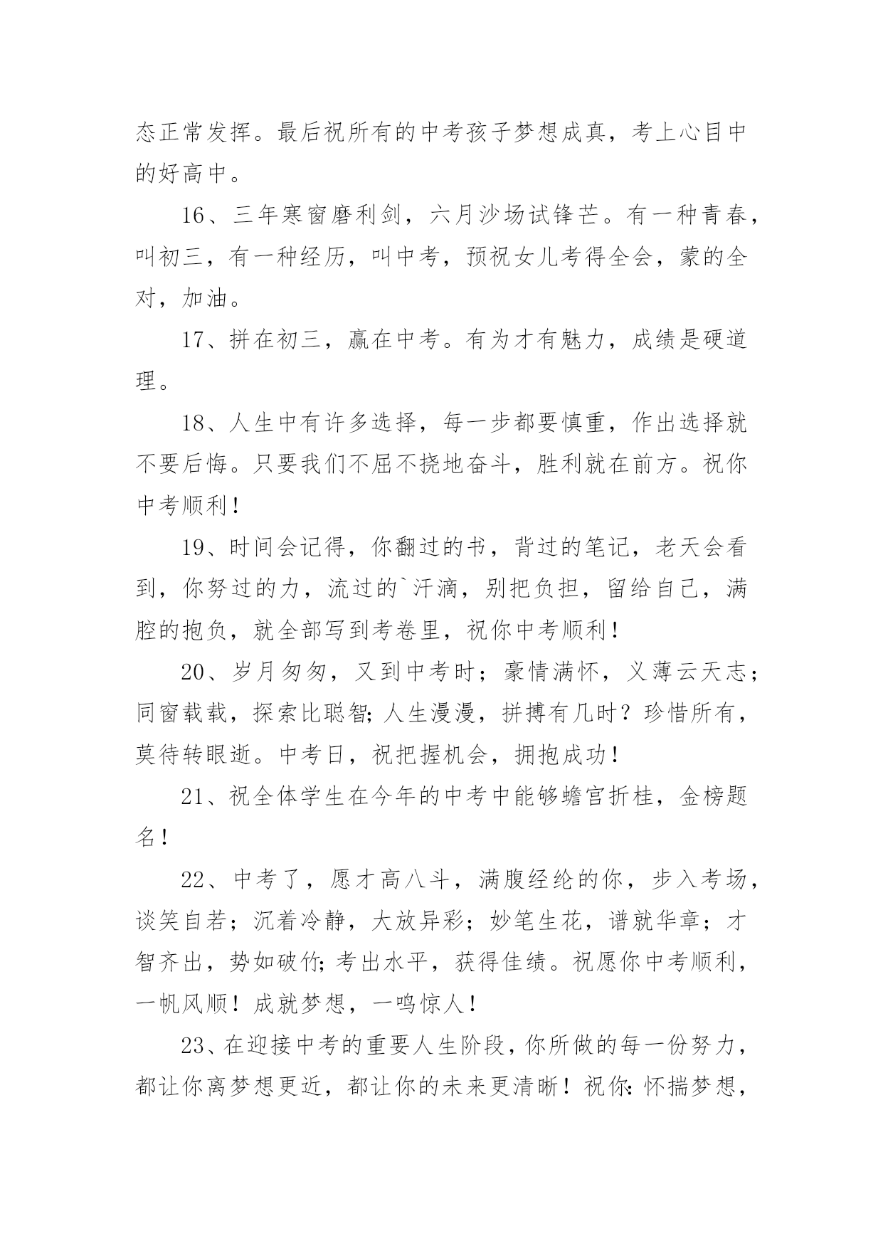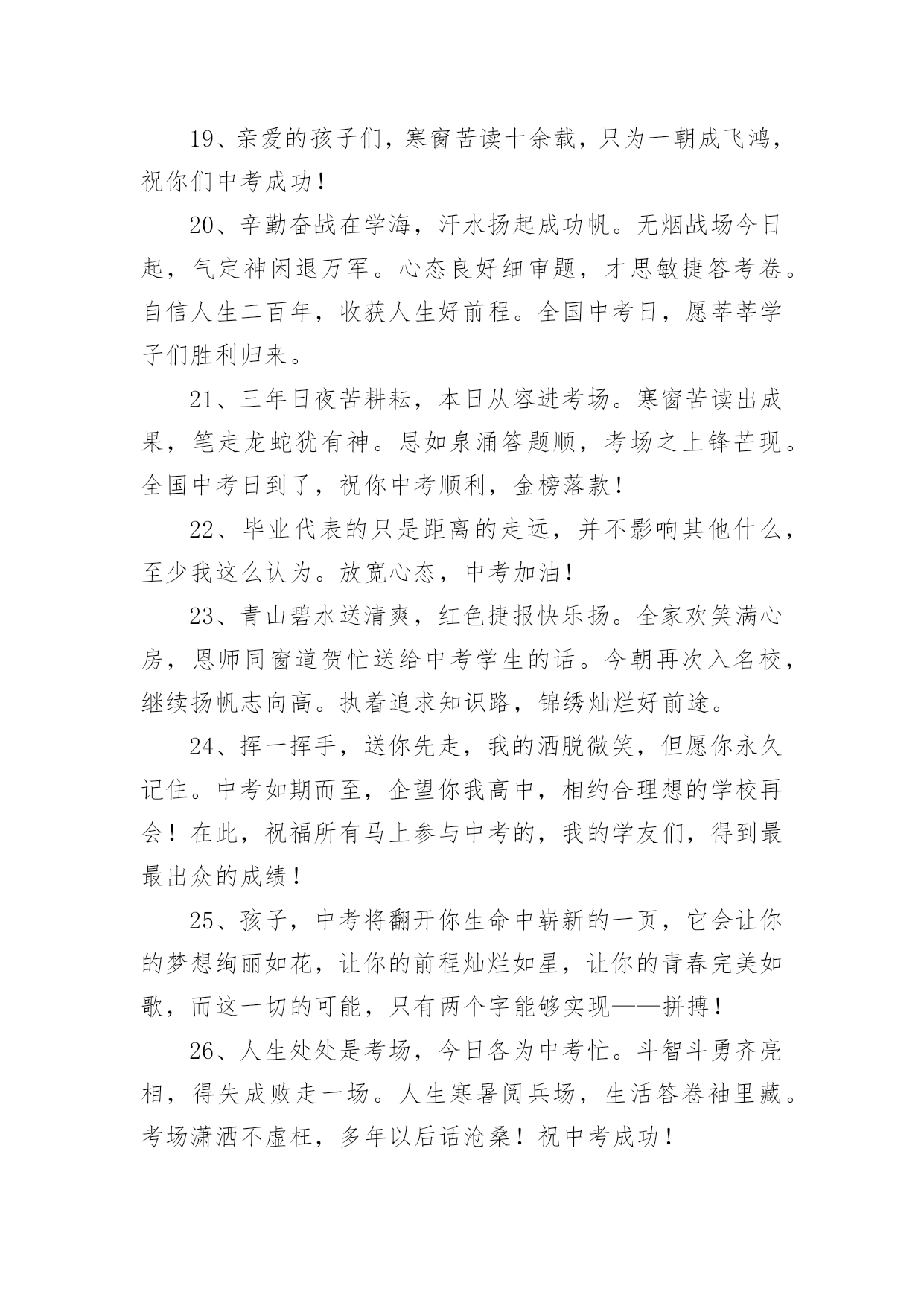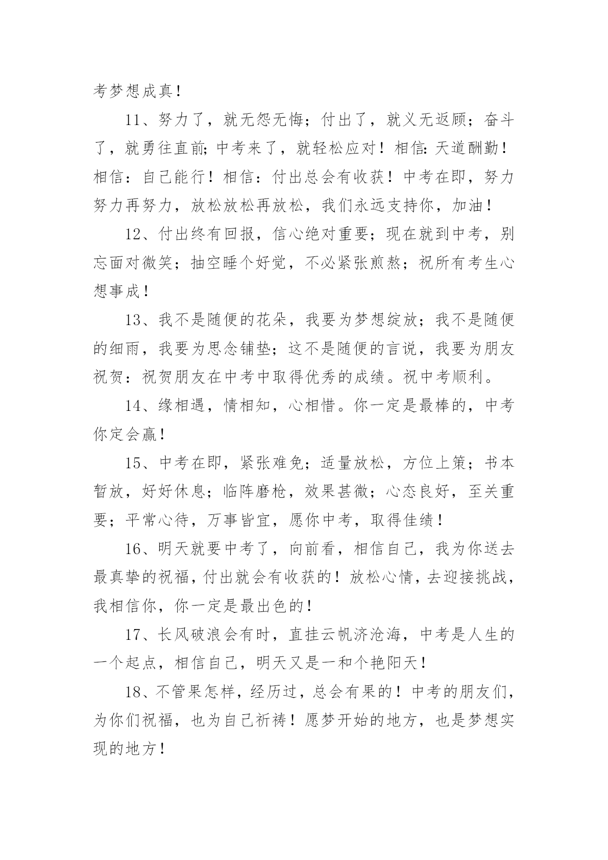 中考加油励志祝福语中考加油励志祝福语(精选400句)在生活、工作和学习中,大家都尝试过写祝福语吧,根据祝愿的对象不同,祝福语分为吉日喜庆祝福语、寿诞祝福语、事业祝福语、祝酒词等。什么样的祝福语才是走心的呢?以下是小编为大家收集的中考加油励志祝福语(精选400句),欢迎大家分享。中考加油励志祝福语11、明天就是中考了,希望在这最后的日子,你能满怀着信心,发挥出你最好的水平,考出最好的成绩!加油!祝你马到成功鹏程四海!2、付出终有收获,努力会有结果,功名成就在即,此刻莫要焦虑,心中会有担忧,黎明前的节奏,中考就如行舟,随风随水无忧。前路一片光明,愿你心想事成。3、十年寒窗,发挥在此时,精神抖擞,奋战考场中,放松心境,沉着来应对,充满信心,考出好成绩,祝中考的学生,身体健康,学业有成。4、中考来临,莫要焦虑,安心复习,思路整理,精神抖擞,迎接考试,细心审题,精心作答,发挥才智,如鱼得水,愿你考出好成绩,祝你马到成功。5、祝我今天中考能考个好成绩,也祝今天中考的人考好,加油!6、考前满信心,下笔如有神;休息多静心,养好精气神;思考必细心,身心都入神;答题要用心,聚精又会神,中考心态最重要,千叮万嘱为你好。祝你马到成功,金榜题名!7、也许你不情愿,也许你曾胆怯,但只要跨出那一步,温馨而充满活力的生活就在你的面前。祝你中考成功!8、中考是比知识、比能力、比心理、比信心、比体力的一场综合考试。9、祝中考健儿,胜利而归,心想事成。10、明天你就要上考场了,中考复习。希望你在考场上保持冷静。祝福你,三年的努力一定会有丰硕的成果!11、斗志昂扬,百炼成钢。百天冲刺之际,让我们一起,站在新起点,迎接新挑战,创造新成绩!荣耀初三三,中考一定赢!12、静静的是你的心情,急急的是你的笔锋,满满的是你的信心,亮亮的是你的成绩,默默的是我的祝福,又是一年中考时,祝金榜题名!13、中考着实是一种丰收,它包蕴着太多的内涵。不管中考成绩如何,你的成长与成熟是任何人无法改变的事实,这三年的辛勤走过,你获得的太多太多。14、中考之前很容易失眠,最好不要吃安眠药,这样有害身体。睡前一小时喝杯牛奶最为科学。希望你能够在中考中取得好成绩!加油!15、然后呢,希望压力也不要太大,保持一个常规的心态正常发挥。最后祝所有的中考孩子梦想成真,考上心目中的好高中。16、三年寒窗磨利剑,六月沙场试锋芒。有一种青春,叫初三,有一种经历,叫中考,预祝女儿考得全会,蒙的全对,加油。17、拼在初三,赢在中考。有为才有魅力,成绩是硬道理。18、人生中有许多选择,每一步都要慎重,作出选择就不要后悔。只要我们不屈不挠地奋斗,胜利就在前方。祝你中考顺利!19、时间会记得,你翻过的书,背过的笔记,老天会看到,你努过的力,流过的`汗滴,别把负担,留给自己,满腔的抱负,就全部写到考卷里,祝你中考顺利!20、岁月匆匆,又到中考时;豪情满怀,义薄云天志;同窗载载,探索比聪智;人生漫漫,拼搏有几时?珍惜所有,莫待转眼逝。中考日,祝把握机会,拥抱成功!21、祝全体学生在今年的中考中能够蟾宫折桂,金榜题名!22、中考了,愿才高八斗,满腹经纶的你,步入考场,谈笑自若;沉着冷静,大放异彩;妙笔生花,谱就华章;才智齐出,势如破竹;考出水平,获得佳绩。祝愿你中考顺利,一帆风顺!成就梦想,一鸣惊人!23、在迎接中考的重要人生阶段,你所做的每一份努力,都让你离梦想更近,都让你的未来更清晰!祝你:怀揣梦想,拥抱未来!24、一腔热血备中考,满腹经纶方成功。25、六月艳阳天,中考如期至,十年寒窗苦,朝朝不停歇;人多独木一,独外路万条,平稳保心态,从容应对答。金榜题名万分喜,名落孙山勿悲伤!祝你中考大捷!26、宝剑锋从磨砺出,梅花香自苦寒来。挥洒的汗水,成就你的豪迈;中考的舞台,见证你的精彩。愿考试顺利,金榜题名,人生路上永不败。27、保持平常心,营造好环境,扬起常笑脸,轻松迎中考。28、祝你中考高分,鲤鱼跃龙门当我只盼着在读十年第一。加油!29、三年弹指一瞬间,作别茂华在今天。你与为师有缘份,分班册里名字见。从此牵挂细培养,风霜雪雨共承担。明天迈入中考门,沉着冷静化疑难。迎考知识储备足,科科试卷一风帆。七月八日传捷报,一中目标能实现。30、太阳照,鸟儿叫,花儿笑,中考到。昨天的努力,明天的骄傲。满怀信心上考场,一分付出百倍回报。祝你考试顺利,金榜题名,一飞冲天。31、愿全国所有的考生都能以平常的心态参加中考,发挥自己的水平,考上理想的学校。我真心地祝福你们。32、真心地祝福你中考取得好成绩!发挥出最好的水平。你是个聪明和头脑灵活的人,我相信你一定成功!加油,等你好消息!33、送走了五月花丛的芬芳,迎来六月桃李的时光。中考在即,给你发条短信:你可以不用理我,但不能失去自我,你可以不看短信,但不能没有自信,预祝中考顺利!34、三年时光