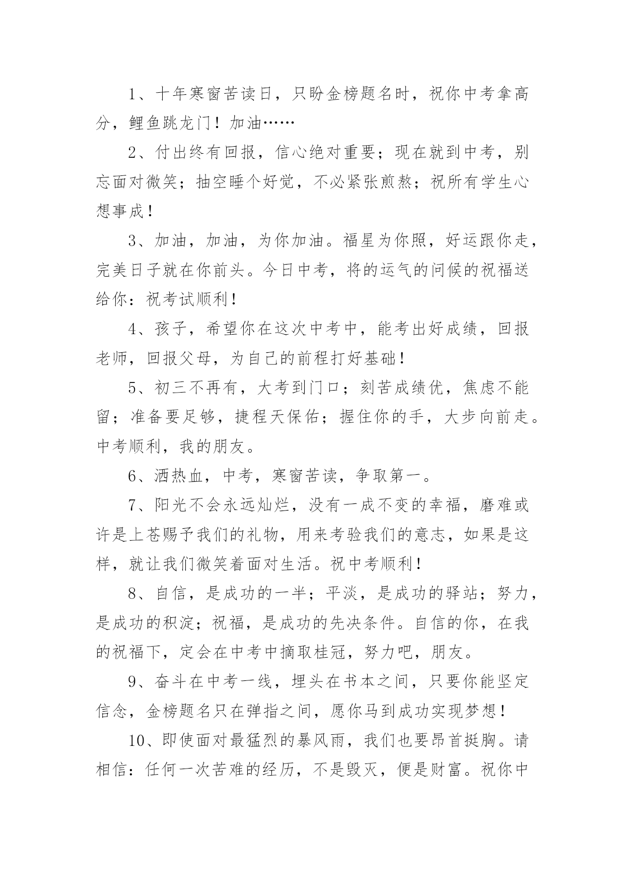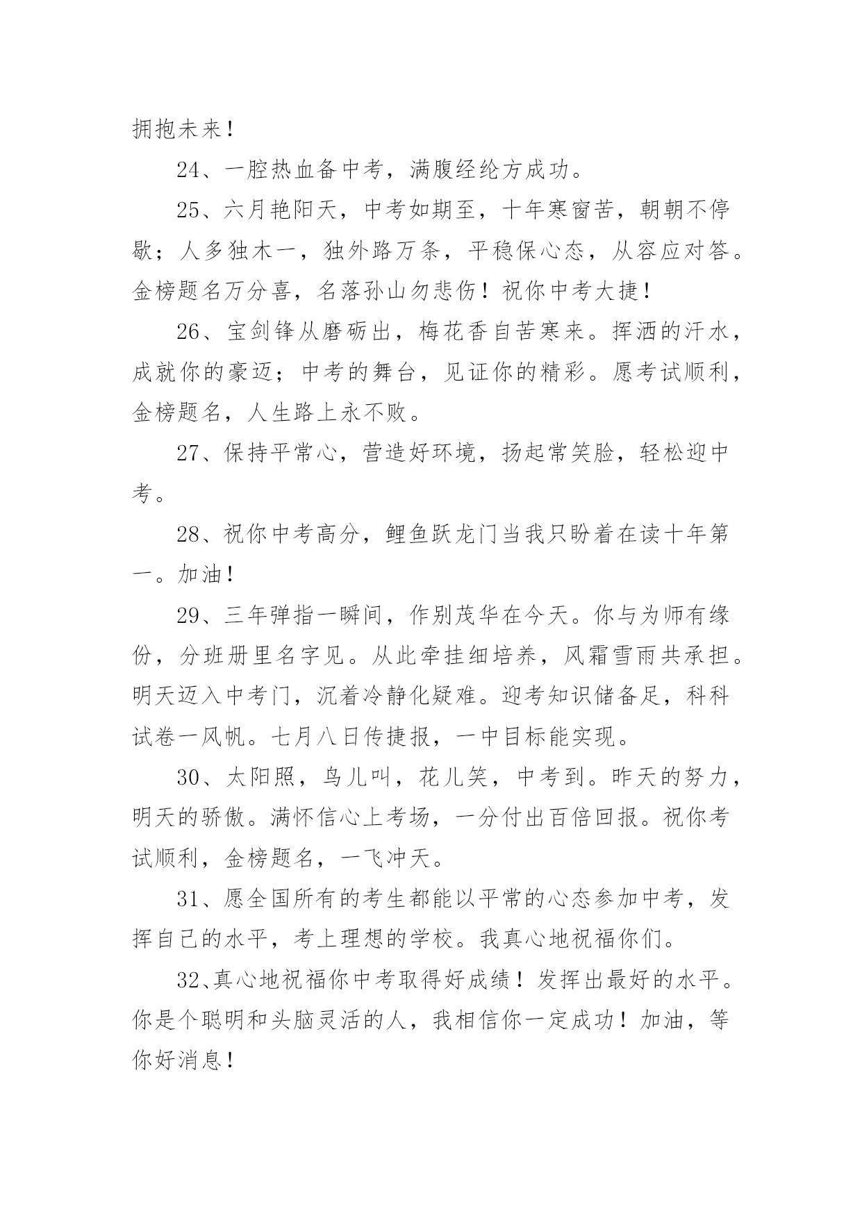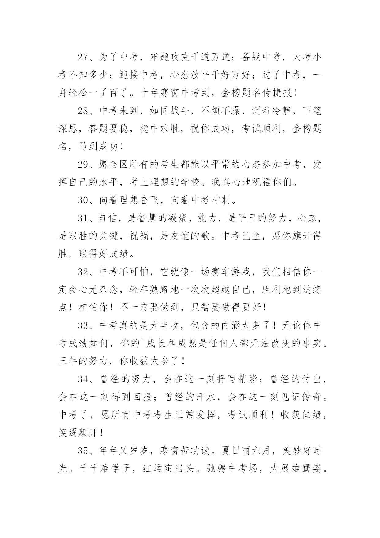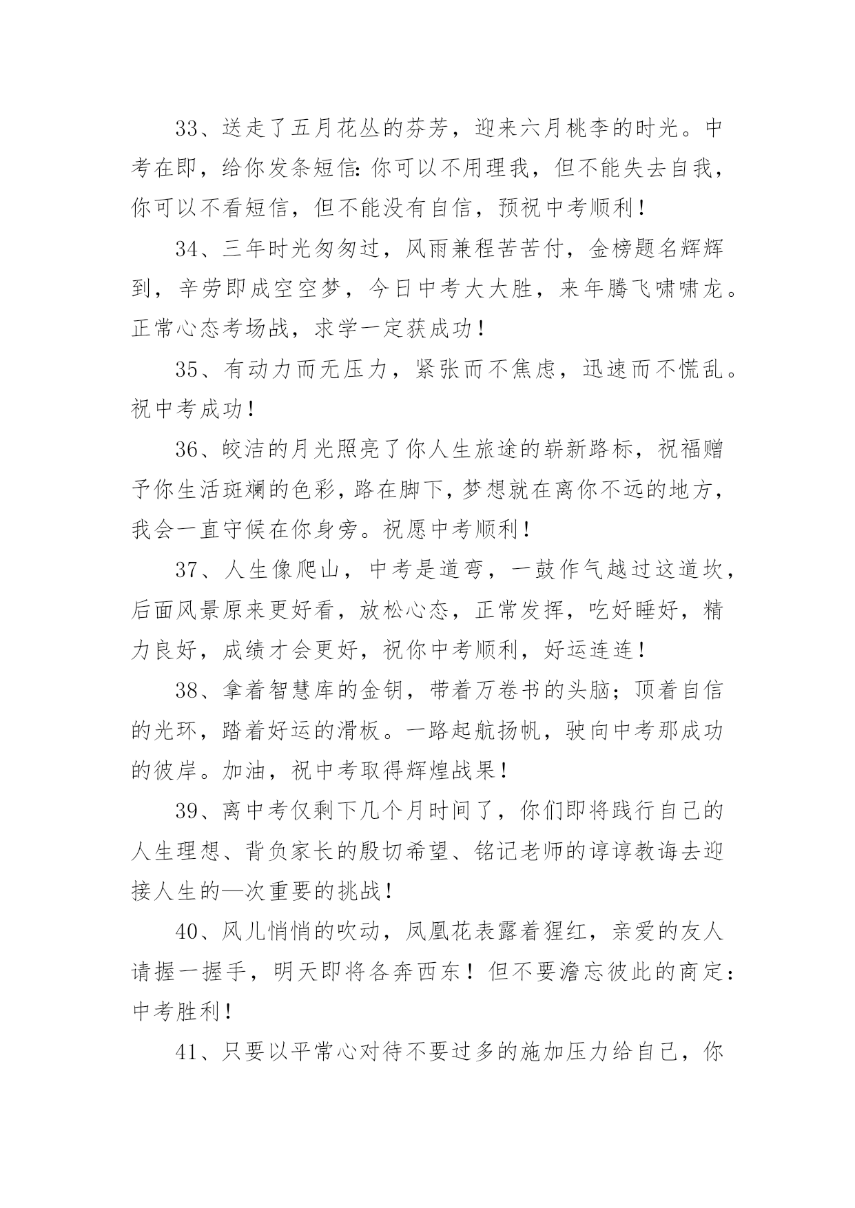 中考加油励志祝福语中考加油励志祝福语(精选400句)在生活、工作和学习中,大家都尝试过写祝福语吧,根据祝愿的对象不同,祝福语分为吉日喜庆祝福语、寿诞祝福语、事业祝福语、祝酒词等。什么样的祝福语才是走心的呢?以下是小编为大家收集的中考加油励志祝福语(精选400句),欢迎大家分享。中考加油励志祝福语11、明天就是中考了,希望在这最后的日子,你能满怀着信心,发挥出你最好的水平,考出最好的成绩!加油!祝你马到成功鹏程四海!2、付出终有收获,努力会有结果,功名成就在即,此刻莫要焦虑,心中会有担忧,黎明前的节奏,中考就如行舟,随风随水无忧。前路一片光明,愿你心想事成。3、十年寒窗,发挥在此时,精神抖擞,奋战考场中,放松心境,沉着来应对,充满信心,考出好成绩,祝中考的学生,身体健康,学业有成。4、中考来临,莫要焦虑,安心复习,思路整理,精神抖擞,迎接考试,细心审题,精心作答,发挥才智,如鱼得水,愿你考出好成绩,祝你马到成功。5、祝我今天中考能考个好成绩,也祝今天中考的人考好,加油!6、考前满信心,下笔如有神;休息多静心,养好精气神;思考必细心,身心都入神;答题要用心,聚精又会神,中考心态最重要,千叮万嘱为你好。祝你马到成功,金榜题名!7、也许你不情愿,也许你曾胆怯,但只要跨出那一步,温馨而充满活力的生活就在你的面前。祝你中考成功!8、中考是比知识、比能力、比心理、比信心、比体力的一场综合考试。9、祝中考健儿,胜利而归,心想事成。10、明天你就要上考场了,中考复习。希望你在考场上保持冷静。祝福你,三年的努力一定会有丰硕的成果!11、斗志昂扬,百炼成钢。百天冲刺之际,让我们一起,站在新起点,迎接新挑战,创造新成绩!荣耀初三三,中考一定赢!12、静静的是你的心情,急急的是你的笔锋,满满的是你的信心,亮亮的是你的成绩,默默的是我的祝福,又是一年中考时,祝金榜题名!13、中考着实是一种丰收,它包蕴着太多的内涵。不管中考成绩如何,你的成长与成熟是任何人无法改变的事实,这三年的辛勤走过,你获得的太多太多。14、中考之前很容易失眠,最好不要吃安眠药,这样有害身体。睡前一小时喝杯牛奶最为科学。希望你能够在中考中取得好成绩!加油!15、然后呢,希望压力也不要太大,保持一个常规的心态正常发挥。最后祝所有的中考孩子梦想成真,考上心目中的好高中。16、三年寒窗磨利剑,六月沙场试锋芒。有一种青春,叫初三,有一种经历,叫中考,预祝女儿考得全会,蒙的全对,加油。17、拼在初三,赢在中考。有为才有魅力,成绩是硬道理。18、人生中有许多选择,每一步都要慎重,作出选择就不要后悔。只要我们不屈不挠地奋斗,胜利就在前方。祝你中考顺利!19、时间会记得,你翻过的书,背过的笔记,老天会看到,你努过的力,流过的`汗滴,别把负担,留给自己,满腔的抱负,就全部写到考卷里,祝你中考顺利!20、岁月匆匆,又到中考时;豪情满怀,义薄云天志;同窗载载,探索比聪智;人生漫漫,拼搏有几时?珍惜所有,莫待转眼逝。中考日,祝把握机会,拥抱成功!21、祝全体学生在今年的中考中能够蟾宫折桂,金榜题名!22、中考了,愿才高八斗,满腹经纶的你,步入考场,谈笑自若;沉着冷静,大放异彩;妙笔生花,谱就华章;才智齐出,势如破竹;考出水平,获得佳绩。祝愿你中考顺利,一帆风顺!成就梦想,一鸣惊人!23、在迎接中考的重要人生阶段,你所做的每一份努力,都让你离梦想更近,都让你的未来更清晰!祝你:怀揣梦想,拥抱未来!24、一腔热血备中考,满腹经纶方成功。25、六月艳阳天,中考如期至,十年寒窗苦,朝朝不停歇;人多独木一,独外路万条,平稳保心态,从容应对答。金榜题名万分喜,名落孙山勿悲伤!祝你中考大捷!26、宝剑锋从磨砺出,梅花香自苦寒来。挥洒的汗水,成就你的豪迈;中考的舞台,见证你的精彩。愿考试顺利,金榜题名,人生路上永不败。27、保持平常心,营造好环境,扬起常笑脸,轻松迎中考。28、祝你中考高分,鲤鱼跃龙门当我只盼着在读十年第一。加油!29、三年弹指一瞬间,作别茂华在今天。你与为师有缘份,分班册里名字见。从此牵挂细培养,风霜雪雨共承担。明天迈入中考门,沉着冷静化疑难。迎考知识储备足,科科试卷一风帆。七月八日传捷报,一中目标能实现。30、太阳照,鸟儿叫,花儿笑,中考到。昨天的努力,明天的骄傲。满怀信心上考场,一分付出百倍回报。祝你考试顺利,金榜题名,一飞冲天。31、愿全国所有的考生都能以平常的心态参加中考,发挥自己的水平,考上理想的学校。我真心地祝福你们。32、真心地祝福你中考取得好成绩!发挥出最好的水平。你是个聪明和头脑灵活的人,我相信你一定成功!加油,等你好消息!33、送走了五月花丛的芬芳,迎来六月桃李的时光。中考在即,给你发条短信:你可以不用理我,但不能失去自我,你可以不看短信,但不能没有自信,预祝中考顺利!34、三年时光