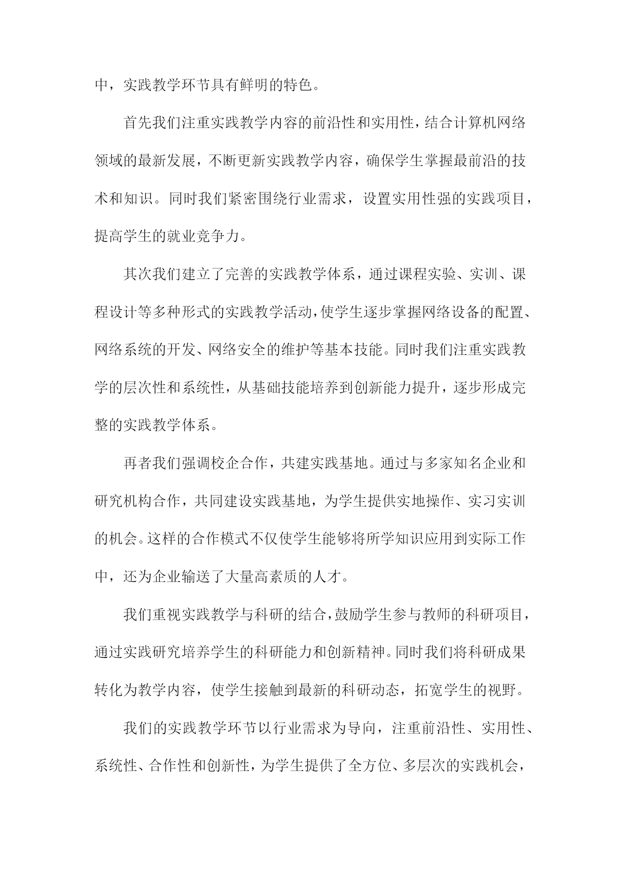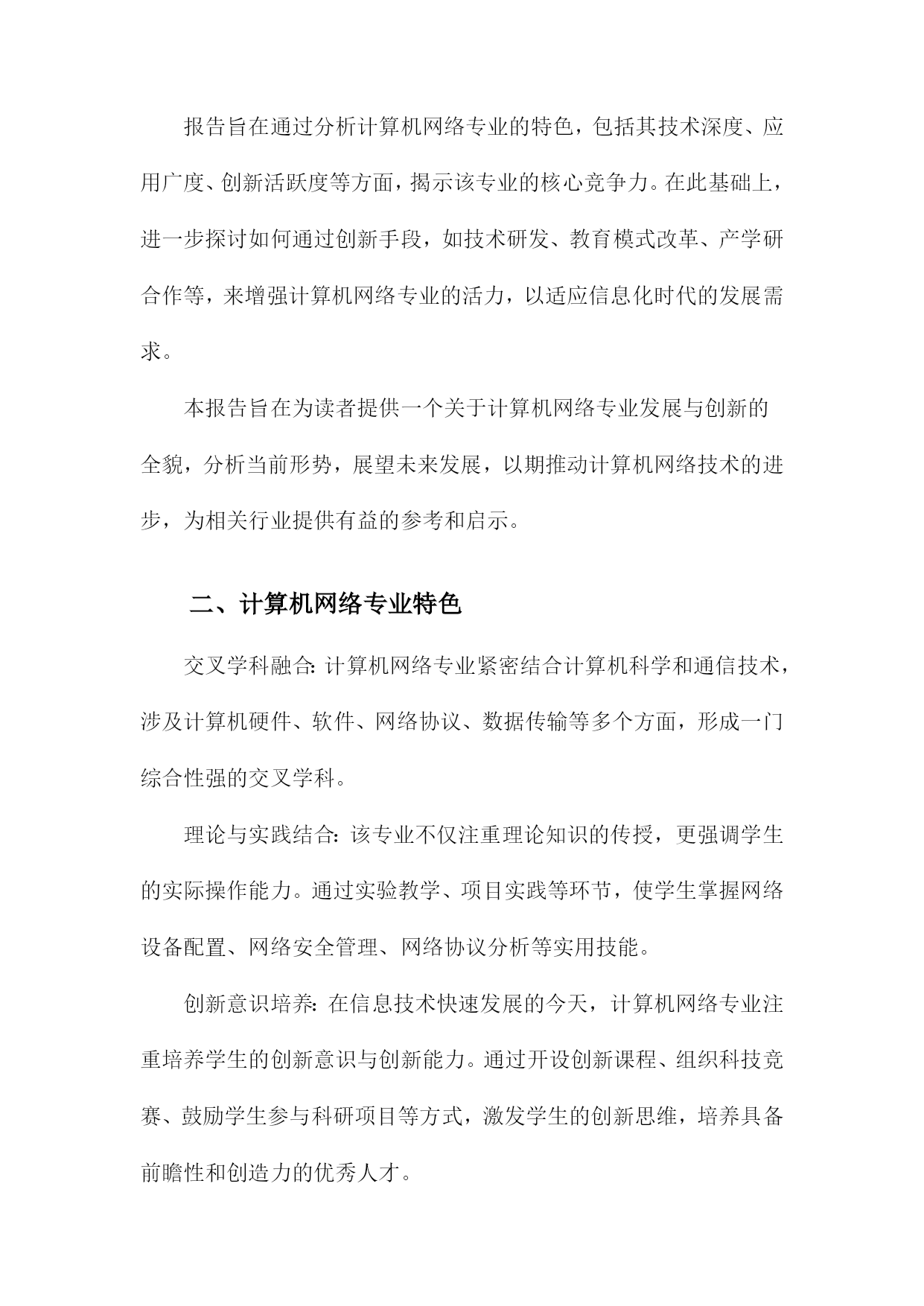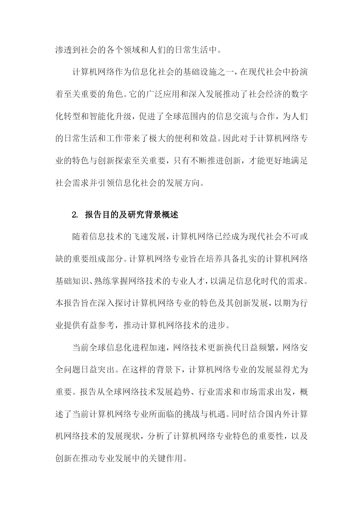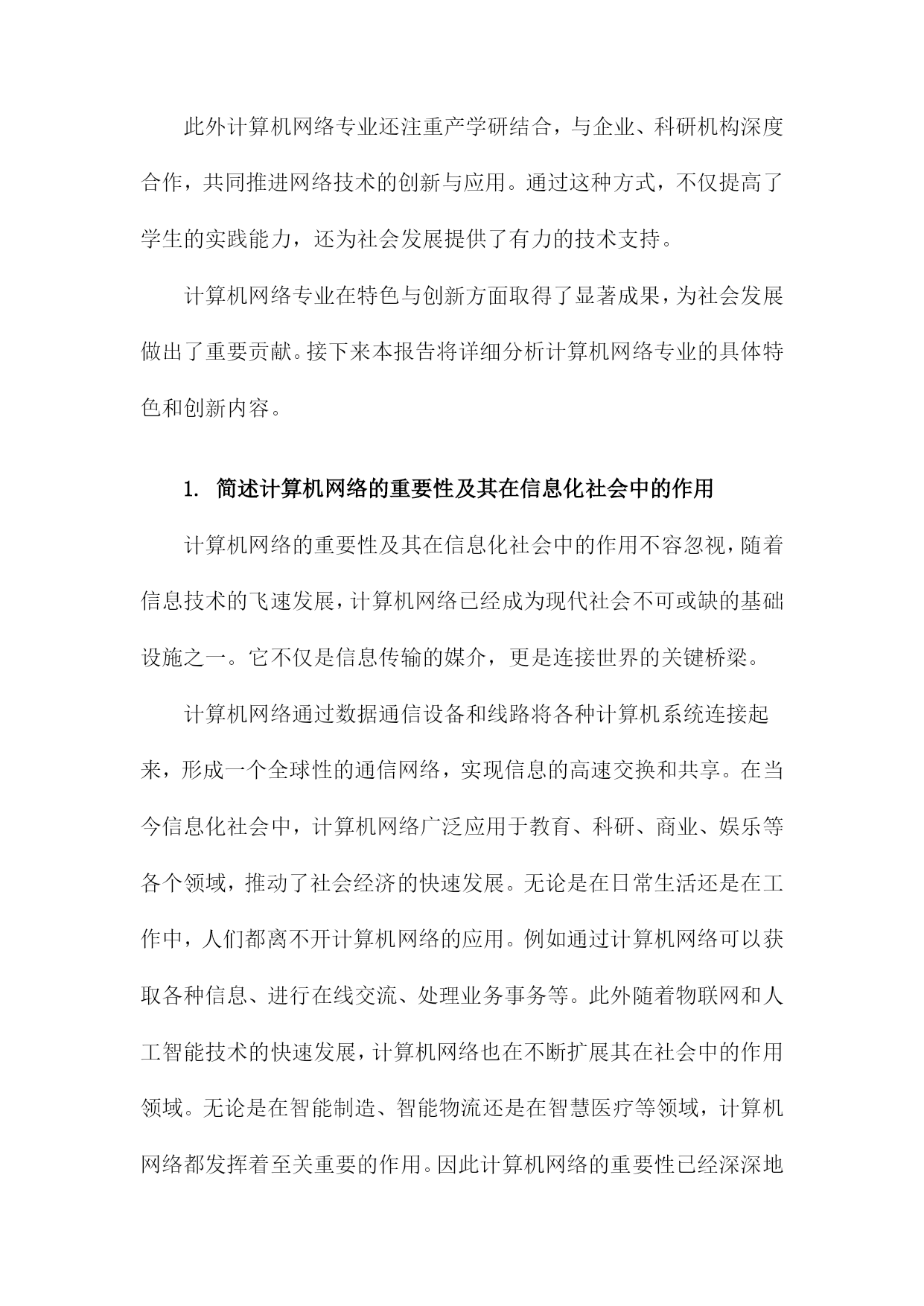 计算机网络专业特色与创新报告一、概览随着信息技术的飞速发展,计算机网络已成为现代社会不可或缺的基础设施之一。在这样的时代背景下,计算机网络专业不仅聚焦于传统网络技术的深化研究,还积极拥抱新兴技术,持续开拓创新。本报告旨在全面阐述计算机网络专业的特色与创新,展示该专业在理论与实践方面的最新进展和突破。从特色角度来看,计算机网络专业涵盖了丰富的知识体系,包括网络通信协议、网络安全、网络架构、云计算、大数据处理与传输等。该专业注重理论与实践相结合,强调学生动手能力的培养,以及在复杂网络环境下解决实际问题的能力。同时计算机网络专业还关注国际前沿技术动态,不断更新课程内容,以适应网络技术快速发展的需求。在创新方面,计算机网络专业紧跟时代步伐,积极探索新兴技术领域的研究与应用。例如人工智能与网络的深度融合,使得网络智能化成为新的发展方向;物联网技术的广泛应用,为网络专业带来了新的挑战和机遇;5G、边缘计算等前沿技术的崛起,为网络专业的发展提供了广阔的空间。计算机网络专业在不断创新中,努力满足社会和网络技术发展对人才的新要求。此外计算机网络专业还注重产学研结合,与企业、科研机构深度合作,共同推进网络技术的创新与应用。通过这种方式,不仅提高了学生的实践能力,还为社会发展提供了有力的技术支持。计算机网络专业在特色与创新方面取得了显著成果,为社会发展做出了重要贡献。接下来本报告将详细分析计算机网络专业的具体特色和创新内容。1.简述计算机网络的重要性及其在信息化社会中的作用计算机网络的重要性及其在信息化社会中的作用不容忽视,随着信息技术的飞速发展,计算机网络已经成为现代社会不可或缺的基础设施之一。它不仅是信息传输的媒介,更是连接世界的关键桥梁。计算机网络通过数据通信设备和线路将各种计算机系统连接起来,形成一个全球性的通信网络,实现信息的高速交换和共享。在当今信息化社会中,计算机网络广泛应用于教育、科研、商业、娱乐等各个领域,推动了社会经济的快速发展。无论是在日常生活还是在工作中,人们都离不开计算机网络的应用。例如通过计算机网络可以获取各种信息、进行在线交流、处理业务事务等。此外随着物联网和人工智能技术的快速发展,计算机网络也在不断扩展其在社会中的作用领域。无论是在智能制造、智能物流还是在智慧医疗等领域,计算机网络都发挥着至关重要的作用。因此计算机网络的重要性已经深深地渗透到社会的各个领域和人们的日常生活中。计算机网络作为信息化社会的基础设施之一,在现代社会中扮演着至关重要的角色。它的广泛应用和深入发展推动了社会经济的数字化转型和智能化升级,促进了全球范围内的信息交流与合作,为人们的日常生活和工作带来了极大的便利和效益。因此对于计算机网络专业的特色与创新探索至关重要,只有不断推进创新,才能更好地满足社会需求并引领信息化社会的发展方向。2.报告目的及研究背景概述随着信息技术的飞速发展,计算机网络已经成为现代社会不可或缺的重要组成部分。计算机网络专业旨在培养具备扎实的计算机网络基础知识、熟练掌握网络技术的专业人才,以满足信息化时代的需求。本报告旨在深入探讨计算机网络专业的特色及其创新发展,以期为行业提供有益参考,推动计算机网络技术的进步。当前全球信息化进程加速,网络技术更新换代日益频繁,网络安全问题日益突出。在这样的背景下,计算机网络专业的发展显得尤为重要。报告从全球网络技术发展趋势、行业需求和市场需求出发,概述了当前计算机网络专业所面临的挑战与机遇。同时结合国内外计算机网络技术的发展现状,分析了计算机网络专业特色的重要性,以及创新在推动专业发展中的关键作用。报告旨在通过分析计算机网络专业的特色,包括其技术深度、应用广度、创新活跃度等方面,揭示该专业的核心竞争力。在此基础上,进一步探讨如何通过创新手段,如技术研发、教育模式改革、产学研合作等,来增强计算机网络专业的活力,以适应信息化时代的发展需求。本报告旨在为读者提供一个关于计算机网络专业发展与创新的全貌,分析当前形势,展望未来发展,以期推动计算机网络技术的进步,为相关行业提供有益的参考和启示。二、计算机网络专业特色交叉学科融合:计算机网络专业紧密结合计算机科学和通信技术,涉及计算机硬件、软件、网络协议、数据传输等多个方面,形成一门综合性强的交叉学科。理论与实践结合:该专业不仅注重理论知识的传授,更强调学生的实际操作能力。通过实验教学、项目实践等环节,使学生掌握网络设备配置、网络安全管理、网络协议分析等实用技能。创新意识培养:在信息技术快速发展的今天,计算机网络专业注重培养学生的创新意识与创新能力。通过开设创新课程、组织科技竞赛、鼓励学生参与科研项目等方式,激发学生的创新思维,培养具备前瞻性和创造力的优秀人才。网络安全重要性凸显:随着互联网的普及和网络攻击的不断升级