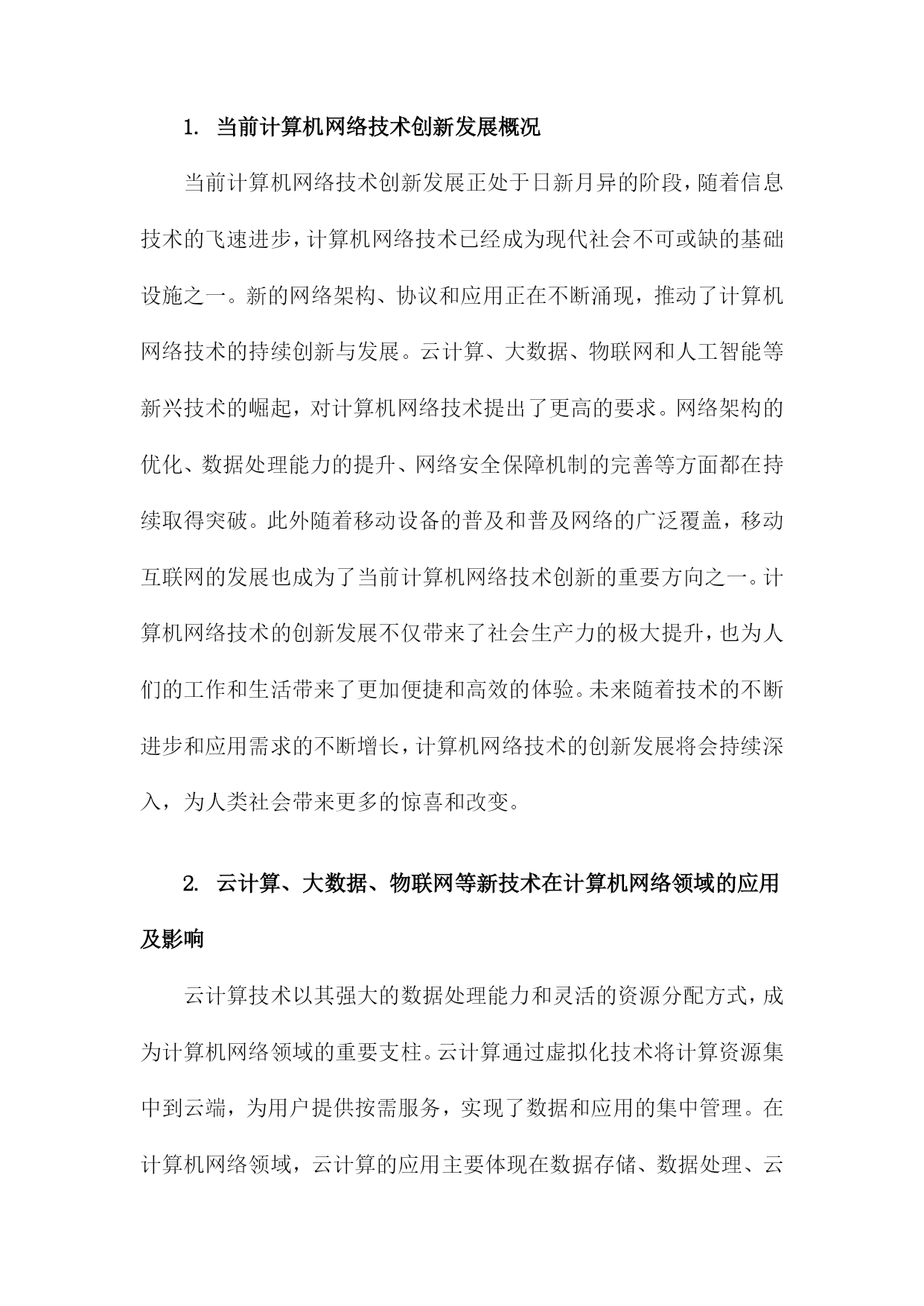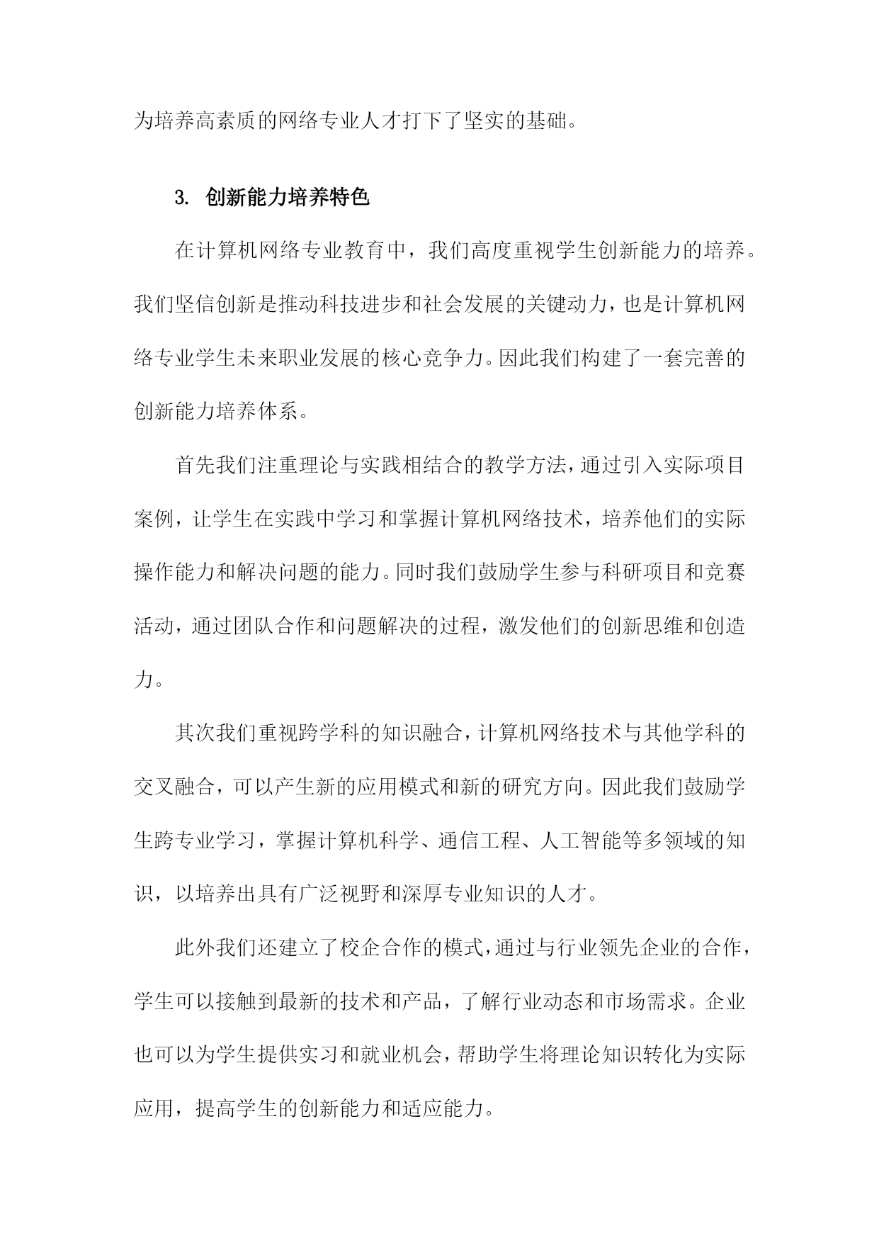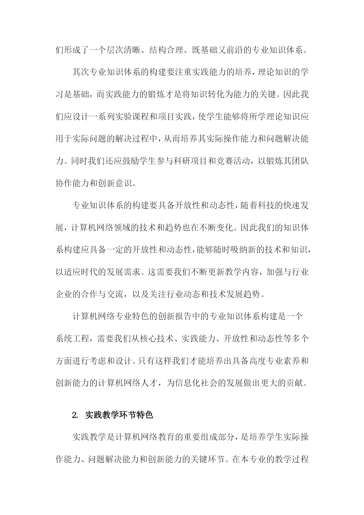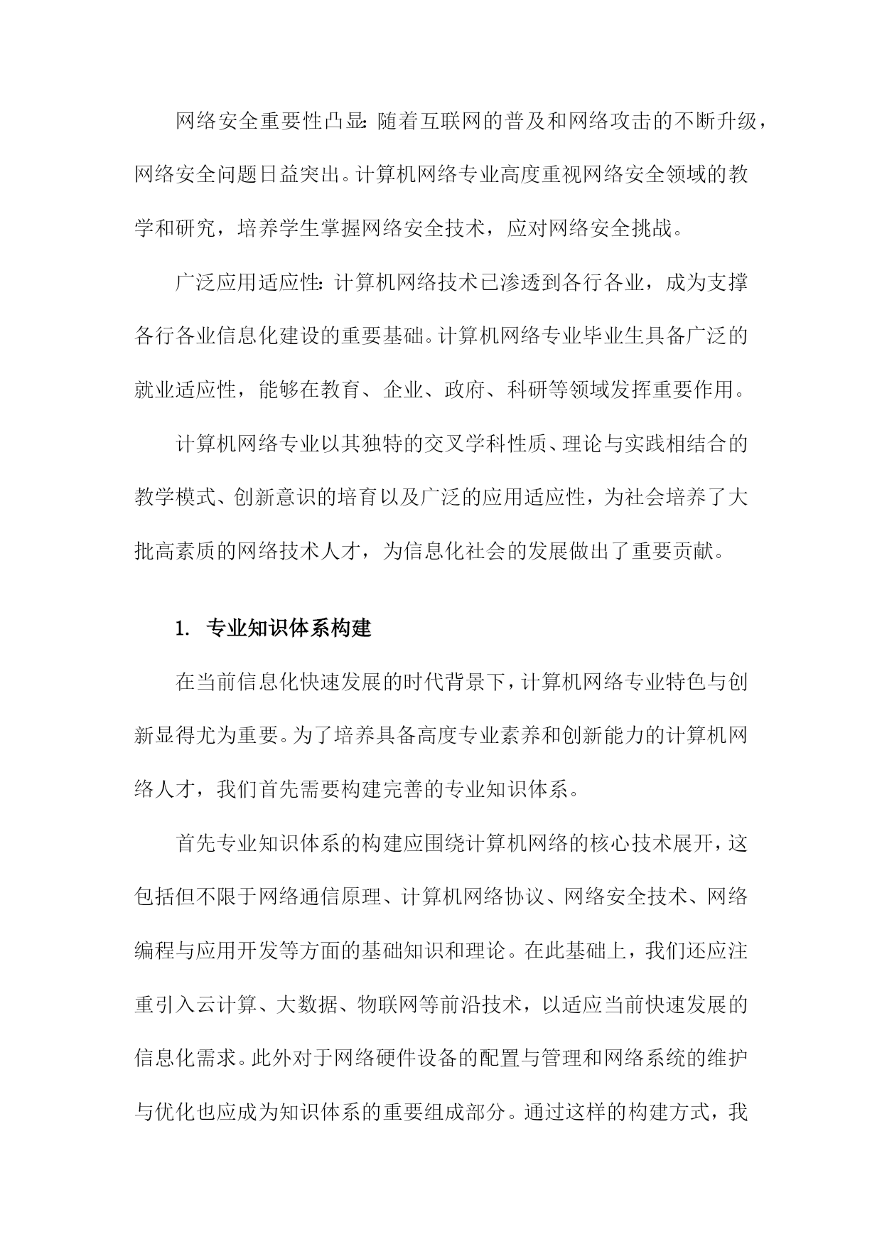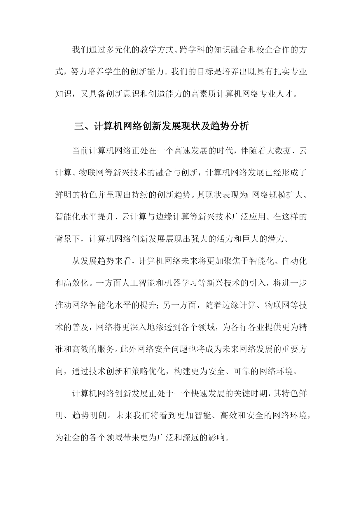 计算机网络专业特色与创新报告一、概览随着信息技术的飞速发展,计算机网络已成为现代社会不可或缺的基础设施之一。在这样的时代背景下,计算机网络专业不仅聚焦于传统网络技术的深化研究,还积极拥抱新兴技术,持续开拓创新。本报告旨在全面阐述计算机网络专业的特色与创新,展示该专业在理论与实践方面的最新进展和突破。从特色角度来看,计算机网络专业涵盖了丰富的知识体系,包括网络通信协议、网络安全、网络架构、云计算、大数据处理与传输等。该专业注重理论与实践相结合,强调学生动手能力的培养,以及在复杂网络环境下解决实际问题的能力。同时计算机网络专业还关注国际前沿技术动态,不断更新课程内容,以适应网络技术快速发展的需求。在创新方面,计算机网络专业紧跟时代步伐,积极探索新兴技术领域的研究与应用。例如人工智能与网络的深度融合,使得网络智能化成为新的发展方向;物联网技术的广泛应用,为网络专业带来了新的挑战和机遇;5G、边缘计算等前沿技术的崛起,为网络专业的发展提供了广阔的空间。计算机网络专业在不断创新中,努力满足社会和网络技术发展对人才的新要求。此外计算机网络专业还注重产学研结合,与企业、科研机构深度合作,共同推进网络技术的创新与应用。通过这种方式,不仅提高了学生的实践能力,还为社会发展提供了有力的技术支持。计算机网络专业在特色与创新方面取得了显著成果,为社会发展做出了重要贡献。接下来本报告将详细分析计算机网络专业的具体特色和创新内容。1.简述计算机网络的重要性及其在信息化社会中的作用计算机网络的重要性及其在信息化社会中的作用不容忽视,随着信息技术的飞速发展,计算机网络已经成为现代社会不可或缺的基础设施之一。它不仅是信息传输的媒介,更是连接世界的关键桥梁。计算机网络通过数据通信设备和线路将各种计算机系统连接起来,形成一个全球性的通信网络,实现信息的高速交换和共享。在当今信息化社会中,计算机网络广泛应用于教育、科研、商业、娱乐等各个领域,推动了社会经济的快速发展。无论是在日常生活还是在工作中,人们都离不开计算机网络的应用。例如通过计算机网络可以获取各种信息、进行在线交流、处理业务事务等。此外随着物联网和人工智能技术的快速发展,计算机网络也在不断扩展其在社会中的作用领域。无论是在智能制造、智能物流还是在智慧医疗等领域,计算机网络都发挥着至关重要的作用。因此计算机网络的重要性已经深深地渗透到社会的各个领域和人们的日常生活中。计算机网络作为信息化社会的基础设施之一,在现代社会中扮演着至关重要的角色。它的广泛应用和深入发展推动了社会经济的数字化转型和智能化升级,促进了全球范围内的信息交流与合作,为人们的日常生活和工作带来了极大的便利和效益。因此对于计算机网络专业的特色与创新探索至关重要,只有不断推进创新,才能更好地满足社会需求并引领信息化社会的发展方向。2.报告目的及研究背景概述随着信息技术的飞速发展,计算机网络已经成为现代社会不可或缺的重要组成部分。计算机网络专业旨在培养具备扎实的计算机网络基础知识、熟练掌握网络技术的专业人才,以满足信息化时代的需求。本报告旨在深入探讨计算机网络专业的特色及其创新发展,以期为行业提供有益参考,推动计算机网络技术的进步。当前全球信息化进程加速,网络技术更新换代日益频繁,网络安全问题日益突出。在这样的背景下,计算机网络专业的发展显得尤为重要。报告从全球网络技术发展趋势、行业需求和市场需求出发,概述了当前计算机网络专业所面临的挑战与机遇。同时结合国内外计算机网络技术的发展现状,分析了计算机网络专业特色的重要性,以及创新在推动专业发展中的关键作用。报告旨在通过分析计算机网络专业的特色,包括其技术深度、应用广度、创新活跃度等方面,揭示该专业的核心竞争力。在此基础上,进一步探讨如何通过创新手段,如技术研发、教育模式改革、产学研合作等,来增强计算机网络专业的活力,以适应信息化时代的发展需求。本报告旨在为读者提供一个关于计算机网络专业发展与创新的全貌,分析当前形势,展望未来发展,以期推动计算机网络技术的进步,为相关行业提供有益的参考和启示。二、计算机网络专业特色交叉学科融合:计算机网络专业紧密结合计算机科学和通信技术,涉及计算机硬件、软件、网络协议、数据传输等多个方面,形成一门综合性强的交叉学科。理论与实践结合:该专业不仅注重理论知识的传授,更强调学生的实际操作能力。通过实验教学、项目实践等环节,使学生掌握网络设备配置、网络安全管理、网络协议分析等实用技能。创新意识培养:在信息技术快速发展的今天,计算机网络专业注重培养学生的创新意识与创新能力。通过开设创新课程、组织科技竞赛、鼓励学生参与科研项目等方式,激发学生的创新思维,培养具备前瞻性和创造力的优秀人才。网络安全重要性凸显:随着互联网的普及和网络攻击的不断升级