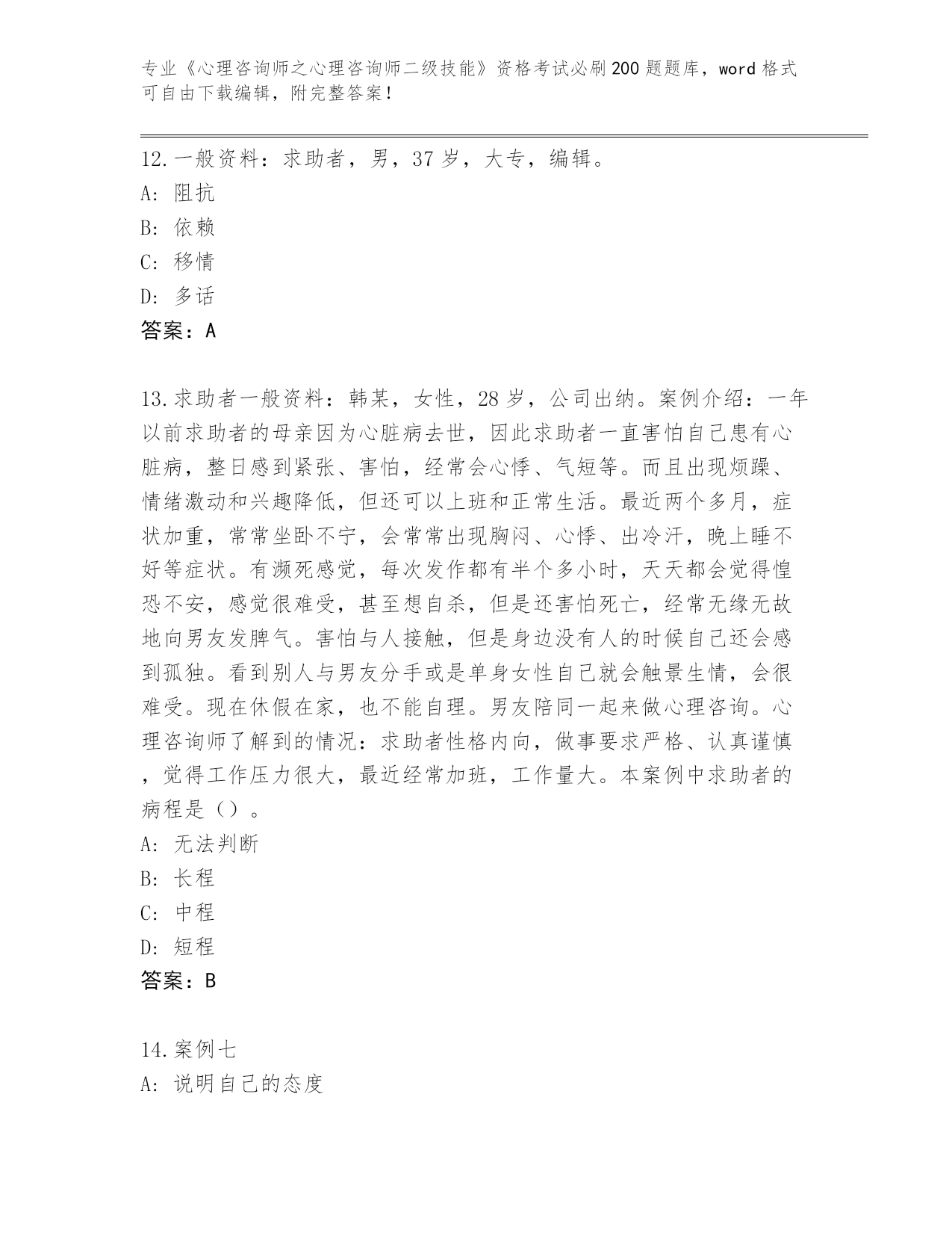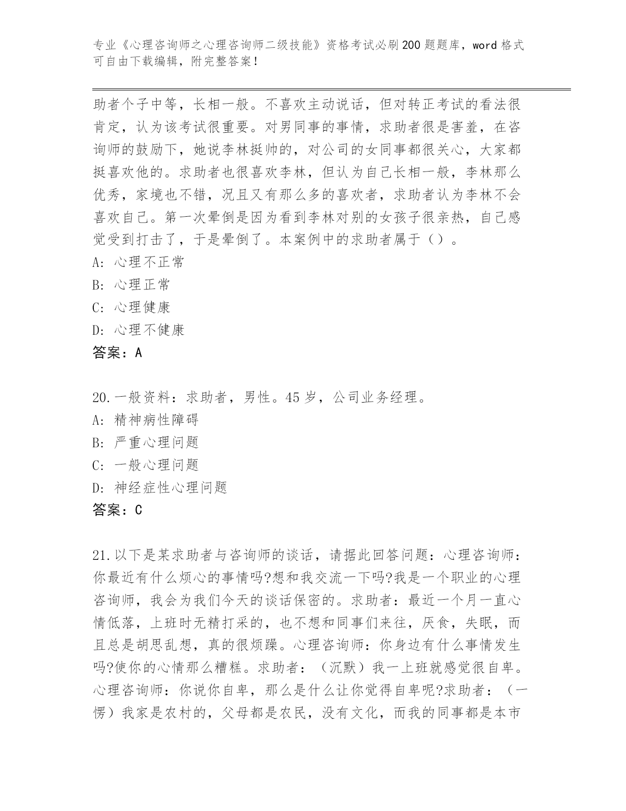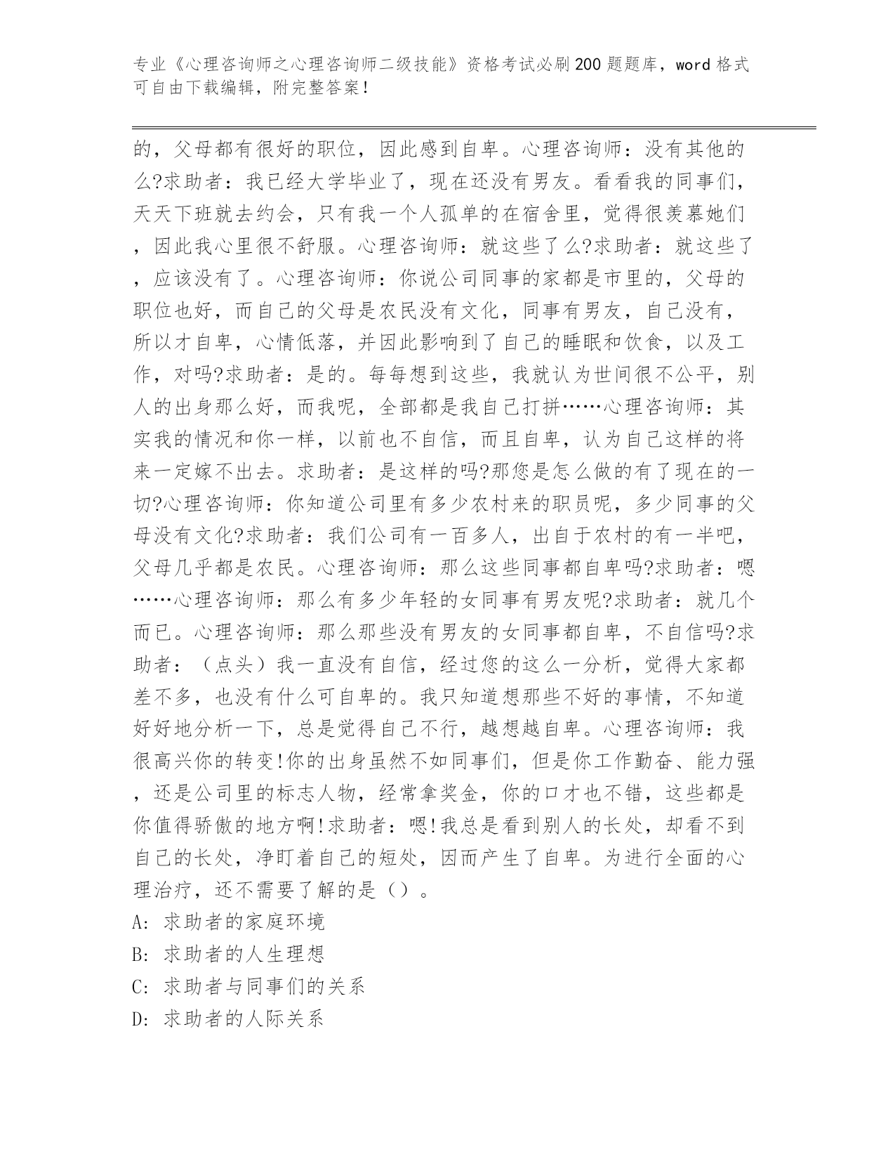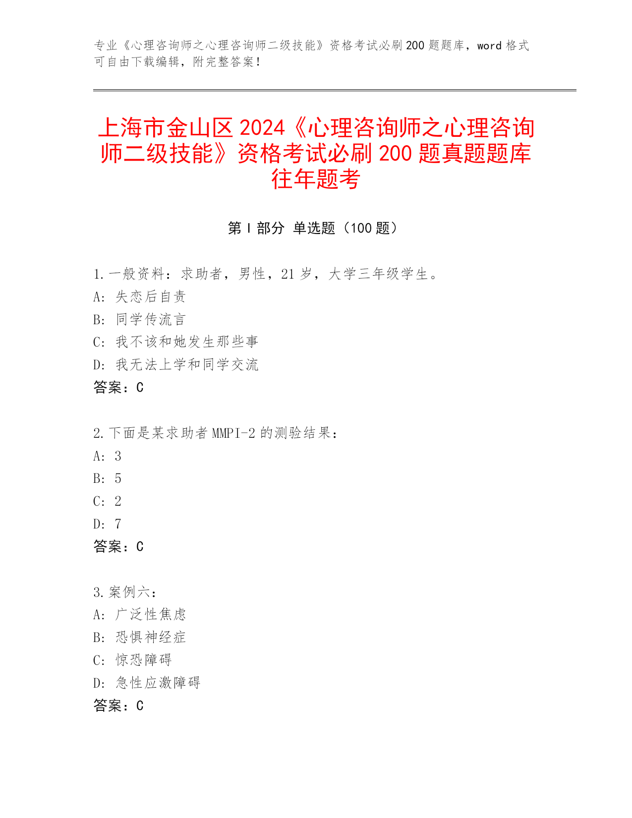 上海市金山区2024《心理咨询师之心理咨询师二级技能》资格考试必刷200题真题题库往年题考