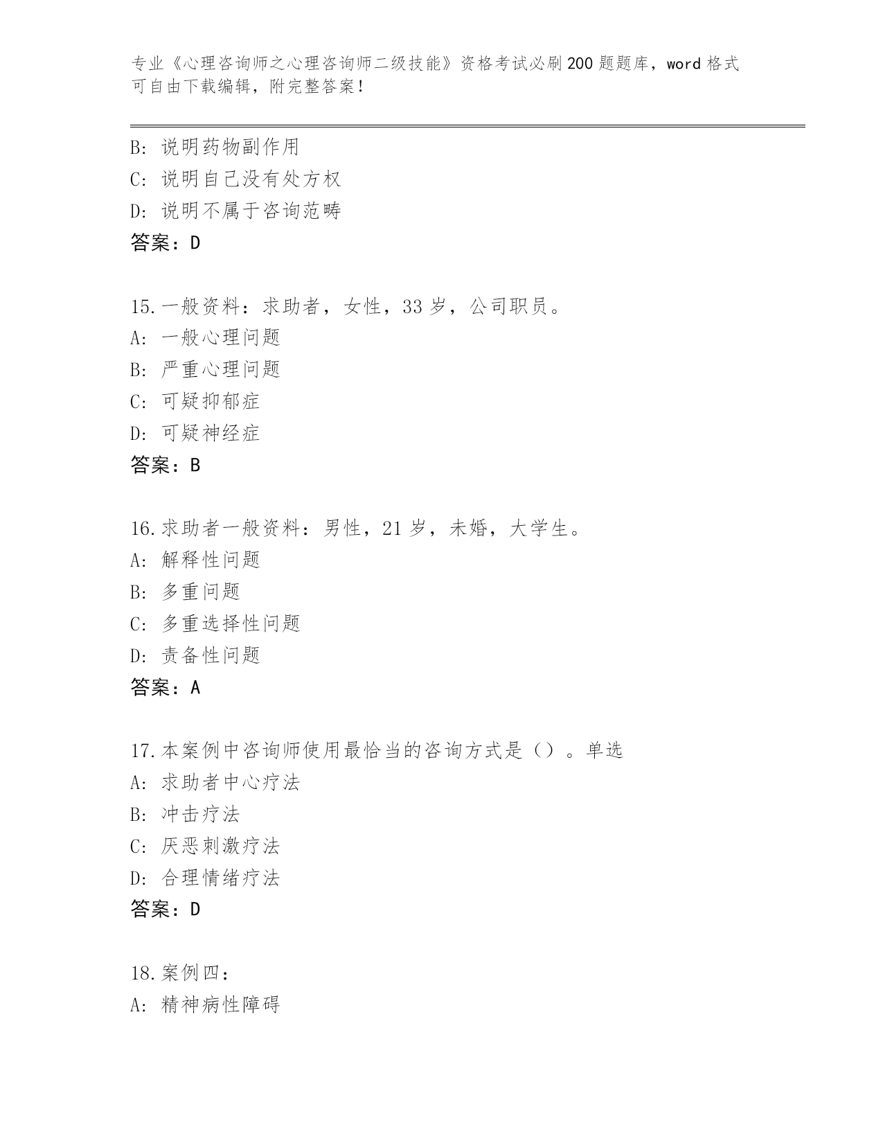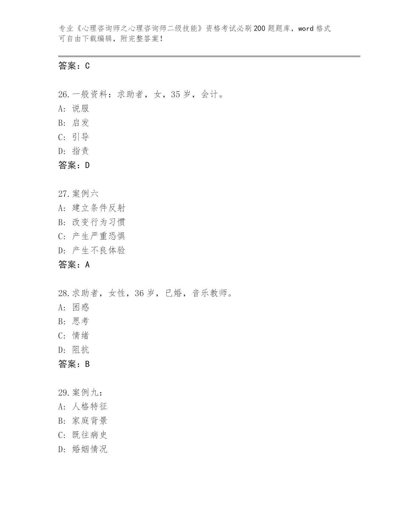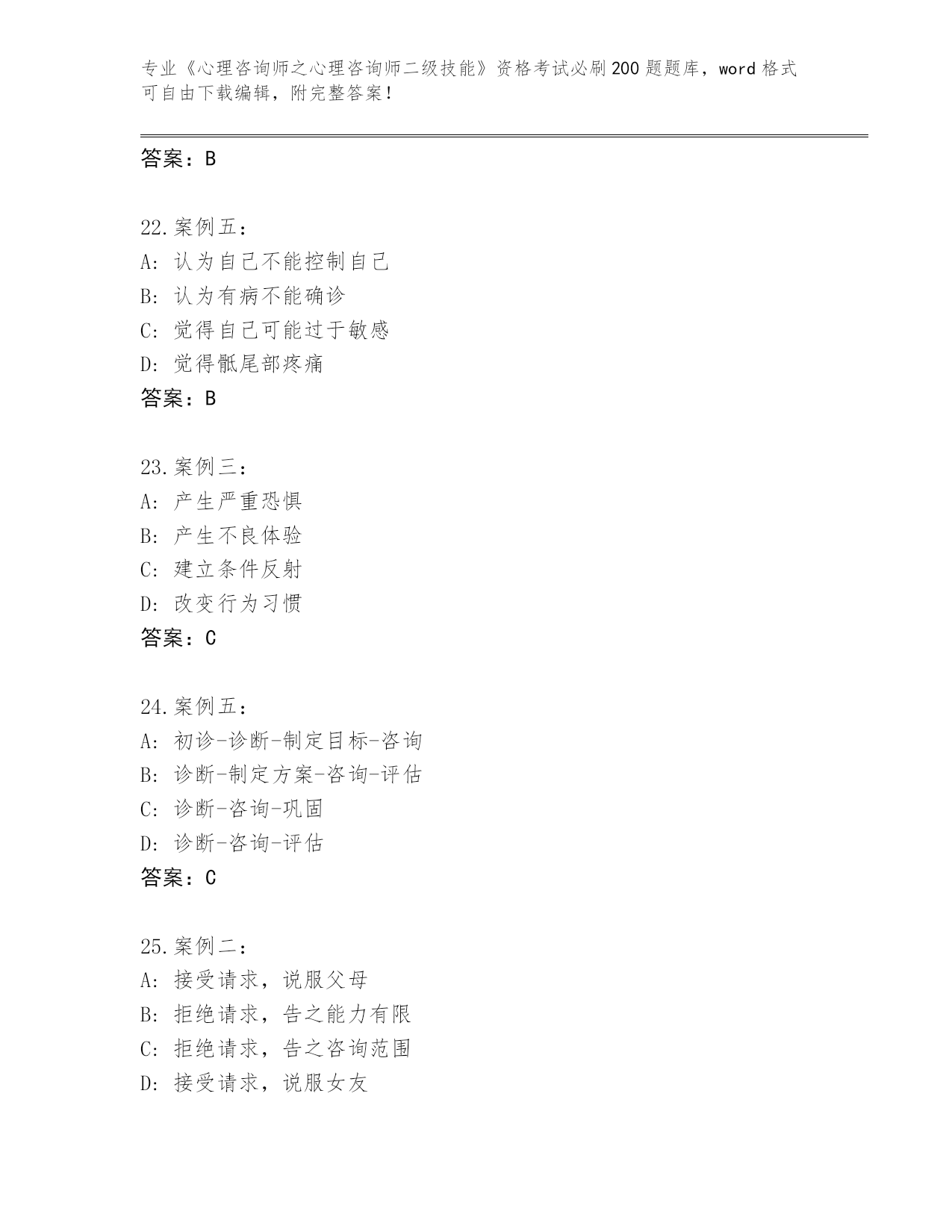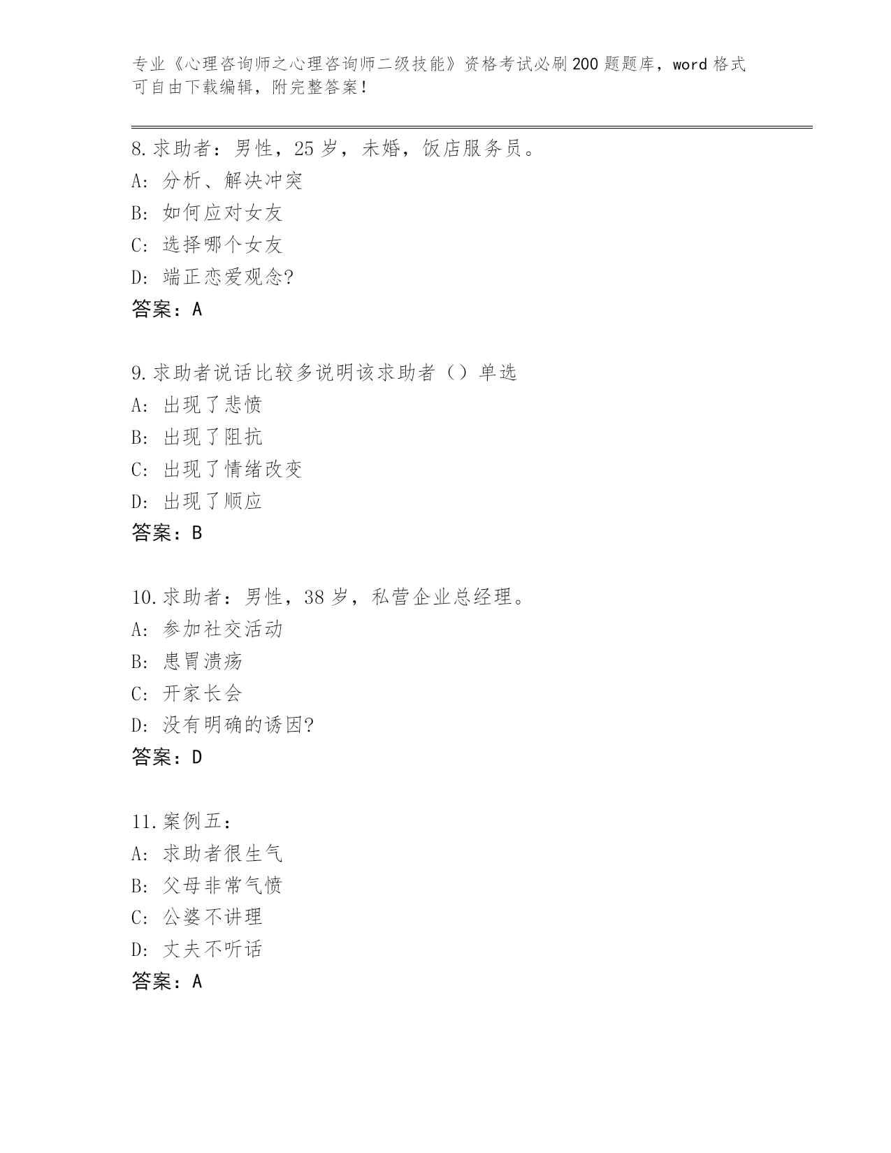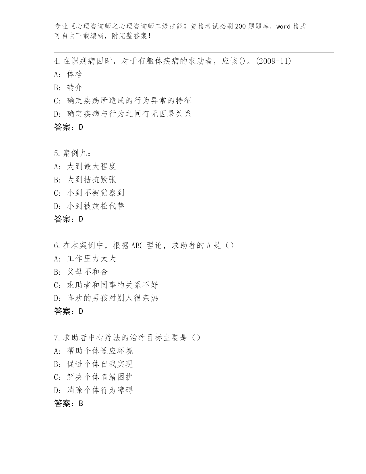 上海市金山区2024《心理咨询师之心理咨询师二级技能》资格考试必刷200题真题题库往年题考