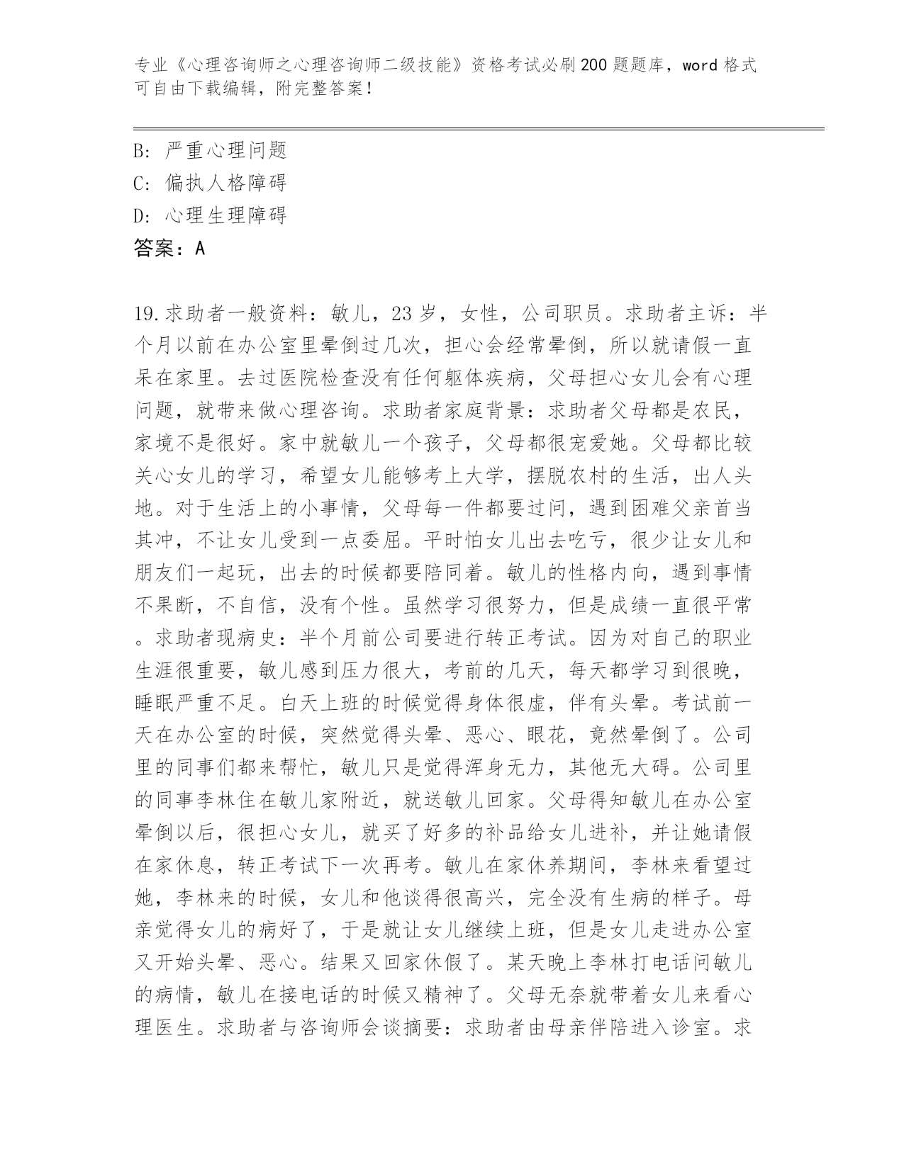 2024年湖北省樊城区《心理咨询师之心理咨询师二级技能》资格考试必背200题真题题库往年题考