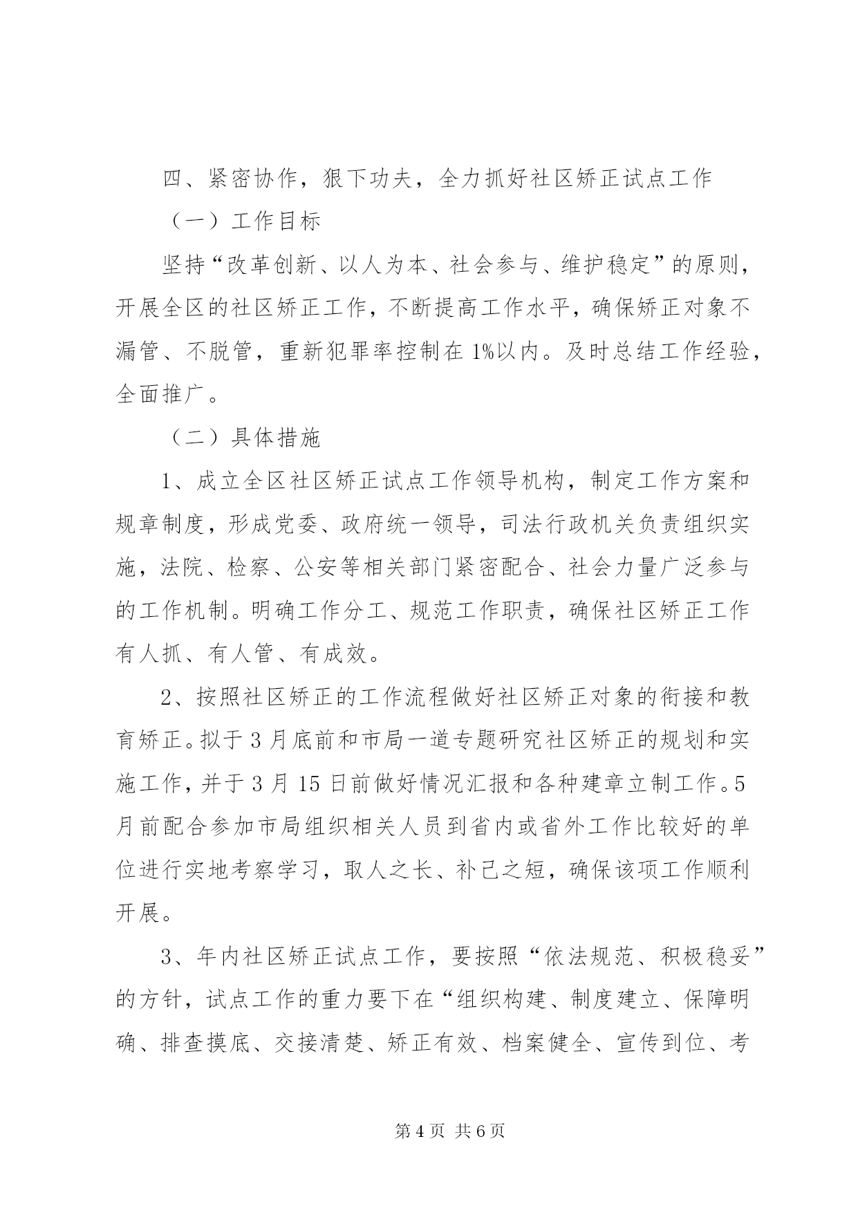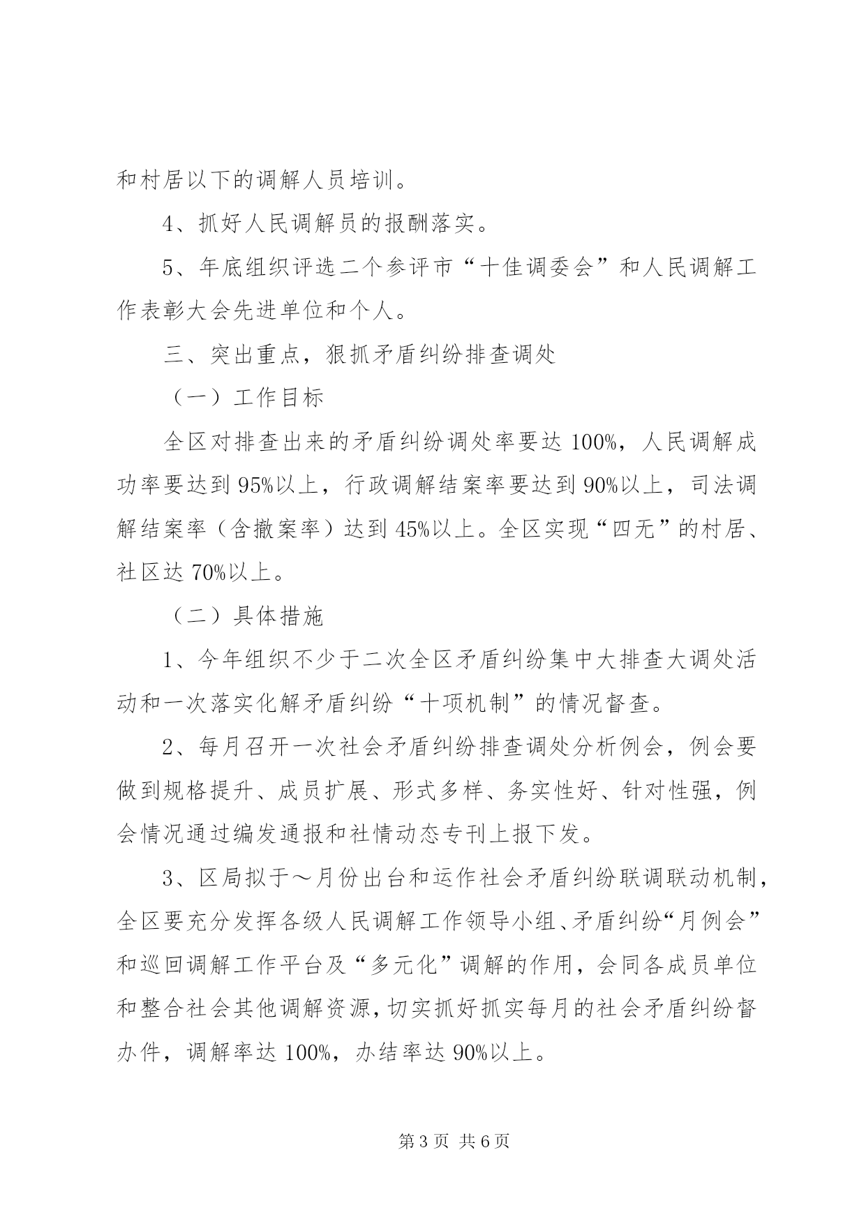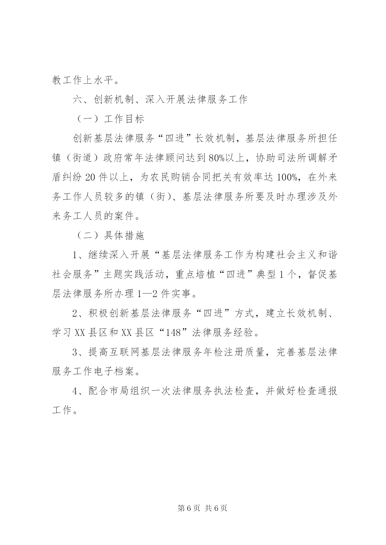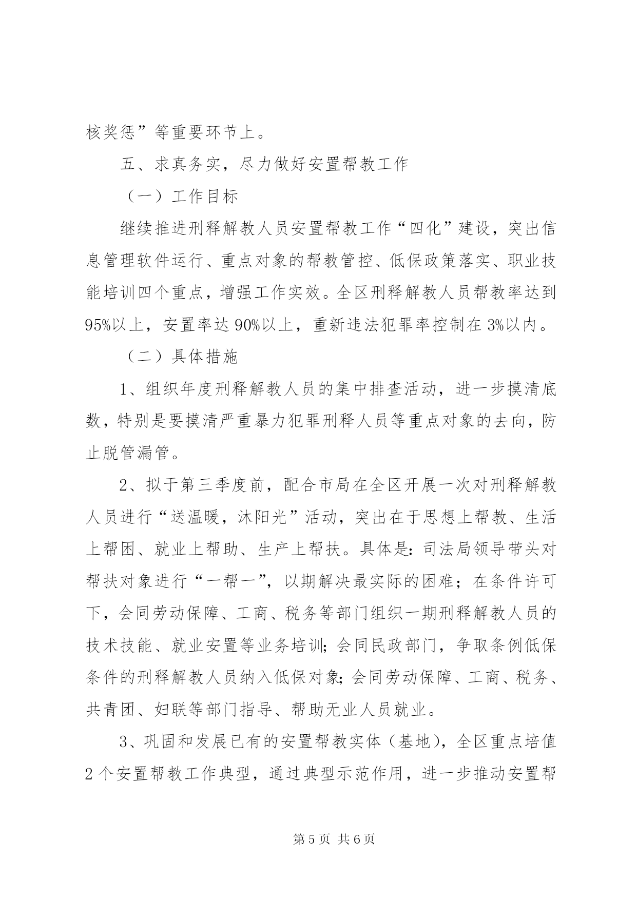 第PAGE\*Arabic\*MERGEFORMAT6页共NUMPAGES\*MERGEFORMAT6页市区基层司法工作思路年全区基层司法行政工作要以科学为发展观,高举中国特色社会主义伟大旗帜,贯彻落实党的十七大精神,按照司法部、省司法厅和市司法局的总体部署和工作要求,紧紧抓住发展机遇,坚持改革创新,大力加强基层司法行政队伍建设、组织建设、业务建设和基础设施建设,充分发挥职能作用,为区社会安定稳定,构建和谐社会,建设湄洲湾港口城市中心XX县区作出新的贡献。一、明确目标,全面推进镇(街道)司法所建设(一)工作目标按照“坚持建设、管理、工作并重,全面加强司法所建设和管理”的要求,年基层司法所建设要在“务实、务好、务强、抓弱”上下功夫。全区7个司法所30%以上的要配备副科级司法所所长;90%的有2间(或50㎡)的独立办公用房;由于我区今年有社区矫正任务,原则上要求司法所要达到3人以上;司法所装备建设全部达到“五个一”:即一部电话、一台电脑、一台打印机、一部摩托、一部数码相机。司法所业务经费列入财政预算;全区培育创建2个“十佳司法所”。(二)具体措施1、3月份在全市基层司法工作会议之后,传达贯彻全国、省厅、市局会议精神,研究部署全区司法所建设工作。2、继续抓好省委常委会《会议纪要》等3个文件的贯彻落实,上半年区组织一次检查,并配合市局组织一次督查。3、重点抓好二个规范化司法所建设,培育和创建二个“十佳司法所”,区局拟配合市局拿出一定的经费补助和鼓励基础比较好、工作做得实、领导重视的镇(街)一同抓好二个“十佳司法所”的创建工作,参加市上半年组织召开的现场会,推介司法所制度上墙、档案管理、工作做实的经验与做法,下半年工作展开,年底区局组织初评,并报市局参加评比。4、7月底前区局要组织全区调解员集中培训一次。二、夯实基础,继续进一步开展人民调解“十百千万”示范活动(一)工作目标“十百千万”人民调解示范活动,年内全区要确保完成第二批示范单位的创建、考评和命名工作;培育、创建二个“十佳调委会”。(二)具体措施1、加强人民调解工作指导,制定年人民调解“十百千万”示范示范活动实施方案并抓好落实。2、结合今年第二季度,省综治办、省高院和省司法厅联合召开全省人民调解工作会议之际,全区人民调解工作要突出抓好规范化建设和有效开展社会矛盾纠纷大排查大调处工作。3、加强培训工作。区局在7月份前抓好全区的直属、村居和村居以下的调解人员培训。4、抓好人民调解员的报酬落实。5、年底组织评选二个参评市“十佳调委会”和人民调解工作表彰大会先进单位和个人。三、突出重点,狠抓矛盾纠纷排查调处(一)工作目标全区对排查出来的矛盾纠纷调处率要达100%,人民调解成功率要达到95%以上,行政调解结案率要达到90%以上,司法调解结案率(含撤案率)达到45%以上。全区实现“四无”的村居、社区达70%以上。(二)具体措施1、今年组织不少于二次全区矛盾纠纷集中大排查大调处活动和一次落实化解矛盾纠纷“十项机制”的情况督查。2、每月召开一次社会矛盾纠纷排查调处分析例会,例会要做到规格提升、成员扩展、形式多样、务实性好、针对性强,例会情况通过编发通报和社情动态专刊上报下发。3、区局拟于~月份出台和运作社会矛盾纠纷联调联动机制,全区要充分发挥各级人民调解工作领导小组、矛盾纠纷“月例会”和巡回调解工作平台及“多元化”调解的作用,会同各成员单位和整合社会其他调解资源,切实抓好抓实每月的社会矛盾纠纷督办件,调解率达100%,办结率达90%以上。四、紧密协作,狠下功夫,全力抓好社区矫正试点工作(一)工作目标坚持“改革创新、以人为本、社会参与、维护稳定”的原则,开展全区的社区矫正工作,不断提高工作水平,确保矫正对象不漏管、不脱管,重新犯罪率控制在1%以内。及时总结工作经验,全面推广。(二)具体措施1、成立全区社区矫正试点工作领导机构,制定工作方案和规章制度,形成党委、政府统一领导,司法行政机关负责组织实施,法院、检察、公安等相关部门紧密配合、社会力量广泛参与的工作机制。明确工作分工、规范工作职责,确保社区矫正工作有人抓、有人管、有成效。2、按照社区矫正的工作流程做好社区矫正对象的衔接和教育矫正。拟于3月底前和市局一道专题研究社区矫正的规划和实施工作,并于3月15日前做好情况汇报和各种建章立制工作。5月前配合参加市局组织相关人员到省内或省外工作比较好的单位进行实地考察学习,取人之长、补己之短,确保该项工作顺利开展。3、年内社区矫正试点工作,要按照“依法规范、积极稳妥”的方针,试点工作的重力要下在“组织构建、制度建立、保障明确、排查摸底、交接清楚、矫正有效、档案健全、宣传到位、考核奖惩”等重要环节上。五、求真务实,尽力做好安置帮教工作(一)工作目标继续推进刑释解教人员安置帮教工作“四化