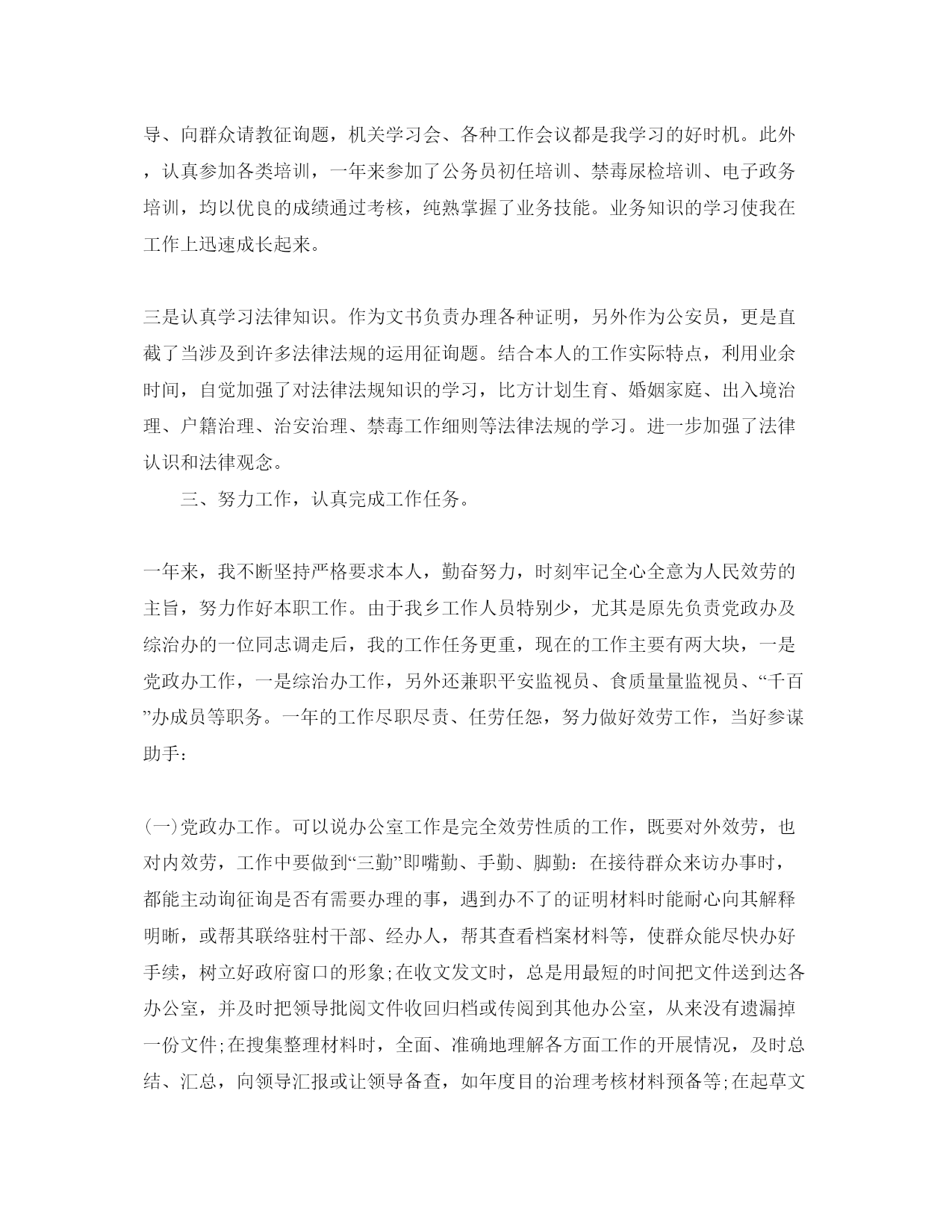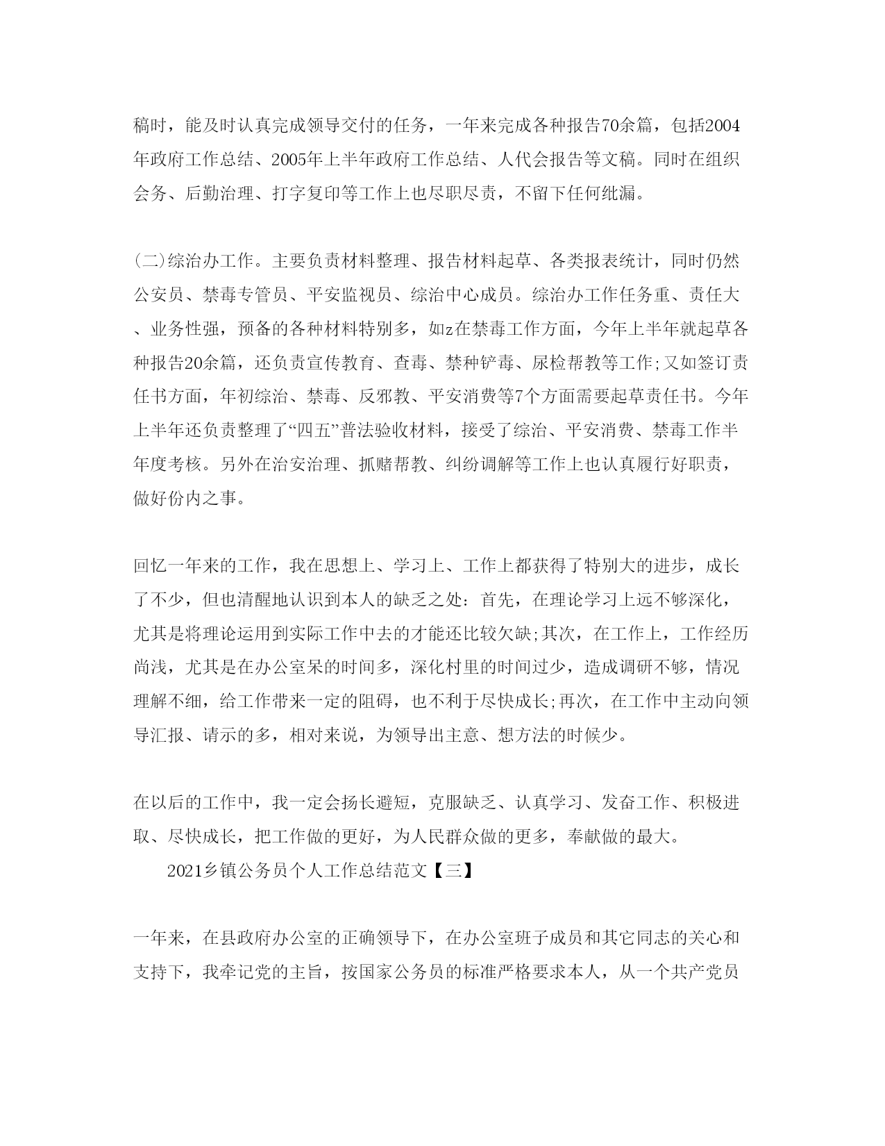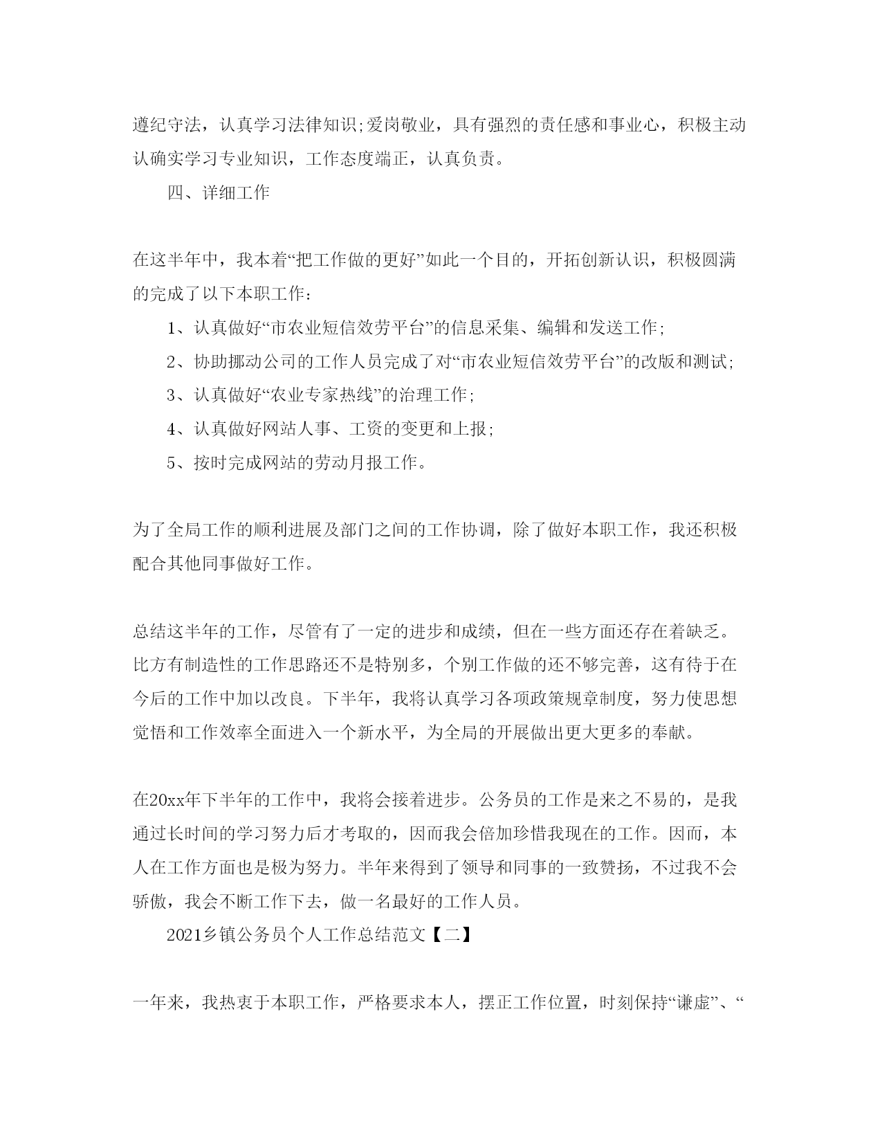 2021乡镇公务员个人工作参考总结范文2021乡镇公务员个人工作总结范文【一】自从我成为公务员已经有半年的时间了,在20xx年上半年,我开始了我的工作。尽管是我刚刚成为公务员,对本人的工作不是特别熟悉,不过在成为公务员之前,我已经工作几年了,因而对工作没有任何的陌生感。我在上半年的工作已经完毕了,总之回味起来确实是刚开始的时候不是特别适应,在通过一个月的工作后,我已经对本人的工作十分的内行了。半年的时间特别快过去了,在这半年中,我在局领导和同事们的关心与协助下圆满的完成了各项工作,在思想觉悟方面有了更进一步的提高。为今后获得更大的成绩,纠正缺乏,现将这半年的工作情况汇报如下:一、工作态度和勤奋敬业方面热爱本人的本职工作,可以正确认确实对待每一项工作,工作投入,热心为大家效劳,认真遵守劳动纪律,有效利用工作时间,坚守岗位,需要加班完成工作时加班加点,保证工作能按时完成。二、工作质量成绩、效益和奉献在开展工作之前做好个人工作计划,有主次的先后及时的完成各项工作,到达预期的效果,保质保量的完成工作;同时在工作中学习了特别多东西,也锻炼了本人。通过不懈的努力,使工作水平有了长足的进步,创始了工作的新场面,为全局及部门工作做出了应有的奉献。三、思想政治表现、品德素养修养及职业道德可以认真贯彻党的根本道路方针政策,通过报纸、杂志、书籍积极学习政治理论;遵纪守法,认真学习法律知识;爱岗敬业,具有强烈的责任感和事业心,积极主动认确实学习专业知识,工作态度端正,认真负责。四、详细工作在这半年中,我本着“把工作做的更好”如此一个目的,开拓创新认识,积极圆满的完成了以下本职工作:1、认真做好“市农业短信效劳平台”的信息采集、编辑和发送工作;2、协助挪动公司的工作人员完成了对“市农业短信效劳平台”的改版和测试;3、认真做好“农业专家热线”的治理工作;4、认真做好网站人事、工资的变更和上报;5、按时完成网站的劳动月报工作。为了全局工作的顺利进展及部门之间的工作协调,除了做好本职工作,我还积极配合其他同事做好工作。总结这半年的工作,尽管有了一定的进步和成绩,但在一些方面还存在着缺乏。比方有制造性的工作思路还不是特别多,个别工作做的还不够完善,这有待于在今后的工作中加以改良。下半年,我将认真学习各项政策规章制度,努力使思想觉悟和工作效率全面进入一个新水平,为全局的开展做出更大更多的奉献。在20xx年下半年的工作中,我将会接着进步。公务员的工作是来之不易的,是我通过长时间的学习努力后才考取的,因而我会倍加珍惜我现在的工作。因而,本人在工作方面也是极为努力。半年来得到了领导和同事的一致赞扬,不过我不会骄傲,我会不断工作下去,做一名最好的工作人员。2021乡镇公务员个人工作总结范文【二】一年来,我热衷于本职工作,严格要求本人,摆正工作位置,时刻保持“谦虚”、“慎重”、“律己”的态度,在领导的关心栽培和同事们的协助支持下,不断勤奋学习、积极进取,努力提高自我,不断勤奋工作,认真完成任务,履行好岗位职责,各方面表现优良,得到了领导和群众确实信。现将一年来的学习、工作情况简要总结如下:一、严于律己,自觉加强党性锻炼,政治思想觉悟得到提高。一年来,不断坚持运用马克思列宁主义的立场、观点和方法论,坚持正确的世界观、人生观、价值观,并用以指导本人的学习、工作和生活实践。热爱祖国、热爱党、热爱社会主义,坚决共产主义信念,与党组织保持高度一致。认真贯彻执行党的道路、方针、政策,工作积极主动,勤奋努力,不畏困难,尽职尽责,任劳任怨,在平凡的工作岗位上作出力所能及的奉献。二、强化理论和业务学习,不断提高本身综合素养。作为一名刚踏入社会的大学毕业生,我清醒地看到人生舞台已发生转变,本人又缺乏工作经历,因而只有不断加强学习,积累充实自我,才能锻炼好为人民效劳的本领。这一年来,不断坚持一边工作一边学习,不断提高了本身综合素养水平。一是认真学习“三个代表”重要思想,深化领会其科学,认真学习党的十六大报告及十六届三中、四中全会精神。尤其是在今年七月开始的第二批保持共产党员先进性教育活动中,认真系统地学习了党的根本知识和各种理论著作,进一步夯实了理论根底,提高了党性认识和思想道德素养。二是认真学习业务知识,不断保持谦虚好学的态度对待业务知识的学习。一年来,在指导老师潘乡长的带着下,走村入户,参加村民代表会议、座谈会等各种会议,到消费、建筑实地调查,学习了许多农村工作方法,更是直截了当与群众直截了当接触,真正做到深化到群众中去。平时,多看、多征询、多想,主动向领导、向群众请教征询题,机关学习会、各种工作会议都是我学习的好时机。此外,认真参加各类培训,一年来参加了公务员初任培训、禁毒尿检培训、电子政务培训,均以优良的成绩通过考核,纯熟掌握了业务