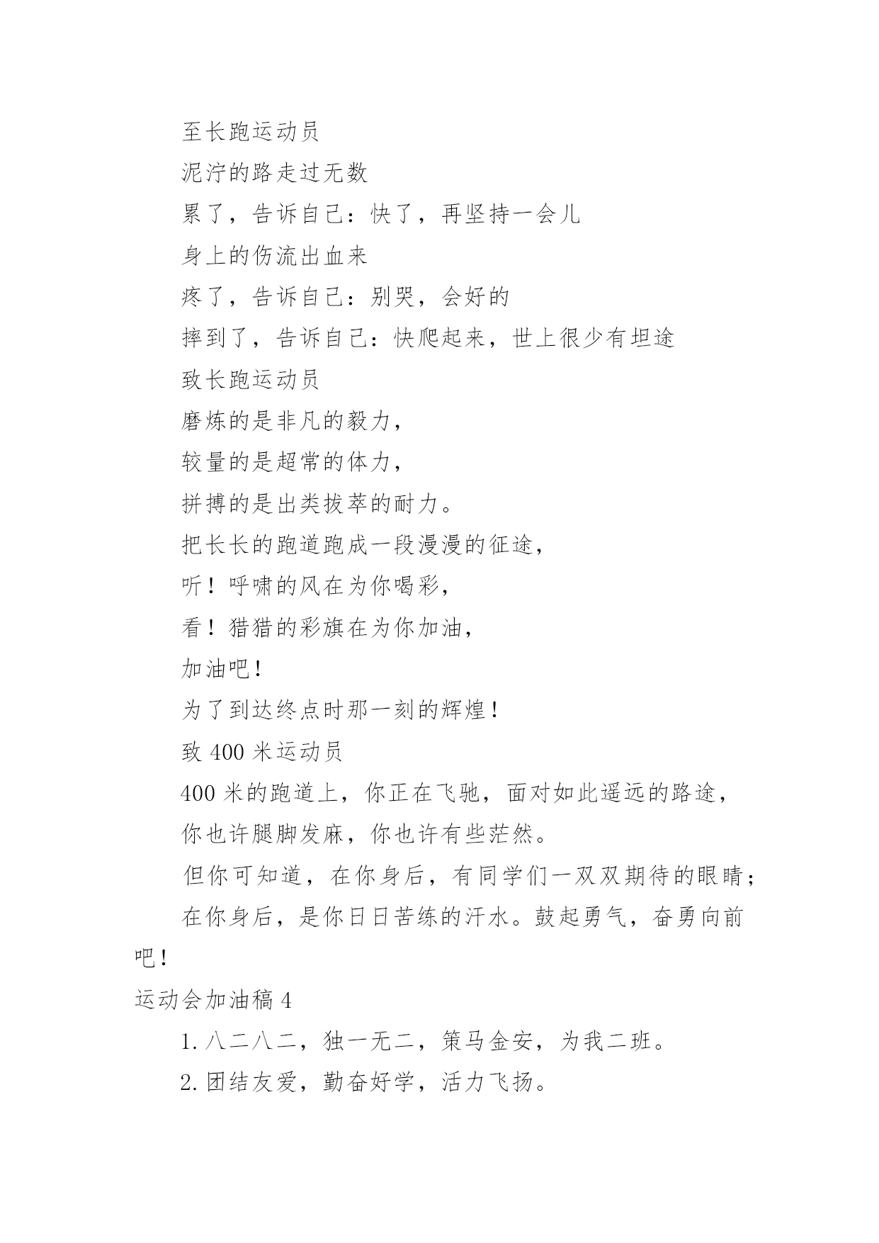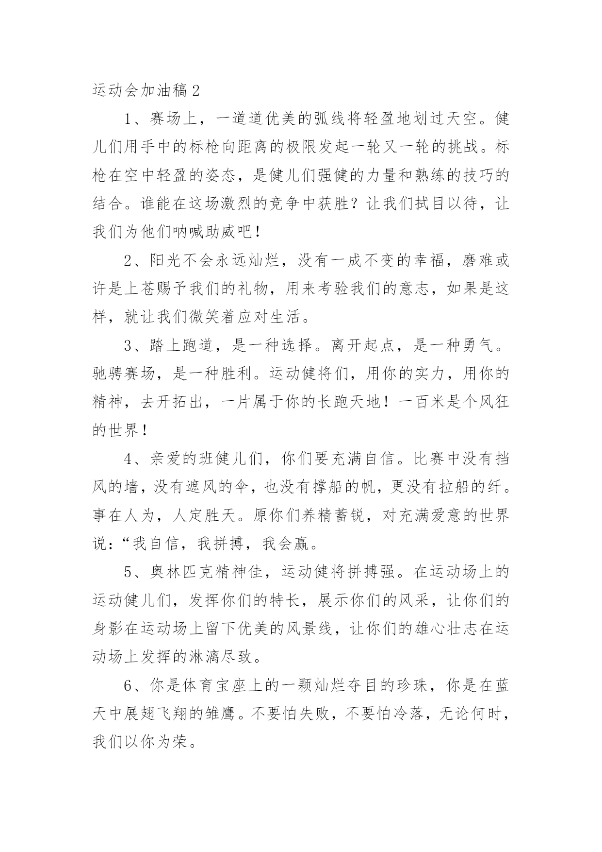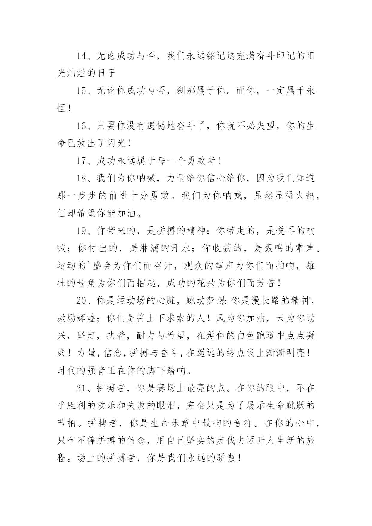 运动会加油稿运动会加油稿在日新月异的现代社会中,我们需要用到加油稿的情形越来越多,加油稿可以增添对方必胜的勇气和信心。你知道加油稿怎样写才规范吗?下面是小编收集整理的运动会加油稿,希望对大家有所帮助。运动会加油稿11、不为掌声的诠释、不为刻意的征服、只有辛勤的汗水化作追求的脚步、心中坚定的信念、脚下沉稳的步伐、你用行动诉说着一个不变的真理、没有比脚更长的路、没有比人更高的山、希望在终点向你招手、努力吧用你坚韧不拔的毅志、去迎接终点的鲜花与掌声、相信成功属于你们。2、深深的呼吸,等待你的是艰难的米。相信胜利会属于你们。但在这征途上,需要你勇敢的心去面对。我们在为你加油,你是否听到了我们发自心中的呐喊?困难和胜利都在向你招手,去呀,快去呀,不要犹豫。快去击败困难、快去夺取胜利!相信你会送给我们一个汗水浸湿的微笑!3、这是意志的拼搏,这是速度的挑战,胜利在向你们招手,胜利在向你们呼唤!4、踏上跑道,是一种选择。离开起点,是一种勇气。驰骋赛场,是一种胜利。5、看,终点就在眼前;听,同学为你呼喊。鼓起勇气奋力向前,用你的荣誉带给我们希望。6、运动健将们,用你的实力,用你的精神,去开拓出,一片属于你的长跑天地!7、不为掌声的注释,不为刻意的征服,不为失败的痛苦,只有辛勤的汗水,化作成功的脚步!8、不为鲜花的围绕,不为刹那的荣耀,只有执着的信念,化作不停的奔跑,心中燃烧着梦想,脚下不停的步伐!9、你用行动述说着过程的重要,没有无尽的终点,没有无法攀登的险峰,希望载着终点在向你微笑,拼搏吧!经历是一种精彩,迸发你全部的能量,成功是你汗水的写照。10、你们挥舞着充满力量的双臂,看着实心球化成美丽的弧线,我着实在心里佩服你们,你们抛出了自己的最佳水平。11、环形的跑道一圈又一圈的坚持,毅力与精神活跃在会场上,湿透的衣衫,满头的大汗,无限追求、奋力追赶,我们为你欢呼跳跃,我们为你骄傲。12、朋友,在你走上跑道那一刻,告诉自己,无论成功与否,微笑着跑完全程,只要年轻的心还在不停地跳动,就要大声告诉自己——我无所畏惧。13、亲爱的运动健儿们,加油吧!洒一把艰辛的汗水,继续抬起疲倦的脚步,爆发的一吼气贯长虹,继续向前,不论成功与否,你已曾经拥有。曾记否,在终点欢呼,震惊四周。14、无论成功与否,我们永远铭记这充满奋斗印记的阳光灿烂的日子15、无论你成功与否,刹那属于你。而你,一定属于永恒!16、只要你没有遗憾地奋斗了,你就不必失望,你的生命已放出了闪光!17、成功永远属于每一个勇敢者!18、我们为你呐喊,力量给你信心给你,因为我们知道那一步步的前进十分勇敢。我们为你呐喊,虽然显得火热,但却希望你能加油。19、你带来的,是拼搏的精神;你带走的,是悦耳的呐喊;你付出的,是淋漓的汗水;你收获的,是轰鸣的掌声。运动的`盛会为你们而召开,观众的掌声为你们而拍响,雄壮的号角为你们而擂起,成功的花朵为你们而芳香!20、你是运动场的心脏,跳动梦想;你是漫长路的精神,激励辉煌;你们是将上下求索的人!风为你加油,云为你助兴,坚定,执着,耐力与希望,在延伸的白色跑道中点点凝聚!力量,信念,拼搏与奋斗,在遥远的终点线上渐渐明亮!时代的强音正在你的脚下踏响。21、拼搏者,你是赛场上最亮的点。在你的眼中,不在乎胜利的欢乐和失败的眼泪,完全只是为了展示生命跳跃的节拍。拼搏者,你是生命乐章中最响的音符。在你的心中,只有不停拼搏的信念,用自己坚实的步伐去迈开人生新的旅程。场上的拼搏者,你是我们永远的骄傲!运动会加油稿21、赛场上,一道道优美的弧线将轻盈地划过天空。健儿们用手中的标枪向距离的极限发起一轮又一轮的挑战。标枪在空中轻盈的姿态,是健儿们强健的力量和熟练的技巧的结合。谁能在这场激烈的竞争中获胜?让我们拭目以待,让我们为他们呐喊助威吧!2、阳光不会永远灿烂,没有一成不变的幸福,磨难或许是上苍赐予我们的礼物,用来考验我们的意志,如果是这样,就让我们微笑着应对生活。3、踏上跑道,是一种选择。离开起点,是一种勇气。驰骋赛场,是一种胜利。运动健将们,用你的实力,用你的精神,去开拓出,一片属于你的长跑天地!一百米是个风狂的世界!4、亲爱的班健儿们,你们要充满自信。比赛中没有挡风的墙,没有遮风的伞,也没有撑船的帆,更没有拉船的纤。事在人为,人定胜天。原你们养精蓄锐,对充满爱意的世界说:“我自信,我拼搏,我会赢。5、奥林匹克精神佳,运动健将拼搏强。在运动场上的运动健儿们,发挥你们的特长,展示你们的风采,让你们的身影在运动场上留下优美的风景线,让你们的雄心壮志在运动场上发挥的淋漓尽致。6、你是体育宝座上的一颗灿烂夺目的珍珠,你是在蓝天中展翅飞翔的雏鹰。不要怕失败,不要怕冷落,无论何时,我们以你为荣。7、青春是不老的誓言,飞扬是年轻的梦想,金色的十月,让我们在这长长的跑道上青春飞扬,现出飒爽的风姿