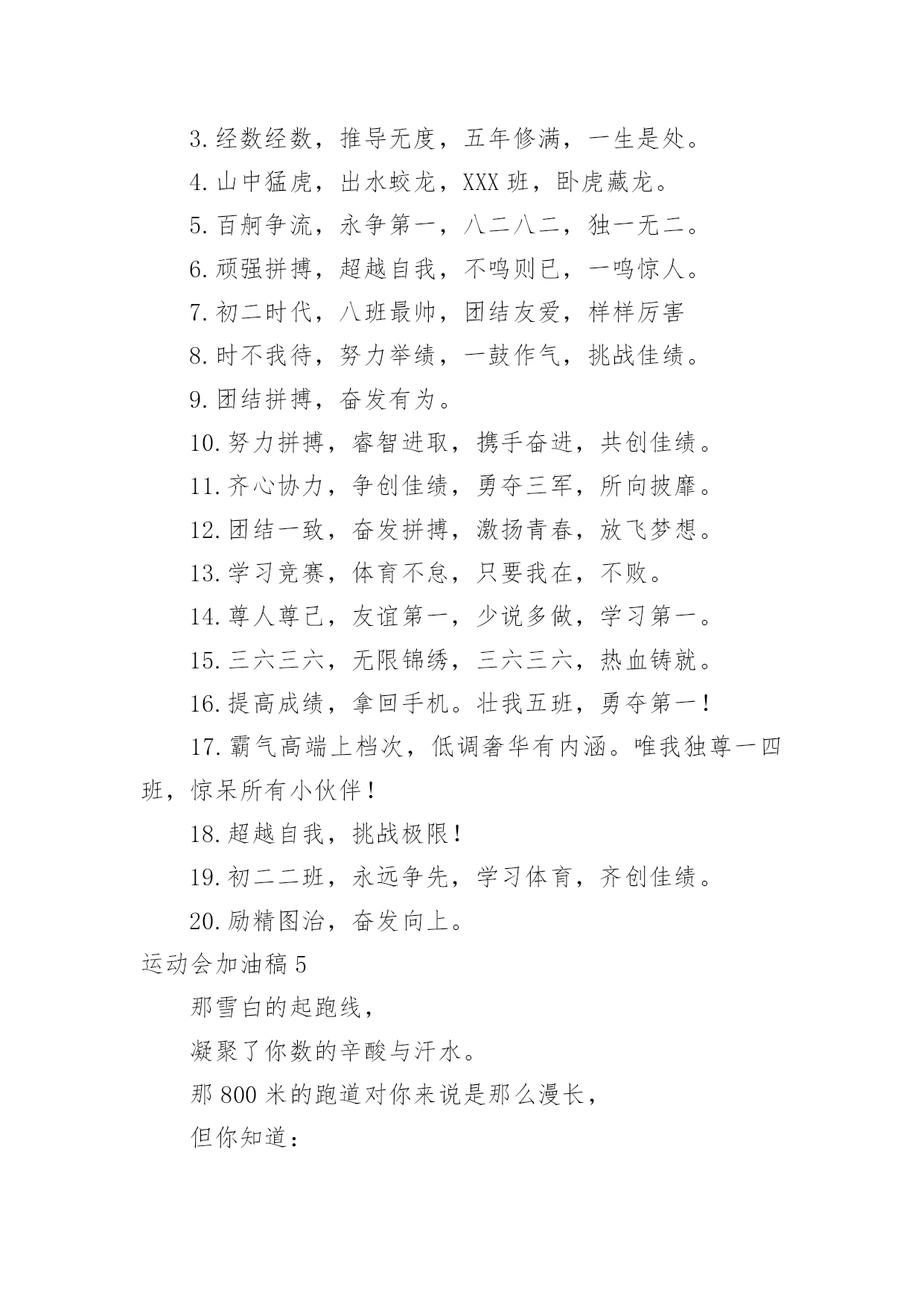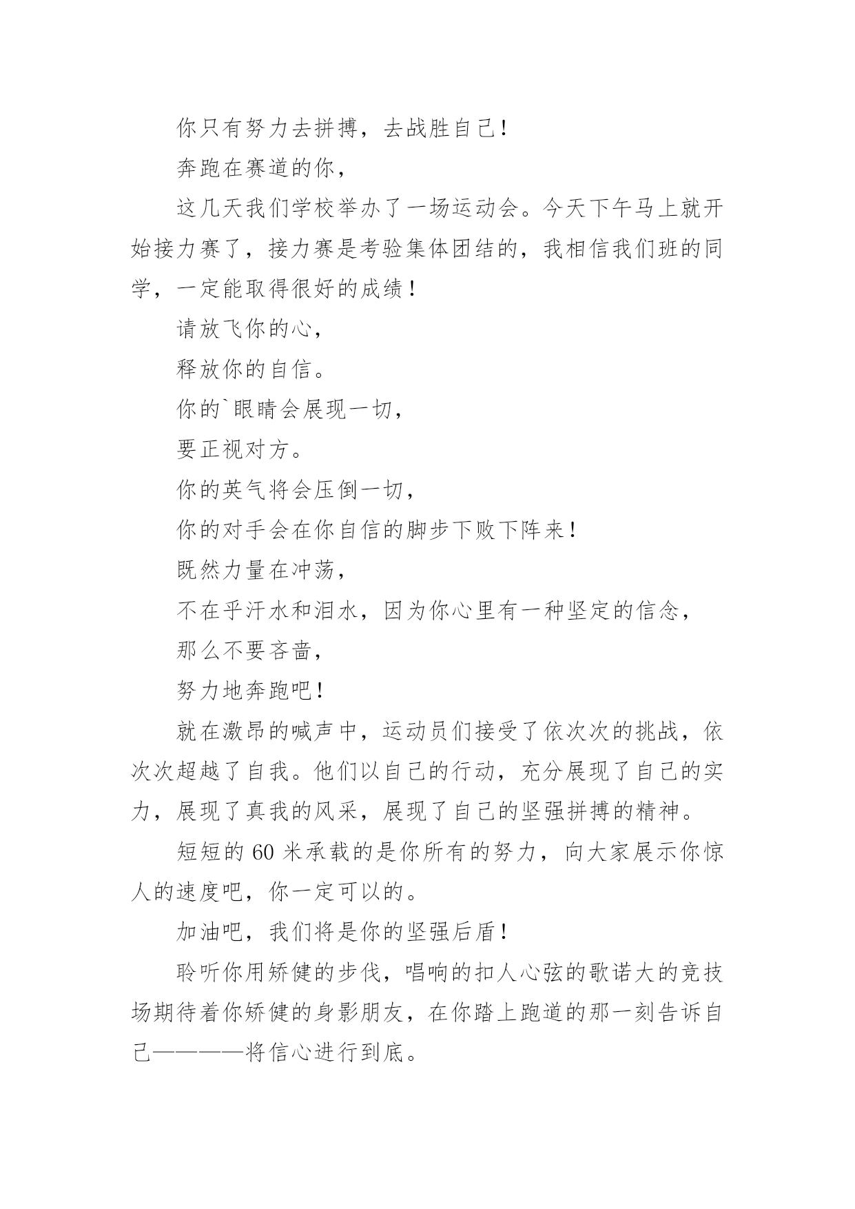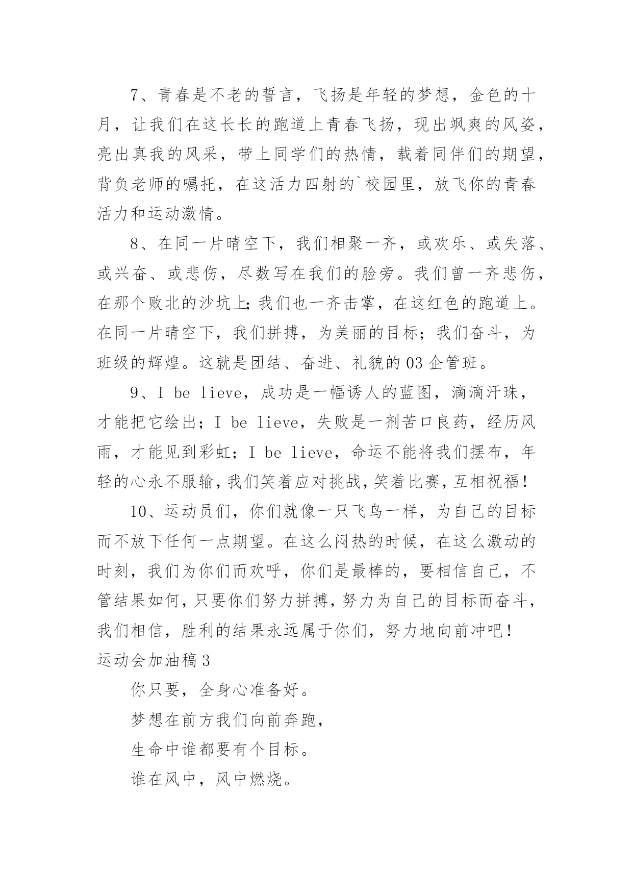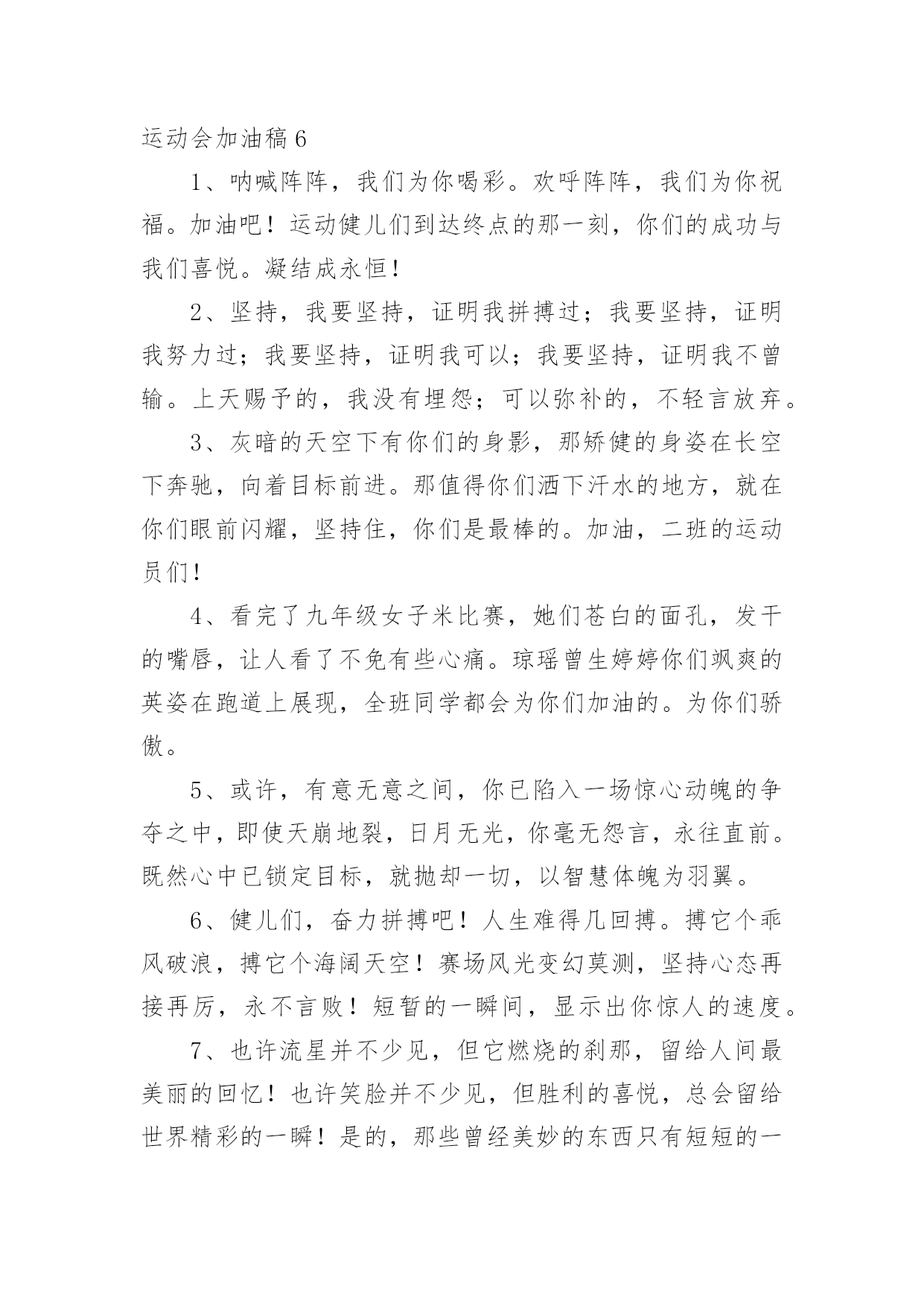 运动会加油稿运动会加油稿在日新月异的现代社会中,我们需要用到加油稿的情形越来越多,加油稿可以增添对方必胜的勇气和信心。你知道加油稿怎样写才规范吗?下面是小编收集整理的运动会加油稿,希望对大家有所帮助。运动会加油稿11、不为掌声的诠释、不为刻意的征服、只有辛勤的汗水化作追求的脚步、心中坚定的信念、脚下沉稳的步伐、你用行动诉说着一个不变的真理、没有比脚更长的路、没有比人更高的山、希望在终点向你招手、努力吧用你坚韧不拔的毅志、去迎接终点的鲜花与掌声、相信成功属于你们。2、深深的呼吸,等待你的是艰难的米。相信胜利会属于你们。但在这征途上,需要你勇敢的心去面对。我们在为你加油,你是否听到了我们发自心中的呐喊?困难和胜利都在向你招手,去呀,快去呀,不要犹豫。快去击败困难、快去夺取胜利!相信你会送给我们一个汗水浸湿的微笑!3、这是意志的拼搏,这是速度的挑战,胜利在向你们招手,胜利在向你们呼唤!4、踏上跑道,是一种选择。离开起点,是一种勇气。驰骋赛场,是一种胜利。5、看,终点就在眼前;听,同学为你呼喊。鼓起勇气奋力向前,用你的荣誉带给我们希望。6、运动健将们,用你的实力,用你的精神,去开拓出,一片属于你的长跑天地!7、不为掌声的注释,不为刻意的征服,不为失败的痛苦,只有辛勤的汗水,化作成功的脚步!8、不为鲜花的围绕,不为刹那的荣耀,只有执着的信念,化作不停的奔跑,心中燃烧着梦想,脚下不停的步伐!9、你用行动述说着过程的重要,没有无尽的终点,没有无法攀登的险峰,希望载着终点在向你微笑,拼搏吧!经历是一种精彩,迸发你全部的能量,成功是你汗水的写照。10、你们挥舞着充满力量的双臂,看着实心球化成美丽的弧线,我着实在心里佩服你们,你们抛出了自己的最佳水平。11、环形的跑道一圈又一圈的坚持,毅力与精神活跃在会场上,湿透的衣衫,满头的大汗,无限追求、奋力追赶,我们为你欢呼跳跃,我们为你骄傲。12、朋友,在你走上跑道那一刻,告诉自己,无论成功与否,微笑着跑完全程,只要年轻的心还在不停地跳动,就要大声告诉自己——我无所畏惧。13、亲爱的运动健儿们,加油吧!洒一把艰辛的汗水,继续抬起疲倦的脚步,爆发的一吼气贯长虹,继续向前,不论成功与否,你已曾经拥有。曾记否,在终点欢呼,震惊四周。14、无论成功与否,我们永远铭记这充满奋斗印记的阳光灿烂的日子15、无论你成功与否,刹那属于你。而你,一定属于永恒!16、只要你没有遗憾地奋斗了,你就不必失望,你的生命已放出了闪光!17、成功永远属于每一个勇敢者!18、我们为你呐喊,力量给你信心给你,因为我们知道那一步步的前进十分勇敢。我们为你呐喊,虽然显得火热,但却希望你能加油。19、你带来的,是拼搏的精神;你带走的,是悦耳的呐喊;你付出的,是淋漓的汗水;你收获的,是轰鸣的掌声。运动的`盛会为你们而召开,观众的掌声为你们而拍响,雄壮的号角为你们而擂起,成功的花朵为你们而芳香!20、你是运动场的心脏,跳动梦想;你是漫长路的精神,激励辉煌;你们是将上下求索的人!风为你加油,云为你助兴,坚定,执着,耐力与希望,在延伸的白色跑道中点点凝聚!力量,信念,拼搏与奋斗,在遥远的终点线上渐渐明亮!时代的强音正在你的脚下踏响。21、拼搏者,你是赛场上最亮的点。在你的眼中,不在乎胜利的欢乐和失败的眼泪,完全只是为了展示生命跳跃的节拍。拼搏者,你是生命乐章中最响的音符。在你的心中,只有不停拼搏的信念,用自己坚实的步伐去迈开人生新的旅程。场上的拼搏者,你是我们永远的骄傲!运动会加油稿21、赛场上,一道道优美的弧线将轻盈地划过天空。健儿们用手中的标枪向距离的极限发起一轮又一轮的挑战。标枪在空中轻盈的姿态,是健儿们强健的力量和熟练的技巧的结合。谁能在这场激烈的竞争中获胜?让我们拭目以待,让我们为他们呐喊助威吧!2、阳光不会永远灿烂,没有一成不变的幸福,磨难或许是上苍赐予我们的礼物,用来考验我们的意志,如果是这样,就让我们微笑着应对生活。3、踏上跑道,是一种选择。离开起点,是一种勇气。驰骋赛场,是一种胜利。运动健将们,用你的实力,用你的精神,去开拓出,一片属于你的长跑天地!一百米是个风狂的世界!4、亲爱的班健儿们,你们要充满自信。比赛中没有挡风的墙,没有遮风的伞,也没有撑船的帆,更没有拉船的纤。事在人为,人定胜天。原你们养精蓄锐,对充满爱意的世界说:“我自信,我拼搏,我会赢。5、奥林匹克精神佳,运动健将拼搏强。在运动场上的运动健儿们,发挥你们的特长,展示你们的风采,让你们的身影在运动场上留下优美的风景线,让你们的雄心壮志在运动场上发挥的淋漓尽致。6、你是体育宝座上的一颗灿烂夺目的珍珠,你是在蓝天中展翅飞翔的雏鹰。不要怕失败,不要怕冷落,无论何时,我们以你为荣。7、青春是不老的誓言,飞扬是年轻的梦想,金色的十月,让我们在这长长的跑道上青春飞扬,现出飒爽的风姿