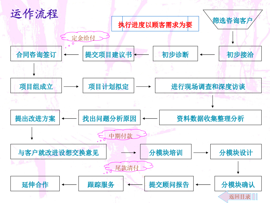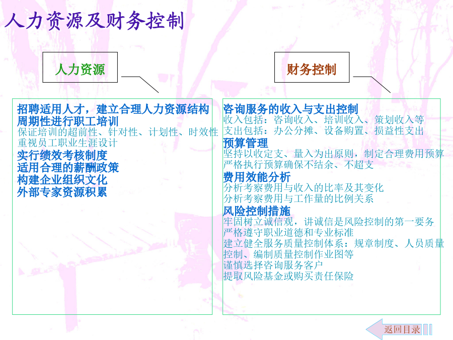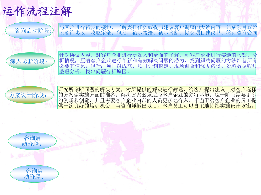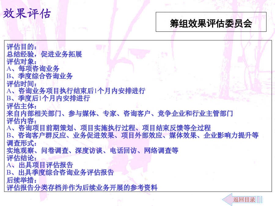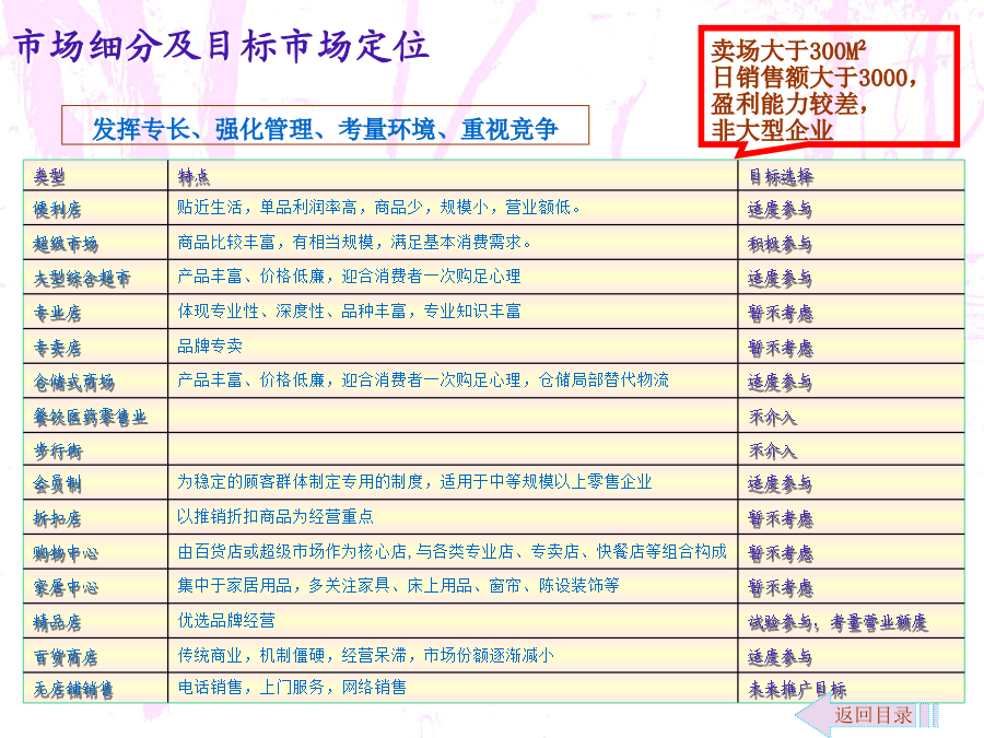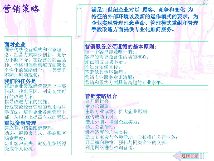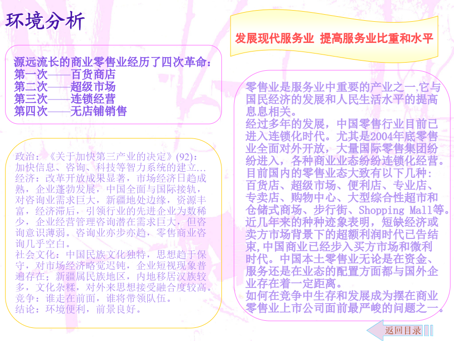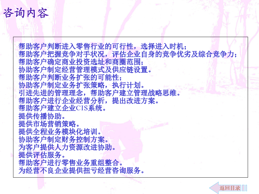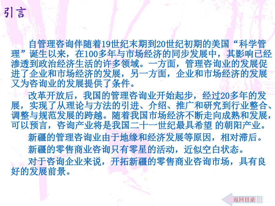 零售商业咨询介入拓展文案自管理咨询伴随着19世纪末期到20世纪初期的美国“科学管理”诞生以来,在100多年与市场经济的同步发展中,其影响已经渗透到政治经济生活的许多领域。一方面,管理咨询业的发展促进了企业和市场经济的发展,另一方面,企业和市场经济的发展又为咨询业的发展提供了条件。改革开放后,我国的管理咨询业开始起步,经过20多年的发展,实现了从理论与方法的引进、介绍、推广和研究到行业整合、调整与规范发展的跨越。随着我国市场经济不断走向成熟和发展,可以预言,咨询产业将是我国二十一世纪最具希望的朝阳产业。新疆的管理咨询业由于地缘和经济发展等原因,相对滞后。新疆的零售商业咨询只有零星的活动,近似空白状态。对于咨询企业来说,开拓新疆的零售商业咨询市场,具有良好的发展前景。环境分析市场细分及目标市场定位营销策略咨询内容运作流程运作流程注解人力资源及财务控制效果评估咨询收费参考说明