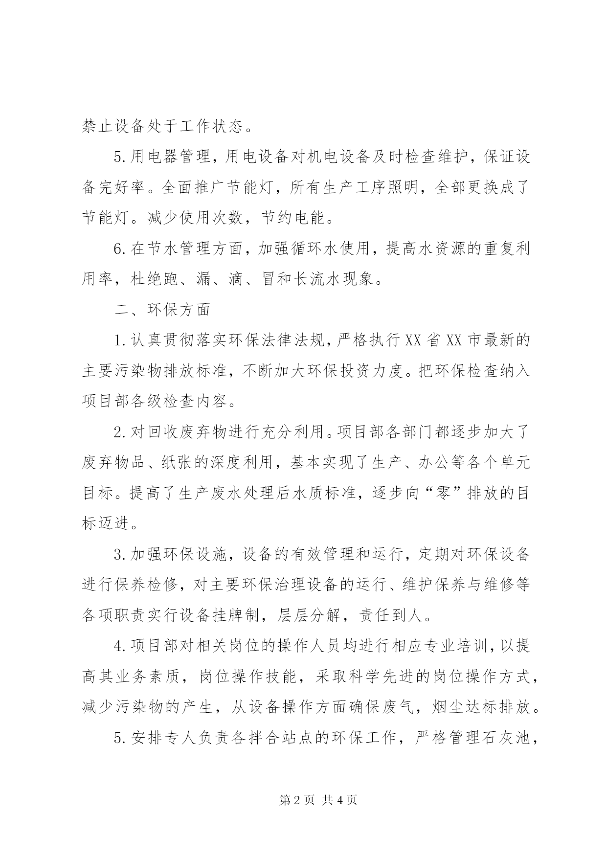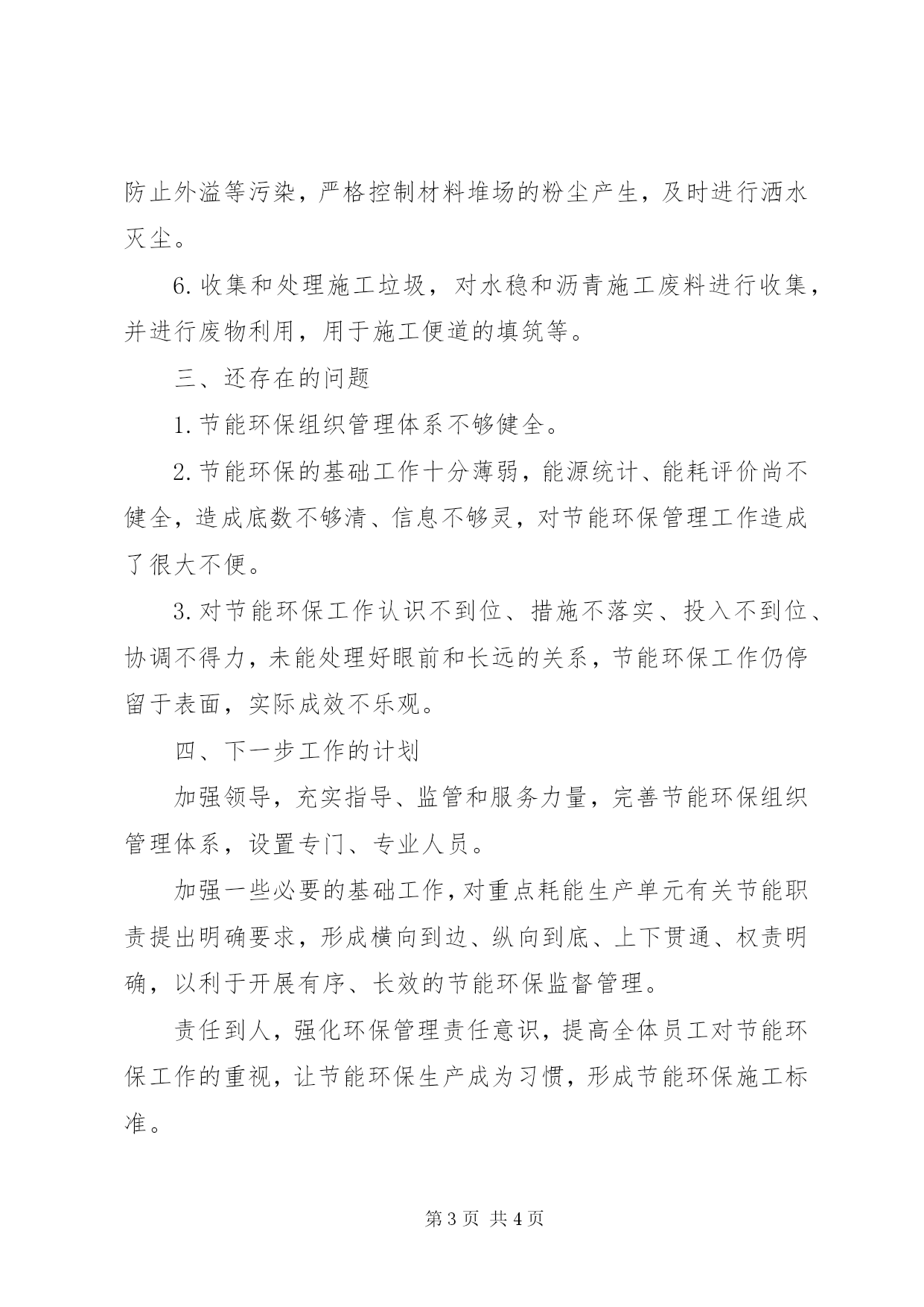 第PAGE\*Arabic\*MERGEFORMAT4页共NUMPAGES\*MERGEFORMAT4页第三批节能环保2015年第三季度节能环保工作总结本季度的节能环保工作在公司和项目领导的正确领导下,通过全体职工的共同参与和努力,全面实现了节能环保的预期目标,进一步促进了项目科学、可持续、和谐发展,强化了全体职工的节能环保意识。项目部设置了相应的节能领导小组,基本做到了节能环保管理工作制度化、规范化、系统化。在宣传节能环保知识的同时对项目的节能环保工作进行监督检查,并取得了显著成效。现将具体工作总结如下:一、节能减排方面1.减少照明设备电耗,办公场所内自然光度足够时。不得开灯,按需求开启照明灯时,做到人走灯灭,杜绝长明灯、白昼灯。楼梯、走廊、卫生间等公共场所的照明,降低瓦数。2.倡导每天少开1小时空调,节假日或少数人加班时不开空调;并严格执行空调运行规定,夏季环境温度低于28℃时停止使用空调。办公场所夏季空调温度设置不低于26摄氏度,无人时不开空调,开空调时应关闭好门窗。3.计算机、打印机、复印机等办公设备设置为不使用时自动进入低能耗休眠状态,长时间不使用时要及时关闭,以减少待机消耗,下班前关闭电源开关。4.施工过程中,必须做到息工后,切断电源,停止设备运行,禁止设备处于工作状态。5.用电器管理,用电设备对机电设备及时检查维护,保证设备完好率。全面推广节能灯,所有生产工序照明,全部更换成了节能灯。减少使用次数,节约电能。6.在节水管理方面,加强循环水使用,提高水资源的重复利用率,杜绝跑、漏、滴、冒和长流水现象。二、环保方面1.认真贯彻落实环保法律法规,严格执行XX省XX市最新的主要污染物排放标准,不断加大环保投资力度。把环保检查纳入项目部各级检查内容。2.对回收废弃物进行充分利用。项目部各部门都逐步加大了废弃物品、纸张的深度利用,基本实现了生产、办公等各个单元目标。提高了生产废水处理后水质标准,逐步向“零”排放的目标迈进。3.加强环保设施,设备的有效管理和运行,定期对环保设备进行保养检修,对主要环保治理设备的运行、维护保养与维修等各项职责实行设备挂牌制,层层分解,责任到人。4.项目部对相关岗位的操作人员均进行相应专业培训,以提高其业务素质,岗位操作技能,采取科学先进的岗位操作方式,减少污染物的产生,从设备操作方面确保废气,烟尘达标排放。5.安排专人负责各拌合站点的环保工作,严格管理石灰池,防止外溢等污染,严格控制材料堆场的粉尘产生,及时进行洒水灭尘。6.收集和处理施工垃圾,对水稳和沥青施工废料进行收集,并进行废物利用,用于施工便道的填筑等。三、还存在的问题1.节能环保组织管理体系不够健全。2.节能环保的基础工作十分薄弱,能源统计、能耗评价尚不健全,造成底数不够清、信息不够灵,对节能环保管理工作造成了很大不便。3.对节能环保工作认识不到位、措施不落实、投入不到位、协调不得力,未能处理好眼前和长远的关系,节能环保工作仍停留于表面,实际成效不乐观。四、下一步工作的计划加强领导,充实指导、监管和服务力量,完善节能环保组织管理体系,设置专门、专业人员。加强一些必要的基础工作,对重点耗能生产单元有关节能职责提出明确要求,形成横向到边、纵向到底、上下贯通、权责明确,以利于开展有序、长效的节能环保监督管理。责任到人,强化环保管理责任意识,提高全体员工对节能环保工作的重视,让节能环保生产成为习惯,形成节能环保施工标准。。。。。。。项目部2015年9月30日