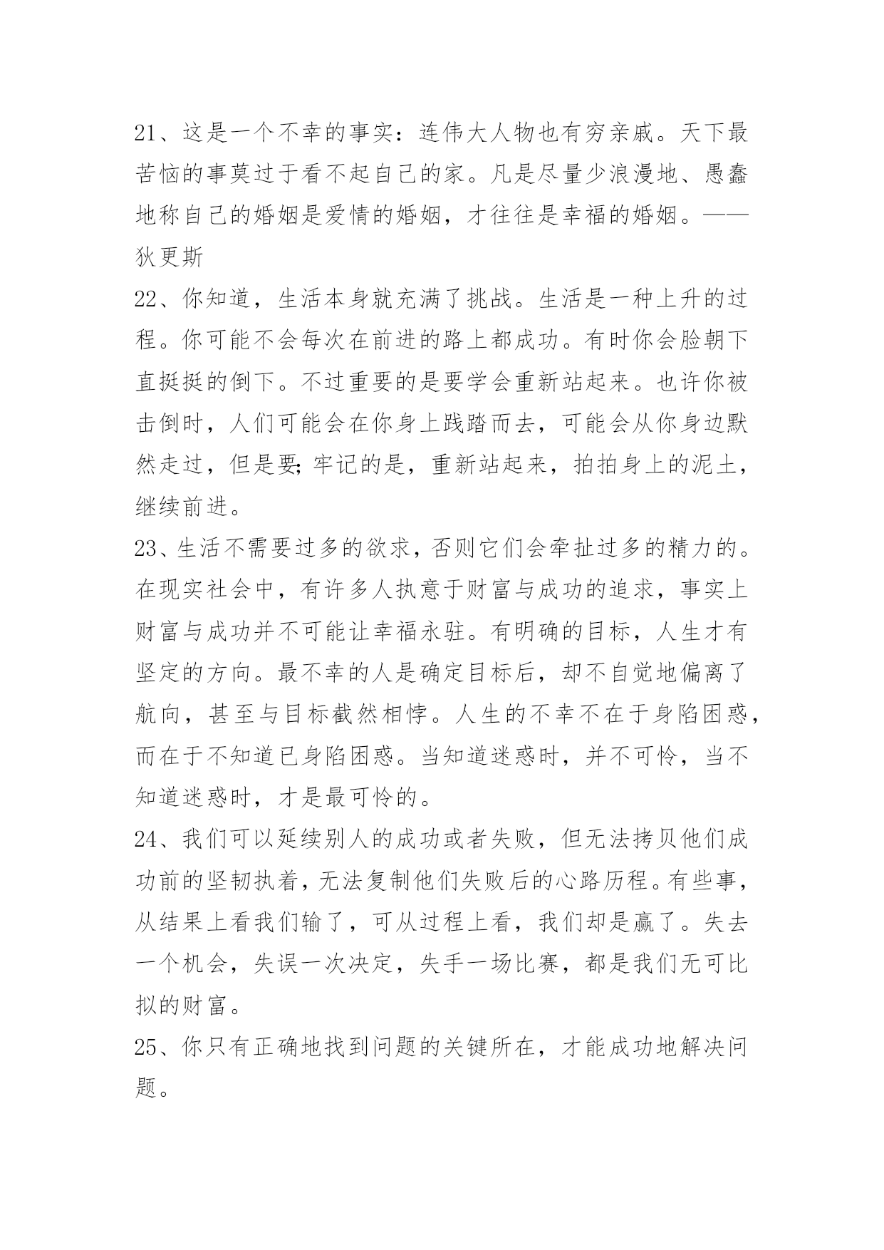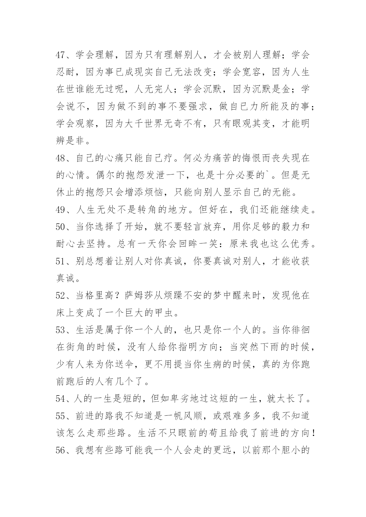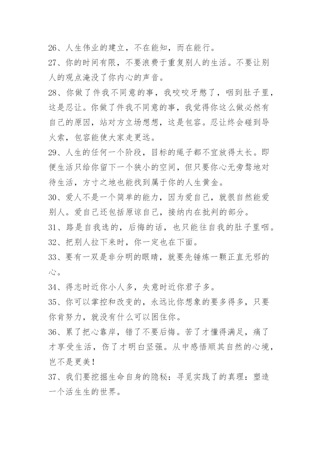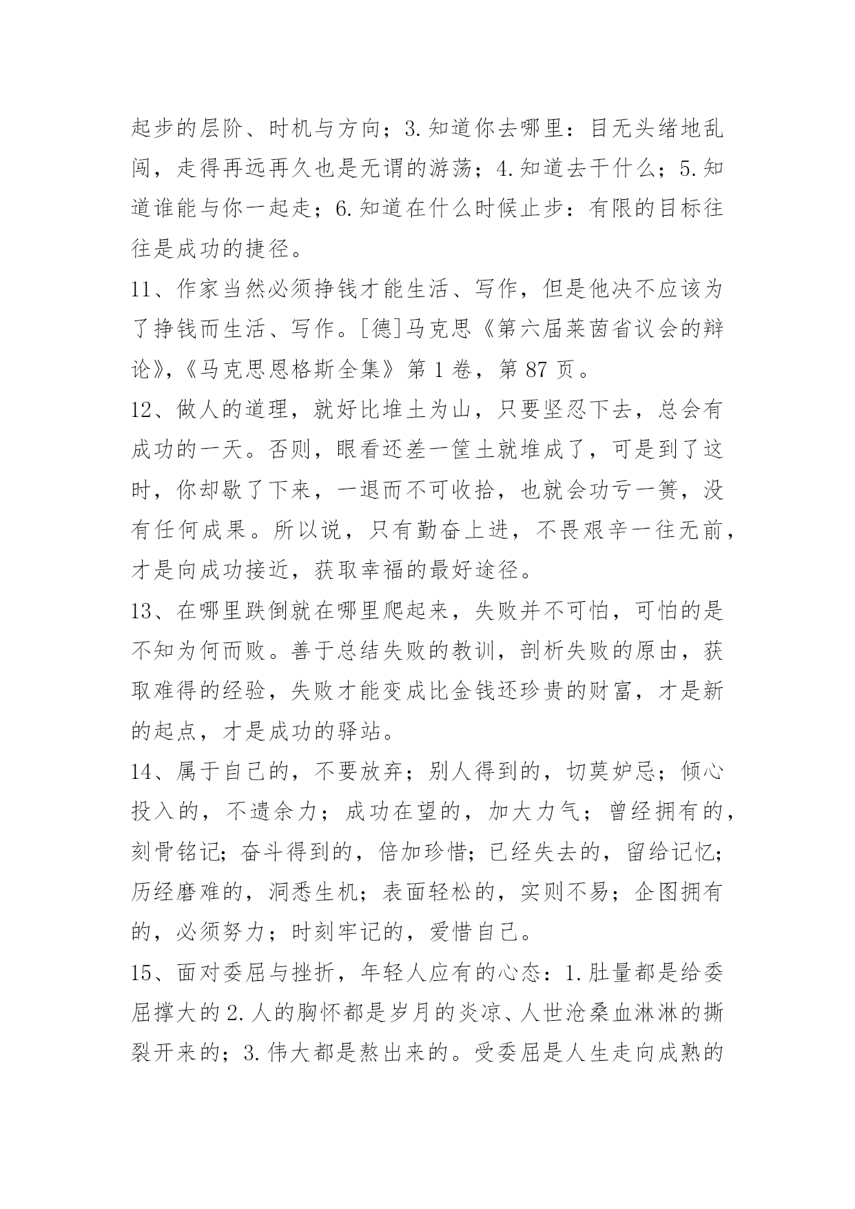 工作励志语录86条【实用】工作励志语录锦集86条这世上没有陌生人,只有我们还未曾认识的朋友。下面是小编为大家推荐的工作励志语录86条,欢迎阅读。1、在我们的心灵深处,爱和孤独其实是同一种情感,它们如影随形,不可分离。我们越是感觉孤独,便越是怀有强烈的爱的渴望。一个人对孤独的体验与他对爱的体验是成正比的,孤独的深度决定了爱的容量。孤独和爱是互为联系的,孤独是爱寻求接受而不可得,而爱则是对他人之孤独的发现和抚慰。2、你必须提醒你自己:别人眼中的成功不一定使你快乐,你可以尝试成功与快乐的滋味——并且,你还必须设定你的成功标准。它必须是你自我心像(一个人对他自己的心像就是他透视自己的态度)之中的一种成功——否则便是一种失败。3、当努力与力量积蓄够了时,就会爆发,爆发出惊人的成功。成功的重要性,来自于努力的程度与积蓄的力量的多少。付出的努力越多,成功则越惊人。4、勤奋的态度与主动积极的精神,再加上有眼力,应该成为一种良好生活的习惯,这种良好的生活习惯可以使我们为自己创造出更多成功的机会。5、把握机会,追逐自己心的梦想,屡败屡战,直到成功;勇于牺牲,勇于走出舒适的避风港,一次次搏击人生;满载勇气与激情,直视你的恐惧,坚守自己的梦想,并努力把它付诸现实。6、聪明的孩子都有个性,而你的个性尤其突出,要是你认准的事情十头牛也拉不回来。这种不撞南墙不罢休的执拗,用到正路上也许就是成功的基础,而一旦用错地方,非常容易滑向深渊。所以,女儿你一定要看准脚下的路,一步一个脚印地直着往前走。7、孩子是坠落在人间的小天使。孩子们的世界,是人间最纯洁的天堂。透过他们的眼睛看世界,我们禁不住会对生命的来源抱有崇敬之意。因为他们的存在,凡俗的世界里才会保持着神圣的光辉。孩子是我们连接神灵与世俗的最佳纽带。8、善于变通之人常赢。无之为用,为用须先机变;无以为赢,善于变通才能赢。善于变通之人,只需一个好思路,就能开辟一条出路;只需一个转变,就能看到别样的明丽风景;只需灵活一点,就能进退无碍;只需摒弃一分固守,就能获得一次新生;只需机变为用,就能赢得天下。变,是成功永不褪色的法宝。9、应该让孩子知道,如果他们犯了什么错误,责任就要由他们自己拿出勇气来承担。这样,他长大了,便会慢慢懂得他与这个世界的关系,他的责任是什么。同时,我们也尽到了为人父母的责任,尽到了教育的责任。10、口袋生涯[人生的六个关键定位]1.知道你是谁:最了解你的人是你自己;2.知道你所处的方位:把握方位才能掌握起步的层阶、时机与方向;3.知道你去哪里:目无头绪地乱闯,走得再远再久也是无谓的游荡;4.知道去干什么;5.知道谁能与你一起走;6.知道在什么时候止步:有限的目标往往是成功的捷径。11、作家当然必须挣钱才能生活、写作,但是他决不应该为了挣钱而生活、写作。[德]马克思《第六届莱茵省议会的辩论》,《马克思恩格斯全集》第1卷,。12、做人的道理,就好比堆土为山,只要坚忍下去,总会有成功的一天。否则,眼看还差一筐土就堆成了,可是到了这时,你却歇了下来,一退而不可收拾,也就会功亏一篑,没有任何成果。所以说,只有勤奋上进,不畏艰辛一往无前,才是向成功接近,获取幸福的最好途径。13、在哪里跌倒就在哪里爬起来,失败并不可怕,可怕的是不知为何而败。善于总结失败的教训,剖析失败的原由,获取难得的经验,失败才能变成比金钱还珍贵的财富,才是新的起点,才是成功的驿站。14、属于自己的,不要放弃;别人得到的,切莫妒忌;倾心投入的,不遗余力;成功在望的,加大力气;曾经拥有的,刻骨铭记;奋斗得到的,倍加珍惜;已经失去的,留给记忆;历经磨难的,洞悉生机;表面轻松的,实则不易;企图拥有的,必须努力;时刻牢记的,爱惜自己。15、面对委屈与挫折,年轻人应有的心态:1.肚量都是给委屈撑大的2.人的胸怀都是岁月的炎凉、人世沧桑血淋淋的撕裂开来的;3.伟大都是熬出来的。受委屈是人生走向成熟的必然阶段,要知道赏识让我们成长,谴责让我们成熟,不经历成熟哪来成功?何为成熟?稻子熟了,就低头了。16、心存希望,幸福就是会降临你;心存梦想,那么机遇就是会笼罩你。你必须相信时间的力量,你可以不成功,但你不能不成长。也许有人会阻碍你成功,但没人会阻挡你成长。有些路,通往哪里并不重要,重要的是你会在路上看到什么样的风景。17、身居陋室,以物为伴,独享闲情,尤当清晨无人来访之时。我想这样来比喻,也许能使人对我的生活略知一斑:我不比那嬉水湖中的鸭子或沃尔登湖本身更孤独,而那湖水又何以为伴呢?我好比茫茫草原上的一株蒲公英,好比一片豆叶,一只苍蝇,一只大黄蜂,我们都不感到孤独。18、心境决定你的快乐与悲伤,因此学会改变不快乐的心境,你才能享受生活的美好。既然我们我们无法改变命运,就要学会欣然接受,转而改变我们所能改变的——心境。真正卓越的人懂得如何改变心境,调