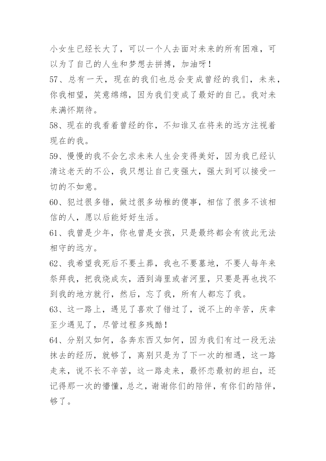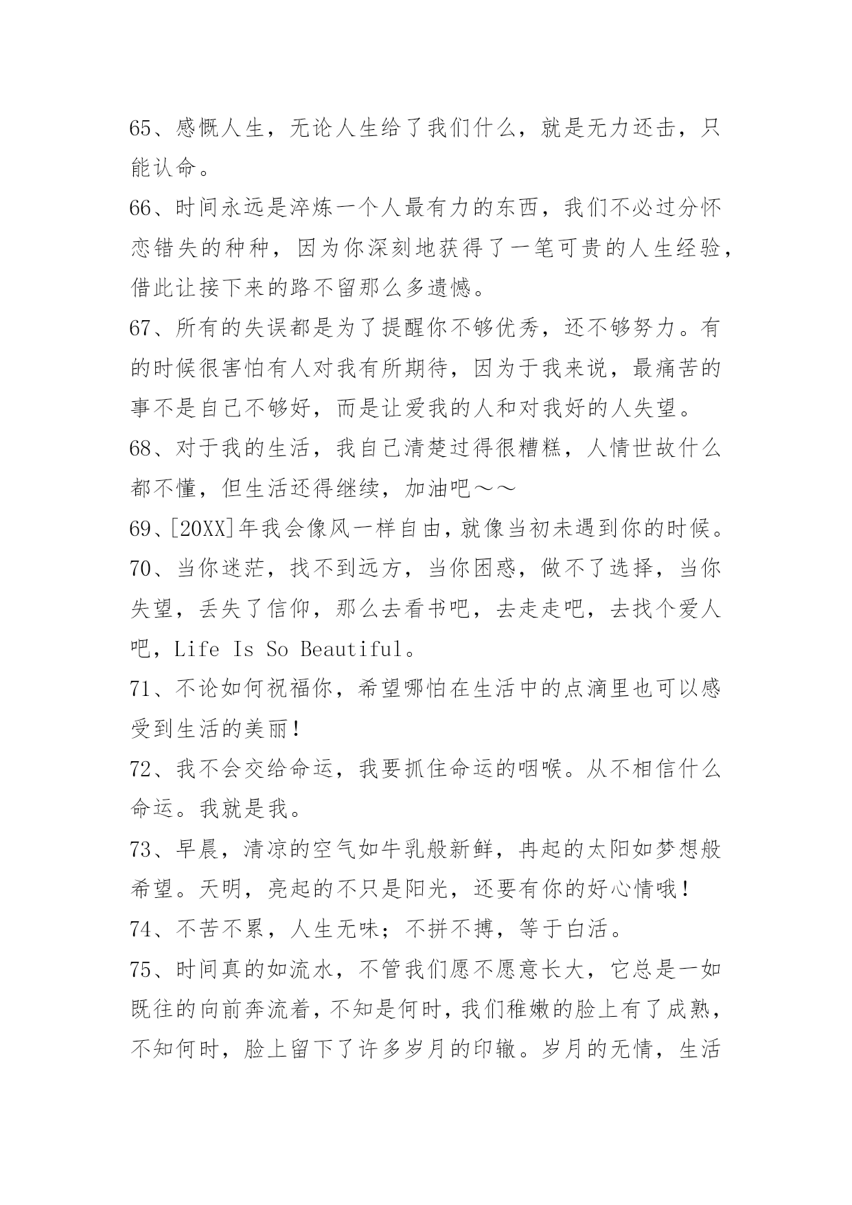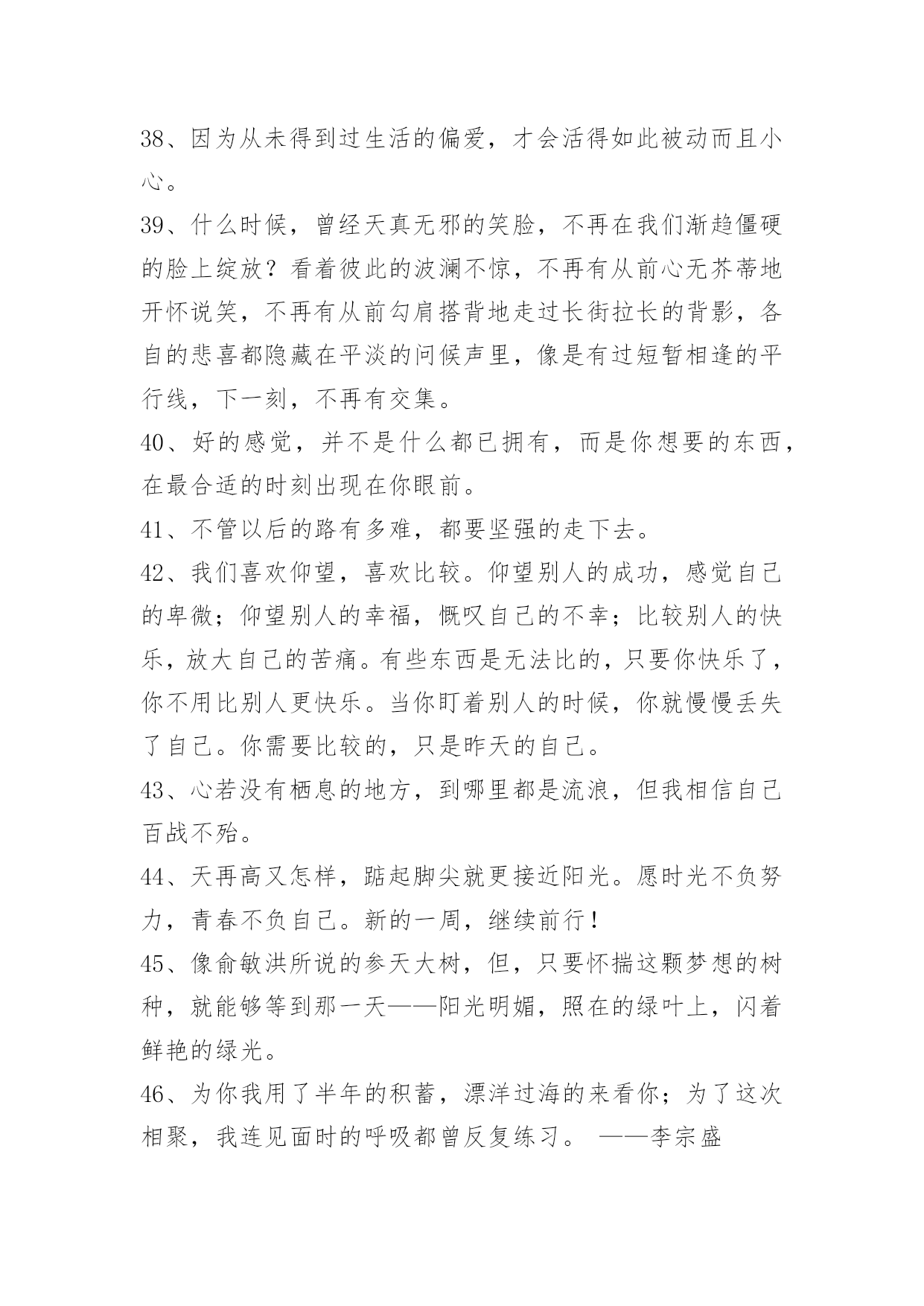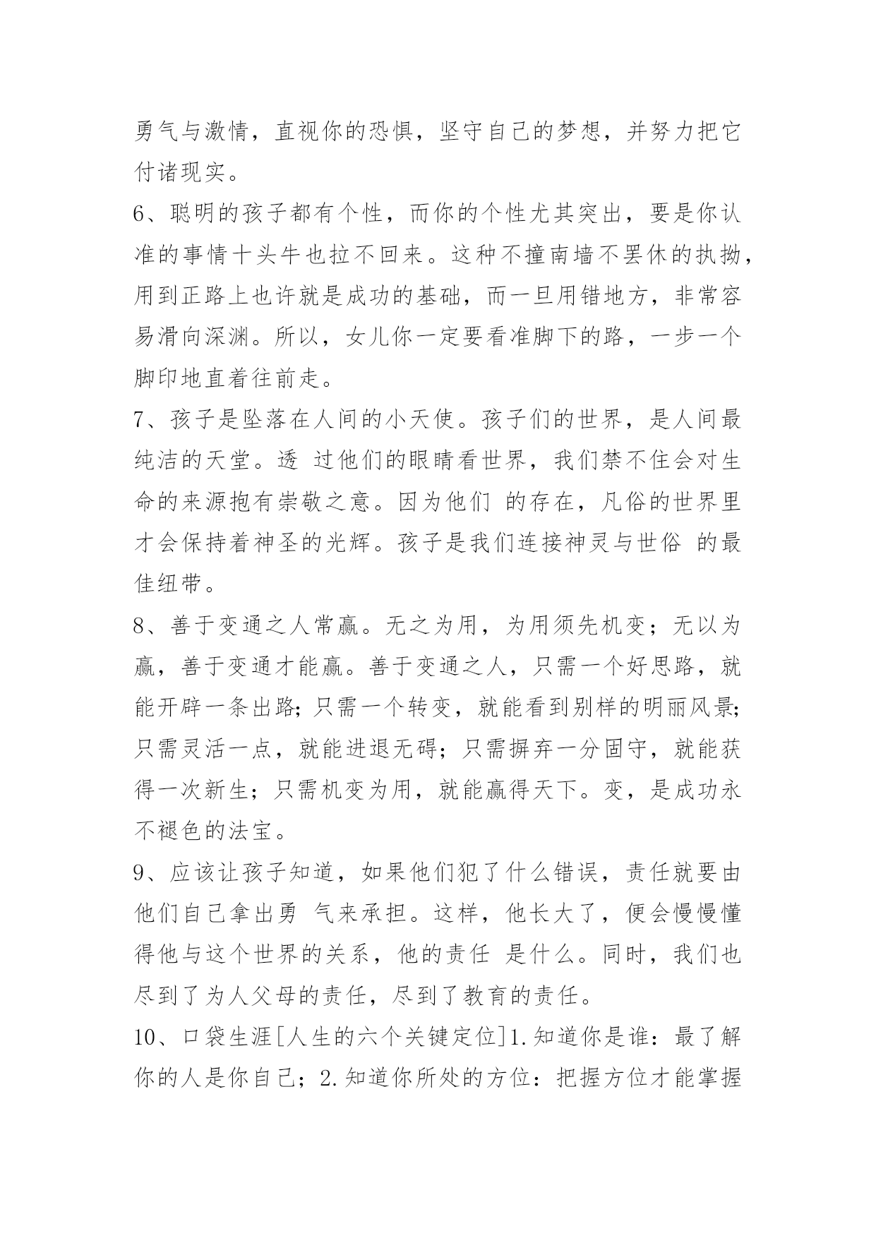 工作励志语录86条【实用】工作励志语录锦集86条这世上没有陌生人,只有我们还未曾认识的朋友。下面是小编为大家推荐的工作励志语录86条,欢迎阅读。1、在我们的心灵深处,爱和孤独其实是同一种情感,它们如影随形,不可分离。我们越是感觉孤独,便越是怀有强烈的爱的渴望。一个人对孤独的体验与他对爱的体验是成正比的,孤独的深度决定了爱的容量。孤独和爱是互为联系的,孤独是爱寻求接受而不可得,而爱则是对他人之孤独的发现和抚慰。2、你必须提醒你自己:别人眼中的成功不一定使你快乐,你可以尝试成功与快乐的滋味——并且,你还必须设定你的成功标准。它必须是你自我心像(一个人对他自己的心像就是他透视自己的态度)之中的一种成功——否则便是一种失败。3、当努力与力量积蓄够了时,就会爆发,爆发出惊人的成功。成功的重要性,来自于努力的程度与积蓄的力量的多少。付出的努力越多,成功则越惊人。4、勤奋的态度与主动积极的精神,再加上有眼力,应该成为一种良好生活的习惯,这种良好的生活习惯可以使我们为自己创造出更多成功的机会。5、把握机会,追逐自己心的梦想,屡败屡战,直到成功;勇于牺牲,勇于走出舒适的避风港,一次次搏击人生;满载勇气与激情,直视你的恐惧,坚守自己的梦想,并努力把它付诸现实。6、聪明的孩子都有个性,而你的个性尤其突出,要是你认准的事情十头牛也拉不回来。这种不撞南墙不罢休的执拗,用到正路上也许就是成功的基础,而一旦用错地方,非常容易滑向深渊。所以,女儿你一定要看准脚下的路,一步一个脚印地直着往前走。7、孩子是坠落在人间的小天使。孩子们的世界,是人间最纯洁的天堂。透过他们的眼睛看世界,我们禁不住会对生命的来源抱有崇敬之意。因为他们的存在,凡俗的世界里才会保持着神圣的光辉。孩子是我们连接神灵与世俗的最佳纽带。8、善于变通之人常赢。无之为用,为用须先机变;无以为赢,善于变通才能赢。善于变通之人,只需一个好思路,就能开辟一条出路;只需一个转变,就能看到别样的明丽风景;只需灵活一点,就能进退无碍;只需摒弃一分固守,就能获得一次新生;只需机变为用,就能赢得天下。变,是成功永不褪色的法宝。9、应该让孩子知道,如果他们犯了什么错误,责任就要由他们自己拿出勇气来承担。这样,他长大了,便会慢慢懂得他与这个世界的关系,他的责任是什么。同时,我们也尽到了为人父母的责任,尽到了教育的责任。10、口袋生涯[人生的六个关键定位]1.知道你是谁:最了解你的人是你自己;2.知道你所处的方位:把握方位才能掌握起步的层阶、时机与方向;3.知道你去哪里:目无头绪地乱闯,走得再远再久也是无谓的游荡;4.知道去干什么;5.知道谁能与你一起走;6.知道在什么时候止步:有限的目标往往是成功的捷径。11、作家当然必须挣钱才能生活、写作,但是他决不应该为了挣钱而生活、写作。[德]马克思《第六届莱茵省议会的辩论》,《马克思恩格斯全集》第1卷,。12、做人的道理,就好比堆土为山,只要坚忍下去,总会有成功的一天。否则,眼看还差一筐土就堆成了,可是到了这时,你却歇了下来,一退而不可收拾,也就会功亏一篑,没有任何成果。所以说,只有勤奋上进,不畏艰辛一往无前,才是向成功接近,获取幸福的最好途径。13、在哪里跌倒就在哪里爬起来,失败并不可怕,可怕的是不知为何而败。善于总结失败的教训,剖析失败的原由,获取难得的经验,失败才能变成比金钱还珍贵的财富,才是新的起点,才是成功的驿站。14、属于自己的,不要放弃;别人得到的,切莫妒忌;倾心投入的,不遗余力;成功在望的,加大力气;曾经拥有的,刻骨铭记;奋斗得到的,倍加珍惜;已经失去的,留给记忆;历经磨难的,洞悉生机;表面轻松的,实则不易;企图拥有的,必须努力;时刻牢记的,爱惜自己。15、面对委屈与挫折,年轻人应有的心态:1.肚量都是给委屈撑大的2.人的胸怀都是岁月的炎凉、人世沧桑血淋淋的撕裂开来的;3.伟大都是熬出来的。受委屈是人生走向成熟的必然阶段,要知道赏识让我们成长,谴责让我们成熟,不经历成熟哪来成功?何为成熟?稻子熟了,就低头了。16、心存希望,幸福就是会降临你;心存梦想,那么机遇就是会笼罩你。你必须相信时间的力量,你可以不成功,但你不能不成长。也许有人会阻碍你成功,但没人会阻挡你成长。有些路,通往哪里并不重要,重要的是你会在路上看到什么样的风景。17、身居陋室,以物为伴,独享闲情,尤当清晨无人来访之时。我想这样来比喻,也许能使人对我的生活略知一斑:我不比那嬉水湖中的鸭子或沃尔登湖本身更孤独,而那湖水又何以为伴呢?我好比茫茫草原上的一株蒲公英,好比一片豆叶,一只苍蝇,一只大黄蜂,我们都不感到孤独。18、心境决定你的快乐与悲伤,因此学会改变不快乐的心境,你才能享受生活的美好。既然我们我们无法改变命运,就要学会欣然接受,转而改变我们所能改变的——心境。真正卓越的人懂得如何改变心境,调