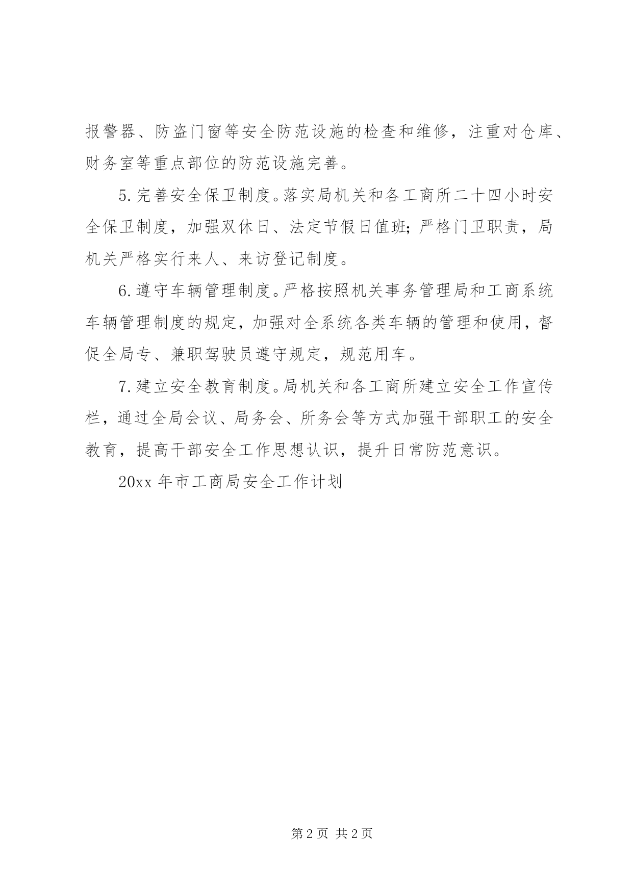 第PAGE\*Arabic\*MERGEFORMAT2页共NUMPAGES\*MERGEFORMAT2页市工商局安全工作计划安全工作事关国家财产安全、干部职工财物安全和生命健康安全,是全系统工作正常运转的基础和保障。为了在20xx年营造良好的安全工作环境,维护正常的工作秩序,特制订本规划。一、指导思想以党的十七大精神为指导,深入学习贯彻科学发展观,紧紧围绕促进社会和谐、全面建设小康社会这一主题,认真贯彻“预防为主、重在防范”的工作方针,切实保护国家财产、个人财产和生命健康安全,促进工商行政管理工作的顺利进行。二、工作目标三、工作措施1.规范安全领导小组。建立健全由局领导、办公室、各科所组成的系统安全工作领导小组网络,对人员因工作调动等原因发生变化的,及时进行调整明确。2.落实安全工作责任。签订安全工作责任书,将市综治办要求的社会治安综合治理目标任务层层分解,落实到各职能科室和基层工商所,并纳入年终岗位目标责任制考核。3.完善安全工作机制。建立健全安全领导小组会议制度,贯彻落实上级社会治安综合治理工作要求和精神,讨论、决定和部署系统安全工作。4.加强安全设施检修。根据要求,加强对局机关和各工商所报警器、防盗门窗等安全防范设施的检查和维修,注重对仓库、财务室等重点部位的防范设施完善。5.完善安全保卫制度。落实局机关和各工商所二十四小时安全保卫制度,加强双休日、法定节假日值班;严格门卫职责,局机关严格实行来人、来访登记制度。6.遵守车辆管理制度。严格按照机关事务管理局和工商系统车辆管理制度的规定,加强对全系统各类车辆的管理和使用,督促全局专、兼职驾驶员遵守规定,规范用车。7.建立安全教育制度。局机关和各工商所建立安全工作宣传栏,通过全局会议、局务会、所务会等方式加强干部职工的安全教育,提高干部安全工作思想认识,提升日常防范意识。20xx年市工商局安全工作计划