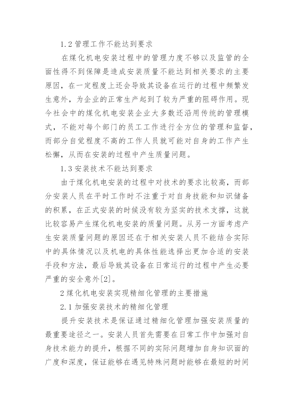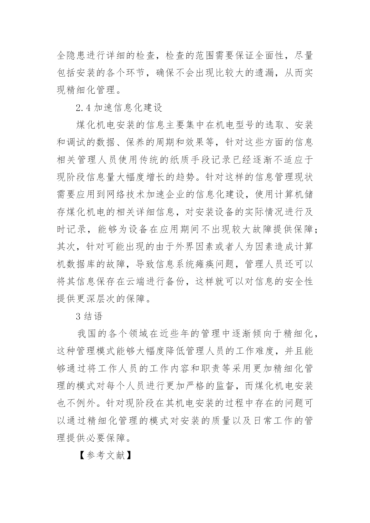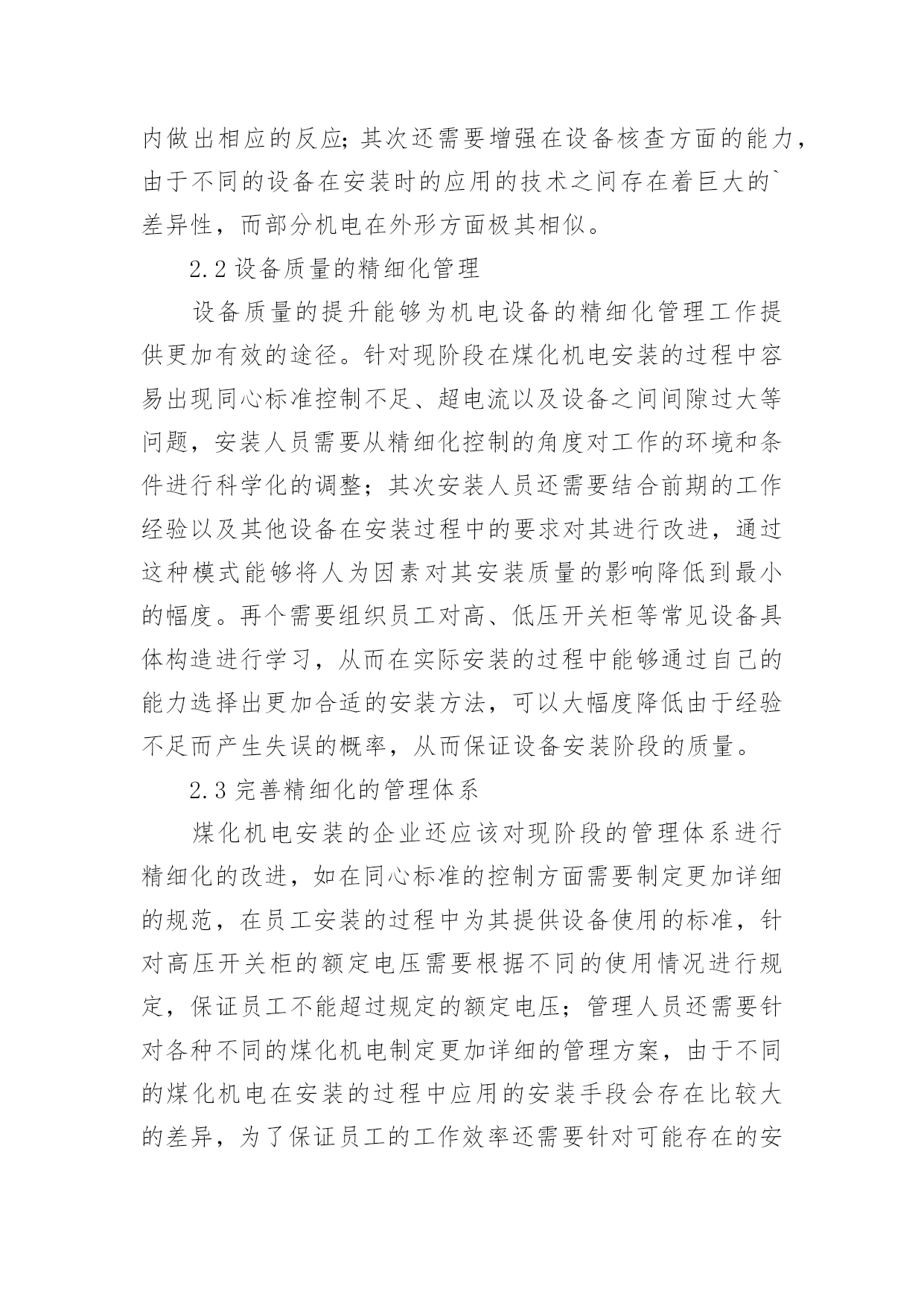 煤化机电安装精细化管理措施论文煤化机电安装精细化管理措施论文[摘要]现阶段,煤化机电安装的过程中还存在着较多的问题,为相关行业的发展产生了较大的阻碍,通过长时间的经验总结发现能够通过精细化管理解决这些实际问题。主要分析现阶段在煤化机电安装中存在的问题,并提出相关的改进措施,供机电安装人员参考。[关键词]煤化机电安装;精细化管理;管理煤化机电的安装在现实生活中的重要性日益提高,其管理质量不足引起的安全事故越来越多,对相关企业的长远发展带来了较大程度的不利影响。需要相关管理人员在日常工作中实现精细化管理,才能在激烈的机电安装竞争中占据有利的地位。1现阶段煤化机电安装存在的问题1.1安装规范性不够强根据现阶段的部分煤化机电安装存在质量问题的现象可以看出,其关键的原因就是同心标准的把握程度不够或者电机的负荷超出了其承载的功率,安装人员不能通过煤化机电安装的标准对行为进行控制,从而引起设备之间的间隙过大等问题,情况严重的时候还可能造成瓦斯爆炸或火灾,如果不能及时采取有效的措施还会导致更加危险的情况出现[1]。1.2管理工作不能达到要求在煤化机电安装过程中的管理力度不够以及监管的全面性得不到保障是造成安装质量不能达到相关要求的主要原因,在一定程度上还会导致其设备在运行的过程中频繁发生意外,为企业的正常生产起到了较为严重的阻碍作用。现今社会中的煤化机电安装企业大多数还沿用传统的管理模式,不能对每个部门的员工工作进行全方位的管理和监督,而部分自觉程度不高的工作人员就可能对自身的工作产生松懈,从而在安装的过程中产生质量问题。1.3安装技术不能达到要求由于煤化机电安装的过程中对技术的要求比较高,而部分安装人员在平时工作时不注重于对自身技能和知识储备的积累,在正式安装的时候没有较为坚实的技术支撑,这就比较容易产生煤化机电安装的质量问题。从另一方面考虑产生安装质量问题的原因还在于相关安装人员不能结合实际中的具体情况以及机电的具体性能选择出更加合适的安装手段和方法,最后导致其设备在日常运行的过程中产生必要严重的安全意外[2]。2煤化机电安装实现精细化管理的主要措施2.1加强安装技术的精细化管理提升安装技术是保证通过精细化管理加强安装质量的最重要途径之一。安装人员首先需要在日常工作中加强对自身技术能力的提升,根据不同的实际问题增加自身知识面的广度和深度,保证能够在遇见特殊问题时能够在最短的时间内做出相应的反应;其次还需要增强在设备核查方面的能力,由于不同的设备在安装时的应用的技术之间存在着巨大的`差异性,而部分机电在外形方面极其相似。2.2设备质量的精细化管理设备质量的提升能够为机电设备的精细化管理工作提供更加有效的途径。针对现阶段在煤化机电安装的过程中容易出现同心标准控制不足、超电流以及设备之间间隙过大等问题,安装人员需要从精细化控制的角度对工作的环境和条件进行科学化的调整;其次安装人员还需要结合前期的工作经验以及其他设备在安装过程中的要求对其进行改进,通过这种模式能够将人为因素对其安装质量的影响降低到最小的幅度。再个需要组织员工对高、低压开关柜等常见设备具体构造进行学习,从而在实际安装的过程中能够通过自己的能力选择出更加合适的安装方法,可以大幅度降低由于经验不足而产生失误的概率,从而保证设备安装阶段的质量。2.3完善精细化的管理体系煤化机电安装的企业还应该对现阶段的管理体系进行精细化的改进,如在同心标准的控制方面需要制定更加详细的规范,在员工安装的过程中为其提供设备使用的标准,针对高压开关柜的额定电压需要根据不同的使用情况进行规定,保证员工不能超过规定的额定电压;管理人员还需要针对各种不同的煤化机电制定更加详细的管理方案,由于不同的煤化机电在安装的过程中应用的安装手段会存在比较大的差异,为了保证员工的工作效率还需要针对可能存在的安全隐患进行详细的检查,检查的范围需要保证全面性,尽量包括安装的各个环节,确保不会出现比较大的遗漏,从而实现精细化管理。2.4加速信息化建设煤化机电安装的信息主要集中在机电型号的选取、安装和调试的数据、保养的周期和效果等,针对这些方面的信息相关管理人员使用传统的纸质手段记录已经逐渐不适应于现阶段信息量大幅度增长的趋势。针对这样的信息管理现状需要应用到网络技术加速企业的信息化建设,使用计算机储存煤化机电的相关详细信息,对安装设备的实际情况进行及时记录,能够为设备在应用期间不出现较大故障提供保障;其次,针对可能出现的由于外界因素或者人为因素造成计算机数据库的故障,导致信息系统瘫痪问题,管理人员还可以将其信息保存在云端进行备份,这样就可以对信息的安全性提供更深层次的保障。3结语我国的各个领域在近些年的管理中逐渐倾向于精细化,这种管理模式能够大幅度降低管理人员的工作难度,并且能够通过将工作人员的工作内容和职责等采用更加精细化管理的