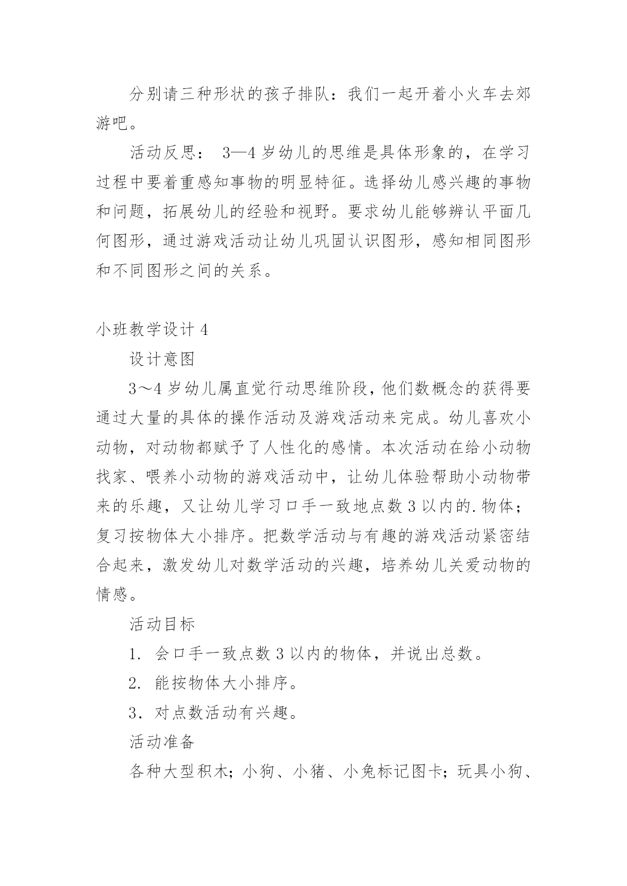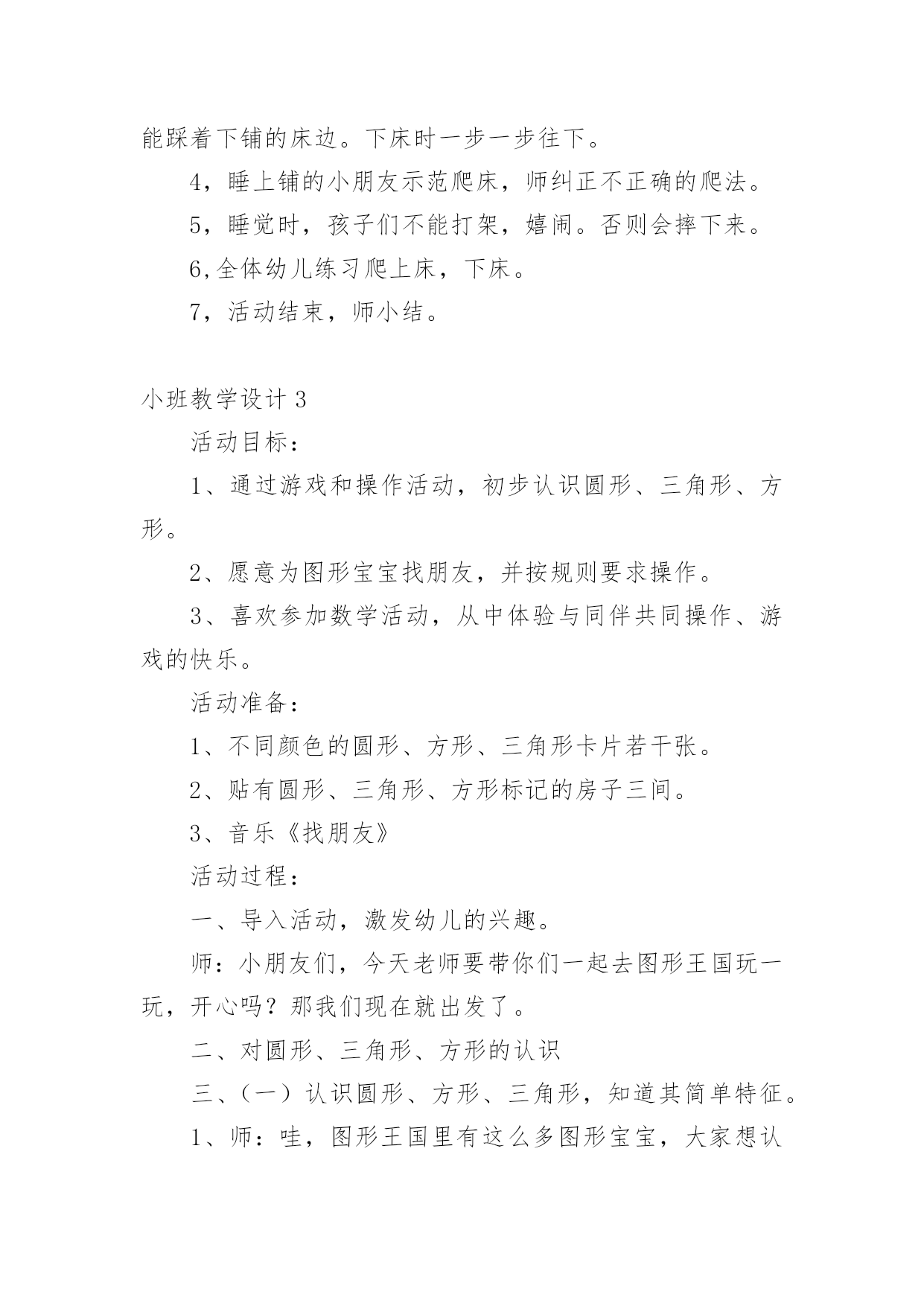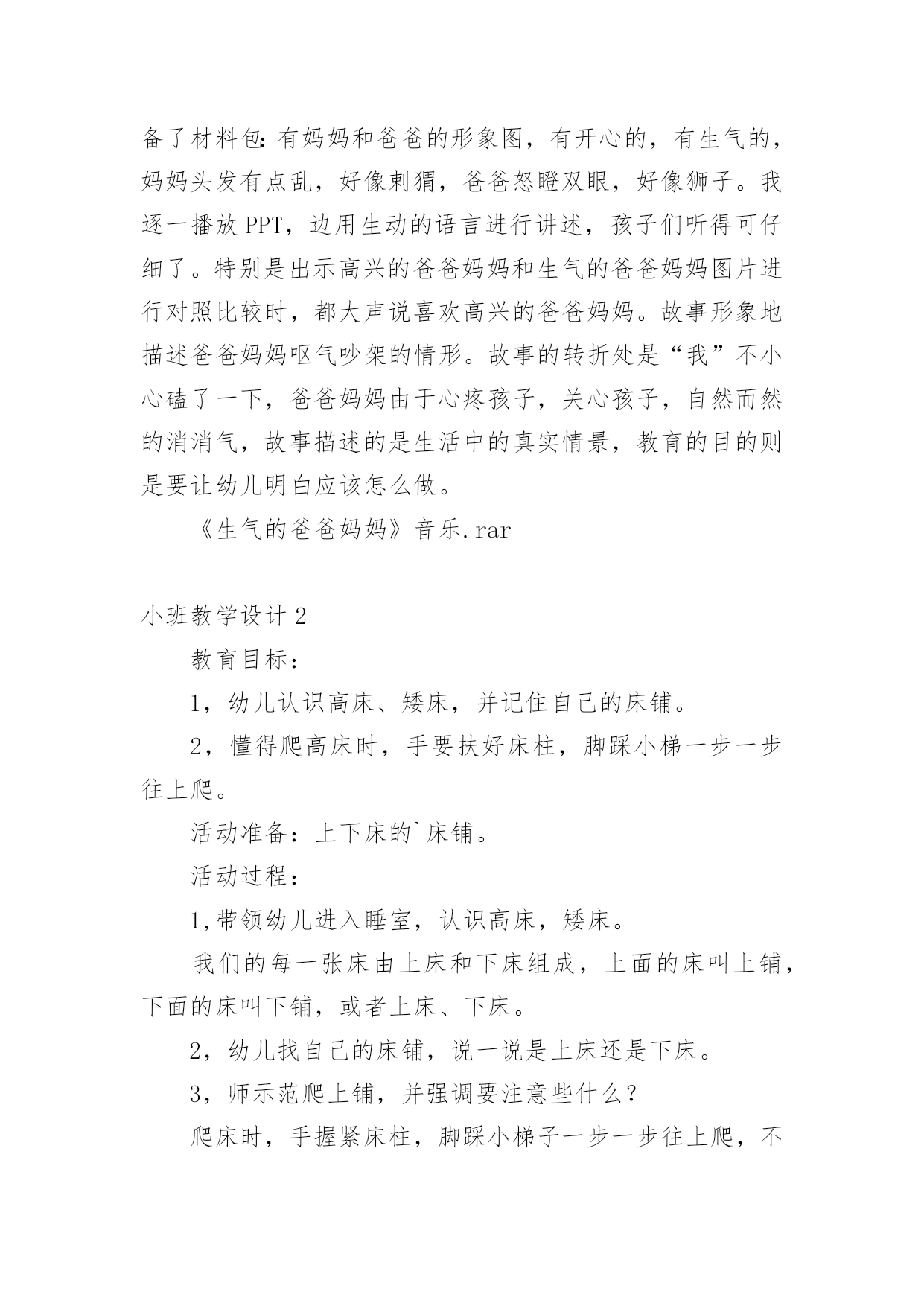 小班教学设计作为一无名无私奉献的教育工作者,常常要写一份优秀的教学设计,编写教学设计有利于我们科学、合理地支配课堂时间。优秀的教学设计都具备一些什么特点呢?以下是小编精心整理的小班教学设计,仅供参考,大家一起来看看吧。小班教学设计1活动目标:1.理解故事内容,明白故事中蕴含的道理。2.能够用完整的语言讲述让爸爸妈妈不生气、不吵架的方法。3.初步感受家人之间互相关爱的情感。活动准备:1.教具准备:《生气的爸爸妈妈》课件2.前期经验准备:①幼儿经验:幼儿喜欢听故事,愿意在同班跟前讲述、表演知道生气、吵架时人们的动作、表情②教师经验:关于生气、吵架时动作、神情的经验储备关于劝解爸爸妈妈不吵架的经验储备活动过程:(一)谈话“生气的爸爸妈妈”,调度幼儿前期经验,激发参与活动的兴趣。——小朋友们,你们都见过爸爸妈妈生气吵架吗?他们生气的时候是什么样子的呢?谁能学一学?【个别幼儿尝试】——你表演的是谁?他(她)生气时都是什么样子?——小朋友们都见过也模仿了爸爸妈妈生气吵架的样子。这会儿,有一个小朋友的爸爸妈妈正在吵架呢?他们为什么吵架,这位小朋友又是怎样做的呢?我们一起来看一看吧!(二)理解故事内容,明白故事中蕴含的道理1、初步欣赏故事,了解故事内容——【完整播放故事课件】小朋友们,谁愿意说一说故事的名字叫什么?(《生气的爸爸妈妈》)——故事里都出现了哪些人呢?爸爸、妈妈和我({结合手势动作}请你看一看,这是谁?除了……故事中还有谁?)——谁愿意来说一说故事中发生了什么事情呢?(幼儿自由回答)——故事里面到底发生了什么事情,让我们再来看一看吧!2、分段欣赏故事(1)欣赏第一段,了解爸爸妈妈生气时的样子,能用动作、表情表现爸爸妈妈生气的`样子。——【播放故事课件第一段】故事中发生了什么事情?他们都有什么变化?(爸爸和妈妈吵架了,爸爸变成了狮子,妈妈变成了刺猬)——妈妈和爸爸吵架后,想做什么事情?(妈妈要带宝宝回外婆家)——小朋友心里是怎样想的?(爸爸妈妈他们很凶猛、很可怕,小朋友的心里很害怕……)——故事中的爸爸妈妈都变成了非常凶的样子,他们是什么样子的?请和你旁边的好朋友一起模仿一下吧。——哪一组好朋友愿意到前面来表演一下?(请一对小朋友单独展示。)——小朋友们都模仿出了故事中爸爸妈妈生气的样子了,接下来又发生了什么事情呢?谁愿意来说一说。(2)欣赏第二段,理解故事中小朋友与妈妈的动作变化。——故事中的宝宝想了一个什么样的办法阻止妈妈离开?(躲起来不让妈妈发现)——故事中的小朋友和妈妈是怎样做的?结果怎样?【播放第二段,观看过程中进行提问。】1、躲到沙发后,妈妈冲过来。2、他又逃到衣柜旁,妈妈追过来。3、钻进桌子底下,妈妈来拽我。4、他的头不小心碰了一下。——接下来会发生什么样的事情呢?让我们再来看一看吧!(3)欣赏第三段,明白故事中蕴含的道理,感受家人之间的互相关爱。——【欣赏故事课件第三段】小朋友受伤后,爸爸妈妈是怎样做的?谁愿意来说一说。——小朋友心里是怎样想的?(爸爸妈妈再也不会吵架了,因为他们都爱宝宝。)——爸爸妈妈最后因为什么不吵架了?(宝宝受伤了,爸爸妈妈心疼宝宝,所以不吵架)(三)能够用完整的语言讲述让爸爸妈妈不生气、不吵架的方法。——孩子们,你们喜欢开心的爸爸妈妈还是生气的爸爸妈妈呢?——在生活中,如果我们的爸爸妈妈生气、吵架了,我们应该怎样做呢?【幼儿展开想象自由发言】1.劝说爸爸妈妈“爸爸妈妈你们不要吵了”“宝宝很乖,你们也要乖哦”2.抱抱亲亲爸爸妈妈3.向其他家人求助(四)拓展与延伸——如果你的爸爸妈妈在生活中真的吵架了,请小朋友们多动动自己的小脑筋去劝解自己的爸爸妈妈吧!活动反思:“生气的爸爸妈妈”是语言活动:故事。这个活动的重点是让孩子们理解:一家人不能分开,即使在有误解、有隔阂的时候。活动前我作了充分的准备,准备好了ppt,还准备了材料包:有妈妈和爸爸的形象图,有开心的,有生气的,妈妈头发有点乱,好像剌猬,爸爸怒瞪双眼,好像狮子。我逐一播放PPT,边用生动的语言进行讲述,孩子们听得可仔细了。特别是出示高兴的爸爸妈妈和生气的爸爸妈妈图片进行对照比较时,都大声说喜欢高兴的爸爸妈妈。故事形象地描述爸爸妈妈呕气吵架的情形。故事的转折处是“我”不小心磕了一下,爸爸妈妈由于心疼孩子,关心孩子,自然而然的消消气,故事描述的是生活中的真实情景,教育的目的则是要让幼儿明白应该怎么做。《生气的爸爸妈妈》音乐.rar小班教学设计2教育目标:1,幼儿认识高床、矮床,并记住自己的床铺。2,懂得爬高床时,手要扶好床柱,脚踩小梯一步一步往上爬。活动准备:上下床的`床铺。活动过程:1,带领幼儿进入睡室,认识高床,矮床。我们的每一张床由上床和下床组成,上面的床叫上铺,下面的床叫下铺,或者上床、下床。2,幼儿找自己的床铺,说一说是上床还是下床