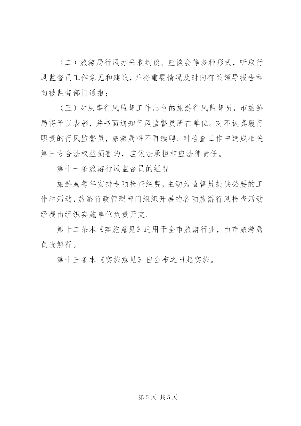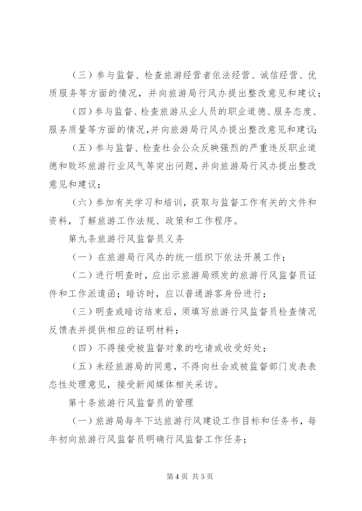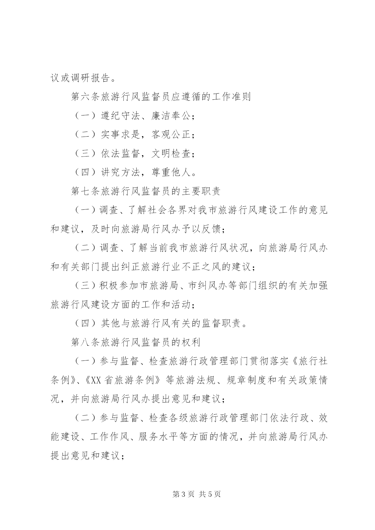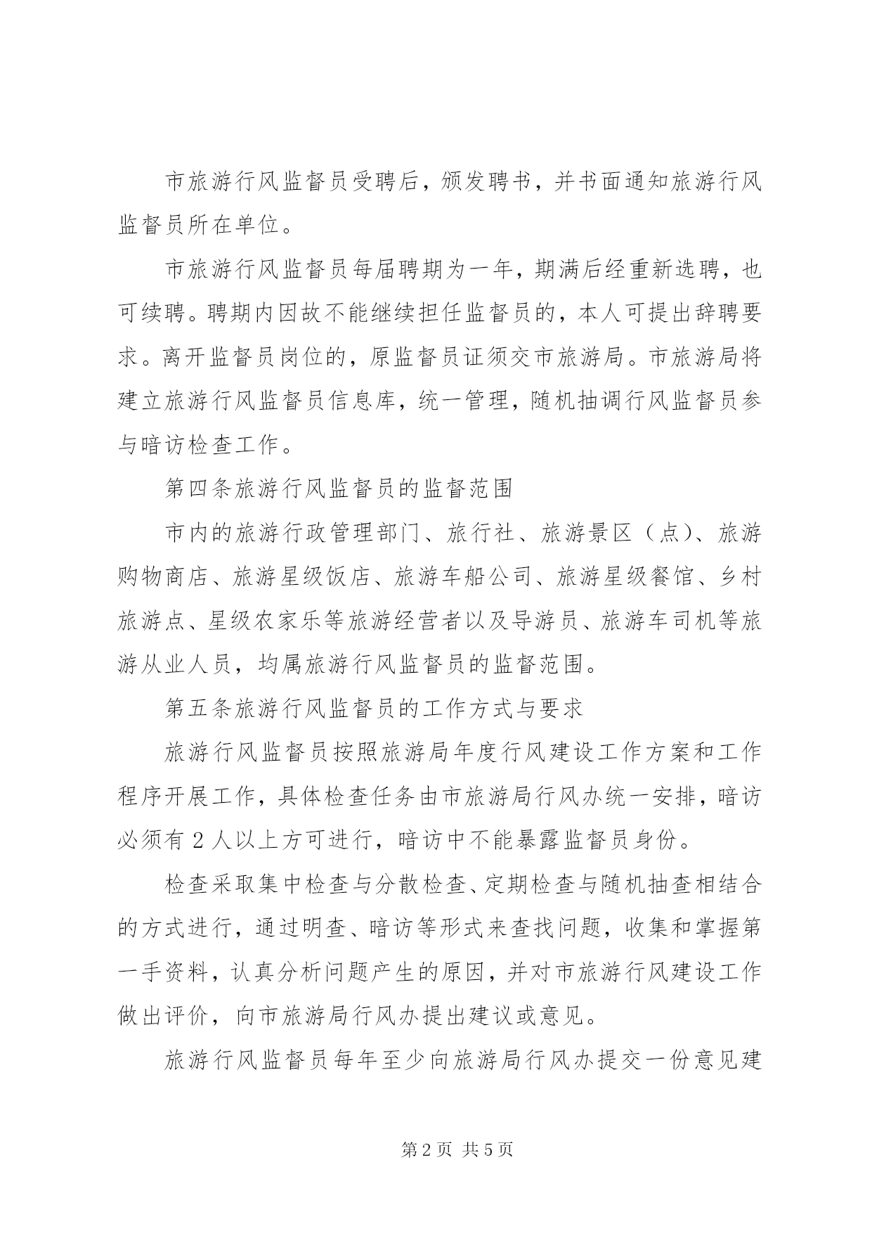 第PAGE\*Arabic\*MERGEFORMAT5页共NUMPAGES\*MERGEFORMAT5页XX市旅游局聘请监督员开展旅游行风建设监督工作实施意见为了进一步加强与完善芜湖旅游市场监管体系,充分发挥旅游行风监督员的监督作用,促进芜湖旅游市场的健康发展,把旅游业建设成人民群众更加满意的现代服务业,特制定实施意见。第一条聘请旅游行风监督员的范围旅游行风监督员由市旅游局行风建设工作领导小组办公室(以下简称市旅游局行风办)统一管理,从市人大代表、政协委员、民主党派人士、专家学者、媒体记者及旅游企业中聘任。第二条聘请旅游行风监督员的条件(一)坚持邓小平理论和“三个代表”重要思想,贯彻落实科学发展观,认真执行党的路线、方针、政策,有较强的政治责任感和奉献精神;(二)热爱旅游事业,熟悉了解行风工作任务,具有一定的法律知识、政策水平和较为丰富的工作经验;(三)身体健康,有较强的独立工作能力,能深入开展调查研究,及时发现和掌握有关情况,提出意见和建议。第三条聘请旅游行风监督员的方法与任期市旅游行风监督员经各县区旅游局推荐、本人自愿、所在单位同意、市旅游局审定后予以确定,首批聘请人数控制在10人左右。市旅游行风监督员受聘后,颁发聘书,并书面通知旅游行风监督员所在单位。市旅游行风监督员每届聘期为一年,期满后经重新选聘,也可续聘。聘期内因故不能继续担任监督员的,本人可提出辞聘要求。离开监督员岗位的,原监督员证须交市旅游局。市旅游局将建立旅游行风监督员信息库,统一管理,随机抽调行风监督员参与暗访检查工作。第四条旅游行风监督员的监督范围市内的旅游行政管理部门、旅行社、旅游景区(点)、旅游购物商店、旅游星级饭店、旅游车船公司、旅游星级餐馆、乡村旅游点、星级农家乐等旅游经营者以及导游员、旅游车司机等旅游从业人员,均属旅游行风监督员的监督范围。第五条旅游行风监督员的工作方式与要求旅游行风监督员按照旅游局年度行风建设工作方案和工作程序开展工作,具体检查任务由市旅游局行风办统一安排,暗访必须有2人以上方可进行,暗访中不能暴露监督员身份。检查采取集中检查与分散检查、定期检查与随机抽查相结合的方式进行,通过明查、暗访等形式来查找问题,收集和掌握第一手资料,认真分析问题产生的原因,并对市旅游行风建设工作做出评价,向市旅游局行风办提出建议或意见。旅游行风监督员每年至少向旅游局行风办提交一份意见建议或调研报告。第六条旅游行风监督员应遵循的工作准则(一)遵纪守法、廉洁奉公;(二)实事求是,客观公正;(三)依法监督,文明检查;(四)讲究方法,尊重他人。第七条旅游行风监督员的主要职责(一)调查、了解社会各界对我市旅游行风建设工作的意见和建议,及时向旅游局行风办予以反馈;(二)调查、了解当前我市旅游行风状况,向旅游局行风办和有关部门提出纠正旅游行业不正之风的建议;(三)积极参加市旅游局、市纠风办等部门组织的有关加强旅游行风建设方面的工作和活动;(四)其他与旅游行风有关的监督职责。第八条旅游行风监督员的权利(一)参与监督、检查旅游行政管理部门贯彻落实《旅行社条例》、《XX省旅游条例》等旅游法规、规章制度和有关政策情况,并向旅游局行风办提出意见和建议;(二)参与监督、检查各级旅游行政管理部门依法行政、效能建设、工作作风、服务水平等方面的情况,并向旅游局行风办提出意见和建议;(三)参与监督、检查旅游经营者依法经营、诚信经营、优质服务等方面的情况,并向旅游局行风办提出整改意见和建议;(四)参与监督、检查旅游从业人员的职业道德、服务态度、服务质量等方面的情况,并向旅游局行风办提出整改意见和建议;(五)参与监督、检查社会公众反映强烈的严重违反职业道德和败坏旅游行业风气等突出问题,并向旅游局行风办提出整改意见和建议;(六)参加有关学习和培训,获取与监督工作有关的文件和资料,了解旅游工作法规、政策和工作程序。第九条旅游行风监督员义务(一)在旅游局行风办的统一组织下依法开展工作;(二)进行明查时,应出示旅游局颁发的旅游行风监督员证件和工作派遣函;暗访时,应以普通游客身份进行;(三)明查或暗访结束后,须填写旅游行风监督员检查情况反馈表并提供相应的证明材料;(四)不得接受被监督对象的吃请或收受好处;(五)未经旅游局的同意,不得向社会或被监督部门发表表态性处理意见,接受新闻媒体相关采访。第十条旅游行风监督员的管理(一)旅游局每年下达旅游行风建设工作目标和任务书,每年初向旅游行风监督员明确行风监督工作任务;(二)旅游局行风办采取约谈、座谈会等多种形式,听取行风监督员工作意见和建议,并将重要情况及时向有关领导报告和向被监督部门通报;(三)对从事行风监督工作出色的旅游行风监督员,市旅游局将予以表彰,并书面通知行风监督员所在单位。对不认真履行职责的行风监督员,旅游局将不再续聘。