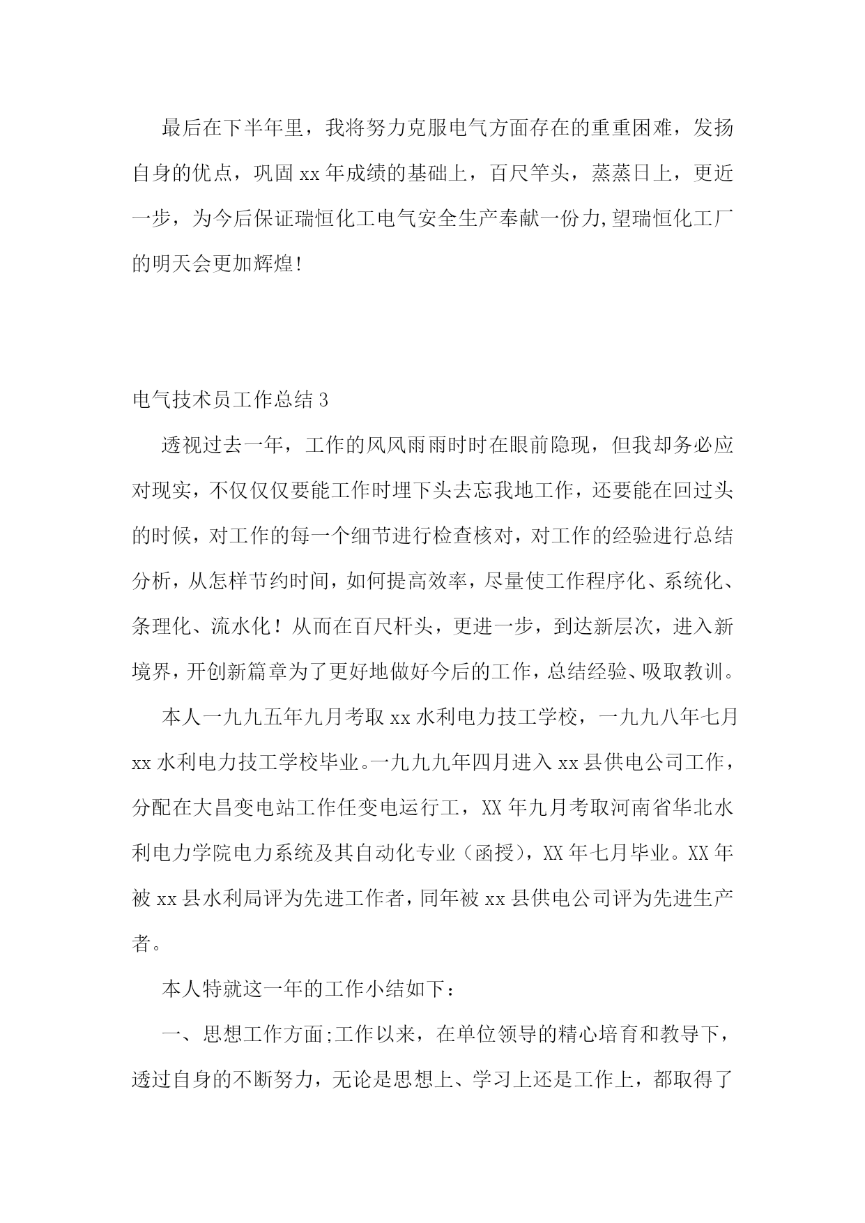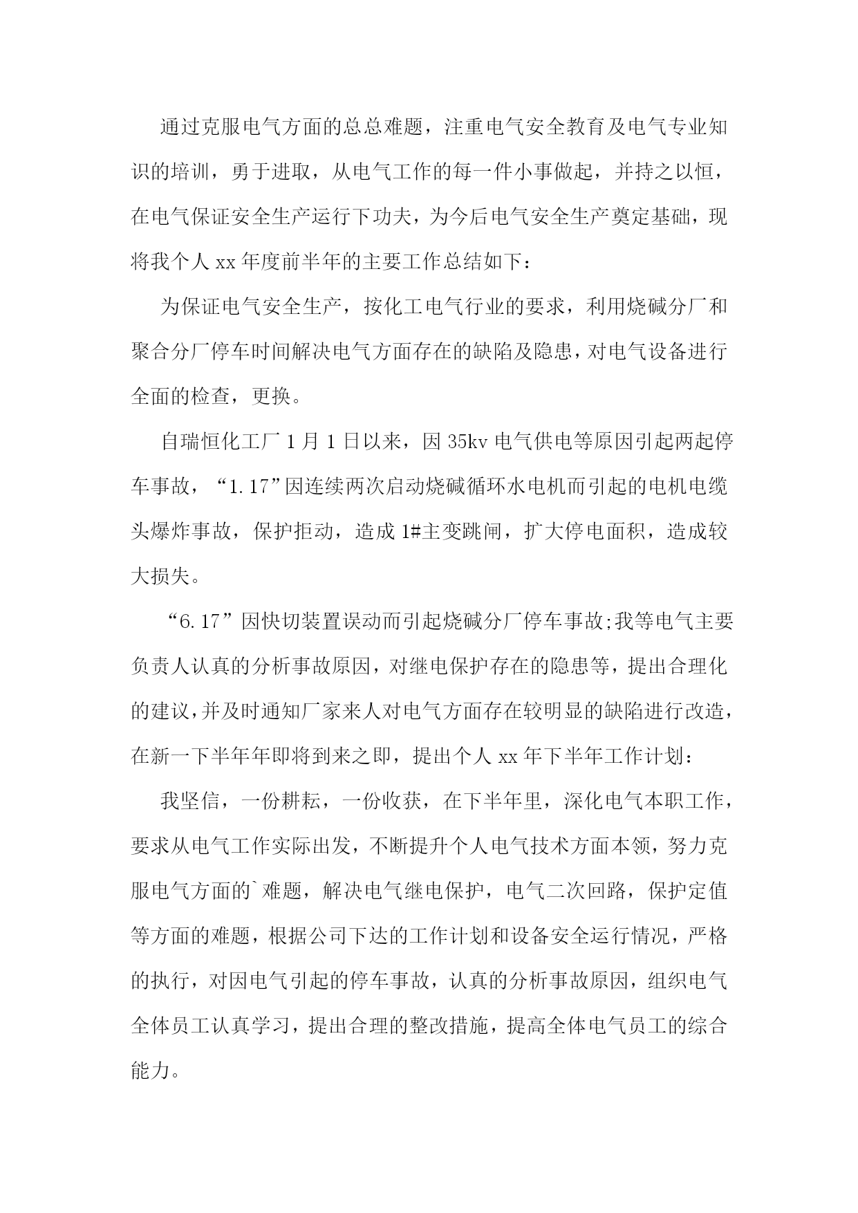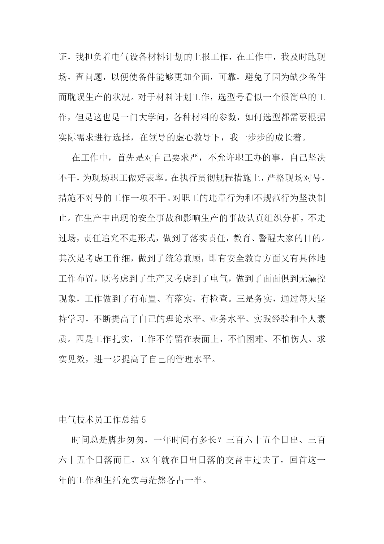 电气技术员工作总结(精选15篇)电气技术员工作总结120xx年,在车间领导的带领下,我们认真贯彻矿山公司的各项工作部署,紧紧围绕稳定运行的生产目标,保证电气设备安稳、良性运行为中心,开展电气设备隐患综合治理工作,加强运行设备的监控维护力度,落实各项管理制度。在过去的一年时间里,我们主要做了以下几个方面的工作:一、强化安全意识,落实安全措施。年初,我们就组织了规程抽考、安全用具使用、查找安全生产隐患等活动。把安全意识传达到车间每一个人。车间坚持每周一检查班组安全学习,督促班组隐患治理。每周在车间调度会上我们讲评安全检查情况、讲评安全隐患整改落实情况。职工安全意识显著增强,在电气运行和设备维护的过程中,能够严格遵守各项电气规程和制度。在历次的安全检查中,没有发现一例违章行为。二、加强基础工作,科学严细管理。基础工作是电气安全运行的前提。年初,煅烧车间把“精细管理”作为贯穿全年的基础工作。在电气方面,我们把完善基础资料,严格细致管理作为重点工作。20xx年,我们完善了电气设备技术基础资料,特别是在配电室星级管理方面,根据设备管理的需求,补充完善了配电室设备点检表、电气绝保实验记录表、站所设备缺陷、隐患整改记录表等,在配电室内张贴了相关的规章制度。至此,基础资料完善齐全给车间管理打下了坚实的基础。在设备检查中,多次受到领导表扬。在安全管理上,我们坚持“安全第一,预防为主”的方针,全面落实安全生产责任制,加大监督检查力度。为了达到电气设备安全、正常运行,我们制度了严格的考核措施并予以实施。三、努力为生产服务,强化生产设备各项工作。1、加强设备的日常巡检管理工作。在年初,根据车间设备分布的特点,加强日常巡检工作,制定了严格的巡检制度。对巡检设备制定了巡检路线,每周巡检落实到人,由技术员、主任进行检查、监督,并实行有效的奖惩制度。这样就能够使车间人员对设备的运行情况了如指掌。在设备检修时,能够对有问题的设备进行重巡处理。这样不仅能够节省检修时间,而且能有针对性的解决问题,确保检修质量。配电室主变压器就是在巡检时发现渗油现象,进行及时检修消除了隐患。南窑煤皮带在巡检时发现轴承窜位,及时更换,消除了隐患。2、生产设备技术改造项目工作。为了生产能够达产达效,车间对生产系统进行了很多改造。在这些技术改造中,我们车间全力配合工艺进行电气技术设计、设备安装施工。这些技术改造电气部分的设计、安装都很成功。具体如下:(1)新消化系统电气控制设计及设备安装。(2)4#、6#皮带改造工程电气改造安装。(3)窑顶3吨天吊操作盘改造。(4)新钢粒筛分系统的电气设计、安装。(5)9米平台照明系统改造。四、月检修工作。为了提高每一位职工的责任感,确保检修质量,我车间实行了工作单责任制。每张工作单记录每项工作内容、工作完成人、故障部位、完成情况、安全负责人等,这样大大增强了检修人员的责任心,确保检修质量。电气检修,安全是个大问题。由于牵扯到的岗位工种多,在停电检修时,为避免误操作送电,我车间在检修前对班组长进行了严格要求。在停送电时,要严格执行操作票制度,按规程操作,确保了检修人员的安全。五、以人为本,搞好职工队伍建设。1、完善车间的各项规章制度,用制度规范职工的行为。2、加强内部各项工作的检查、监督和考核。3、加强职工的技能知识。4、搞好干群关系,在车间创造一个职工团结一心,有集体荣誉感,有责任心和紧迫感,有良好工作作风的和谐氛围。5、在搞好职工队伍建设的同时要继续落实降本增效工作。六、车间在设备管理维护方面还存在许多问题:1、车间电气检修、维护人员整体专业技术水平较差,应采取各种方式进行培训。2、车间电气设备管理基础工作还需进一步细化。车间将按照机动部管理的.要求逐步进行设备管理基础工作的完善、细化。3、现场临时线管理还存在隐患。如:现场检修时要求安装的照明、电焊机等临时线,在检修结束后经常不通知电气人员拆除,而电气人员也不知道现场检修是否结束,这样临时线一直带电放在现场,形成隐患。七、新一年的努力方向20xx年就要到了,在即将开始的新一年的工作中,为了在今后的工作中取得更好的成绩,我将朝着以下方向努力:1、有计划的做好电气设备的维修保养工作。2、严格按照操作规程进行安排作业,并负责做好维修过程的检验工作,保证按质按量完成维修任务。3、协调好日常维修工作,组织好突发故障的抢修工作。4、积极主动地完成公司及车间安排的各项工作任务。5、工作中以身作则,多与大家沟通,形成共识,追求规范化和效益化。6、努力学习业务知识,积极参与各种疑难问题的分析及解决,不断提高自身的技术水平,使自己的业务技能和业务知识更上一个台阶,使自己能更好的为生产服务,为公司创造更大效益。电气技术员工作总结2xx年度上半年