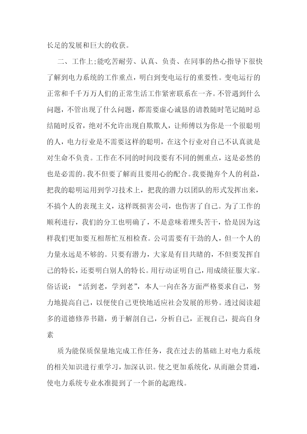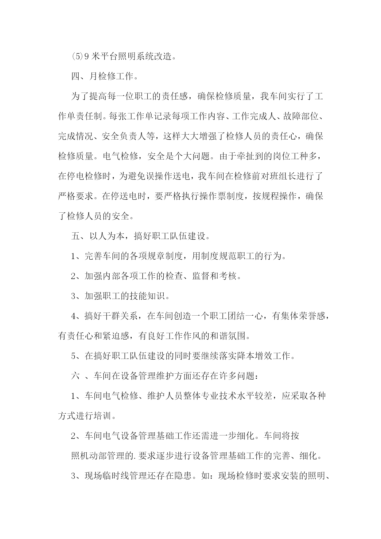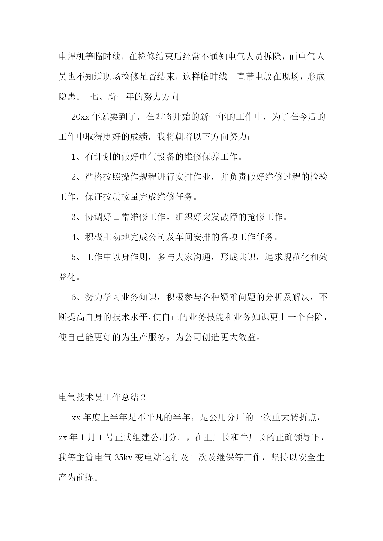 电气技术员工作总结(精选15篇)电气技术员工作总结120xx年,在车间领导的带领下,我们认真贯彻矿山公司的各项工作部署,紧紧围绕稳定运行的生产目标,保证电气设备安稳、良性运行为中心,开展电气设备隐患综合治理工作,加强运行设备的监控维护力度,落实各项管理制度。在过去的一年时间里,我们主要做了以下几个方面的工作:一、强化安全意识,落实安全措施。年初,我们就组织了规程抽考、安全用具使用、查找安全生产隐患等活动。把安全意识传达到车间每一个人。车间坚持每周一检查班组安全学习,督促班组隐患治理。每周在车间调度会上我们讲评安全检查情况、讲评安全隐患整改落实情况。职工安全意识显著增强,在电气运行和设备维护的过程中,能够严格遵守各项电气规程和制度。在历次的安全检查中,没有发现一例违章行为。二、加强基础工作,科学严细管理。基础工作是电气安全运行的前提。年初,煅烧车间把“精细管理”作为贯穿全年的基础工作。在电气方面,我们把完善基础资料,严格细致管理作为重点工作。20xx年,我们完善了电气设备技术基础资料,特别是在配电室星级管理方面,根据设备管理的需求,补充完善了配电室设备点检表、电气绝保实验记录表、站所设备缺陷、隐患整改记录表等,在配电室内张贴了相关的规章制度。至此,基础资料完善齐全给车间管理打下了坚实的基础。在设备检查中,多次受到领导表扬。在安全管理上,我们坚持“安全第一,预防为主”的方针,全面落实安全生产责任制,加大监督检查力度。为了达到电气设备安全、正常运行,我们制度了严格的考核措施并予以实施。三、努力为生产服务,强化生产设备各项工作。1、加强设备的日常巡检管理工作。在年初,根据车间设备分布的特点,加强日常巡检工作,制定了严格的巡检制度。对巡检设备制定了巡检路线,每周巡检落实到人,由技术员、主任进行检查、监督,并实行有效的奖惩制度。这样就能够使车间人员对设备的运行情况了如指掌。在设备检修时,能够对有问题的设备进行重巡处理。这样不仅能够节省检修时间,而且能有针对性的解决问题,确保检修质量。配电室主变压器就是在巡检时发现渗油现象,进行及时检修消除了隐患。南窑煤皮带在巡检时发现轴承窜位,及时更换,消除了隐患。2、生产设备技术改造项目工作。为了生产能够达产达效,车间对生产系统进行了很多改造。在这些技术改造中,我们车间全力配合工艺进行电气技术设计、设备安装施工。这些技术改造电气部分的设计、安装都很成功。具体如下:(1)新消化系统电气控制设计及设备安装。(2)4#、6#皮带改造工程电气改造安装。(3)窑顶3吨天吊操作盘改造。(4)新钢粒筛分系统的电气设计、安装。(5)9米平台照明系统改造。四、月检修工作。为了提高每一位职工的责任感,确保检修质量,我车间实行了工作单责任制。每张工作单记录每项工作内容、工作完成人、故障部位、完成情况、安全负责人等,这样大大增强了检修人员的责任心,确保检修质量。电气检修,安全是个大问题。由于牵扯到的岗位工种多,在停电检修时,为避免误操作送电,我车间在检修前对班组长进行了严格要求。在停送电时,要严格执行操作票制度,按规程操作,确保了检修人员的安全。五、以人为本,搞好职工队伍建设。1、完善车间的各项规章制度,用制度规范职工的行为。2、加强内部各项工作的检查、监督和考核。3、加强职工的技能知识。4、搞好干群关系,在车间创造一个职工团结一心,有集体荣誉感,有责任心和紧迫感,有良好工作作风的和谐氛围。5、在搞好职工队伍建设的同时要继续落实降本增效工作。六、车间在设备管理维护方面还存在许多问题:1、车间电气检修、维护人员整体专业技术水平较差,应采取各种方式进行培训。2、车间电气设备管理基础工作还需进一步细化。车间将按照机动部管理的.要求逐步进行设备管理基础工作的完善、细化。3、现场临时线管理还存在隐患。如:现场检修时要求安装的照明、电焊机等临时线,在检修结束后经常不通知电气人员拆除,而电气人员也不知道现场检修是否结束,这样临时线一直带电放在现场,形成隐患。七、新一年的努力方向20xx年就要到了,在即将开始的新一年的工作中,为了在今后的工作中取得更好的成绩,我将朝着以下方向努力:1、有计划的做好电气设备的维修保养工作。2、严格按照操作规程进行安排作业,并负责做好维修过程的检验工作,保证按质按量完成维修任务。3、协调好日常维修工作,组织好突发故障的抢修工作。4、积极主动地完成公司及车间安排的各项工作任务。5、工作中以身作则,多与大家沟通,形成共识,追求规范化和效益化。6、努力学习业务知识,积极参与各种疑难问题的分析及解决,不断提高自身的技术水平,使自己的业务技能和业务知识更上一个台阶,使自己能更好的为生产服务,为公司创造更大效益。电气技术员工作总结2xx年度上半年