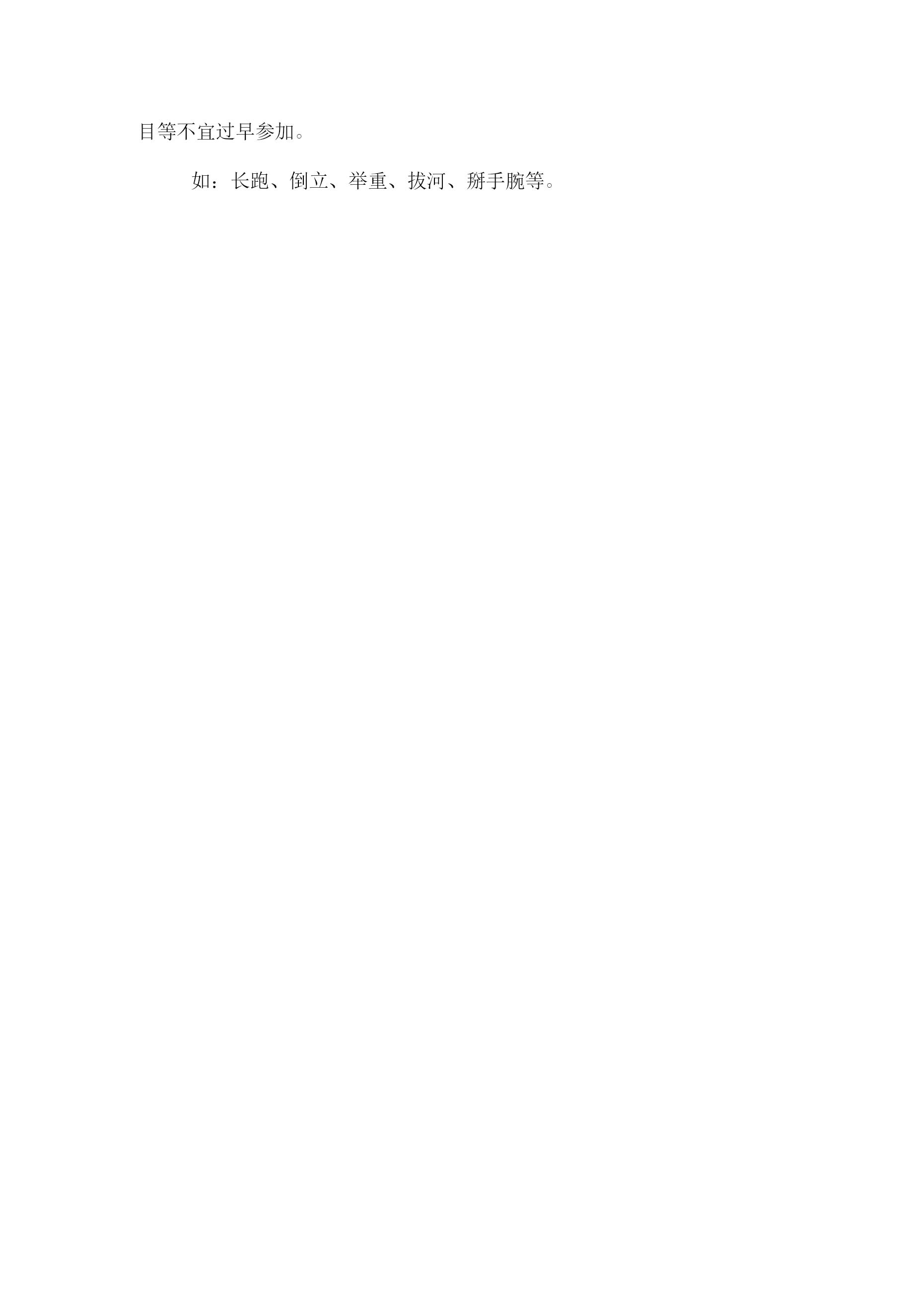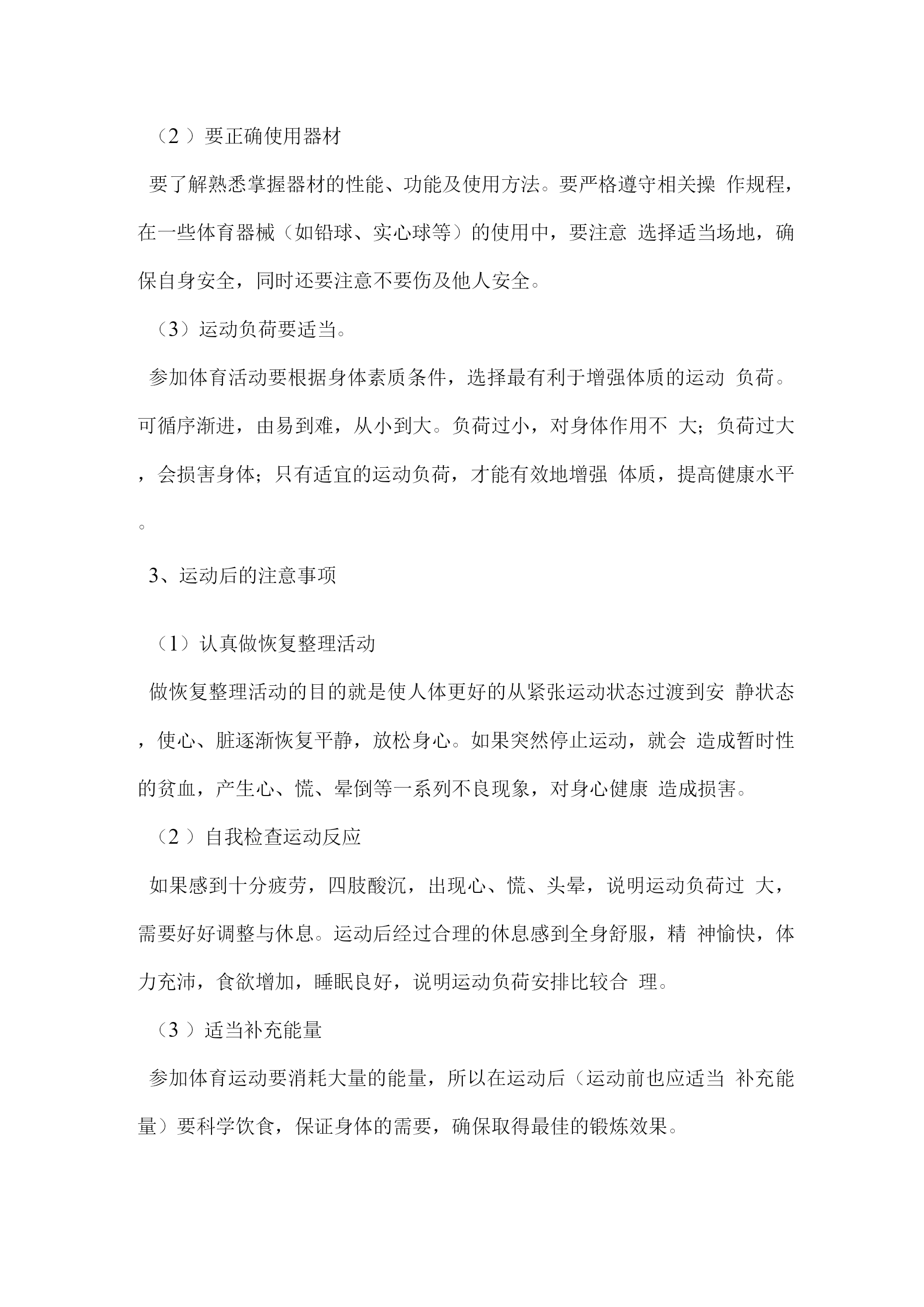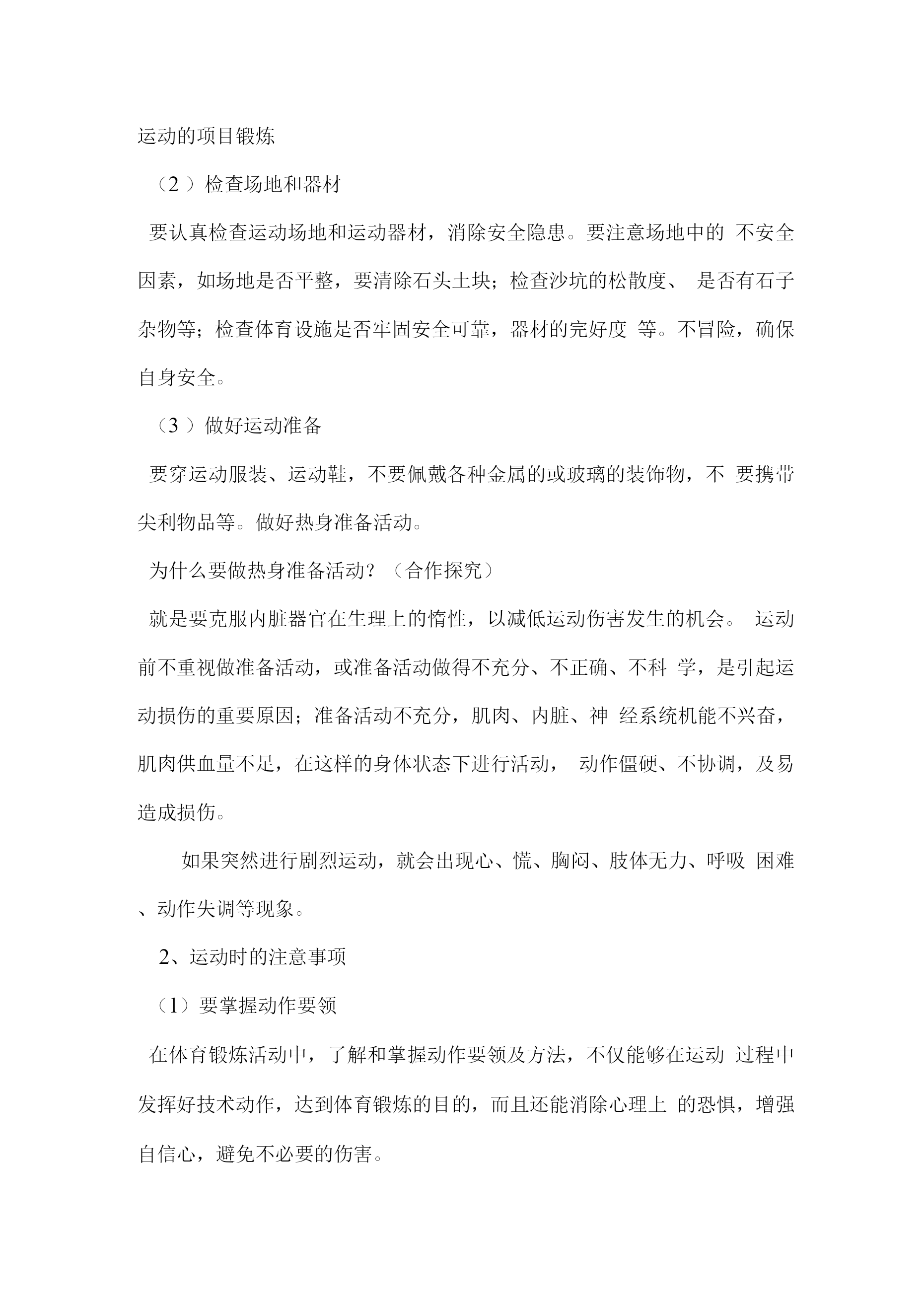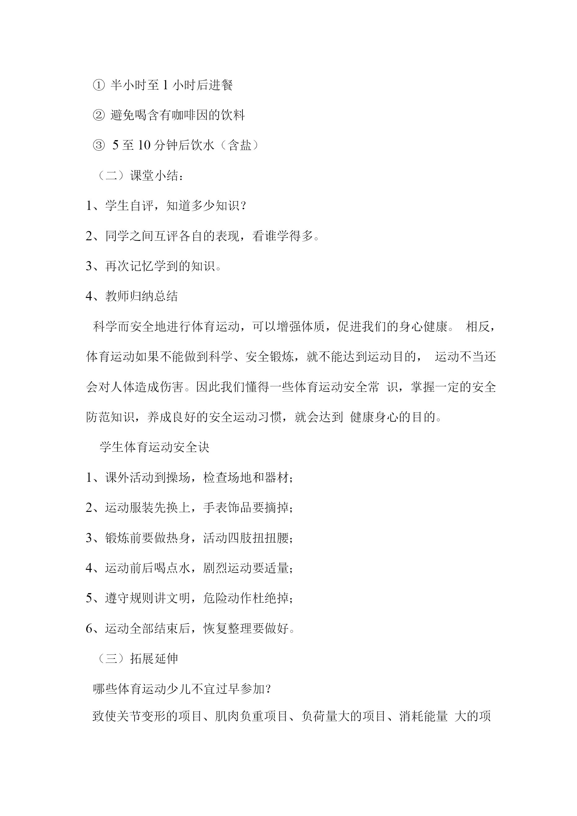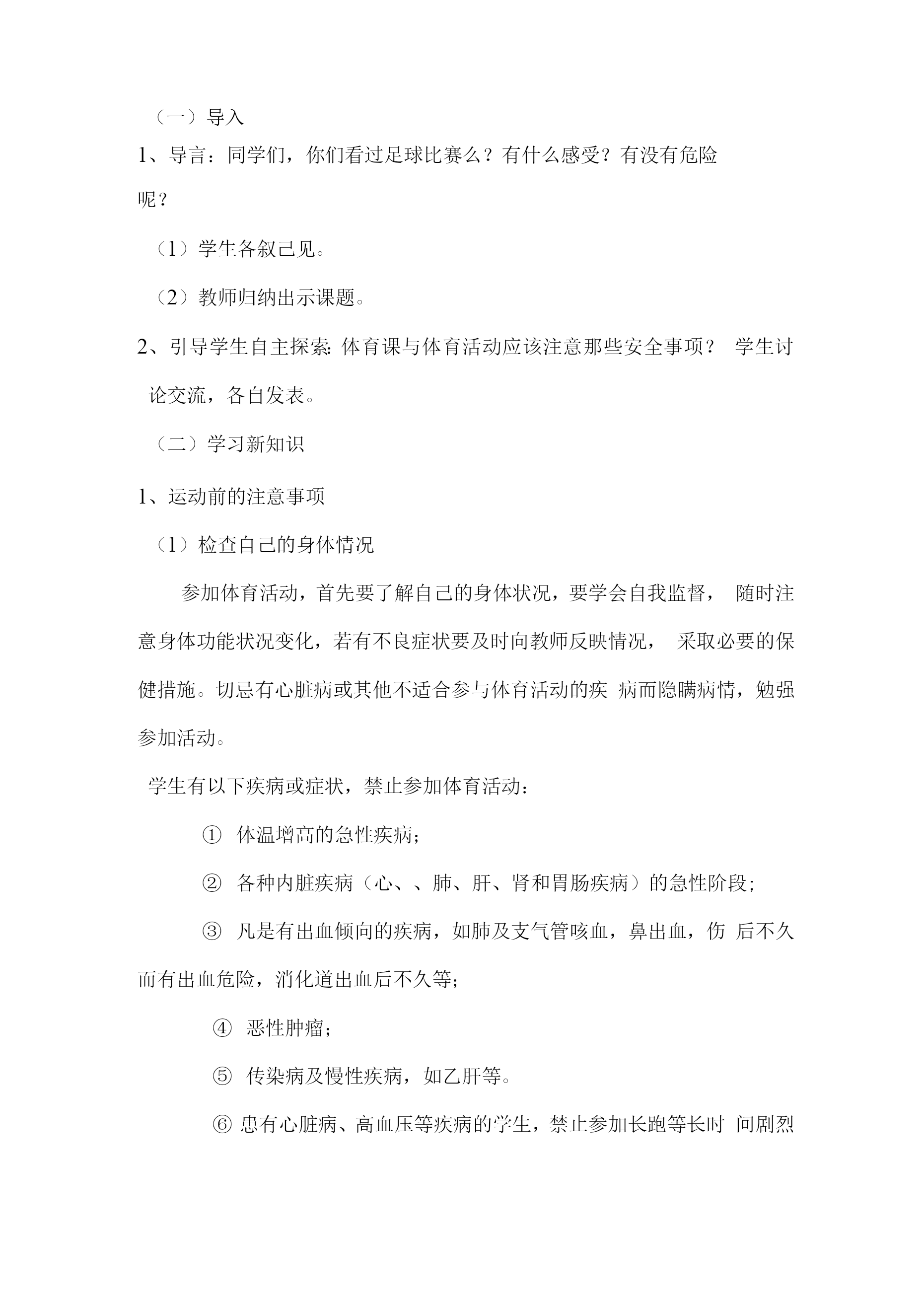 学生体育运动安全常识教案一、教学内容:学生体育运动安全常识二、教学目标1、认知目标:了解运动伤害事故的防范常识。2、技能目标:知道运动伤害事故的防范方法,学会一些科学锻炼身体的方法和自我保护的技能。3、情感目标:对安全科学的锻炼身体有认识,有自我保护意识。三、教学的重点、难点:重点:知道体育运动的安全注意事项。难点:体育运动安全意识得到深化,能在今后的体育活动中自发的运用。四、教法与学法:1、让学生自主探索、想象、发现、寻求答案。2、启发、诱导学生进入教学情景,以学生为主体,让学生结合自己的体育锻炼经验以及活动经历突出教学的重点和难点。五、课型:体育与健康室内理论研讨课六、教学时间:2018年3月5日七、教学课时:一课时八、教学过程:(一)导入1、导言:同学们,你们看过足球比赛么?有什么感受?有没有危险呢?(1)学生各叙己见。(2)教师归纳出示课题。2、引导学生自主探索:体育课与体育活动应该注意那些安全事项?学生讨论交流,各自发表。(二)学习新知识1、运动前的注意事项(1)检查自己的身体情况参加体育活动,首先要了解自己的身体状况,要学会自我监督,随时注意身体功能状况变化,若有不良症状要及时向教师反映情况,采取必要的保健措施。切忌有心脏病或其他不适合参与体育活动的疾病而隐瞒病情,勉强参加活动。学生有以下疾病或症状,禁止参加体育活动:体温增高的急性疾病;各种内脏疾病(心、、肺、肝、肾和胃肠疾病)的急性阶段;凡是有出血倾向的疾病,如肺及支气管咳血,鼻出血,伤后不久而有出血危险,消化道出血后不久等;恶性肿瘤;传染病及慢性疾病,如乙肝等。患有心脏病、高血压等疾病的学生,禁止参加长跑等长时间剧烈运动的项目锻炼(2)检查场地和器材要认真检查运动场地和运动器材,消除安全隐患。要注意场地中的不安全因素,如场地是否平整,要清除石头土块;检查沙坑的松散度、是否有石子杂物等;检查体育设施是否牢固安全可靠,器材的完好度等。不冒险,确保自身安全。(3)做好运动准备要穿运动服装、运动鞋,不要佩戴各种金属的或玻璃的装饰物,不要携带尖利物品等。做好热身准备活动。为什么要做热身准备活动?(合作探究)就是要克服内脏器官在生理上的惰性,以减低运动伤害发生的机会。运动前不重视做准备活动,或准备活动做得不充分、不正确、不科学,是引起运动损伤的重要原因;准备活动不充分,肌肉、内脏、神经系统机能不兴奋,肌肉供血量不足,在这样的身体状态下进行活动,动作僵硬、不协调,及易造成损伤。如果突然进行剧烈运动,就会出现心、慌、胸闷、肢体无力、呼吸困难、动作失调等现象。2、运动时的注意事项(1)要掌握动作要领在体育锻炼活动中,了解和掌握动作要领及方法,不仅能够在运动过程中发挥好技术动作,达到体育锻炼的目的,而且还能消除心理上的恐惧,增强自信心,避免不必要的伤害。(2)要正确使用器材要了解熟悉掌握器材的性能、功能及使用方法。要严格遵守相关操作规程,在一些体育器械(如铅球、实心球等)的使用中,要注意选择适当场地,确保自身安全,同时还要注意不要伤及他人安全。(3)运动负荷要适当。参加体育活动要根据身体素质条件,选择最有利于增强体质的运动负荷。可循序渐进,由易到难,从小到大。负荷过小,对身体作用不大;负荷过大,会损害身体;只有适宜的运动负荷,才能有效地增强体质,提高健康水平。3、运动后的注意事项(1)认真做恢复整理活动做恢复整理活动的目的就是使人体更好的从紧张运动状态过渡到安静状态,使心、脏逐渐恢复平静,放松身心。如果突然停止运动,就会造成暂时性的贫血,产生心、慌、晕倒等一系列不良现象,对身心健康造成损害。(2)自我检查运动反应如果感到十分疲劳,四肢酸沉,出现心、慌、头晕,说明运动负荷过大,需要好好调整与休息。运动后经过合理的休息感到全身舒服,精神愉快,体力充沛,食欲增加,睡眠良好,说明运动负荷安排比较合理。(3)适当补充能量参加体育运动要消耗大量的能量,所以在运动后(运动前也应适当补充能量)要科学饮食,保证身体的需要,确保取得最佳的锻炼效果。半小时至1小时后进餐避免喝含有咖啡因的饮料5至10分钟后饮水(含盐)(二)课堂小结:1、学生自评,知道多少知识?2、同学之间互评各自的表现,看谁学得多。3、再次记忆学到的知识。4、教师归纳总结科学而安全地进行体育运动,可以增强体质,促进我们的身心健康。相反,体育运动如果不能做到科学、安全锻炼,就不能达到运动目的,运动不当还会对人体造成伤害。因此我们懂得一些体育运动安全常识,掌握一定的安全防范知识,养成良好的安全运动习惯,就会达到健康身心的目的。学生体育运动安全诀1、课外活动到操场,检查场地和器材;2、运动服装先换上,手表饰品要