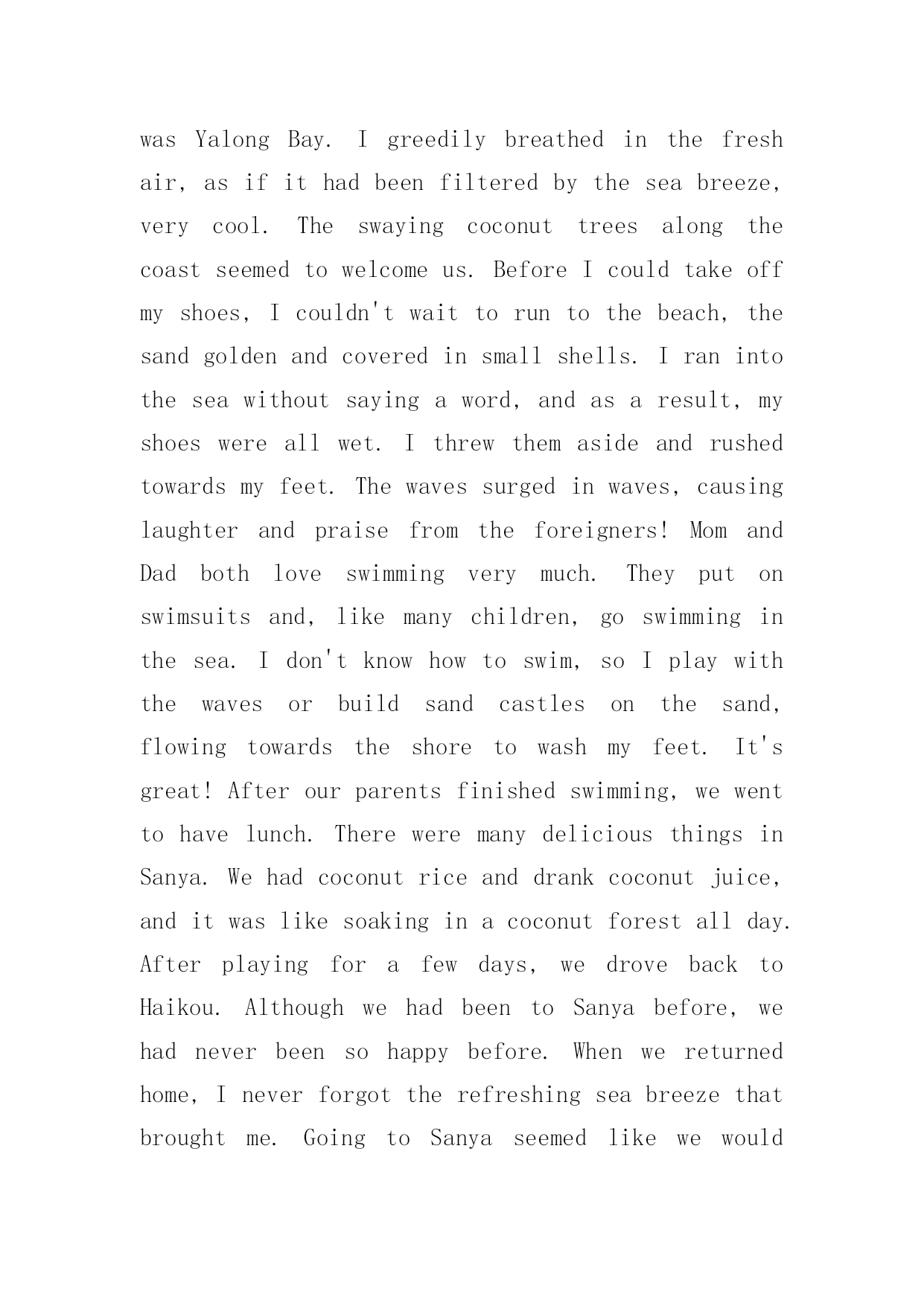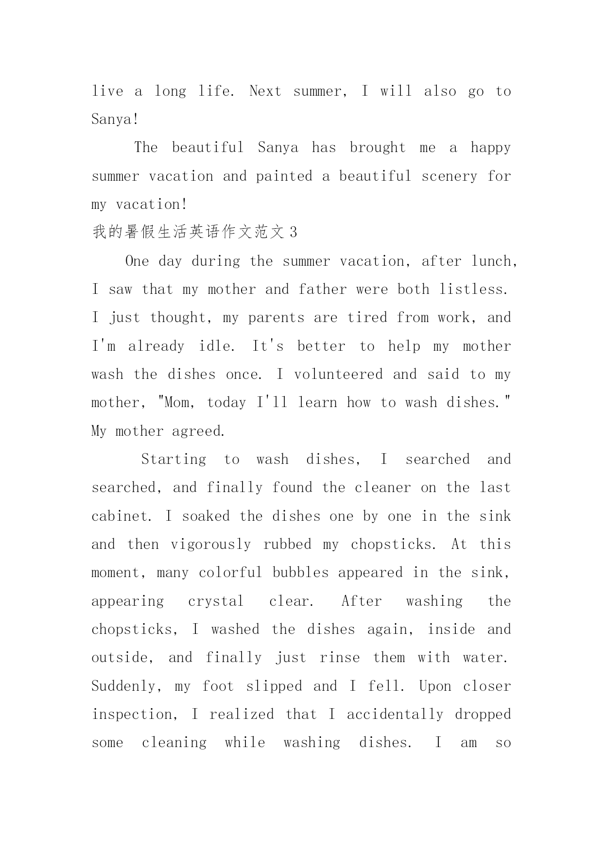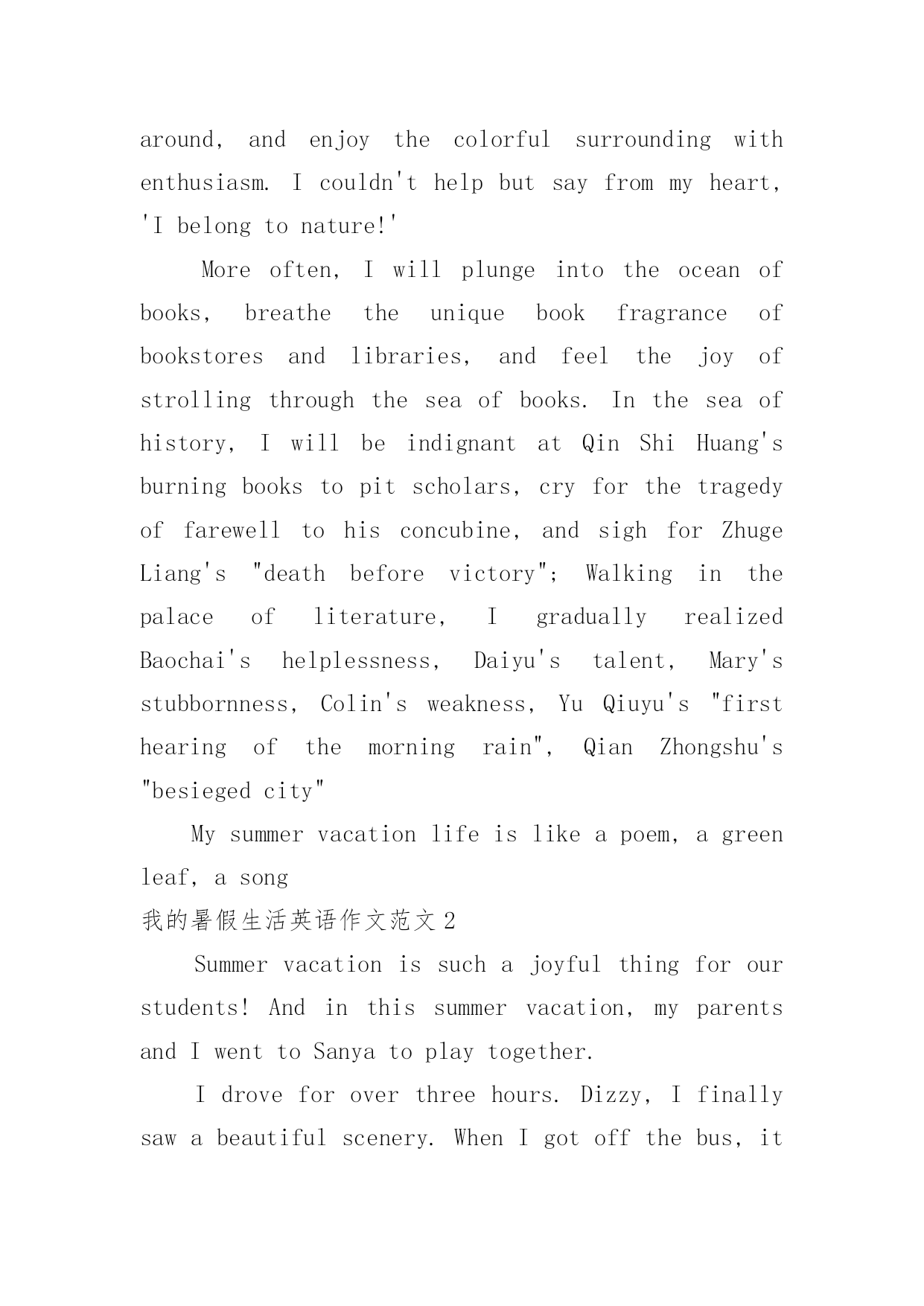我的暑假生活英语作文我的暑假生活英语作文范文在日复一日的学习、工作或生活中,大家都写过作文吧,通过作文可以把我们那些零零散散的思想,聚集在一块。相信很多朋友都对写作文感到非常苦恼吧,以下是小编整理的我的暑假生活英语作文范文,仅供参考,大家一起来看看吧。我的暑假生活英语作文范文1Inadditiontoatenseandfulfillingstudylife,Ialsohavearelaxedandenjoyableholidaylife.Therichandcolorfulcontenthasenrichedmylifeandaddedabitoffunandleisuretomychildishstudentlife.Goingforawalkafterteaanddinnerisacompulsorycourseformeeveryday.Walkingbesidetheflowersandplantsinthecommunity,breathingthefragranceoftheair,accompaniedbyflowersandbirds,enjoyingtherichroses,thepurityoflilies,thestrangeflowersfordinner,aswellasthedelicatebeautyofmagnolias,thegorgeousCannaindica,Iwillgentlysaytomyself:"Lifeisreallybeautiful."Isincerelyfeelthecolorfularound,andenjoythecolorfulsurroundingwithenthusiasm.Icouldn'thelpbutsayfrommyheart,'Ibelongtonature!'Moreoften,Iwillplungeintotheoceanofbooks,breathetheuniquebookfragranceofbookstoresandlibraries,andfeelthejoyofstrollingthroughtheseaofbooks.Intheseaofhistory,IwillbeindignantatQinShiHuang'sburningbookstopitscholars,cryforthetragedyoffarewelltohisconcubine,andsighforZhugeLiang's"deathbeforevictory";Walkinginthepalaceofliterature,IgraduallyrealizedBaochai'shelplessness,Daiyu'stalent,Mary'sstubbornness,Colin'sweakness,YuQiuyu's"firsthearingofthemorningrain",QianZhongshu's"besiegedcity"Mysummervacationlifeislikeapoem,agreenleaf,asong我的暑假生活英语作文范文2Summervacationissuchajoyfulthingforourstudents!Andinthissummervacation,myparentsandIwenttoSanyatoplaytogether.Idroveforoverthreehours.Dizzy,Ifinallysawabeautifulscenery.WhenIgotoffthebus,itwasYalongBay.Igreedilybreathedinthefreshair,asifithadbeenfilteredbytheseabreeze,verycool.Theswayingcoconuttreesalongthecoastseemedtowelcomeus.BeforeIcouldtakeoffmyshoes,Icouldn'twaittoruntothebeach,thesandgoldenandcoveredinsmallshells.Iranintotheseawithoutsayingaword,andasaresult,myshoeswereallwet.Ithrewthemasideandrushedtowardsmyfeet.Thewavessurgedinwaves,causinglaughterandpraisefromtheforeigners!MomandDadbothloveswimmingverymuch.Theyputonswimsuitsand,likemanychildren,goswi