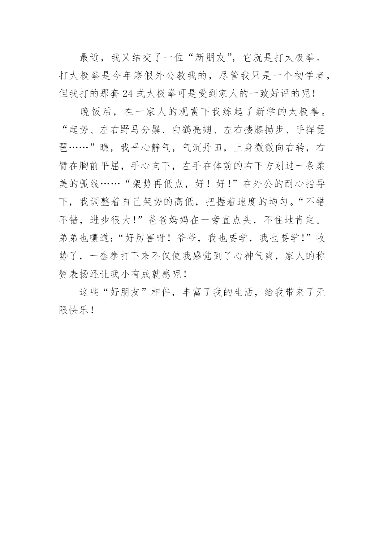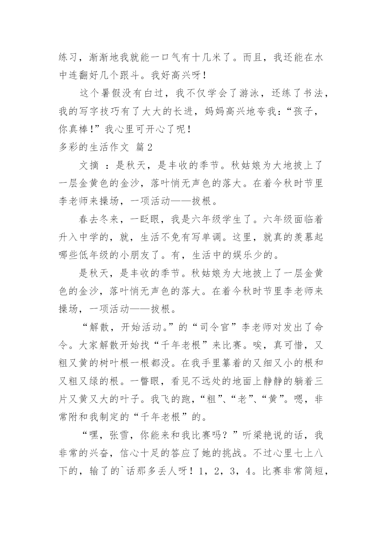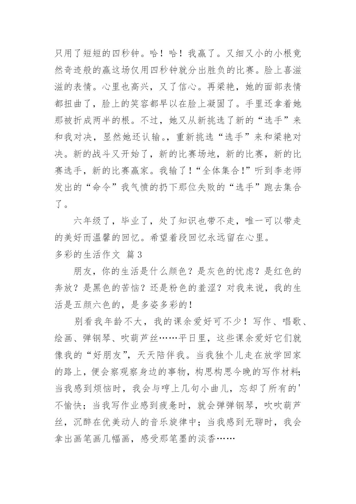 多彩的生活作文(荐)多彩的生活作文3篇在平平淡淡的日常中,大家或多或少都会接触过作文吧,通过作文可以把我们那些零零散散的思想,聚集在一块。如何写一篇有思想、有文采的作文呢?以下是小编帮大家整理的多彩的生活作文3篇,仅供参考,大家一起来看看吧。多彩的生活作文篇1一转眼,两个月的时间就这样在忙碌,充实,快乐中匆匆走过,快乐的暑假马上就要结束了。即使时间过得这样飞快,但我的收获很大。暑假生活漫长而短暂。如果每天无所事事,打发时间,那暑假就会显得很漫长;但是如果每天生活井井有条,忙碌充实,那么暑假就会显的很短暂。而我的暑假生活丰富多彩,开心快乐,还学会了一些有趣本领呢!暑假刚开始,我做完了当天的`作业,正愁没事做的时候,妈妈提议说:“天气这么热,不如就去游泳吧!”我高兴地拍了拍手,欢呼着说:“好呀好呀!”可转念一想:“可我不会呀”妈妈拍了拍我的肩膀,和蔼的说:“谁都不是天生就会的,要自信一些!”就这样我和妈妈去挑选了游泳装备,开始了学游泳这项本领。一开始我甚至不敢下水,可是看着妈妈在岸上和蔼的笑脸,我信心倍增。认真向老师学习憋气的技巧和方法。鼓起了勇气,一开始我只能游一两米左右。可是我每天都坚持去练习,渐渐地我就能一口气有十几米了。而且,我还能在水中连翻好几个跟斗。我好高兴呀!这个暑假没有白过,我不仅学会了游泳,还练了书法,我的写字技巧有了大大的长进,妈妈高兴地夸我:“孩子,你真棒!”我心里可开心了呢!多彩的生活作文篇2文摘:是秋天,是丰收的季节。秋姑娘为大地披上了一层金黄色的金沙,落叶悄无声色的落大。在着今秋时节里李老师来操场,一项活动——拔根。春去冬来,一眨眼,我是六年级学生了。六年级面临着升入中学的,就,生活不免有写单调。这里,就真的羡慕起哪些低年级的小朋友了。有,生活中的娱乐少的。是秋天,是丰收的季节。秋姑娘为大地披上了一层金黄色的金沙,落叶悄无声色的落大。在着今秋时节里李老师来操场,一项活动——拔根。“解散,开始活动。”的“司令官”李老师对发出了命令。大家解散开始找“千年老根”来比赛。唉,真可惜,又粗又黄的树叶根一根都没。在我手里纂着的又细又小的根和又粗又绿的根。一瞥眼,看见不远处的地面上静静的躺着三片又黄又大的叶子。我飞的跑,“粗”、“老”、“黄”。嗯,非常附和我制定的“千年老根”的。“嘿,张雪,你能来和我比赛吗?”听梁艳说的话,我非常的兴奋,信心十足的答应了她的挑战。不过心里七上八下的,输了的`话那多丢人呀!1,2,3,4。比赛非常简短,只用了短短的四秒钟。哈!哈!我赢了。又细又小的小根竟然奇迹般的赢这场仅用四秒钟就分出胜负的比赛。脸上喜滋滋的表情。心里也高兴,又了信心。再梁艳,她的面部表情都扭曲了,脸上的笑容都早以在脸上凝固了。手里还拿着她那被折成两半的根。不过,她又从新挑选了新的“选手”来和我对决,显然她还认输。,重新挑选“选手”来和梁艳对决。新的战斗又开始了,新的比赛场地,新的比赛,新的比赛选手,新的比赛赢家。我输了!“全体集合!”听到李老师发出的“命令”我气愤的扔下那位失败的“选手”跑去集合了。六年级了,毕业了,处了知识也带不走,唯一可以带走的美好而温馨的回忆。希望着段回忆永远留在心里。多彩的生活作文篇3朋友,你的生活是什么颜色?是灰色的忧虑?是红色的奔放?是黑色的苦恼?还是粉色的羞涩?对我来说,我的生活是五颜六色的,是多姿多彩的!别看我年龄不大,我的课余爱好可不少!写作、唱歌、绘画、弹钢琴、吹葫芦丝……平日里,这些课余爱好它们就像我的“好朋友”,天天陪伴我。当我独个儿走在放学回家的路上,便会察观察身边的事物,构思构思今晚的写作材料;当我感到烦恼时,我会与哼上几句小曲儿,忘却了所有的'不愉快;当我写作业感到疲惫时,就会弹弹钢琴,吹吹葫芦丝,沉醉在优美动人的音乐旋律中;当我感到无聊时,我会拿出画笔画几幅画,感受那笔墨的淡香……最近,我又结交了一位“新朋友”,它就是打太极拳。打太极拳是今年寒假外公教我的,尽管我只是一个初学者,但我打的那套24式太极拳可是受到家人的一致好评的呢!晚饭后,在一家人的观赏下我练起了新学的太极拳。“起势、左右野马分鬃、白鹤亮翅、左右搂膝拗步、手挥琵琶……”瞧,我平心静气,气沉丹田,上身微微向右转,右臂在胸前平屈,手心向下,左手在体前的右下方划过一条柔美的弧线……“架势再低点,好!好!”在外公的耐心指导下,我调整着自己架势的高低,把握着速度的均匀。“不错不错,进步很大!”爸爸妈妈在一旁直点头,不住地肯定。弟弟也嚷道:“好厉害呀!爷爷,我也要学,我也要学!”收势了,一套拳打下来不仅使我感觉到了心神气爽,家人的称赞表扬还让我小有成就感呢!这些“好朋友”相伴,丰富了我的生活,给我带来了无限快乐!