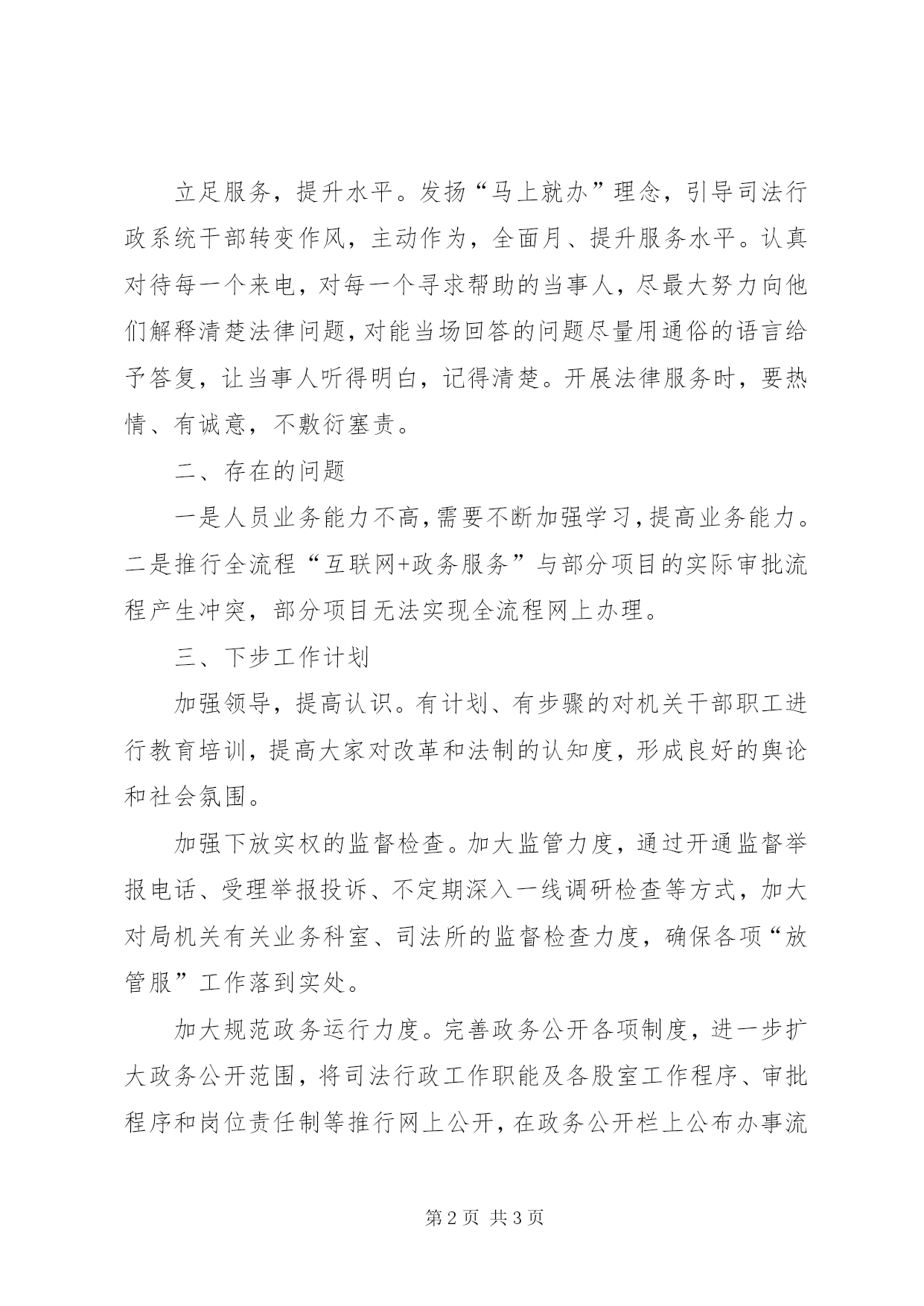第PAGE\*Arabic\*MERGEFORMAT3页共NUMPAGES\*MERGEFORMAT3页司法局“放管服”工作推进汇报目前,我局简政放权、放管结合、优化服务改革工作在有序推进中已初见成效,现将工作推进情况汇报如下:一、工作进展成效积极动员,统一部署。建立简政放权、放管结合、优化服务改革工作领导小组,局主要领导任组长,分管领导任副组长,各股室负责人为成员。领导小组要及时研究“放管服”中的重点难点问题。建立“放管服”协调工作机制,明确责任分工,抓好改革任务的落实,要做好改革经验总结推广和宣传引导工作,及时回应社会关切。加大宣传,营造氛围。深刻认识推行“放管服”工作的重大意义,进一步增强责任感和紧迫感,充分利用局微信工作交流群、政务公开栏等宣传阵地,广泛宣传“放管服”理念,公开承诺,充分展示机关干部的崭新风貌,树立机关良好形象。理顺关系,分清职责。开展理清行政权责和编制权责清单工作。根据法律、法规、规章等规范性文件赋予司法行政部门的权责情况,结合我县实际,对本局各科室以及下属事业单位的行政权责进行全面梳理。力求通过全面梳理,进一步理清司法行政职能,规范权力运行,更好履行各项职能。巴“放管服”工作与党风廉政工作有机结合,加大作风建设力度,不断提升工作人员业务能力和服务水平,积极促进“放管服”工作取得实效。立足服务,提升水平。发扬“马上就办”理念,引导司法行政系统干部转变作风,主动作为,全面月、提升服务水平。认真对待每一个来电,对每一个寻求帮助的当事人,尽最大努力向他们解释清楚法律问题,对能当场回答的问题尽量用通俗的语言给予答复,让当事人听得明白,记得清楚。开展法律服务时,要热情、有诚意,不敷衍塞责。二、存在的问题一是人员业务能力不高,需要不断加强学习,提高业务能力。二是推行全流程“互联网+政务服务”与部分项目的实际审批流程产生冲突,部分项目无法实现全流程网上办理。三、下步工作计划加强领导,提高认识。有计划、有步骤的对机关干部职工进行教育培训,提高大家对改革和法制的认知度,形成良好的舆论和社会氛围。加强下放实权的监督检查。加大监管力度,通过开通监督举报电话、受理举报投诉、不定期深入一线调研检查等方式,加大对局机关有关业务科室、司法所的监督检查力度,确保各项“放管服”工作落到实处。加大规范政务运行力度。完善政务公开各项制度,进一步扩大政务公开范围,将司法行政工作职能及各股室工作程序、审批程序和岗位责任制等推行网上公开,在政务公开栏上公布办事流程,公布审批和服务事项办理承诺,明确办事责任主体、条件、标准范围、办理时限、监督渠道等内容,坚持“该公开就公开,能公开就公开”。