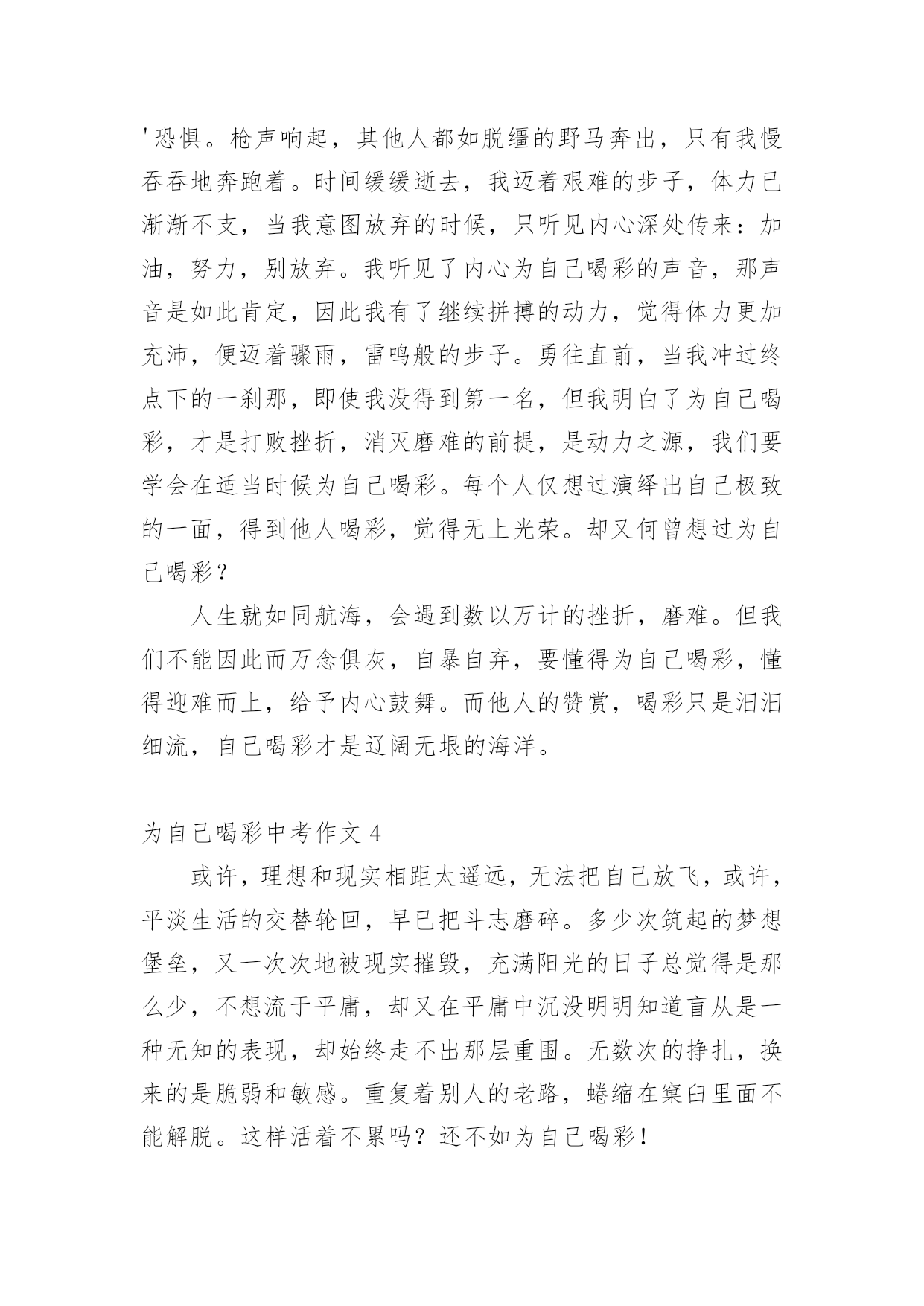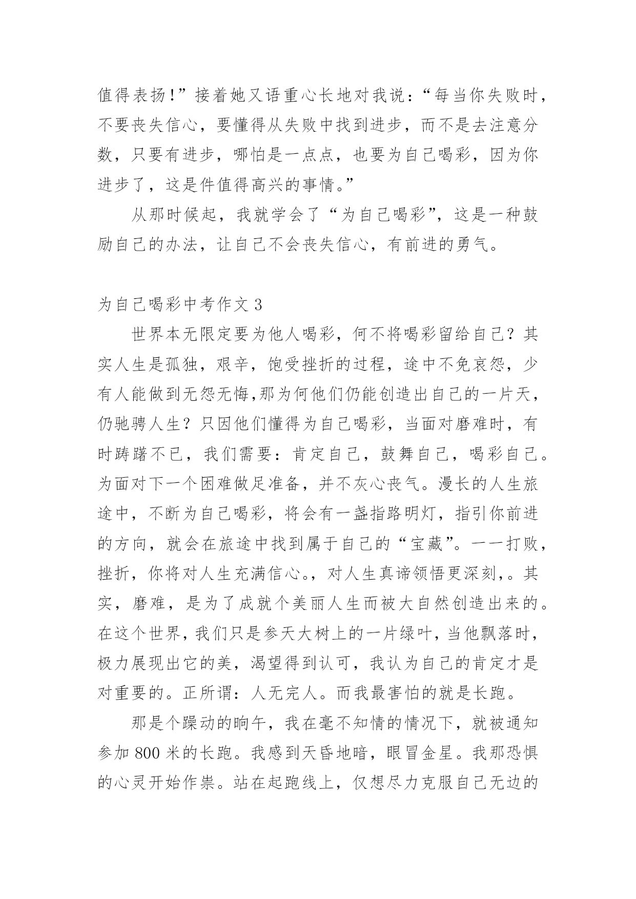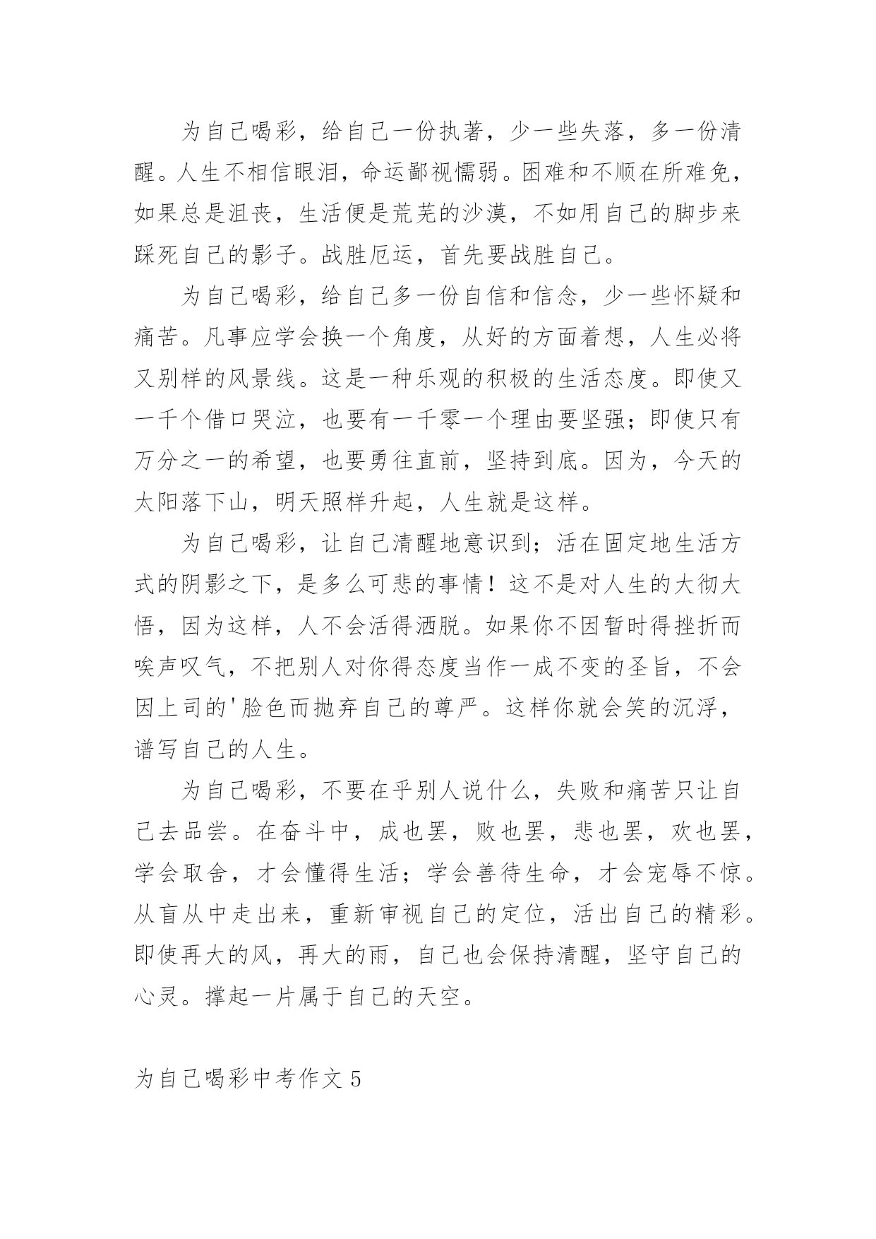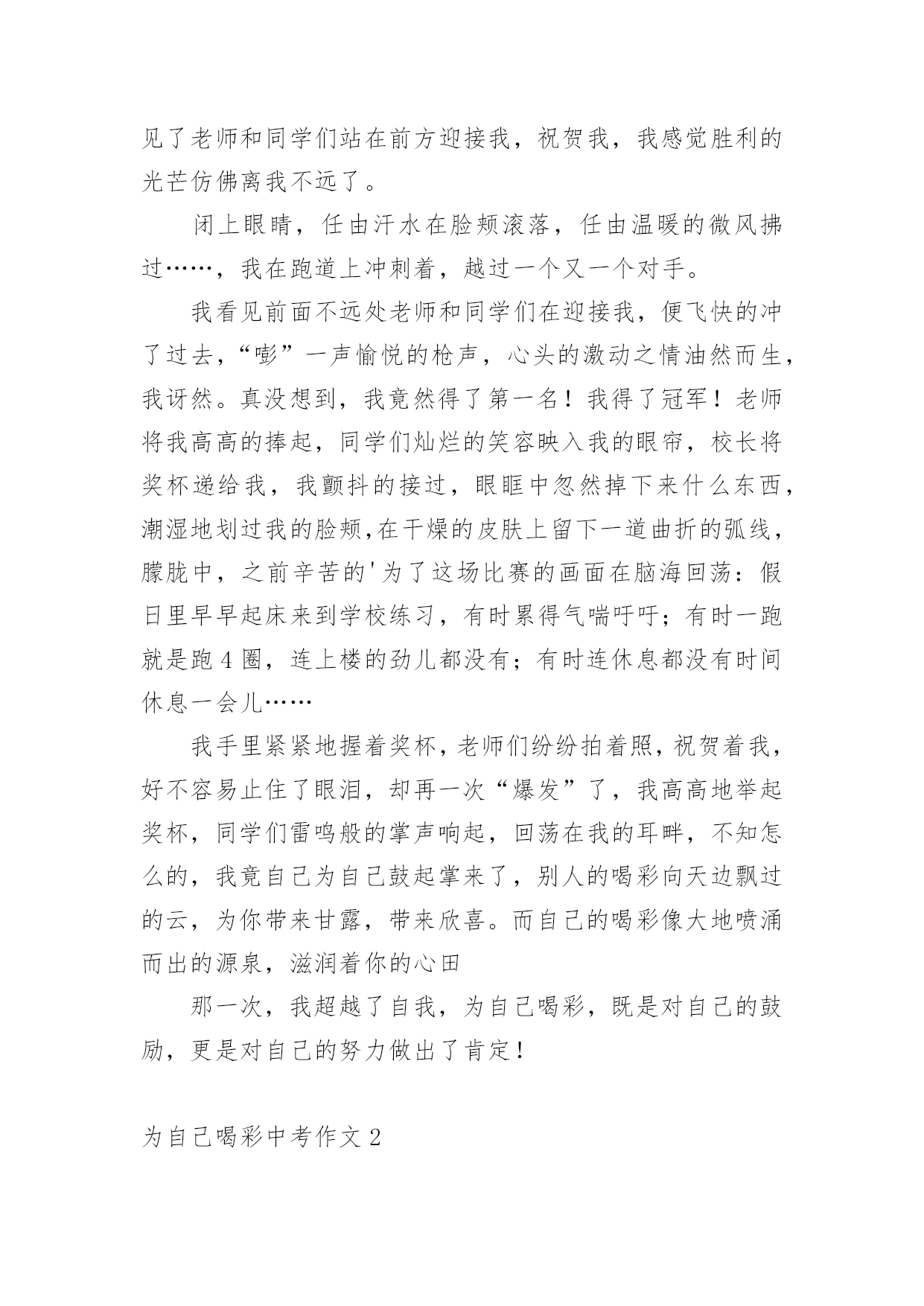 为自己喝彩中考作文在日复一日的学习、工作或生活中,大家最不陌生的就是作文了吧,通过作文可以把我们那些零零散散的思想,聚集在一块。那么问题来了,到底应如何写一篇优秀的作文呢?以下是小编为大家收集的为自己喝彩中考作文,欢迎阅读,希望大家能够喜欢。为自己喝彩中考作文1山有山的巍峨,水有水的宽阔,月有月的圆缺,每个人都自己的“闪光点”,不要总低着头看自己,却抬头仰视别的光彩,因而失去了展现自己的舞台,失去了本应属于自的鲜花与掌声,失去了为自己喝彩的机会,要学会相信自己,就让我们大声地为自己喝彩吧!望着桌上那一座金色的奖杯,我会心一笑,那一幕幕如放电影般在脑海浮现…。愉快的一个早晨,学校将迎来一年一度的800米女子比赛。我怀着激动与兴奋的心情来到了跑场,现在正是选手们准备的时候,同学们用那几十分贝的高调在为我加油着,没错,我就是参赛者中的一员,老师也在为我加油!望着他们这番热情,我怎能辜负呢?所以,我一定要拿冠军!“请选手们各就各位!”裁判老师吹响了口哨,我们如同饥饿的狼看见羊似的,拼命地在跑道上飞奔着。望着后面被我落下的队员们,我的心一下子兴奋到了极点,我仿佛看见了老师和同学们站在前方迎接我,祝贺我,我感觉胜利的光芒仿佛离我不远了。闭上眼睛,任由汗水在脸颊滚落,任由温暖的微风拂过……,我在跑道上冲刺着,越过一个又一个对手。我看见前面不远处老师和同学们在迎接我,便飞快的冲了过去,“嘭”一声愉悦的枪声,心头的激动之情油然而生,我讶然。真没想到,我竟然得了第一名!我得了冠军!老师将我高高的捧起,同学们灿烂的笑容映入我的眼帘,校长将奖杯递给我,我颤抖的接过,眼眶中忽然掉下来什么东西,潮湿地划过我的脸颊,在干燥的皮肤上留下一道曲折的弧线,朦胧中,之前辛苦的'为了这场比赛的画面在脑海回荡:假日里早早起床来到学校练习,有时累得气喘吁吁;有时一跑就是跑4圈,连上楼的劲儿都没有;有时连休息都没有时间休息一会儿……我手里紧紧地握着奖杯,老师们纷纷拍着照,祝贺着我,好不容易止住了眼泪,却再一次“爆发”了,我高高地举起奖杯,同学们雷鸣般的掌声响起,回荡在我的耳畔,不知怎么的,我竟自己为自己鼓起掌来了,别人的喝彩向天边飘过的云,为你带来甘露,带来欣喜。而自己的喝彩像大地喷涌而出的源泉,滋润着你的心田那一次,我超越了自我,为自己喝彩,既是对自己的鼓励,更是对自己的努力做出了肯定!为自己喝彩中考作文2每个人都有失败的时候,不同的人在面对失败的时候也会有不同的表现。有的.人会嫉妒成功的人,想:哼!这有什么了不起?不过是碰巧罢了!但这样想是不对的,失败的人应该从自己身上找问题,而不是去嫉妒别人,从别人身上找问题。无论怎样,只要发现自己有一点进步,那就是值得高兴的,值得为自己喝彩的。有一次考数学,我试卷没做完就收卷了,应用题全部没做,我想:完了!这回完了!说不定连八十分都没了!我以前可是经常考一百分的。这回考砸了,还不得被骂死!我在忐忑不安中度过了一个上午,下午老师就发了试卷。我拿到试卷后,一看分数,顿时如坠冰窟:83。5!我竟然只考了83。5!虽然我早就料到了会考很差,但这对我来说还是个巨大的打击,我从未考过这么低分。我的心情特别不好,试卷也不看,就趴在桌子上一声不出。如果有谁现在来和我说话,我一定会跳起来指着他的鼻子将他大骂一顿并以此出气,可惜没有人和我说话,我也只好罢就。整个下午的课我都没听进去。我在想,在想回家后是否要告诉妈妈成绩,是否又要挨一顿臭骂……我就这么走到了家门口,硬着头皮开了门走了进去,将分数告诉了妈妈。原以为劈头盖脸就是一顿臭骂,没想到迎接我的却是妈妈柔和的声音:“这次考试知道自己错在哪里吗?”我一时语塞,我连试卷都没看过,怎么可能知道自己错在哪里?我从书包里拿出试卷,胆战心惊地交给妈妈。妈妈仔细地看了一会儿后,说:“不错嘛!除了没做的应用题外,其它题全部做对,值得表扬!”接着她又语重心长地对我说:“每当你失败时,不要丧失信心,要懂得从失败中找到进步,而不是去注意分数,只要有进步,哪怕是一点点,也要为自己喝彩,因为你进步了,这是件值得高兴的事情。”从那时候起,我就学会了“为自己喝彩”,这是一种鼓励自己的办法,让自己不会丧失信心,有前进的勇气。为自己喝彩中考作文3世界本无限定要为他人喝彩,何不将喝彩留给自己?其实人生是孤独,艰辛,饱受挫折的过程,途中不免哀怨,少有人能做到无怨无悔,那为何他们仍能创造出自己的一片天,仍驰骋人生?只因他们懂得为自己喝彩,当面对磨难时,有时踌躇不已,我们需要:肯定自己,鼓舞自己,喝彩自己。为面对下一个困难做足准备,并不灰心丧气。漫长的人生旅途中,不断为自己喝彩,将会有一盏指路明灯,指引你前进的方向,就会在旅途中找到属于自己的“宝藏”。一一打败,挫折,你将对人生充满信心。,对人生真谛领悟更深刻,。其实,磨难,是为了成就个