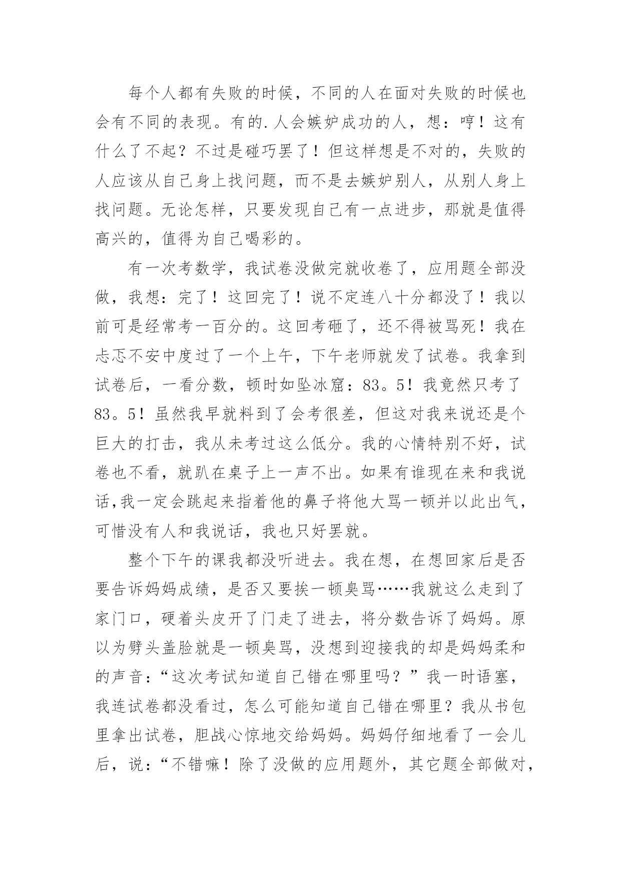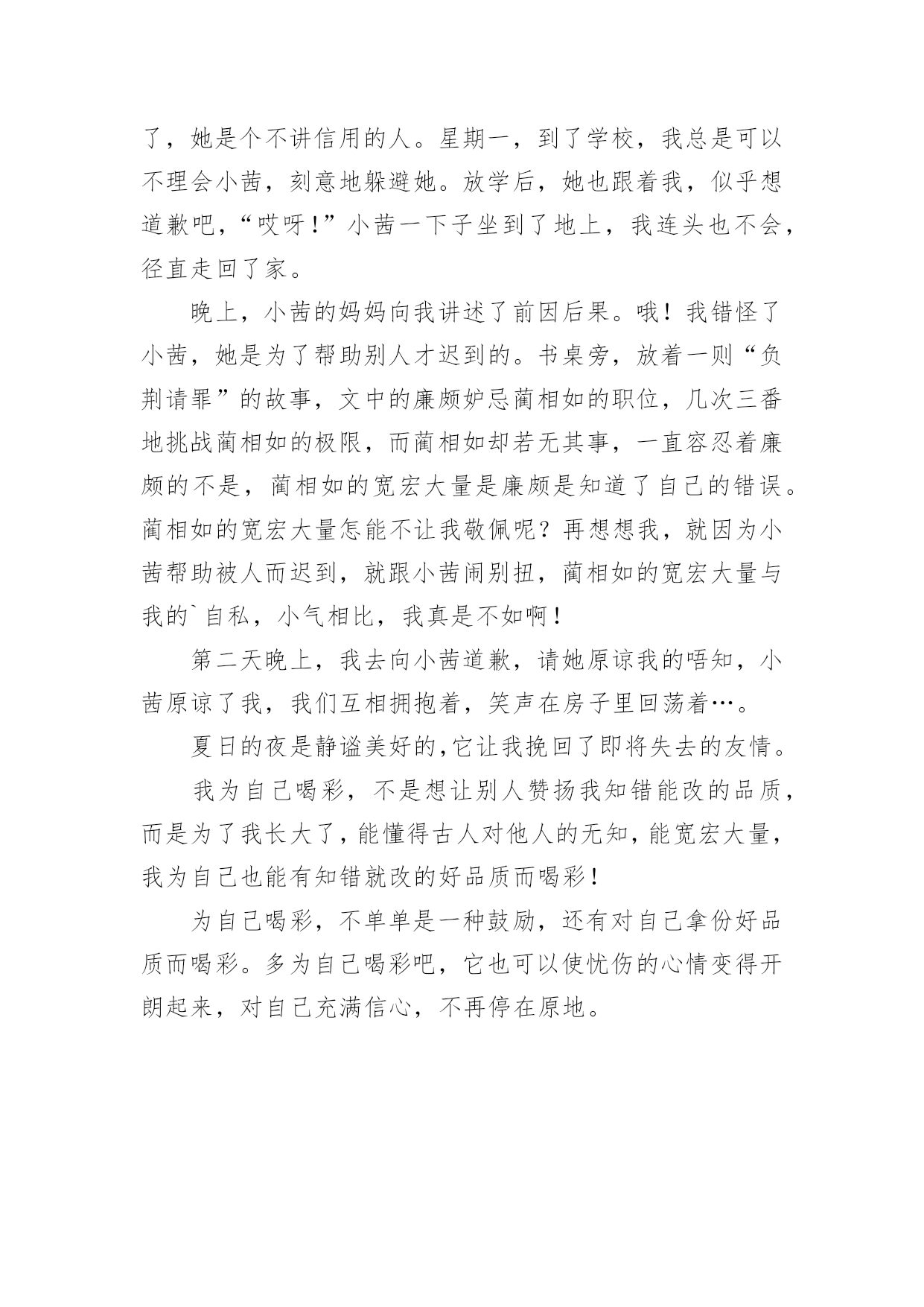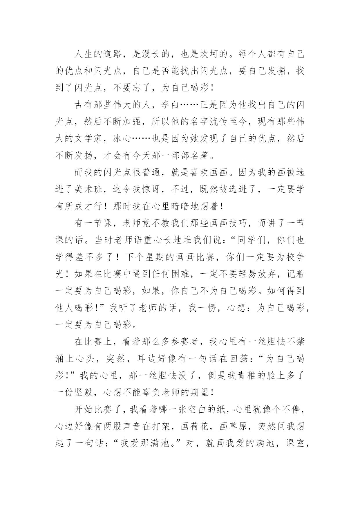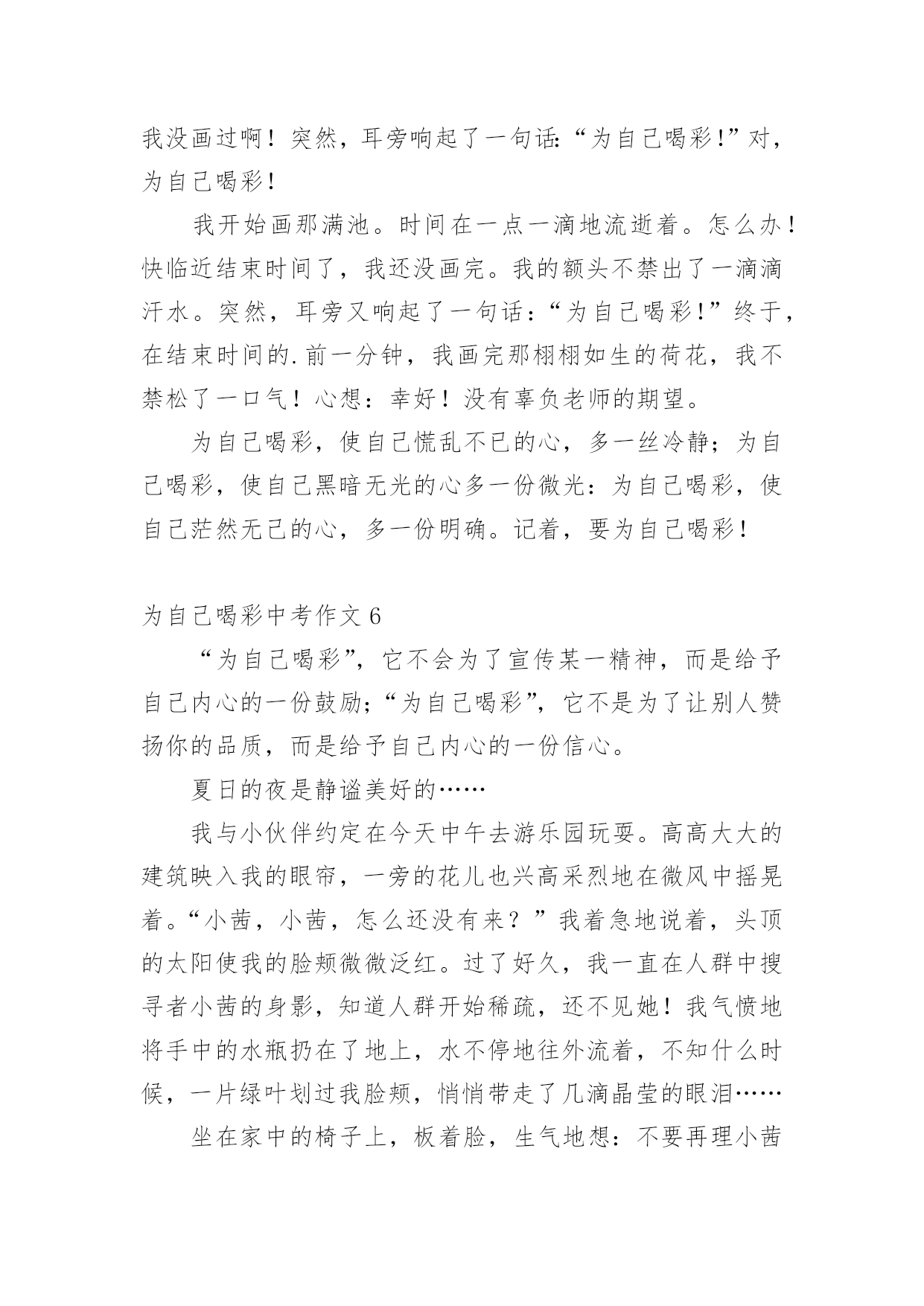 为自己喝彩中考作文在日复一日的学习、工作或生活中,大家最不陌生的就是作文了吧,通过作文可以把我们那些零零散散的思想,聚集在一块。那么问题来了,到底应如何写一篇优秀的作文呢?以下是小编为大家收集的为自己喝彩中考作文,欢迎阅读,希望大家能够喜欢。为自己喝彩中考作文1山有山的巍峨,水有水的宽阔,月有月的圆缺,每个人都自己的“闪光点”,不要总低着头看自己,却抬头仰视别的光彩,因而失去了展现自己的舞台,失去了本应属于自的鲜花与掌声,失去了为自己喝彩的机会,要学会相信自己,就让我们大声地为自己喝彩吧!望着桌上那一座金色的奖杯,我会心一笑,那一幕幕如放电影般在脑海浮现…。愉快的一个早晨,学校将迎来一年一度的800米女子比赛。我怀着激动与兴奋的心情来到了跑场,现在正是选手们准备的时候,同学们用那几十分贝的高调在为我加油着,没错,我就是参赛者中的一员,老师也在为我加油!望着他们这番热情,我怎能辜负呢?所以,我一定要拿冠军!“请选手们各就各位!”裁判老师吹响了口哨,我们如同饥饿的狼看见羊似的,拼命地在跑道上飞奔着。望着后面被我落下的队员们,我的心一下子兴奋到了极点,我仿佛看见了老师和同学们站在前方迎接我,祝贺我,我感觉胜利的光芒仿佛离我不远了。闭上眼睛,任由汗水在脸颊滚落,任由温暖的微风拂过……,我在跑道上冲刺着,越过一个又一个对手。我看见前面不远处老师和同学们在迎接我,便飞快的冲了过去,“嘭”一声愉悦的枪声,心头的激动之情油然而生,我讶然。真没想到,我竟然得了第一名!我得了冠军!老师将我高高的捧起,同学们灿烂的笑容映入我的眼帘,校长将奖杯递给我,我颤抖的接过,眼眶中忽然掉下来什么东西,潮湿地划过我的脸颊,在干燥的皮肤上留下一道曲折的弧线,朦胧中,之前辛苦的'为了这场比赛的画面在脑海回荡:假日里早早起床来到学校练习,有时累得气喘吁吁;有时一跑就是跑4圈,连上楼的劲儿都没有;有时连休息都没有时间休息一会儿……我手里紧紧地握着奖杯,老师们纷纷拍着照,祝贺着我,好不容易止住了眼泪,却再一次“爆发”了,我高高地举起奖杯,同学们雷鸣般的掌声响起,回荡在我的耳畔,不知怎么的,我竟自己为自己鼓起掌来了,别人的喝彩向天边飘过的云,为你带来甘露,带来欣喜。而自己的喝彩像大地喷涌而出的源泉,滋润着你的心田那一次,我超越了自我,为自己喝彩,既是对自己的鼓励,更是对自己的努力做出了肯定!为自己喝彩中考作文2每个人都有失败的时候,不同的人在面对失败的时候也会有不同的表现。有的.人会嫉妒成功的人,想:哼!这有什么了不起?不过是碰巧罢了!但这样想是不对的,失败的人应该从自己身上找问题,而不是去嫉妒别人,从别人身上找问题。无论怎样,只要发现自己有一点进步,那就是值得高兴的,值得为自己喝彩的。有一次考数学,我试卷没做完就收卷了,应用题全部没做,我想:完了!这回完了!说不定连八十分都没了!我以前可是经常考一百分的。这回考砸了,还不得被骂死!我在忐忑不安中度过了一个上午,下午老师就发了试卷。我拿到试卷后,一看分数,顿时如坠冰窟:83。5!我竟然只考了83。5!虽然我早就料到了会考很差,但这对我来说还是个巨大的打击,我从未考过这么低分。我的心情特别不好,试卷也不看,就趴在桌子上一声不出。如果有谁现在来和我说话,我一定会跳起来指着他的鼻子将他大骂一顿并以此出气,可惜没有人和我说话,我也只好罢就。整个下午的课我都没听进去。我在想,在想回家后是否要告诉妈妈成绩,是否又要挨一顿臭骂……我就这么走到了家门口,硬着头皮开了门走了进去,将分数告诉了妈妈。原以为劈头盖脸就是一顿臭骂,没想到迎接我的却是妈妈柔和的声音:“这次考试知道自己错在哪里吗?”我一时语塞,我连试卷都没看过,怎么可能知道自己错在哪里?我从书包里拿出试卷,胆战心惊地交给妈妈。妈妈仔细地看了一会儿后,说:“不错嘛!除了没做的应用题外,其它题全部做对,值得表扬!”接着她又语重心长地对我说:“每当你失败时,不要丧失信心,要懂得从失败中找到进步,而不是去注意分数,只要有进步,哪怕是一点点,也要为自己喝彩,因为你进步了,这是件值得高兴的事情。”从那时候起,我就学会了“为自己喝彩”,这是一种鼓励自己的办法,让自己不会丧失信心,有前进的勇气。为自己喝彩中考作文3世界本无限定要为他人喝彩,何不将喝彩留给自己?其实人生是孤独,艰辛,饱受挫折的过程,途中不免哀怨,少有人能做到无怨无悔,那为何他们仍能创造出自己的一片天,仍驰骋人生?只因他们懂得为自己喝彩,当面对磨难时,有时踌躇不已,我们需要:肯定自己,鼓舞自己,喝彩自己。为面对下一个困难做足准备,并不灰心丧气。漫长的人生旅途中,不断为自己喝彩,将会有一盏指路明灯,指引你前进的方向,就会在旅途中找到属于自己的“宝藏”。一一打败,挫折,你将对人生充满信心。,对人生真谛领悟更深刻,。其实,磨难,是为了成就个
