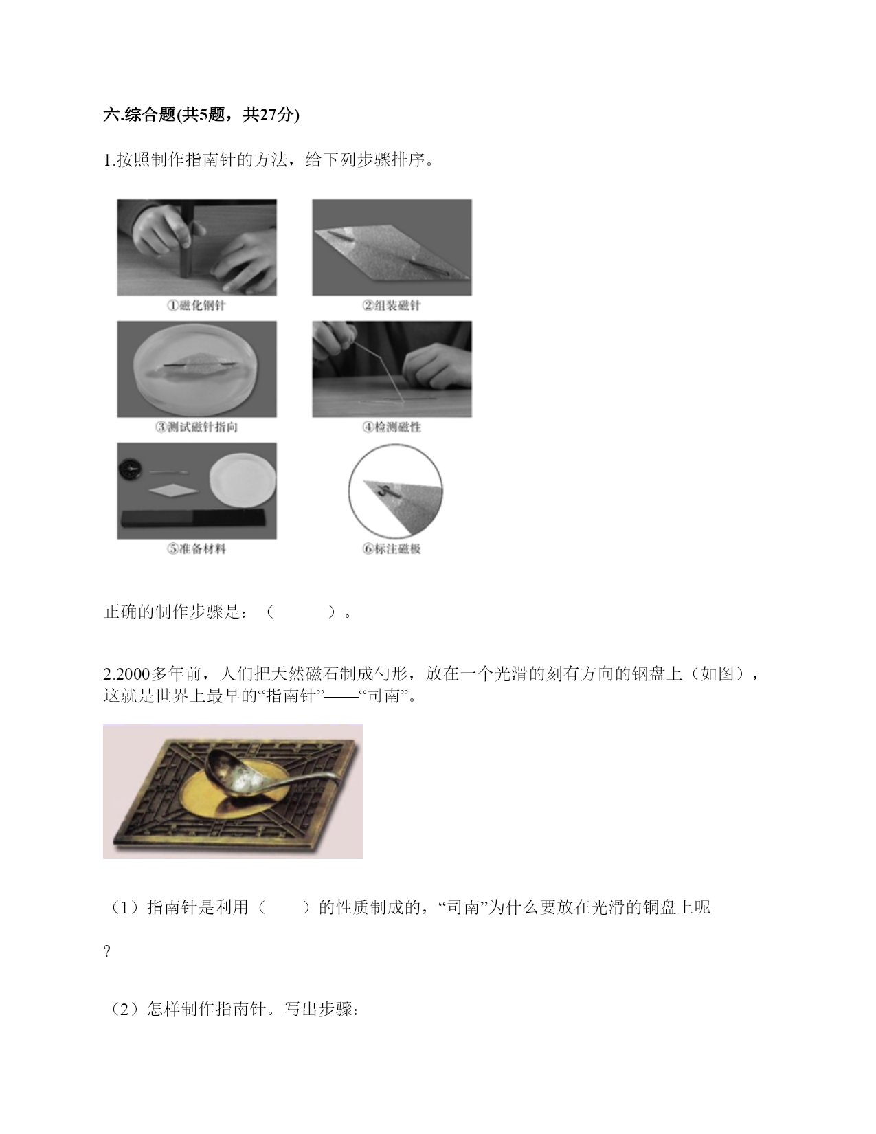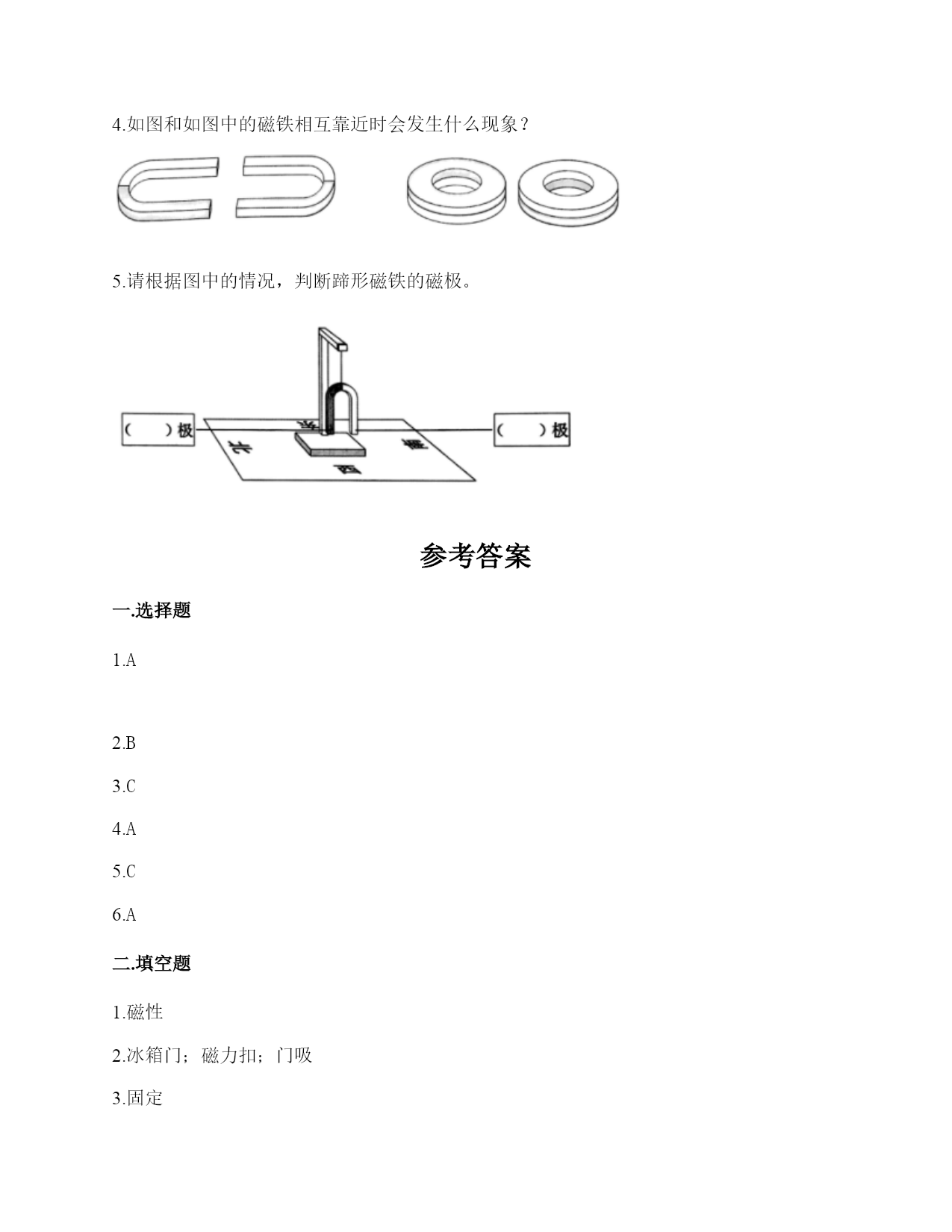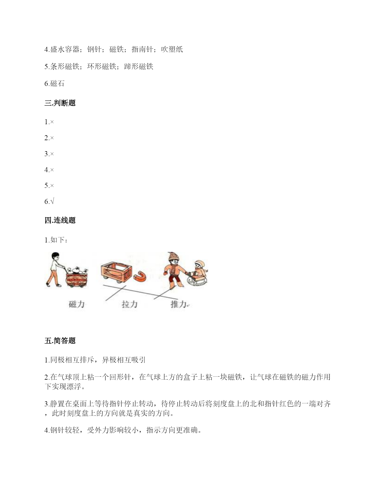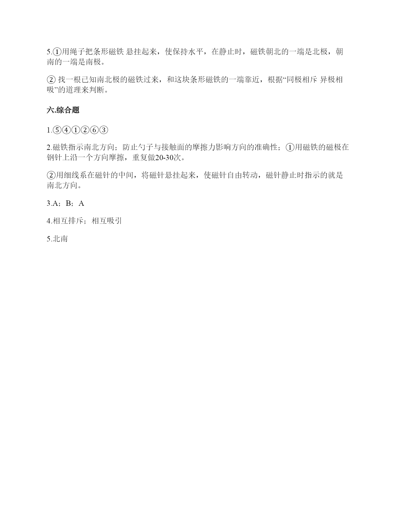 小学科学《磁铁》练习题一.选择题(共6题,共12分)1.在条形磁铁中间的上面放一个钢珠,钢珠会()。A.滚向其中的一端B.保持静止C.来回滚动2.下列事物中没有用到磁铁的是()。A.B.C.3.下列物体中,()没有用到磁铁。A.B.C.4.用推力、拉力和磁铁使小车运动,它们的主要区别是()。A.推力和拉力需要接触磁力不需要接触B.推力和拉力不需要接触,磁力需要接触C.拉力需要接触,推力和磁力不需要接触5.把一颗小钢珠放在磁性比较强的蹄形磁铁上,松开手,可能发生的现象是()。A.小钢珠不动B.小钢珠会掉下来C.小钢珠会滚向蹄形磁铁的磁极部位6.指南针是利用磁铁什么性质制成的?()A.磁铁能指示南北方向的特点B.隔空吸物的特点C.吸铁的特点二.填空题(共6题,共28分)1.磁铁能吸引物体的性质叫()。2.写出三种生活中含有磁铁的物品:()、()、()。3.一般情况下,磁铁的磁力大小是()的。4.完成水浮式指南针需要用到()、()、()、()、()等材料。5.写出三种不同形状的磁铁的名字:()、()、()。6.天然磁铁又叫()。三.判断题(共6题,共12分)1.拉力和磁力都可以驱动木质的小车。()2.把两个完全相同的磁铁吸在一起,磁力会增大一些,但不是成倍增长。如果把多个完全相同的磁铁吸在一起,磁力会增大,但是每次增长的磁力会随磁铁个数的增加而变小。()3.磁铁隔着很远的地方也可以吸引铁制小车。()4.耳机中的磁铁利用了同极相斥的原理。()5.摔断的磁铁就不再具有磁极了。()6.我们可以用“悬挂法”给蹄形磁铁(环形磁铁)进行指示方向的实验。()四.连线题(共1题,共3分)1.下列圈起来的物体分别受到了什么力?连一连。磁力拉力推力五.简答题(共5题,共27分)1.磁铁宝宝相遇记有一天,两个磁铁宝宝在路上相遇了。他们两个都伸出右手,想和对方握握手。突然,一股力量把他俩推开,他们摔了个大跟斗。“妈妈,他推我,呜呜……”。磁铁宝宝哭着向妈妈告状。妈妈笑着说:“孩子,这是因为我们身体的特点造成的。”“什么特点呀?”磁铁宝宝好奇地问。妈妈说:“我们都有两个磁极,同极相斥、异极相吸。你俩都伸出右手,相互排斥,当然会摔大跟跟头。想一想,你们应该怎样握手呢?”两个磁铁宝宝想了想,再次伸出手,一股力量把两只小手紧紧地吸在了一起。解释文中划“()”的句子的发生现象。()2.我们在游乐场会看到有卖向上漂浮的气球,这是因为里面装入了比空气轻的氢气或氦气,你能用磁铁的原理代替氢气做出漂浮气球的效果吗?(请想一想,画出你的设计想法)3.如何使用指南针辨认方向?4.制作水浮式指南针时,我们用被磁化的钢针指示南北的。我们是因为钢针具有怎样的特点才选择它的?5.怎样判断一块没有标明磁极的条形磁铁的南北极?六.综合题(共5题,共27分)1.按照制作指南针的方法,给下列步骤排序。正确的制作步骤是:()。2.2000多年前,人们把天然磁石制成勺形,放在一个光滑的刻有方向的钢盘上(如图),这就是世界上最早的“指南针”——“司南”。(1)指南针是利用()的性质制成的,“司南”为什么要放在光滑的铜盘上呢?(2)怎样制作指南针。写出步骤:3.磁悬浮列车由于其轨道的磁力使之悬浮在轨道上,行使时不需接触地面,因此只受来自空气的阻力。磁悬浮列车的最高速度可达每小时603公里。1.磁悬浮列车是利用()实现悬浮的。A.磁极间的相互作用B.空气浮力C.空气阻力2.萌萌用两块环形磁铁模拟磁悬浮列车的工作原理,通过图片我们可以判断,磁悬浮列车的工作原理与()相同。图1图2A.图1B.图2C.图1和图2都不3.下面各图中的物品,与磁悬浮列车的工作原理相同的是()。A.B.C.4.如图和如图中的磁铁相互靠近时会发生什么现象?5.请根据图中的情况,判断蹄形磁铁的磁极。参考答案一.选择题1.A2.B3.C4.A5.C6.A二.填空题1.磁性2.冰箱门;磁力扣;门吸3.固定4.盛水容器;钢针;磁铁;指南针;吹塑纸5.条形磁铁;环形磁铁;蹄形磁铁6.磁石三.判断题1.×2.×3.×4.×5.×6.√四.连线题1.如下:五.简答题1.同极相互排斥,异极相互吸引2.在气球顶上粘一个回形针,在气球上方的盒子上粘一块磁铁,让气球在磁铁的磁力作用下实现漂浮。3.静置在桌面上等待指针停止转动,待停止转动后将刻度盘上的北和指针红色的一端对齐,此时刻度盘上的方向就是真实的方向。4.钢针较轻,受外力影响较小,指示方向更准确。5.①用绳子把条形磁铁悬挂起来,使保持水平,在静止时,磁铁朝北的一端是北极,朝南的一端是南极。②找一根
