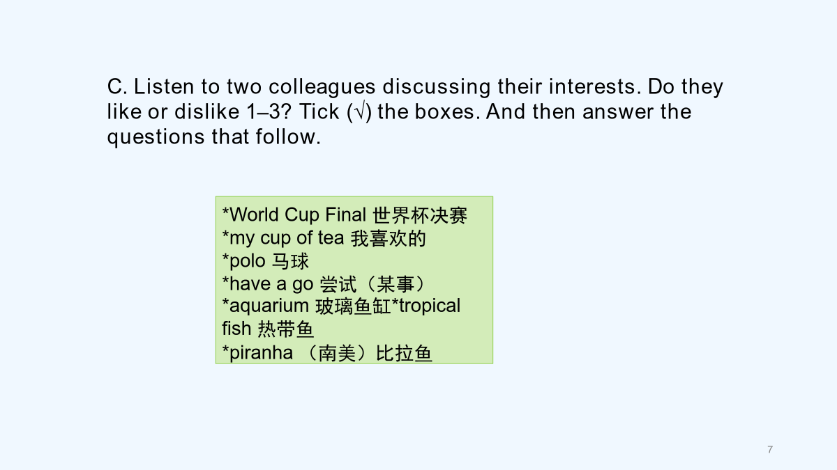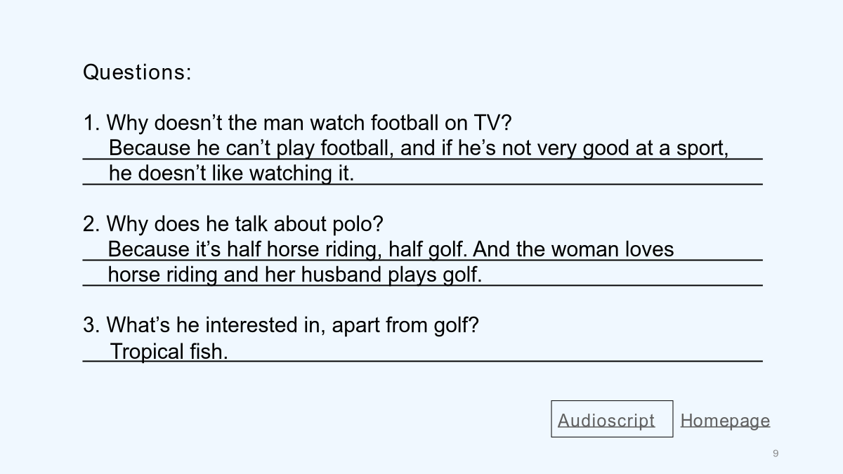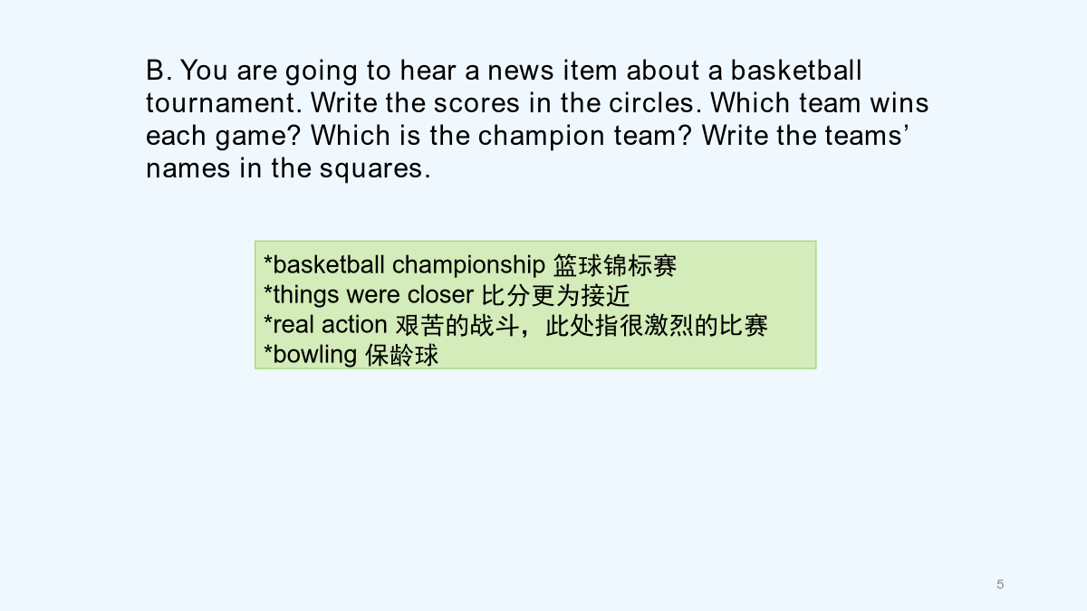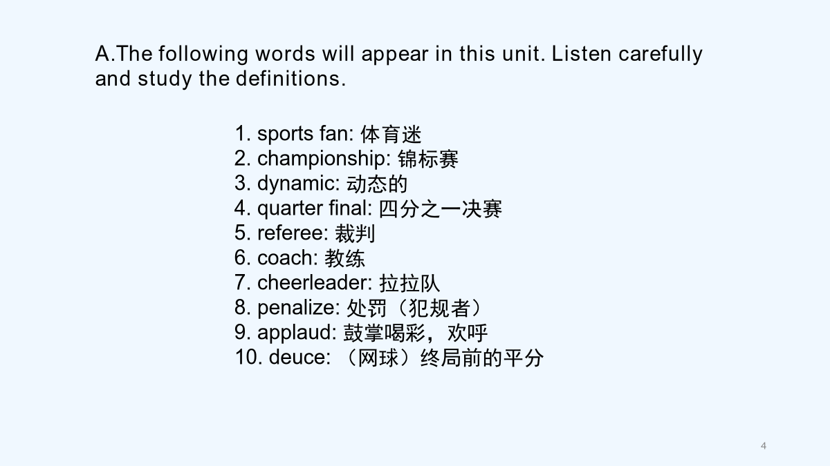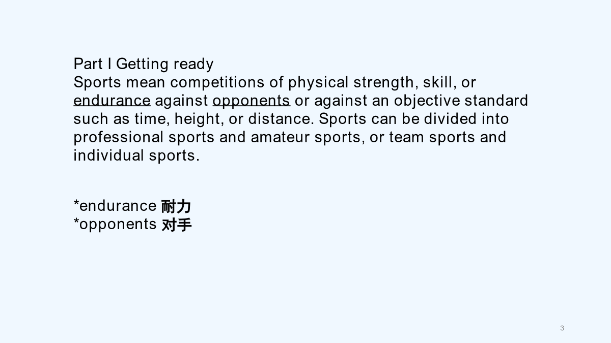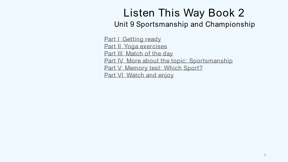 英语听力教程LTWUnit9Unit9SportsmanshipandChampionshipPartIGettingreadyPartIIYogaexercisesPartIIIMatchofthedayPartIVMoreaboutthetopic:SportsmanshipPartVMemorytest:WhichSport?PartVIWatchandenjoyPartIGettingreadySportsmeancompetitionsofphysicalstrength,skill,orenduranceagainstopponentsoragainstanobjectivestandardsuchastime,height,ordistance.Sportscanbedividedintoprofessionalsportsandamateursports,orteamsportsandindividualsports.*endurance耐力*opponents对手9468√Questions:1.Whydoesn’tthemanwatchfootballonTV?____________________________________________________________________________________________________________________2.Whydoeshetalkaboutpolo?____________________________________________________________________________________________________________________3.What’sheinterestedin,apartfromgolf?__________________________________________________________大家应该也有点累了,稍作休息PartIIYogaexercisesClassicalyogaisadoctrinethatistheisticandemphasizespurificationthroughmeditation.Ayogi,orpractitionerofyoga,meditatesinordertoachievetruebliss,whichinvolvesacompletewithdrawalfromtheworld.Yogisassumethebodilyposturethataffordsthemthemoststabilityandtheleasteffort.Theyogistrivestotranscendbodyandmatterthroughconsistentmeditation.*doctrine(宗教)教义*theistic有神论的*purification涤罪,洁身*meditation/meditates冥想,沉思*yogi瑜伽信奉者*bliss无上幸福*bodilyposture体态,身体姿势*stability稳定性*transcend超越A.YouaregoingtohearaconversationbetweentwostudentsPaulandLisaaboutsomeyogaexercises.Listencarefully.Matchthenamesoftheyogapostureswiththeproperpictures.B.Listentotheconversationagain.Whileyoulisten,addmorekeywordsintheleft-handcolumn.Afterlistening,completethedescriptionsforeachyogaposture.PartIIIMatchofthedayGoodsportsmanshipmeansnothavinga"winatanycost"attitude.Mostathleteswhodon'thavea"winatanycost"attitudearemorelikelytotalkabouthowmuchtheylovetheirsportandhowmuchpersonalsatisfactionandenjoymenttheygetfromparticipation.*sportsmanship体育道德,运动员风范Ifyou'reintosports,you've____ithappen.You'veprobablyeven______