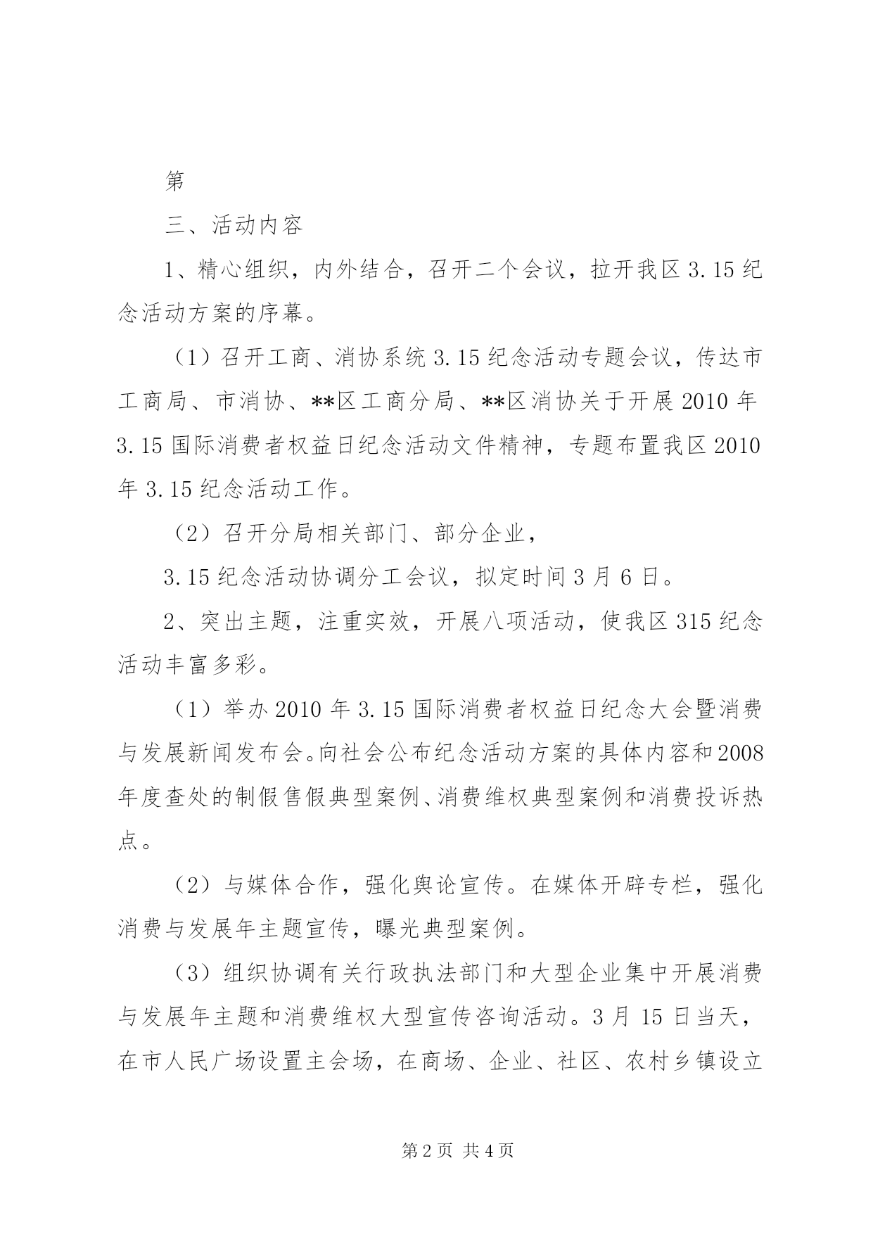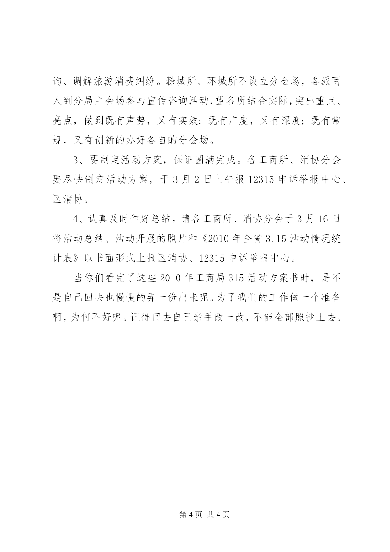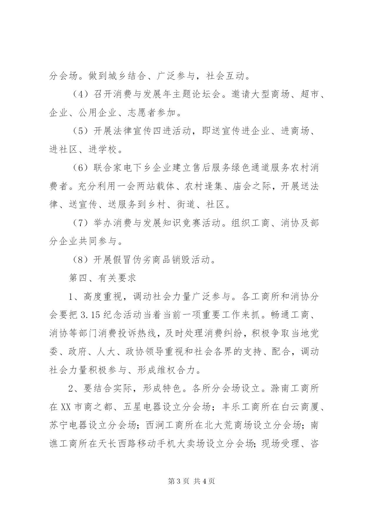 第PAGE\*Arabic\*MERGEFORMAT4页共NUMPAGES\*MERGEFORMAT4页工商局315活动方案我们在这里举例说清楚一下吧,好让你们明白一下2010年工商局315活动方案的大纲。政府、**区工商分局、区消协研究,特制定活动方案如下:第一、指导思想以党的十七届三中全会和中央经济工作会议精神为指导,以全面贯彻和落实科学发展观、构建社会主义和谐社会为核心,以消费与发展年主题为主线,以改善环境促进消费为主题,以宣传政策、提高消费信心、提供消费咨询、拉动消费需求、推进消费维权、引导科学消费为重点,动员消费者、经营者、社会各界广泛参与,创造性地开展一系列活动,为促进经济社会平稳较快发展服务。第二、组织领导为加强对3.15纪念活动的领导,便于各部门工作联系,成立**区2010年3.15国际消费者权益日纪念活动领导小组。**区政府汤曾满副区长为组长,**区工商分局副局长杨光为副组长,分局分管公平交易的程先明、3.15中心张友恒、区消协朱正和、各工商所所长、各消协分会秘书长为成员,领导小组下设办公室,张友恒任办公室主任,办公室设在分局中心,联系电话:3060251。各所、各分会成立相应组织。第三、活动内容1、精心组织,内外结合,召开二个会议,拉开我区3.15纪念活动方案的序幕。(1)召开工商、消协系统3.15纪念活动专题会议,传达市工商局、市消协、**区工商分局、**区消协关于开展2010年3.15国际消费者权益日纪念活动文件精神,专题布置我区2010年3.15纪念活动工作。(2)召开分局相关部门、部分企业,3.15纪念活动协调分工会议,拟定时间3月6日。2、突出主题,注重实效,开展八项活动,使我区315纪念活动丰富多彩。(1)举办2010年3.15国际消费者权益日纪念大会暨消费与发展新闻发布会。向社会公布纪念活动方案的具体内容和2008年度查处的制假售假典型案例、消费维权典型案例和消费投诉热点。(2)与媒体合作,强化舆论宣传。在媒体开辟专栏,强化消费与发展年主题宣传,曝光典型案例。(3)组织协调有关行政执法部门和大型企业集中开展消费与发展年主题和消费维权大型宣传咨询活动。3月15日当天,在市人民广场设置主会场,在商场、企业、社区、农村乡镇设立分会场。做到城乡结合、广泛参与,社会互动。(4)召开消费与发展年主题论坛会。邀请大型商场、超市、企业、公用企业、志愿者参加。(5)开展法律宣传四进活动,即送宣传进企业、进商场、进社区、进学校。(6)联合家电下乡企业建立售后服务绿色通道服务农村消费者。充分利用一会两站载体、农村逢集、庙会之际,开展送法律、送宣传、送服务到乡村、街道、社区。(7)举办消费与发展知识竞赛活动。组织工商、消协及部分企业共同参与。(8)开展假冒伪劣商品销毁活动。第四、有关要求1、高度重视,调动社会力量广泛参与。各工商所和消协分会要把3.15纪念活动当着当前一项重要工作来抓。畅通工商、消协等部门消费投诉热线,及时处理消费纠纷,积极争取当地党委、政府、人大、政协领导重视和社会各界的支持、配合,调动社会力量积极参与、形成维权合力。2、要结合实际,形成特色。各所分会场设立。滁南工商所在XX市商之都、五星电器设立分会场;丰乐工商所在白云商厦、苏宁电器设立分会场;西涧工商所在北大荒商场设立分会场;南谯工商所在天长西路移动手机大卖场设立分会场;现场受理、咨询、调解旅游消费纠纷。滁城所、环城所不设立分会场,各派两人到分局主会场参与宣传咨询活动,望各所结合实际,突出重点、亮点,做到既有声势,又有实效;既有广度,又有深度;既有常规,又有创新的办好各自的分会场。3、要制定活动方案,保证圆满完成。各工商所、消协分会要尽快制定活动方案,于3月2日上午报12315申诉举报中心、区消协。4、认真及时作好总结。请各工商所、消协分会于3月16日将活动总结、活动开展的照片和《2010年全省3.15活动情况统计表》以书面形式上报区消协、12315申诉举报中心。当你们看完了这些2010年工商局315活动方案书时,是不是自己回去也慢慢的弄一份出来呢。为了我们的工作做一个准备啊,为何不好呢。记得回去自己亲手改一改,不能全部照抄上去。