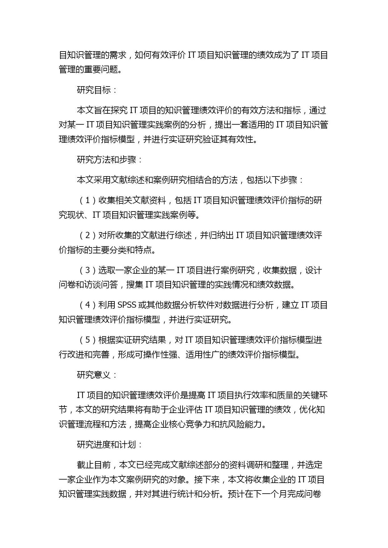 IT项目的知识管理绩效评价的开题报告写作指南:1.研究背景:介绍IT项目知识管理的重要性及其对项目绩效的影响。2.研究问题:IT项目知识管理绩效评价的问题和挑战。3.研究目标:探究IT项目知识管理绩效评价的有效方法和指标。4.研究方法和步骤:采用文献综述和案例研究的方法,详细描述研究步骤和数据分析方法。5.研究意义:阐述IT项目知识管理绩效评价对于提升项目管理水平和企业竞争力的重要意义。6.研究进度和计划:说明研究的进度和计划,包括资料收集、数据分析和撰写论文的时间表。开题报告:中文题目:IT项目的知识管理绩效评价英文题目:KnowledgeManagementPerformanceEvaluationofITProjects研究背景:如今,IT项目已经成为现代企业必不可少的一项业务活动,它能够推动企业的数字化转型、提高生产效率和改善客户体验。然而,IT项目的复杂性、周期长和成本高等特点也制约了其成功实施的难度。在IT项目实施过程中,知识的积累和共享是至关重要的,有效的知识管理不仅可以提高项目的执行效率,还可以提升项目质量和客户满意度。研究问题:IT项目知识管理绩效评价一直是IT项目管理领域关注的热点问题。随着企业数字化转型的加速,现有的评价指标和方法已经不能满足IT项目知识管理的需求,如何有效评价IT项目知识管理的绩效成为了IT项目管理的重要问题。研究目标:本文旨在探究IT项目的知识管理绩效评价的有效方法和指标,通过对某一IT项目知识管理实践案例的分析,提出一套适用的IT项目知识管理绩效评价指标模型,并进行实证研究验证其有效性。研究方法和步骤:本文采用文献综述和案例研究相结合的方法,包括以下步骤:(1)收集相关文献资料,包括IT项目知识管理绩效评价指标的研究现状、IT项目知识管理实践案例等。(2)对所收集的文献进行综述,并归纳出IT项目知识管理绩效评价指标的主要分类和特点。(3)选取一家企业的某一IT项目进行案例研究,收集数据,设计问卷和访谈问答,搜集IT项目知识管理的实践情况和绩效数据。(4)利用SPSS或其他数据分析软件对数据进行分析,建立IT项目知识管理绩效评价指标模型,并进行实证研究。(5)根据实证研究结果,对IT项目知识管理绩效评价指标模型进行改进和完善,形成可操作性强、适用性广的绩效评价指标模型。研究意义:IT项目的知识管理绩效评价是提高IT项目执行效率和质量的关键环节,本文的研究结果将有助于企业评估IT项目知识管理的绩效,优化知识管理流程和方法,提高企业核心竞争力和抗风险能力。研究进度和计划:截止目前,本文已经完成文献综述部分的资料调研和整理,并选定一家企业作为本文案例研究的对象。接下来,本文将收集企业的IT项目知识管理实践数据,并对其进行统计和分析。预计在下一个月完成问卷和访谈的设计和发放,并在两个月后完成数据的整理和分析工作,最终在四个月后完成论文的撰写和整理。